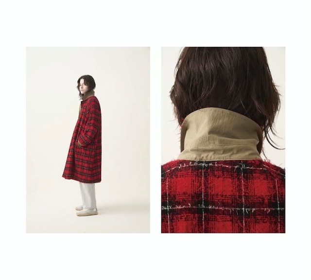 ドメスティックブランドWYTEのリバーシブルコート 新規取扱ブランド ➖WYTE(ワイト)➖ 着る人自身の感情が自然に立ち上がる体験を設計するブランド。服を主役にするのではなく、着る人の佇まいや感情がそっと前に出ること。着る人の中にあるセンスや美意識を別の角度から映し出し、装う事で自分を整える時間へと変化していく。WYTEは、そんな体験を大事にしています。 スパンレーヨン先染めチェックの緯糸を特殊な針でループ状に引き出した、立体感のあるオリジナルテキスタイル(HOEI USAMI SP)と、塩縮加工を施したナイロンタッサーとのリバーシブルコート。 釦とスペシャルな鼓太鼓で、リバーシブルでも合わせをスイッチすることができます。 素材感とキレイなチェックが目を引くコートです。ナイロンの方を表に着てもチラッと見えるチェックがポイントに♪ 程よい肉厚の丈夫な生地感ですが軽いので着心地も良くロングシーズン着用可能なのも嬉しいところ。 本体 レーヨン100% 別布 ナイロン100% 部分 本革豚革使用 color : red系チェック size フリーサイズ ・ご入金確認後、7日以内の発送予定です。発送からお届けまでは1~3日程お時間をいただいております。 ・速達には対応しておりません。 ・お急ぎの方はお届けできるか確認させていただきたいため、必ずご購入前にはお問い合わせフォームよりその旨をお伝えください。ご入金後のキャンセルは致しかねます。予めご了承ください。 予めご了承の上、お買い求めの程よろしくお願い致します