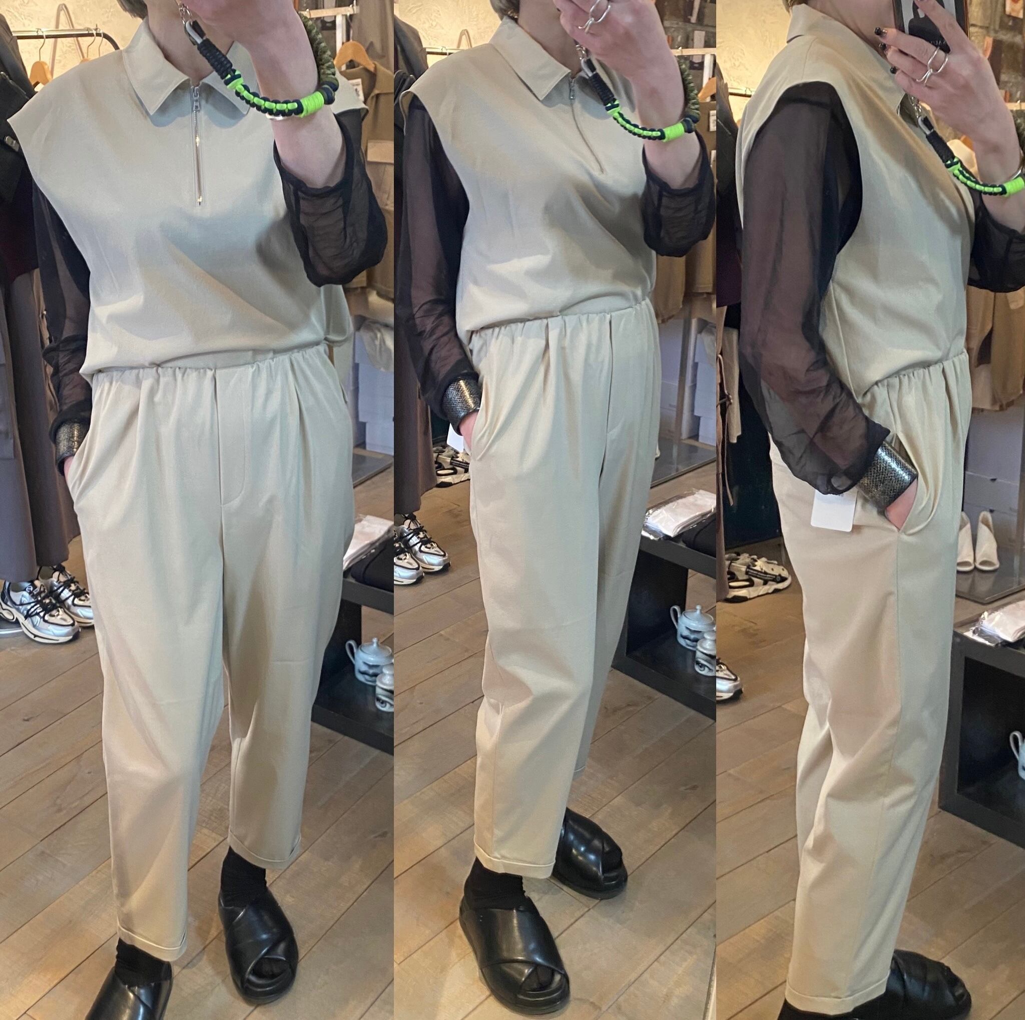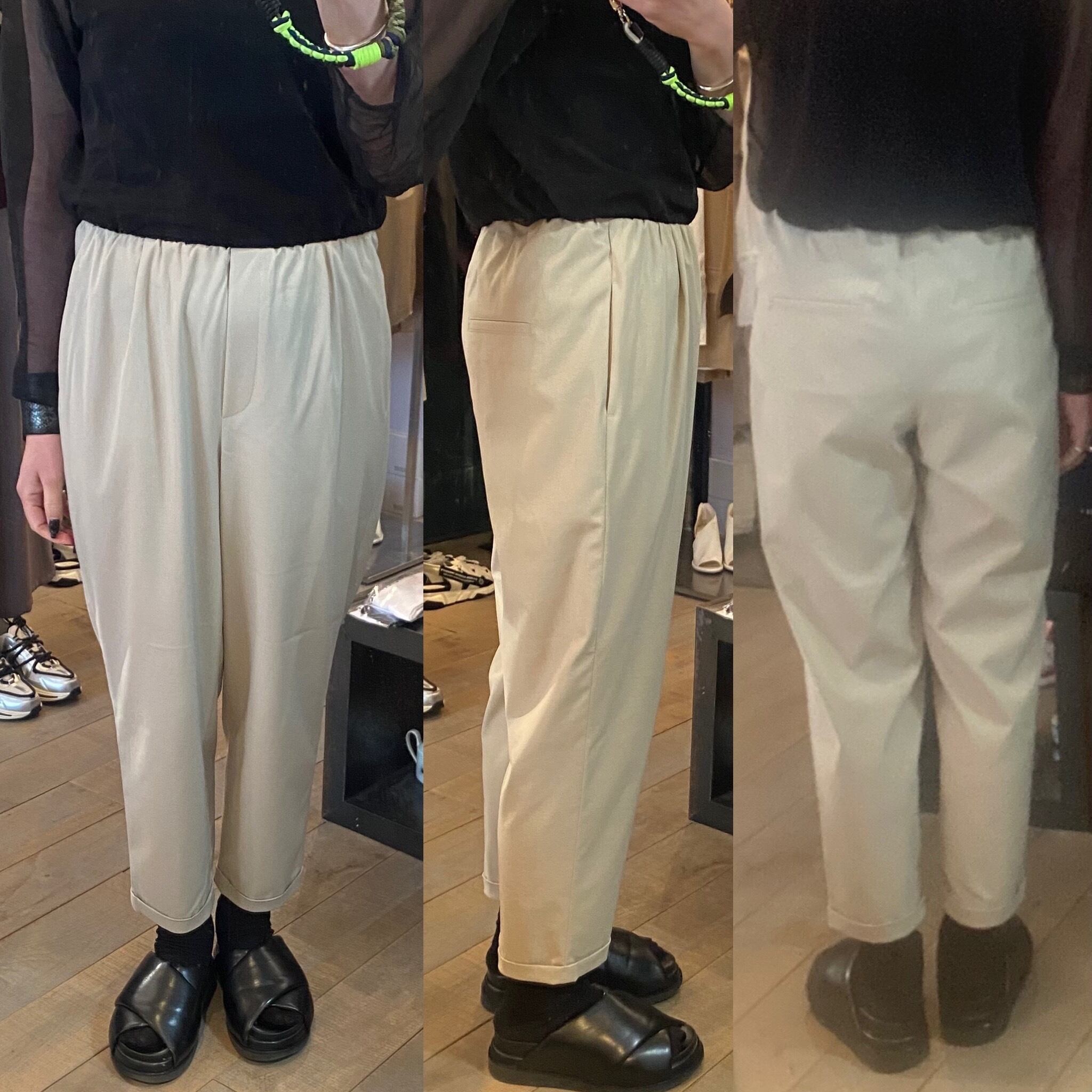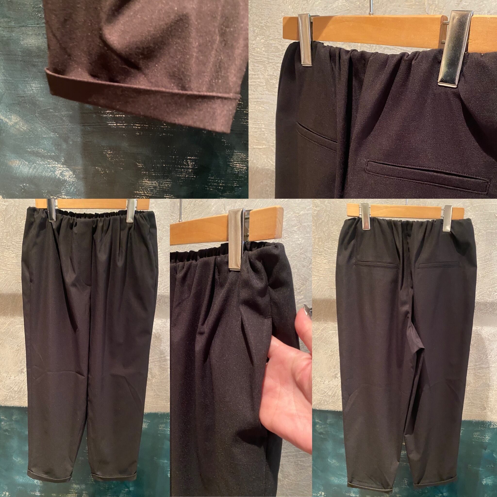 パンツは、ウエスト総ゴムの楽チンパンツ。トレンドのカーブラインに裾に向かって適度に細くなるメリハリをつけたパターン。イージーカーブシルエットのクロップド丈で、スッキリ見えするシルエット。両サイドポケット有り。カジュアルからモード、キレイめまで幅広くスタイリングできます。こちらも、単品でもセットアップでも◎とにかく履き心地が抜群です♪