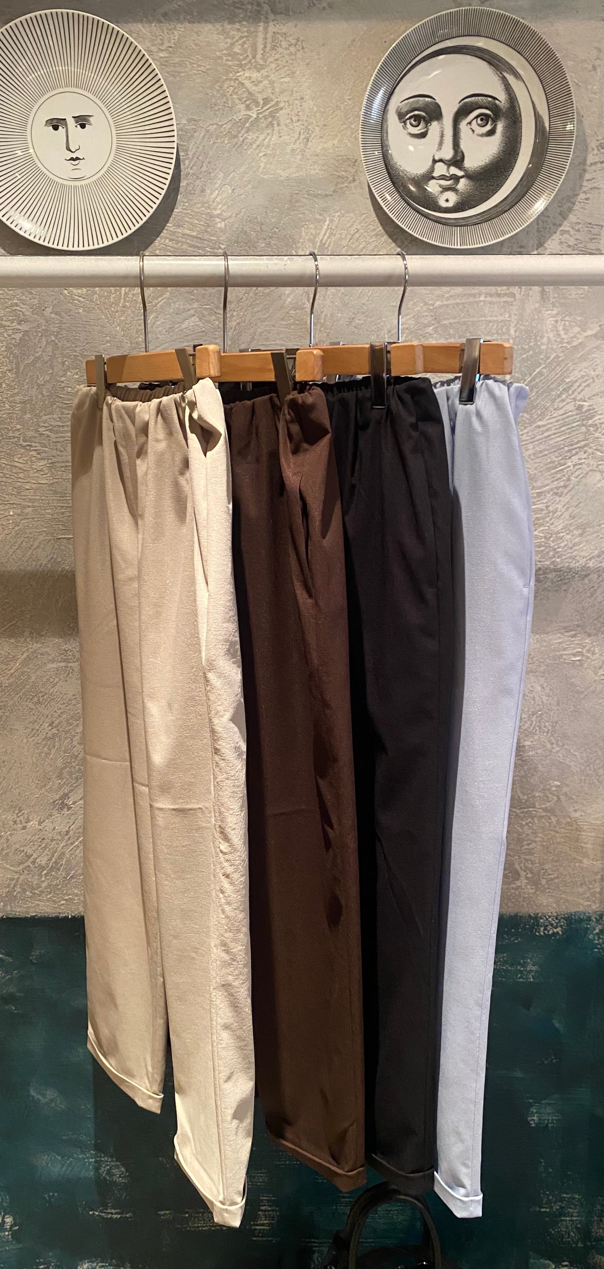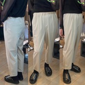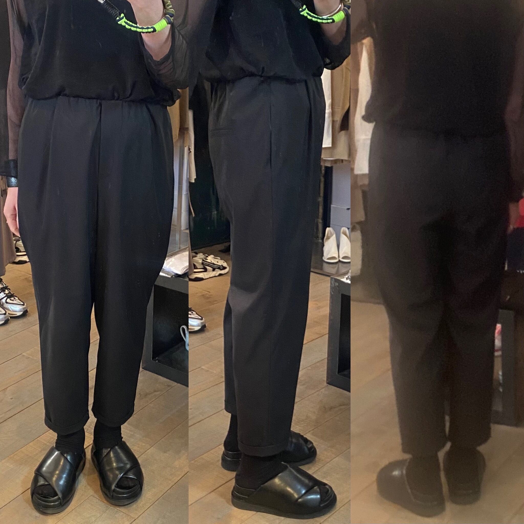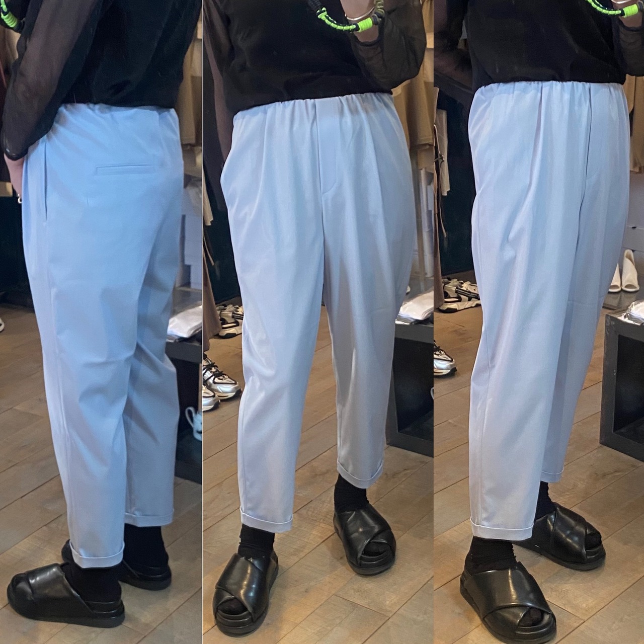 パンツは、ウエスト総ゴムの楽チンパンツ。トレンドのカーブラインに裾に向かって適度に細くなるメリハリをつけたパターン。イージーカーブシルエットのクロップド丈で、スッキリ見えするシルエット。両サイドポケット有り。カジュアルからモード、キレイめまで幅広くスタイリングできます。こちらも、単品でもセットアップでも◎とにかく履き心地が抜群です♪