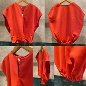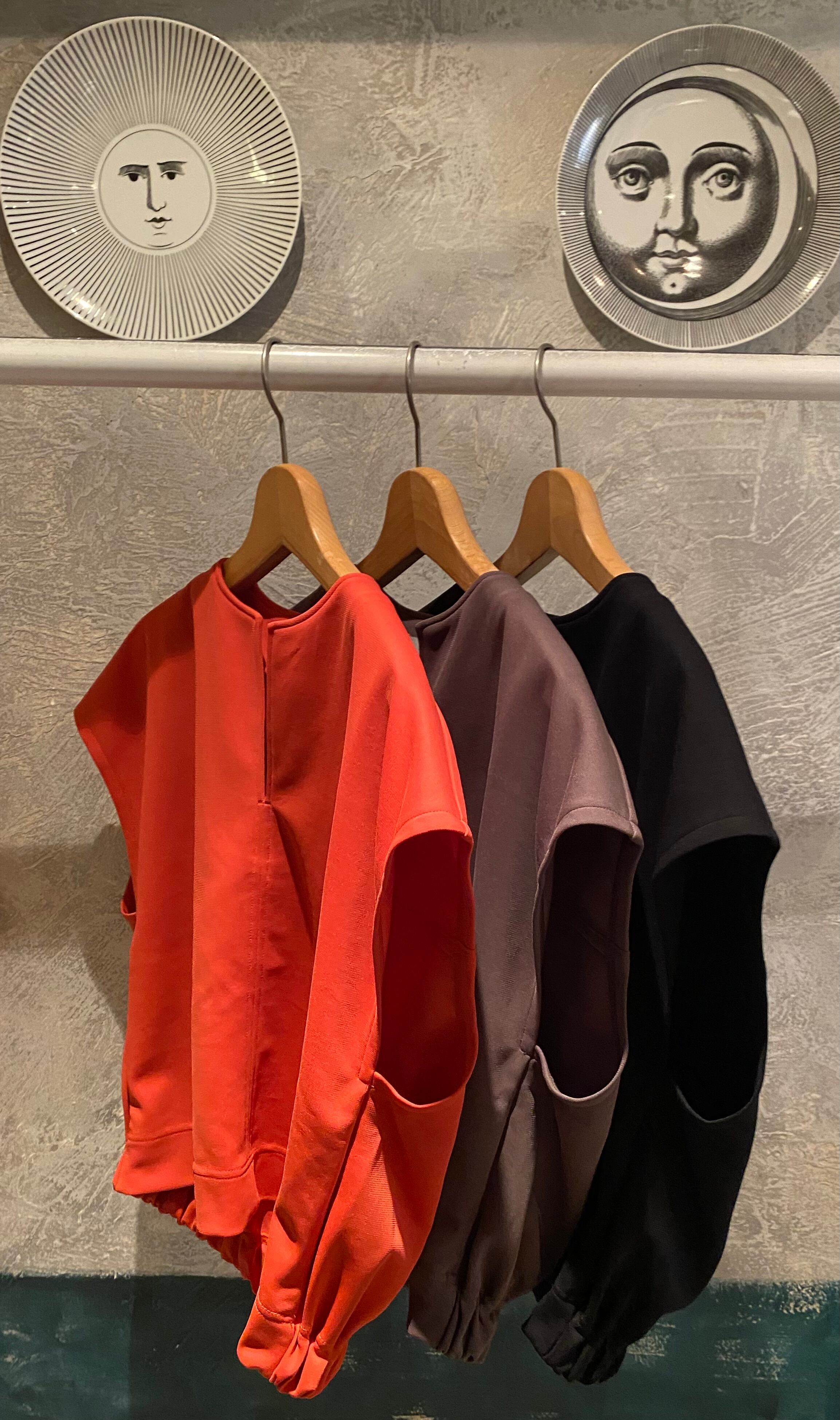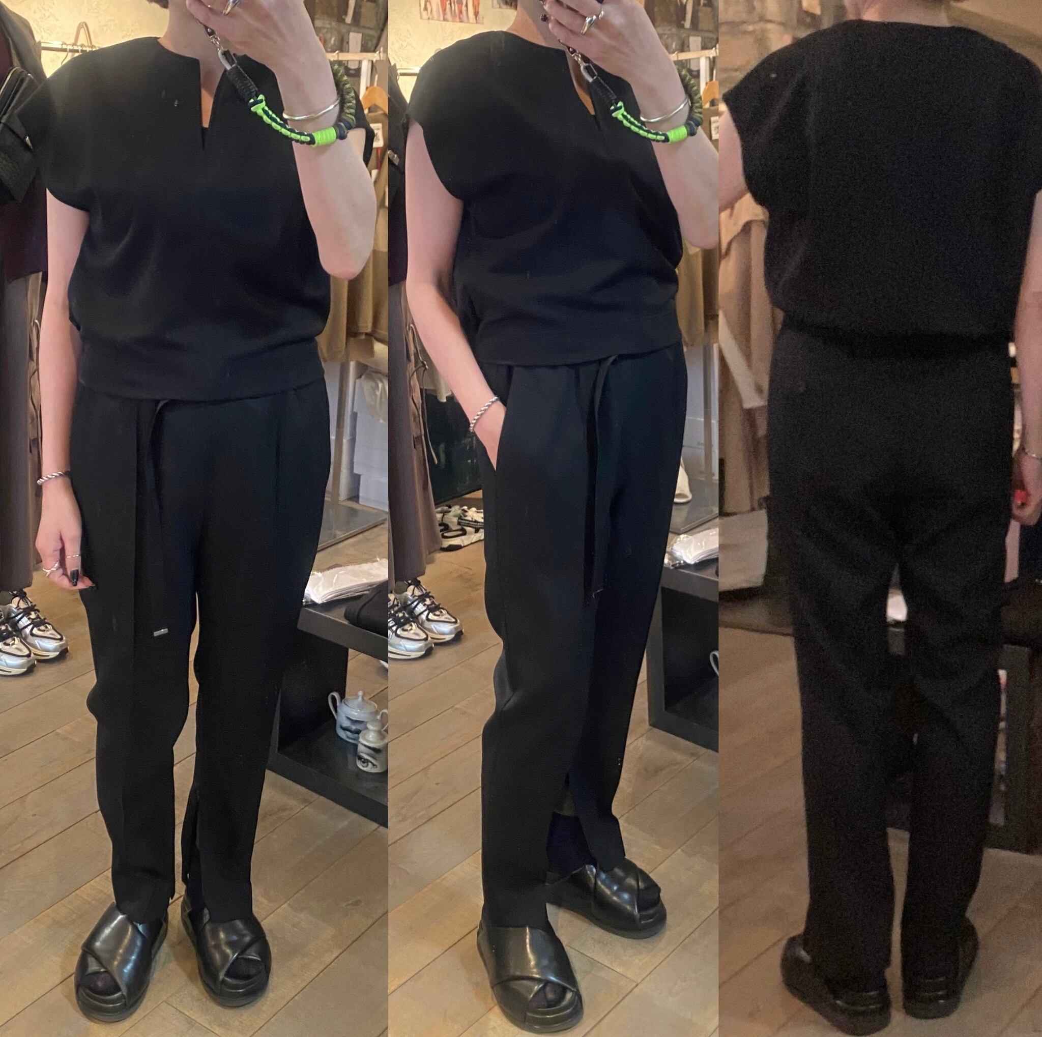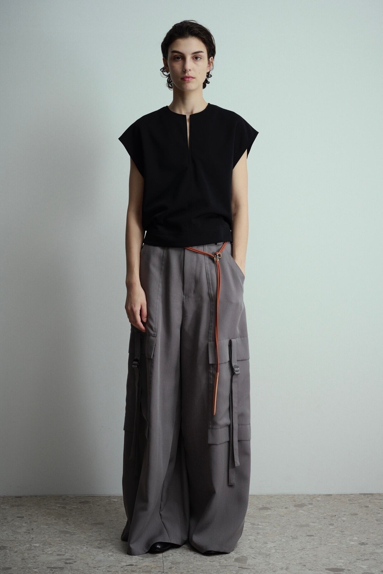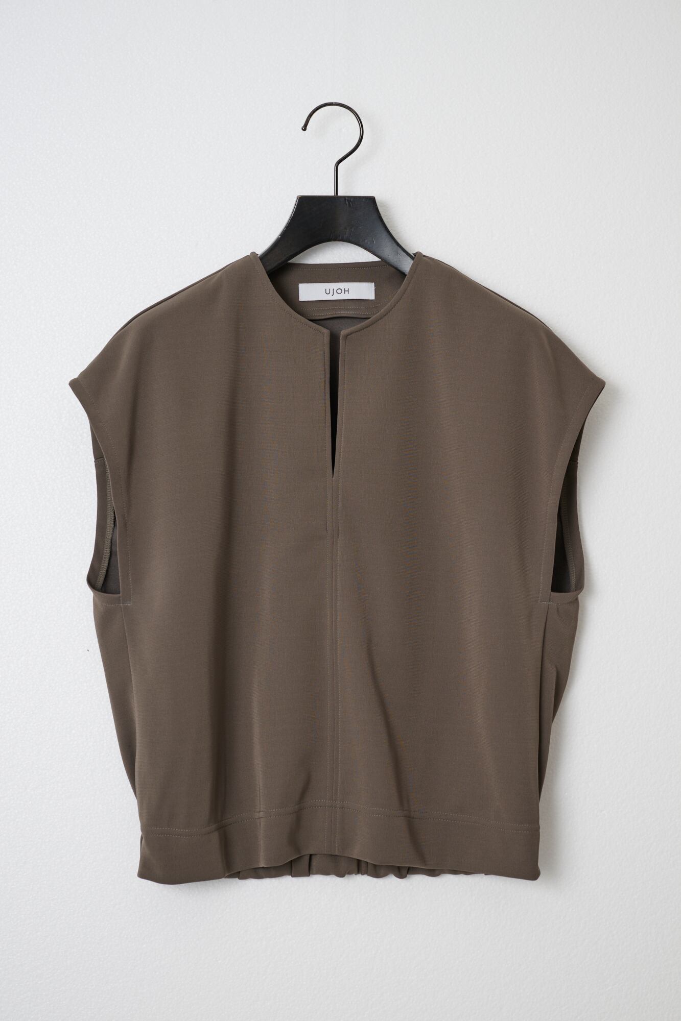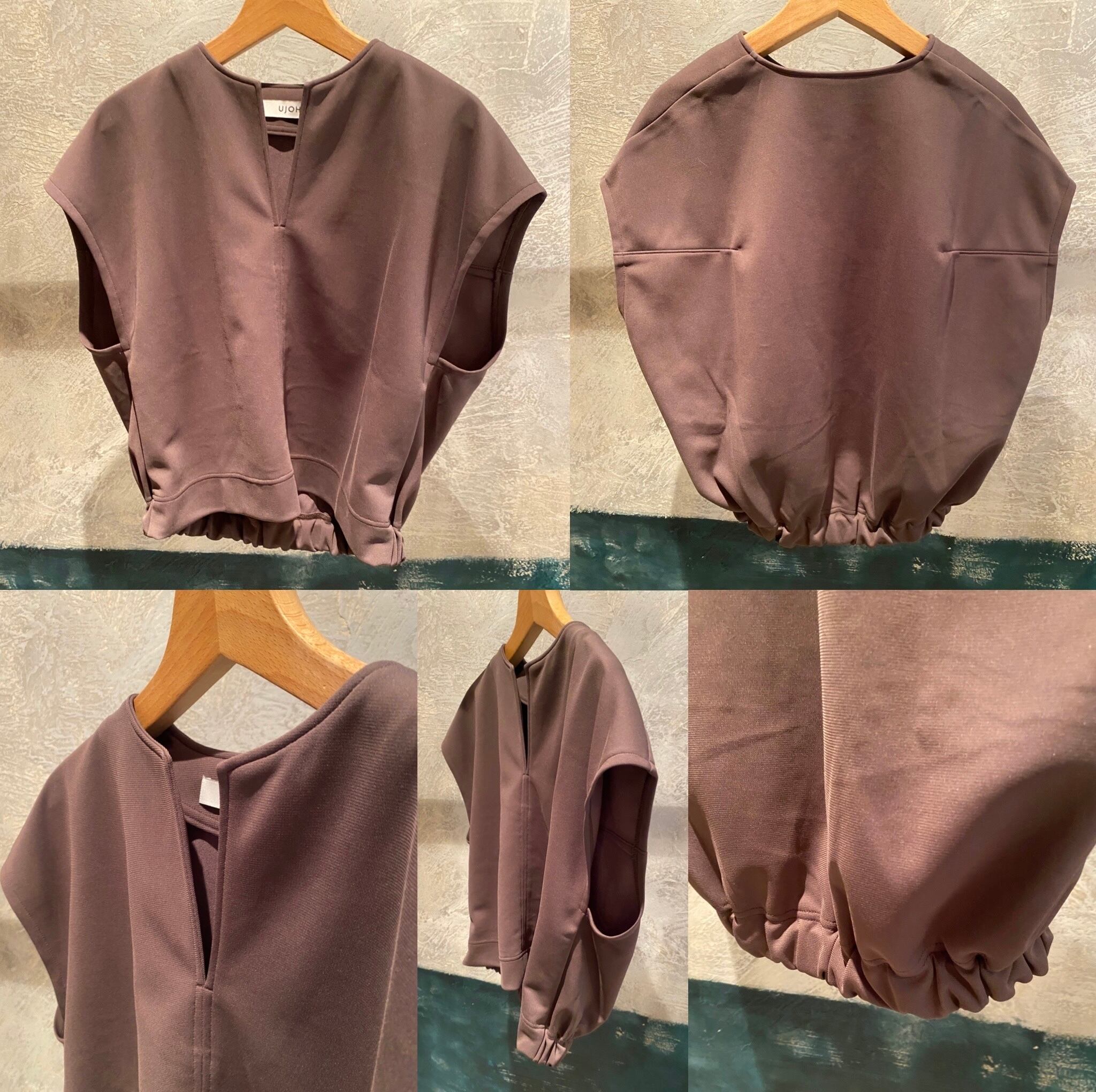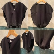 キーネックのスリットデザインと後ろ裾にゴムを入れてギャザーを寄せた立体的なシルエットが特徴です。クロップド丈でボトムとのバランスも取りやすいカットソーです。コットンのカットソーなどよりキレイめに着て頂けます♪
