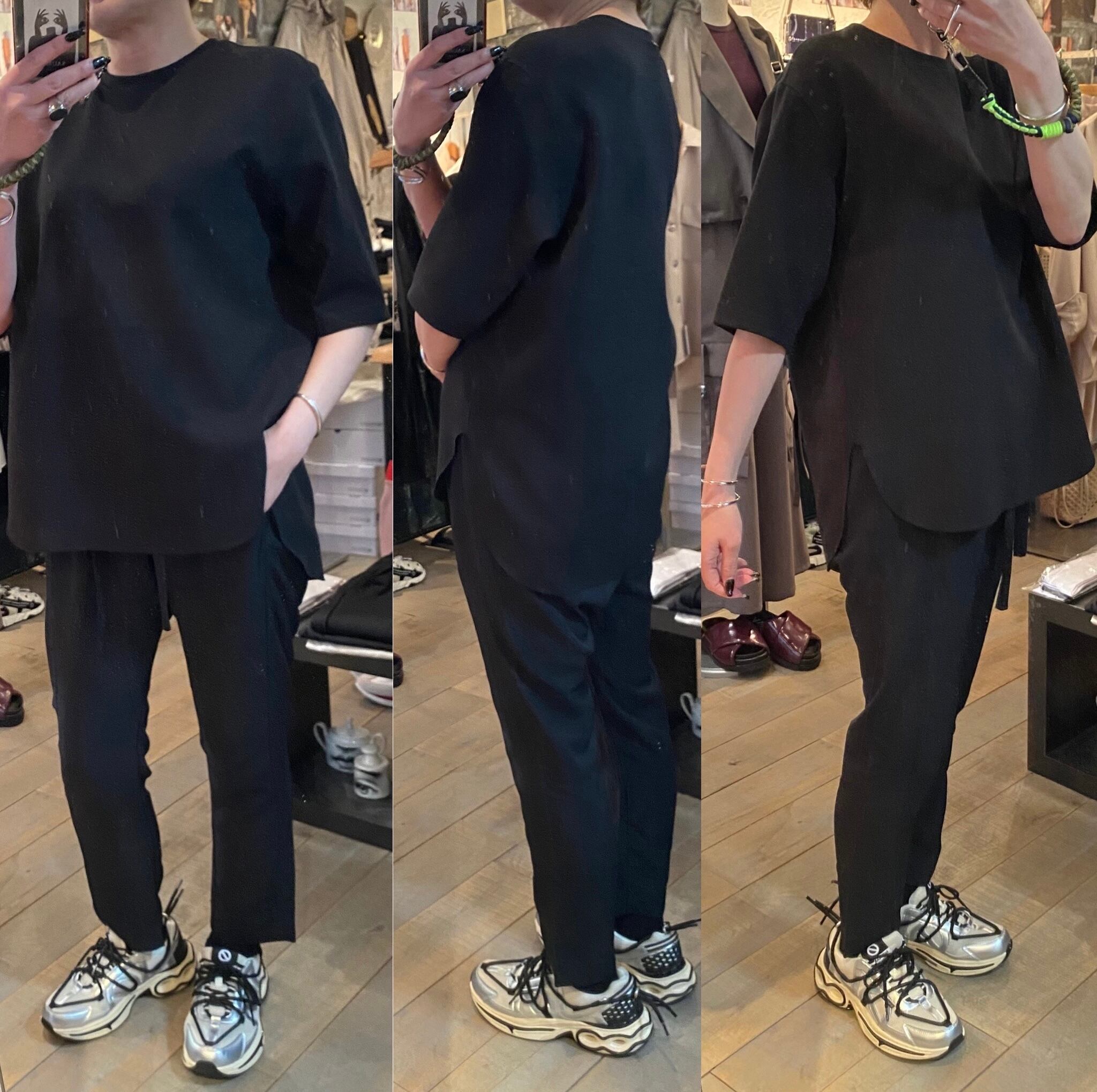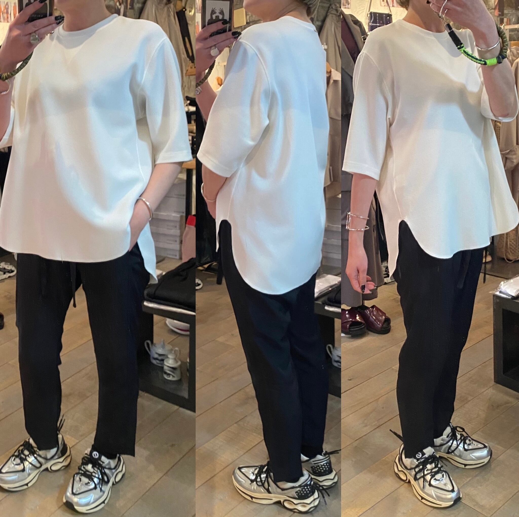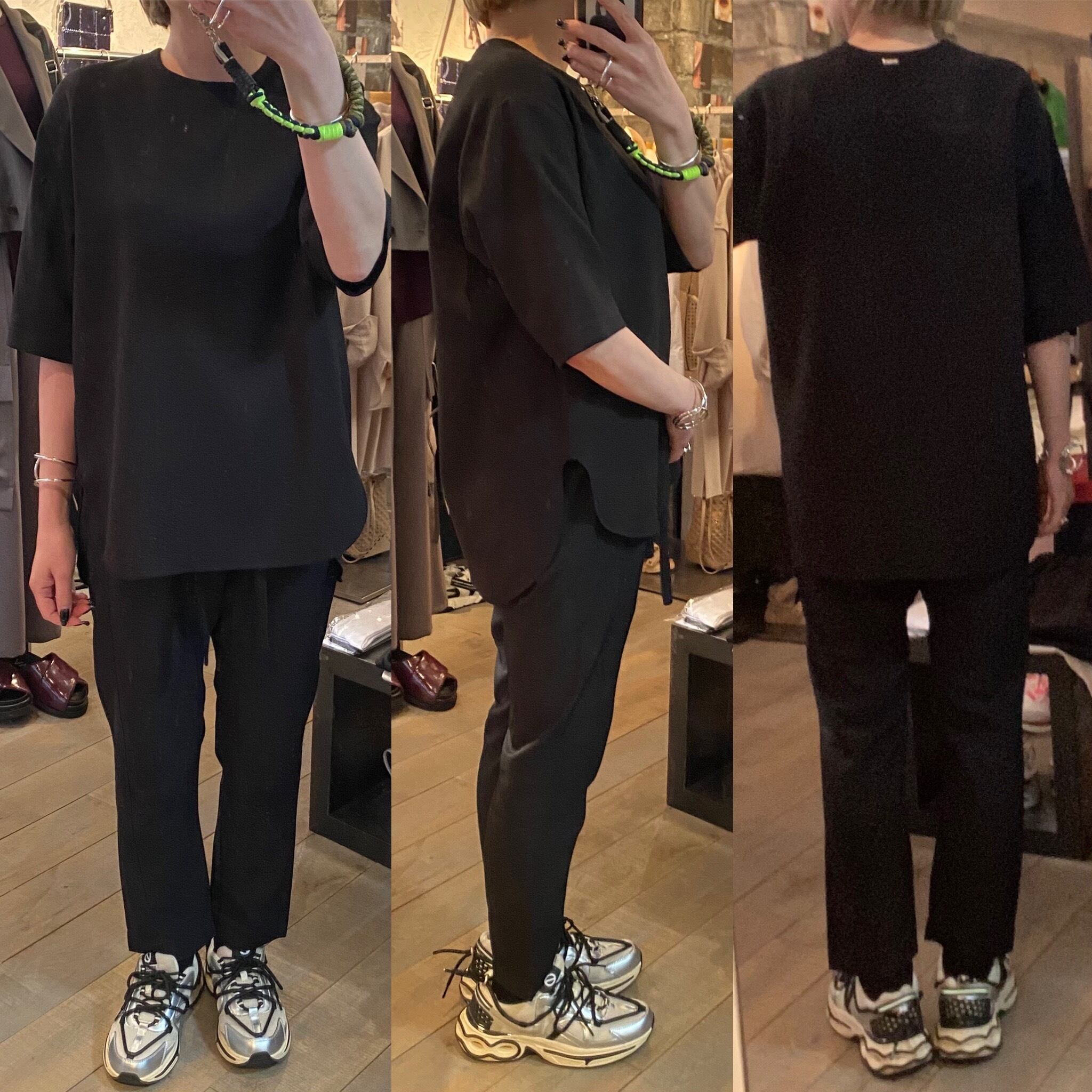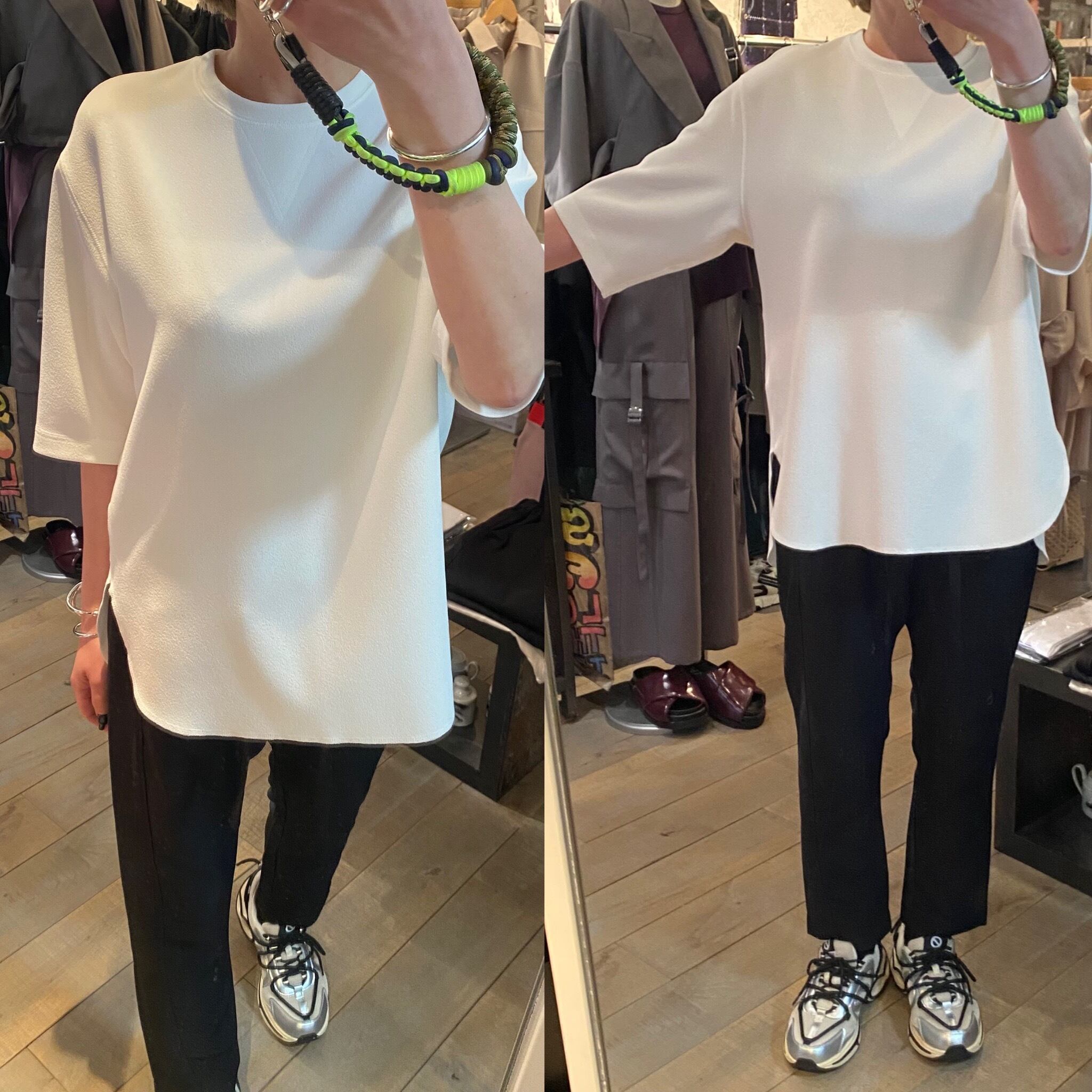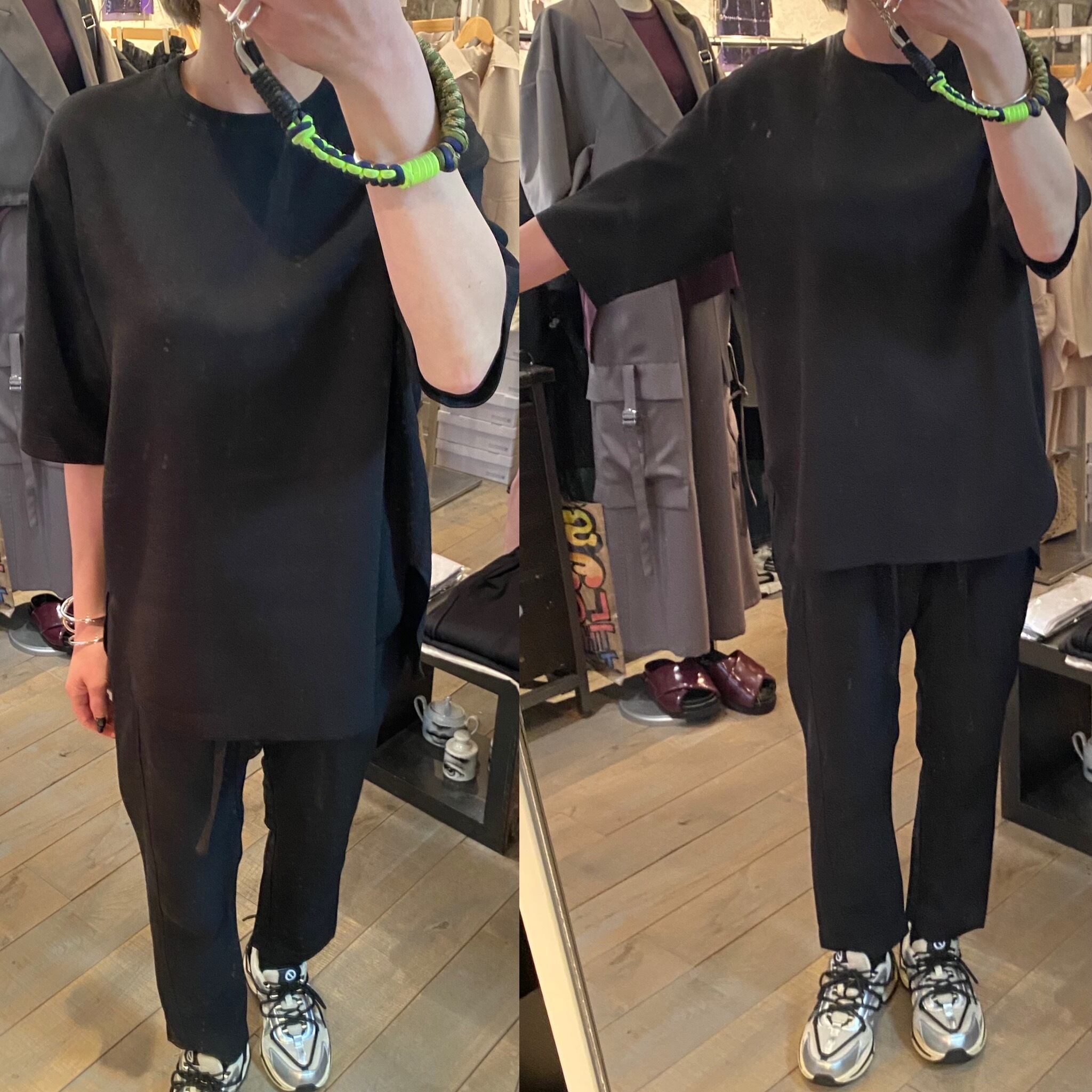 肘が隠れるぐらいのハーフスリーブトップス。サラッとした着心地で真夏はインナー無しでも1枚で着回せるので快適に過ごして頂けます。裾のラウンドカットや、スリット、断ち切り仕上げが軽めの印象に。体のラインも拾わず、合わせるボトムスも選ばないのでどなたでも着回せるヘビロテアイテムです♪Tシャツよりキレイめ見えするのも嬉しいところ。