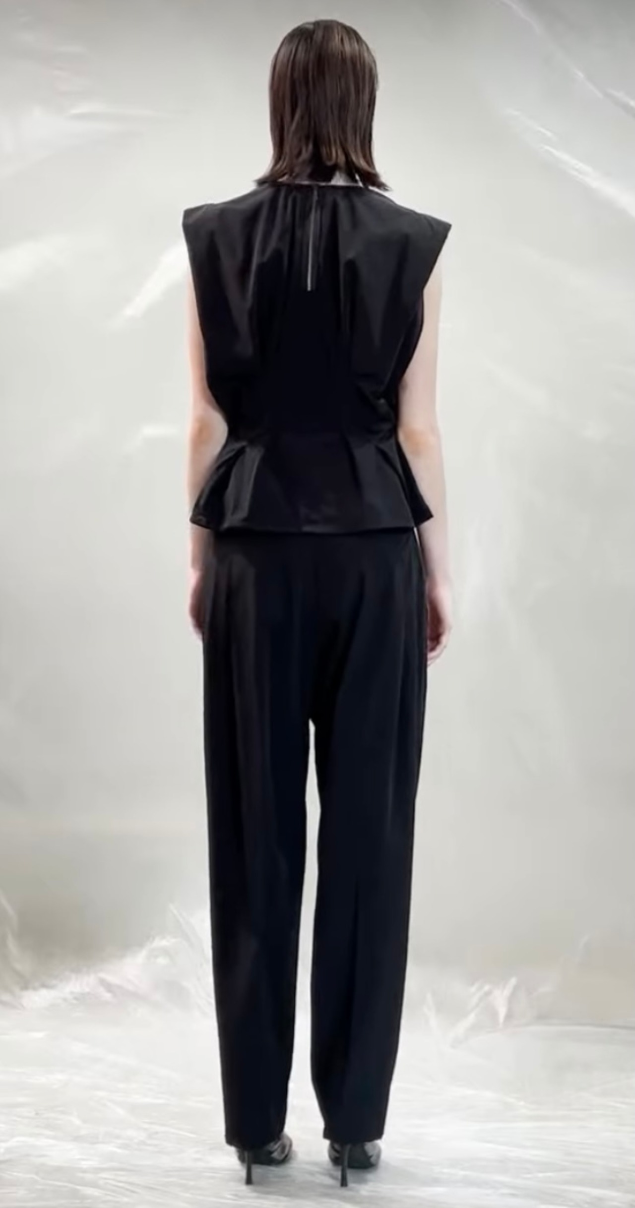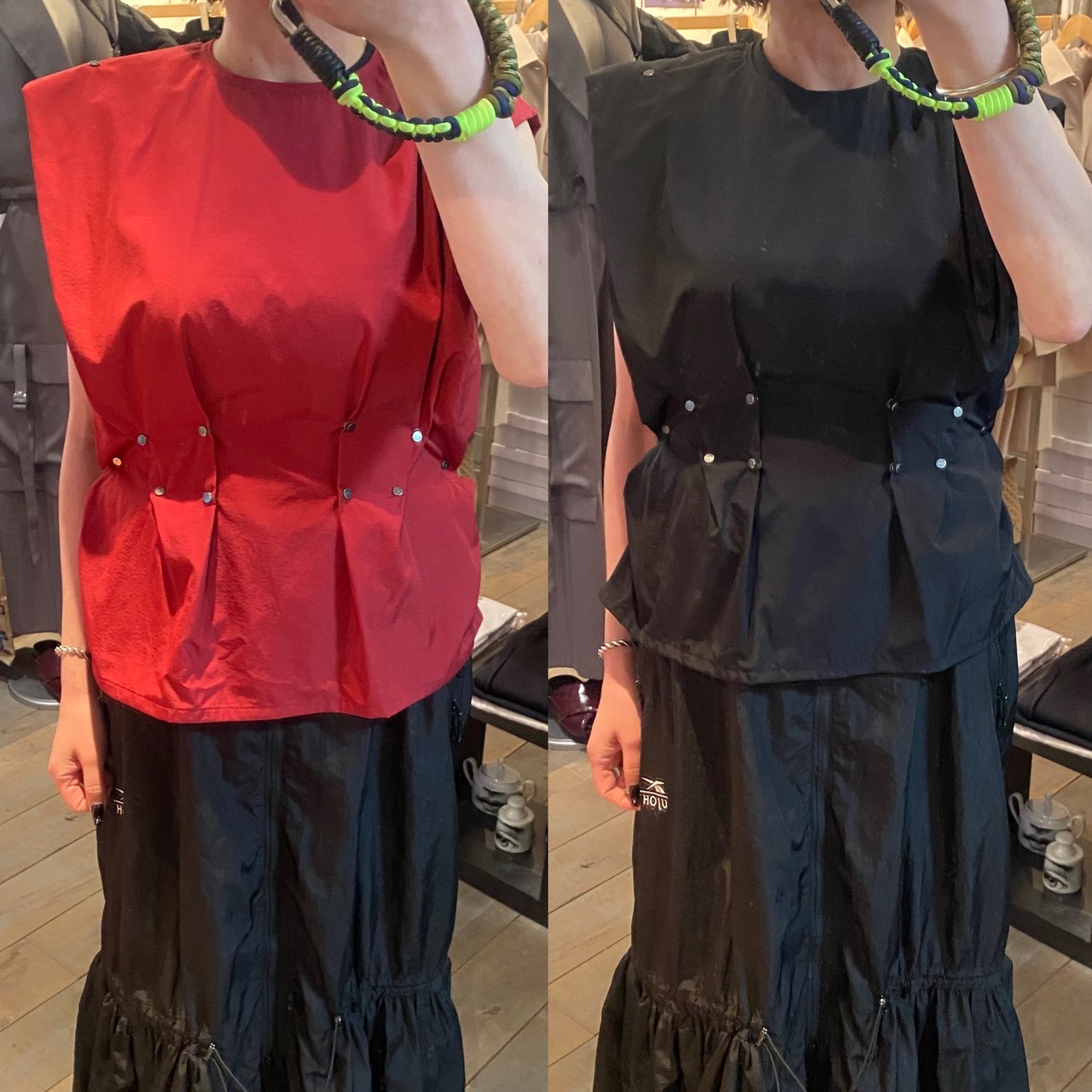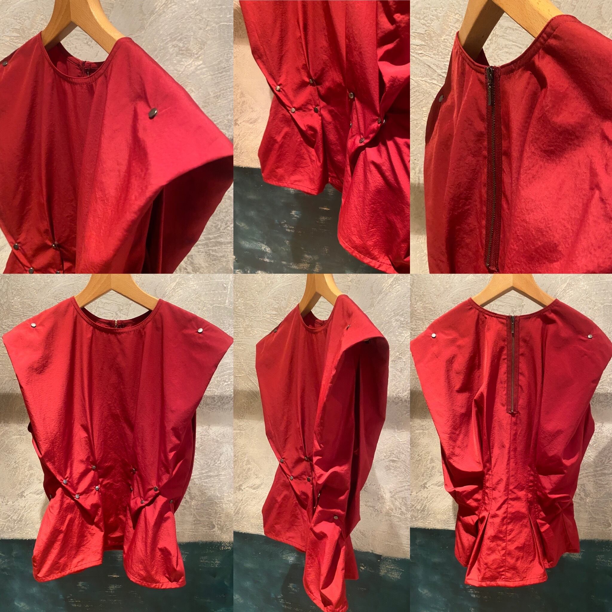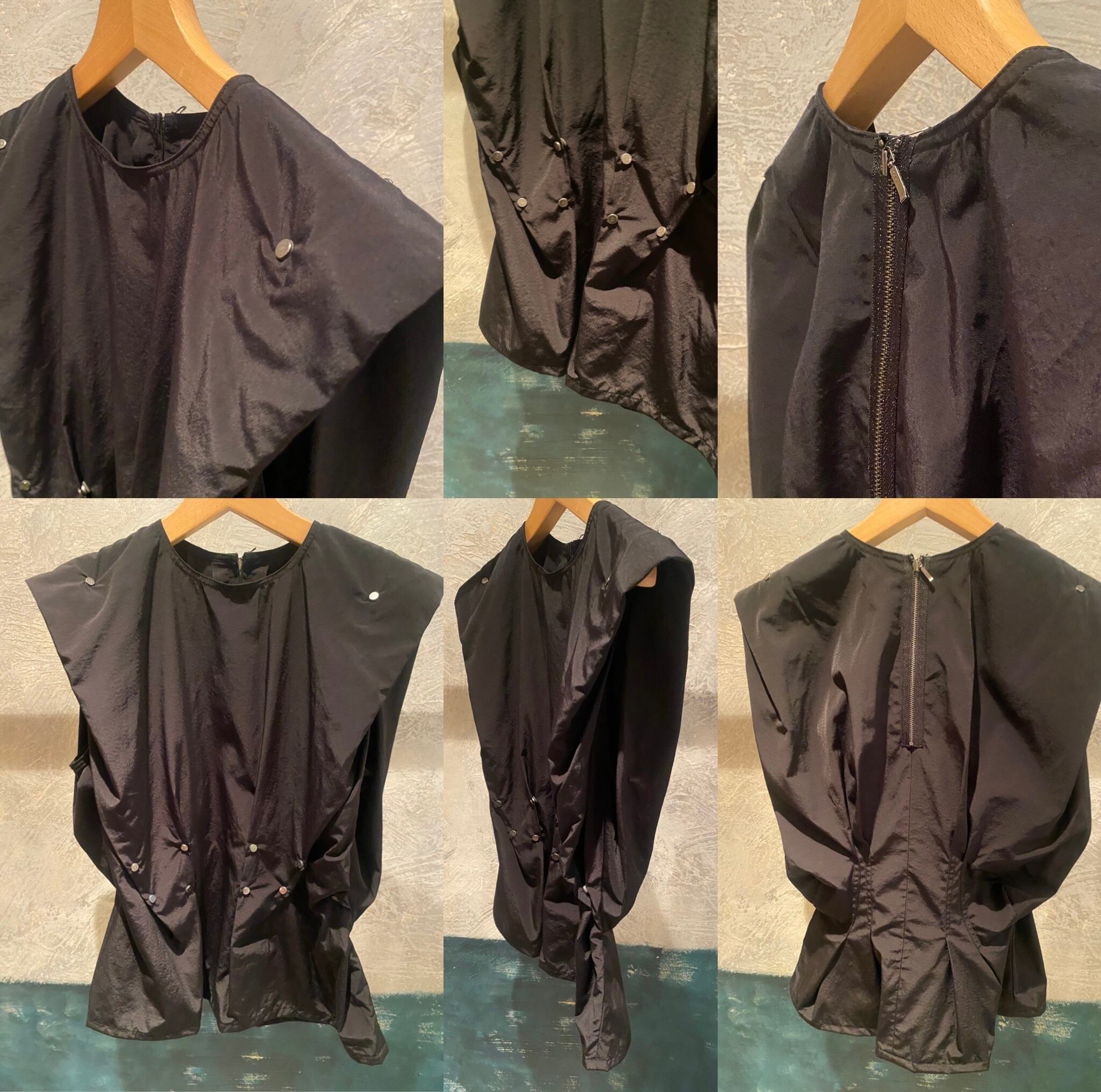 ドットボタンが特徴的なトップス。ボタンの開閉でシルエットを変えられます。肩からウエストにかけて並ぶボタンが、視覚的なアクセントを加え、モダンな雰囲気を演出します。