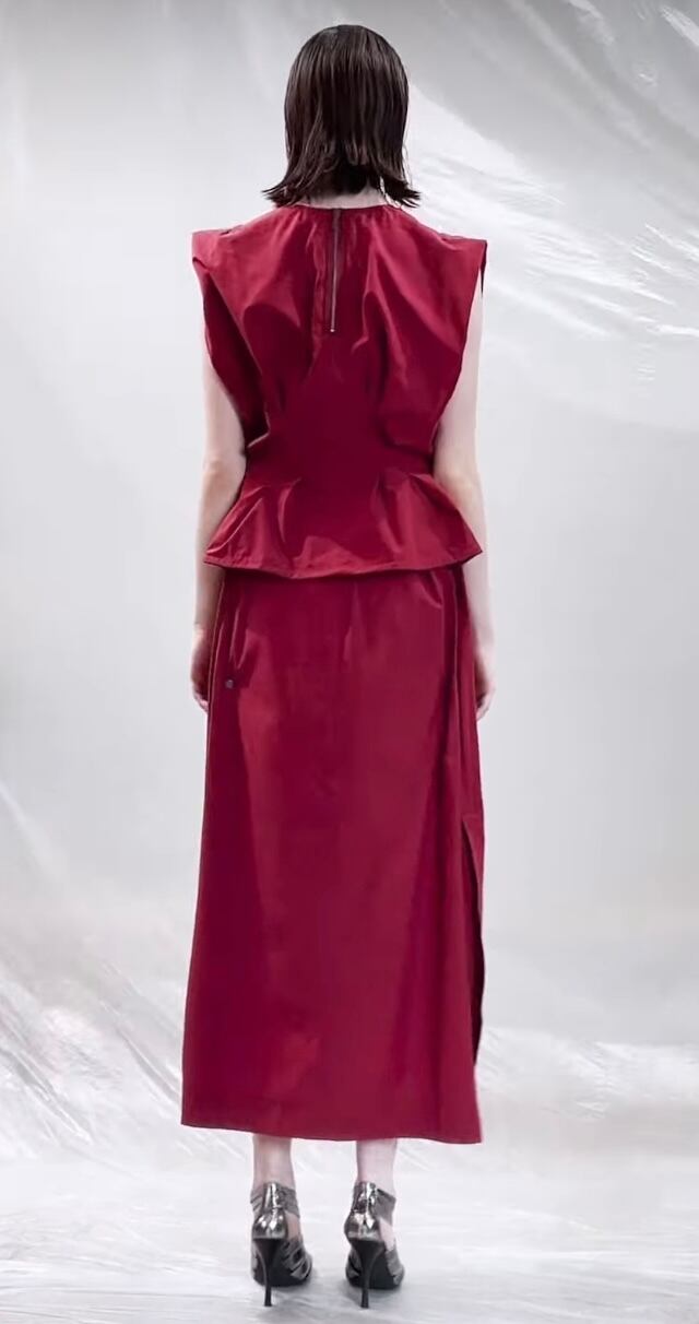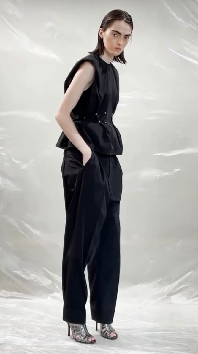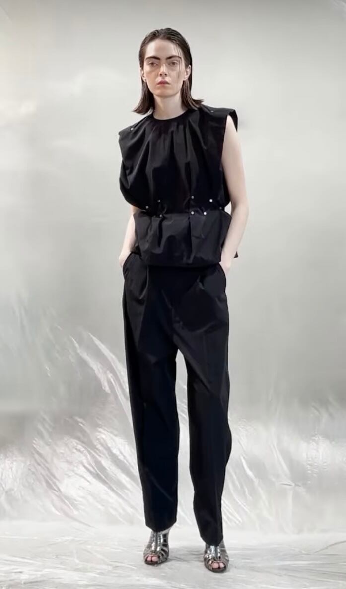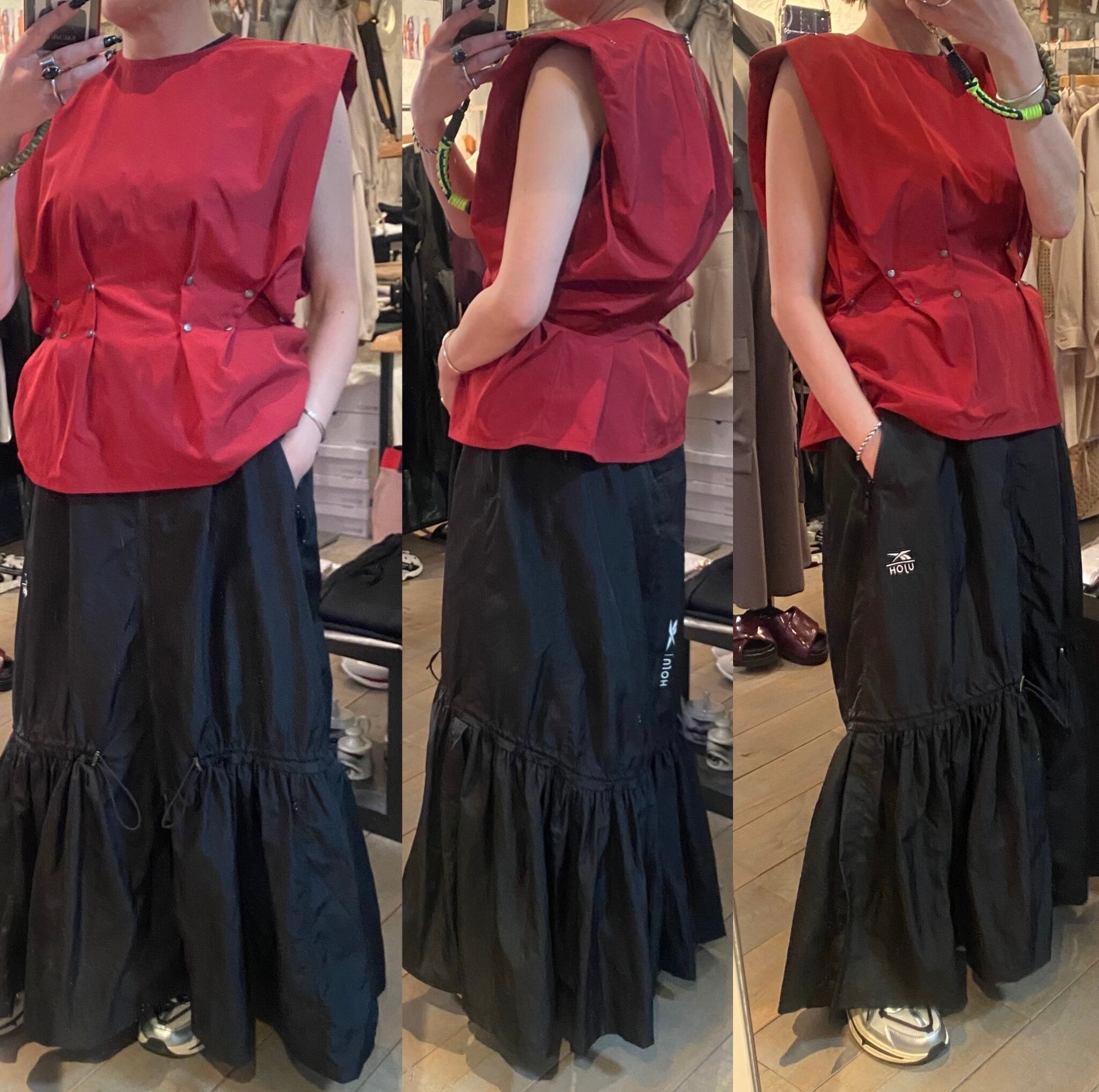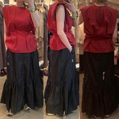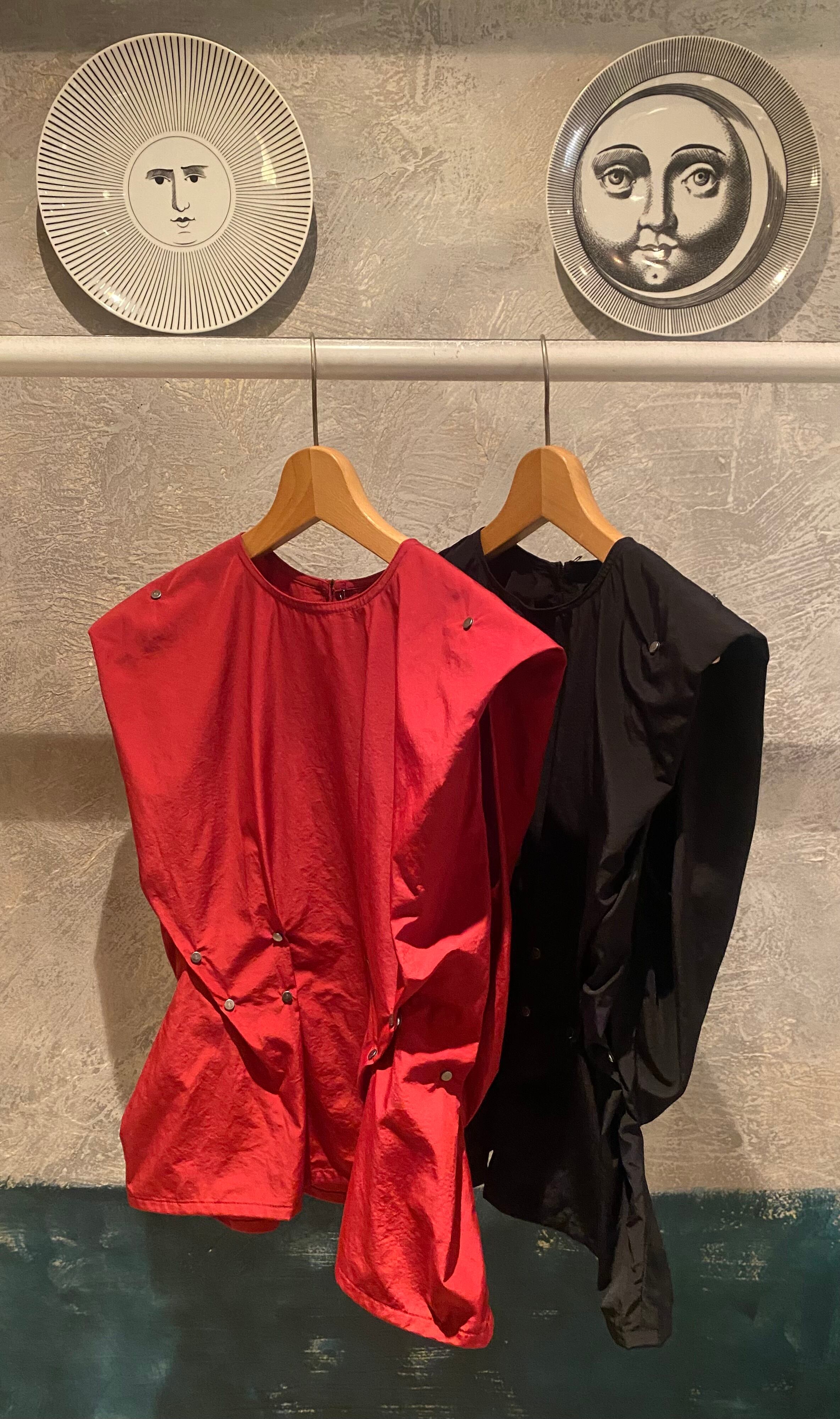 ドットボタンが特徴的なトップス。ボタンの開閉でシルエットを変えられます。肩からウエストにかけて並ぶボタンが、視覚的なアクセントを加え、モダンな雰囲気を演出します。