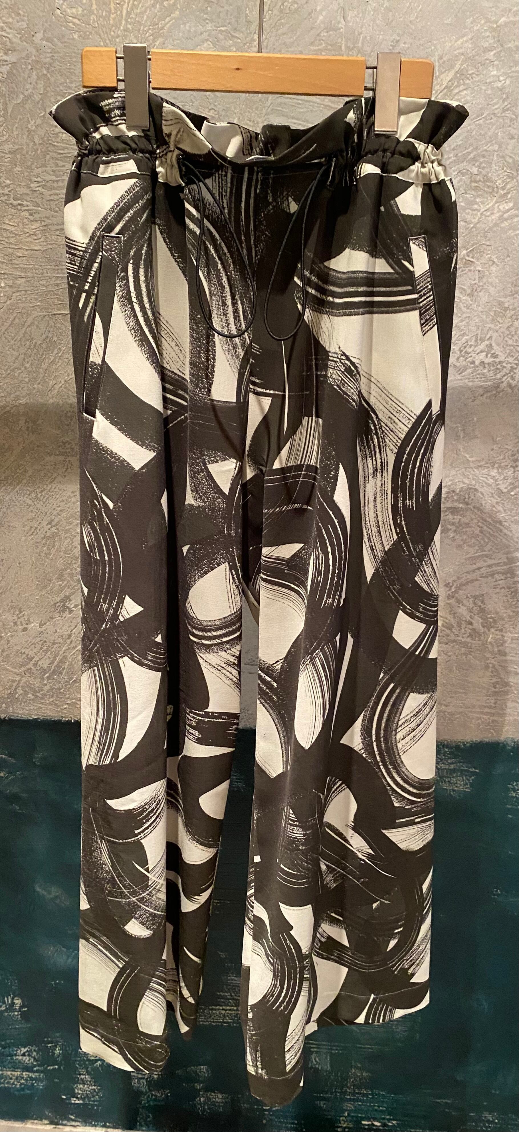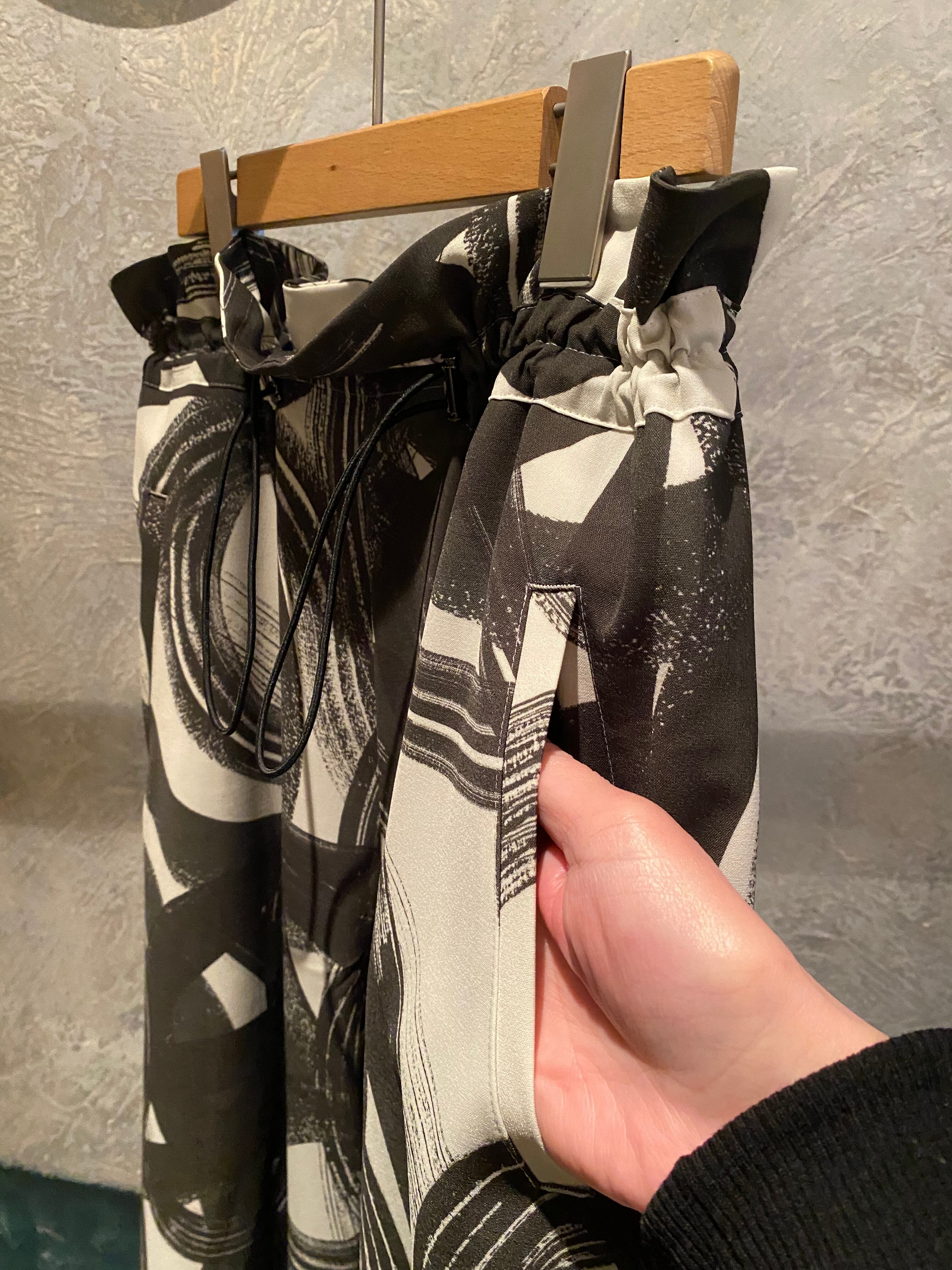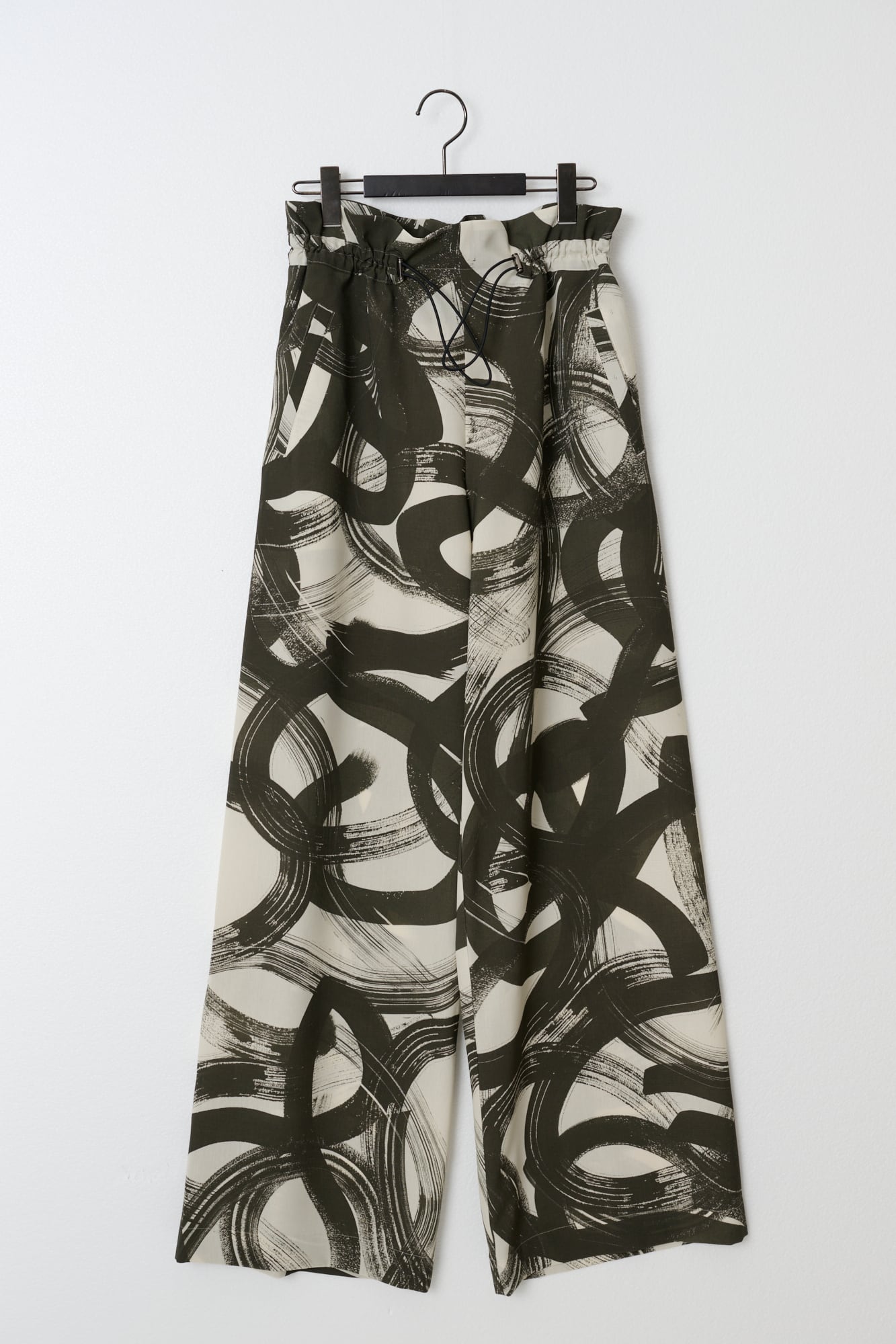 極力ディテールをシンプルにする事でダイナミックなプリント柄を活かしたワイドパンツ。ウエストドローコードがアクティブなアクセントになり、シンプルながらも1枚でサマになるアイテムです。
