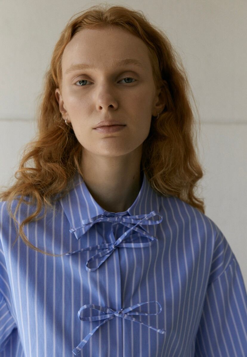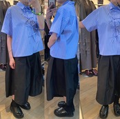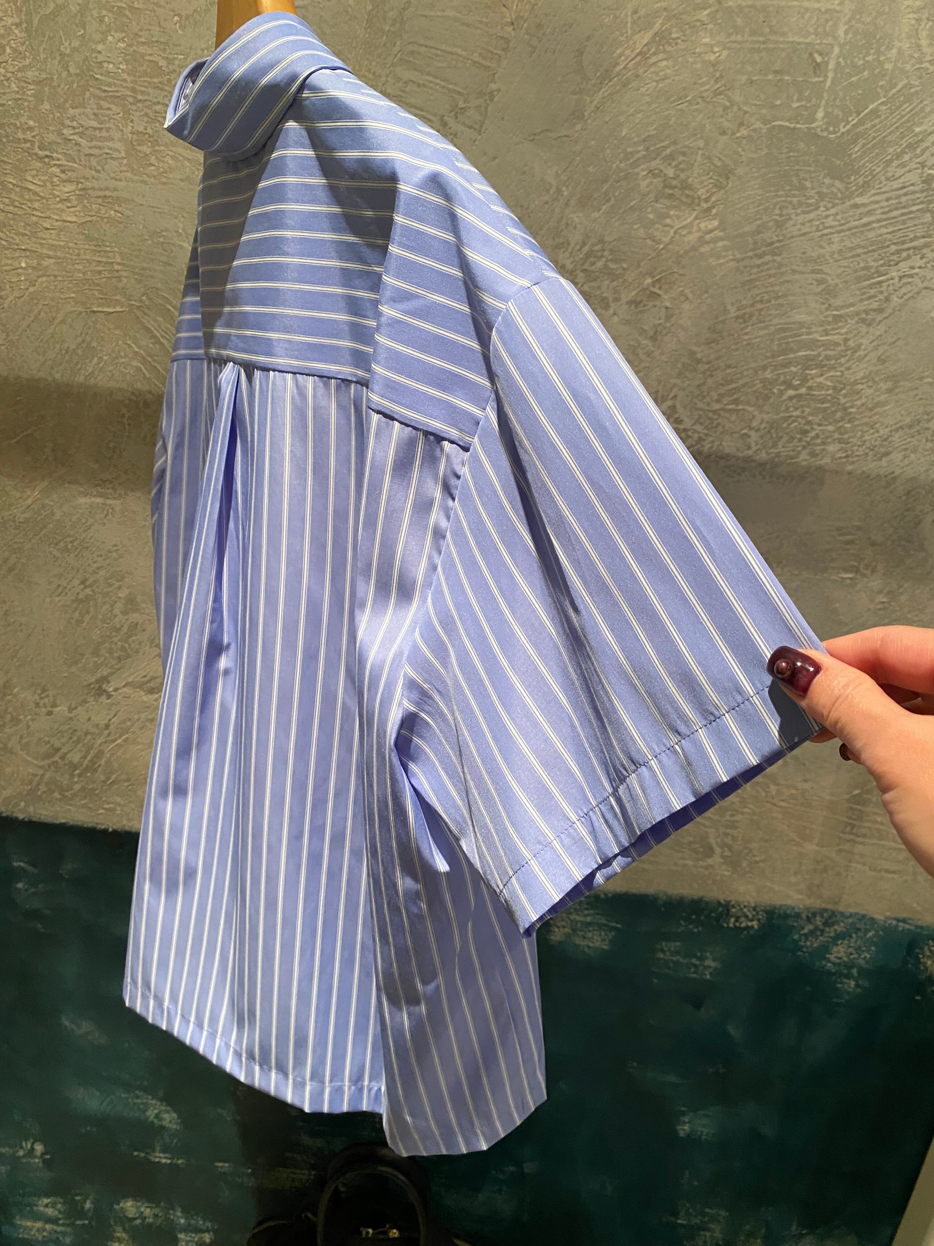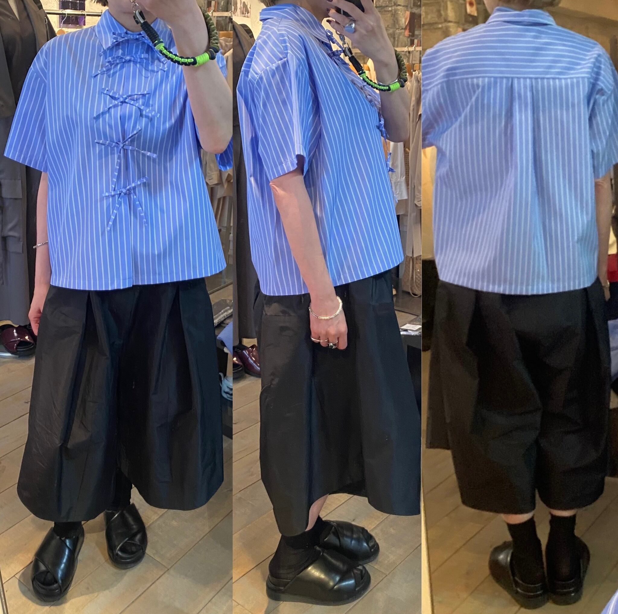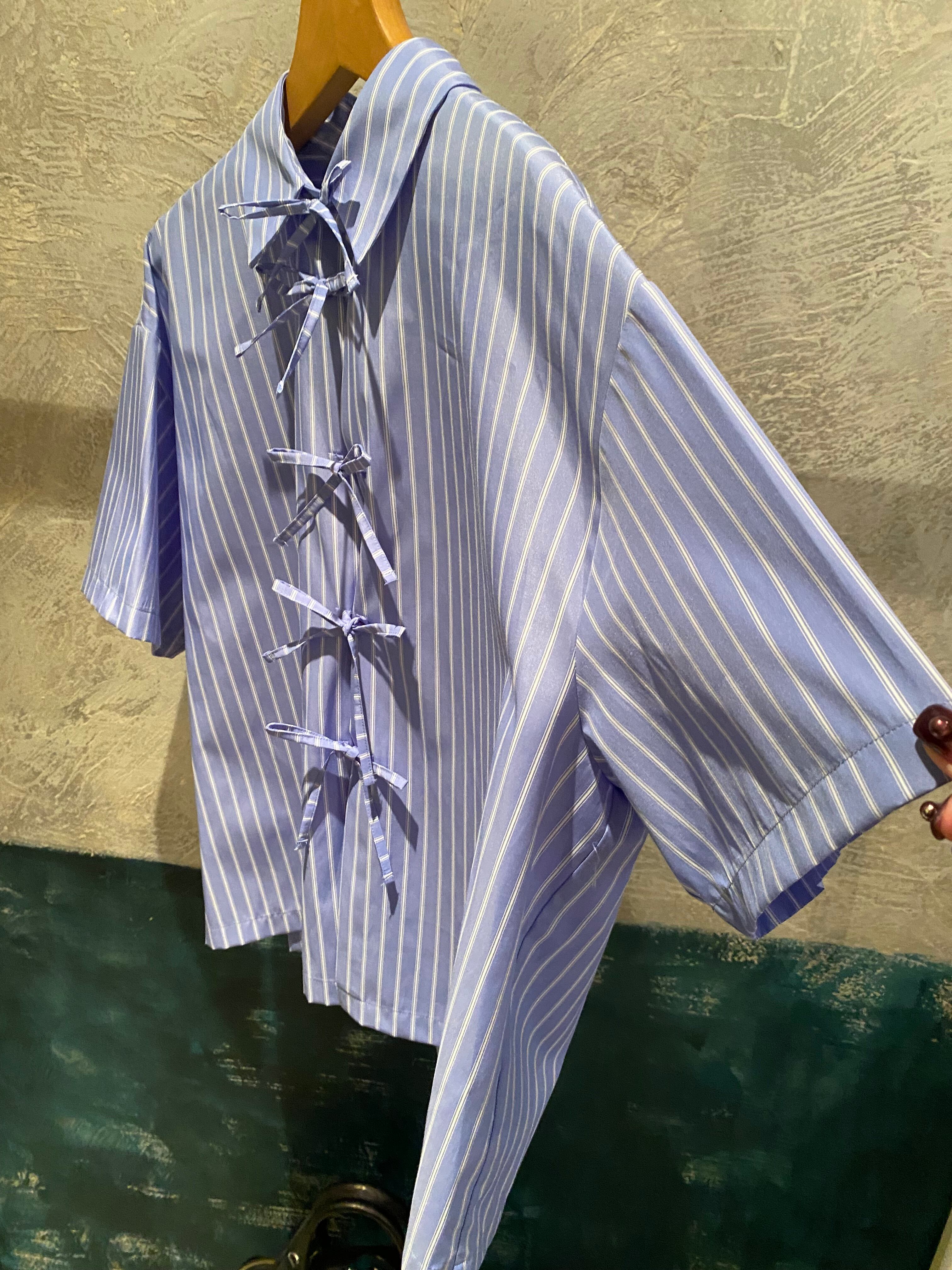 フロント部分にポイントを持たせたハーフスリーブシャツ。爽やかなblue系のストライプで、上品な光沢感も◎全て閉めて着用しても、少しリボンを外して着るのも雰囲気が変わります。