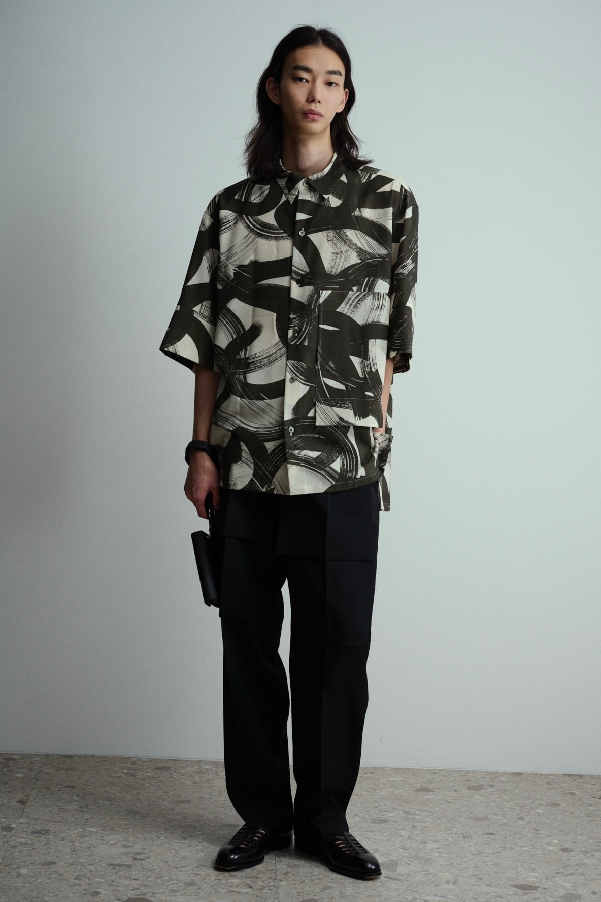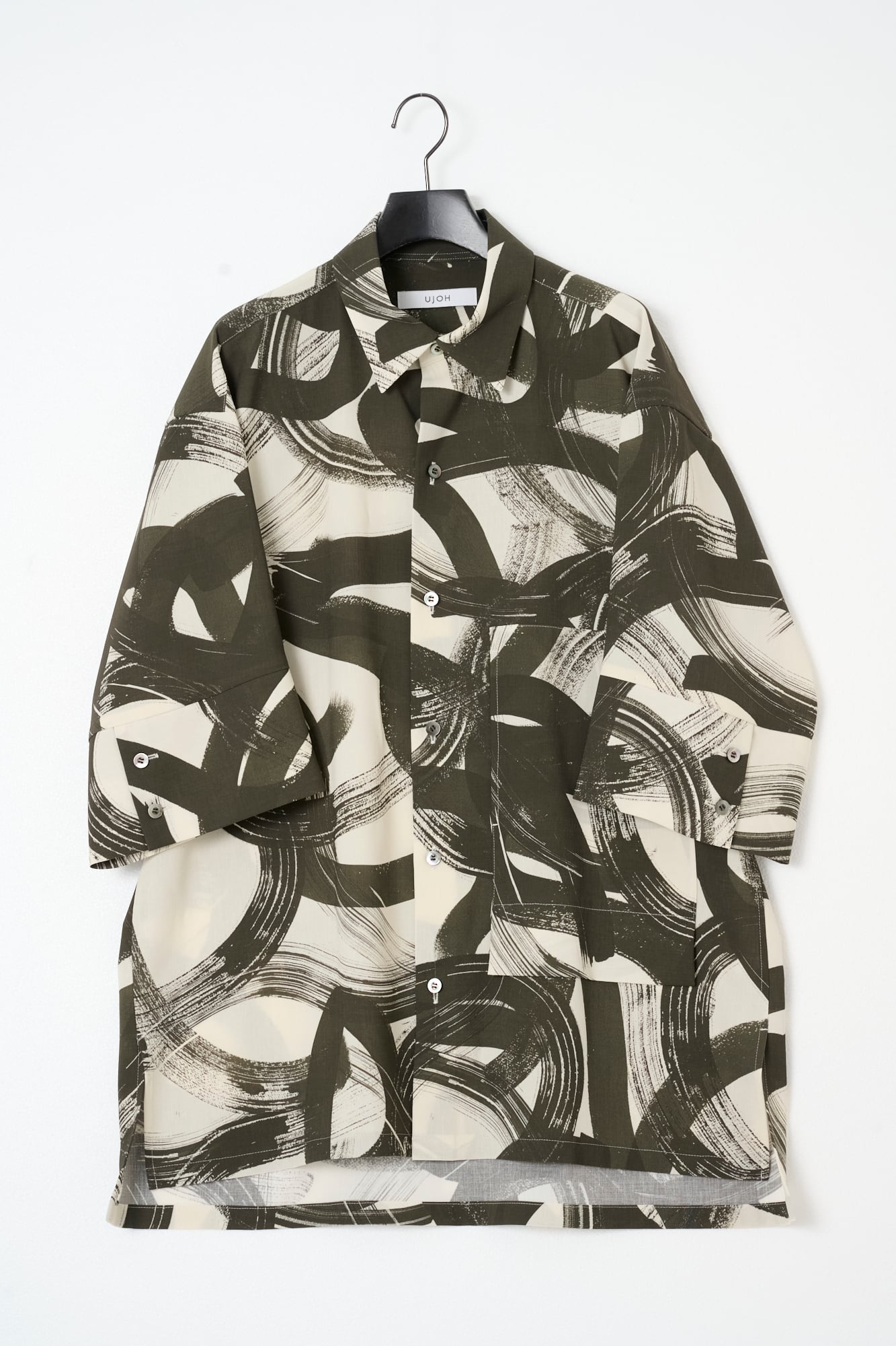 柄は、「UJOHが歩んできた軌跡から繋がる未来えの"可能性"の道」をテーマに描かれた図案です。シックアンドシンの糸特有のムラ感によるナチュラルな表情のある生地をベースにすることで、グラフィックに立体感を与えています。ドライタッチな肌触りとナチュラルなストレッチも特徴の生地です。