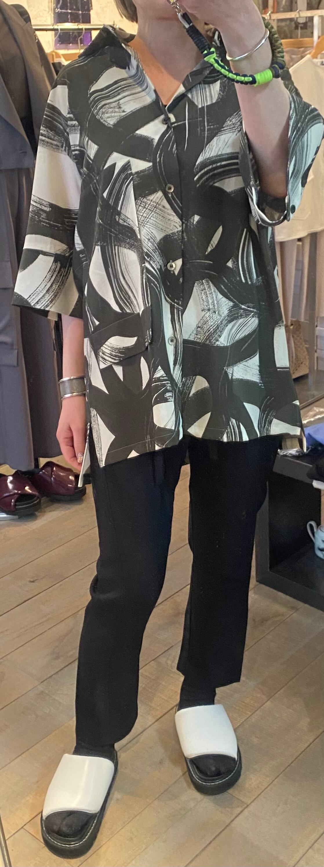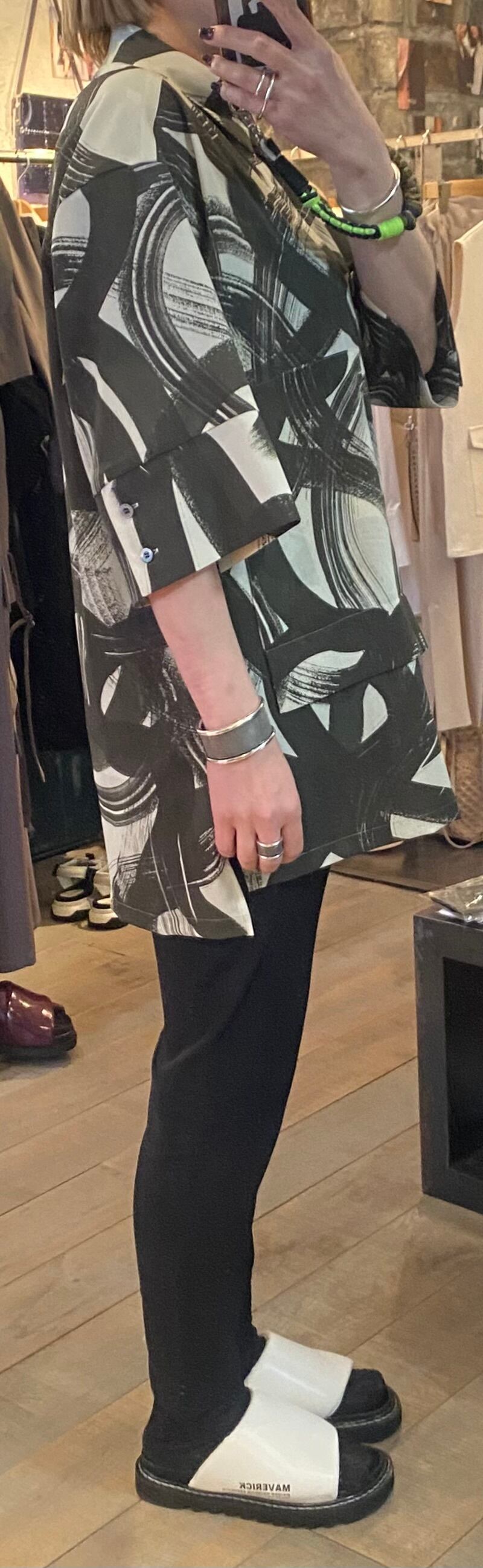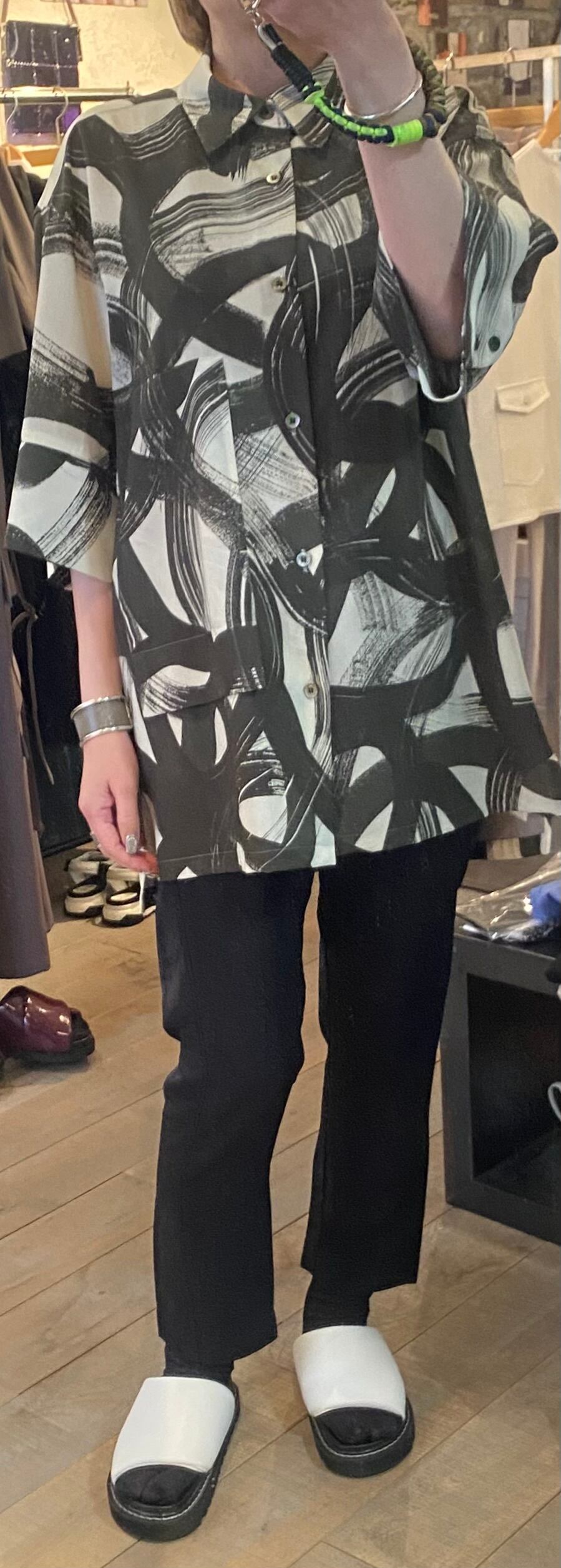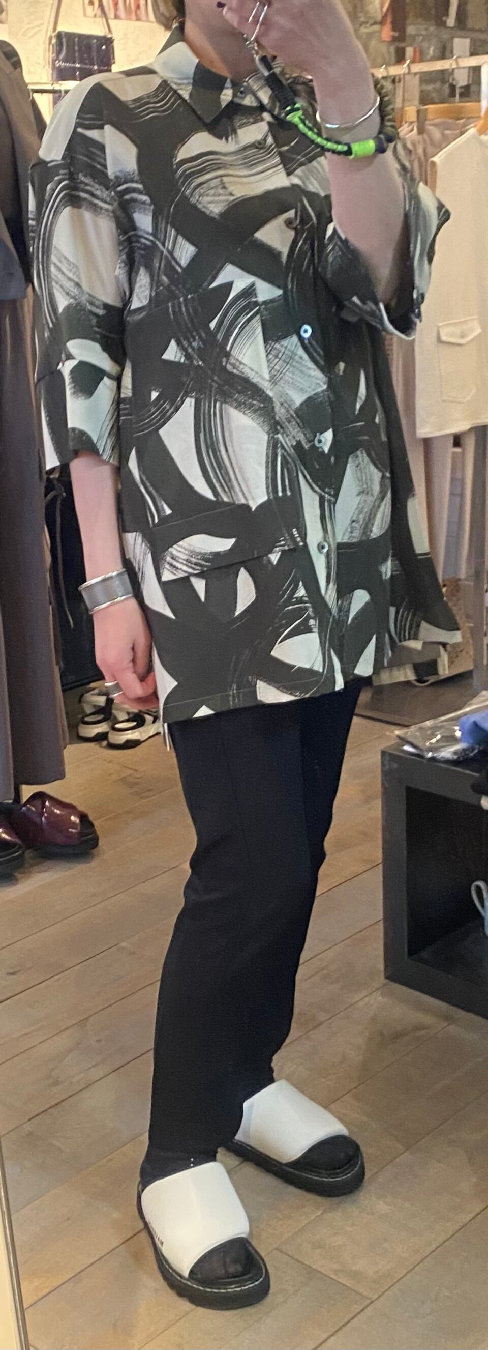 スリットの入った大ぶりのカフスが特徴的な5部袖のオーバーシルエットのシャツ。脇にもアクセントにスリットを入れています。アウトポケットは、サイドインポケットに仕上げています。サラッと着るだけで雰囲気の出るブラウスです。