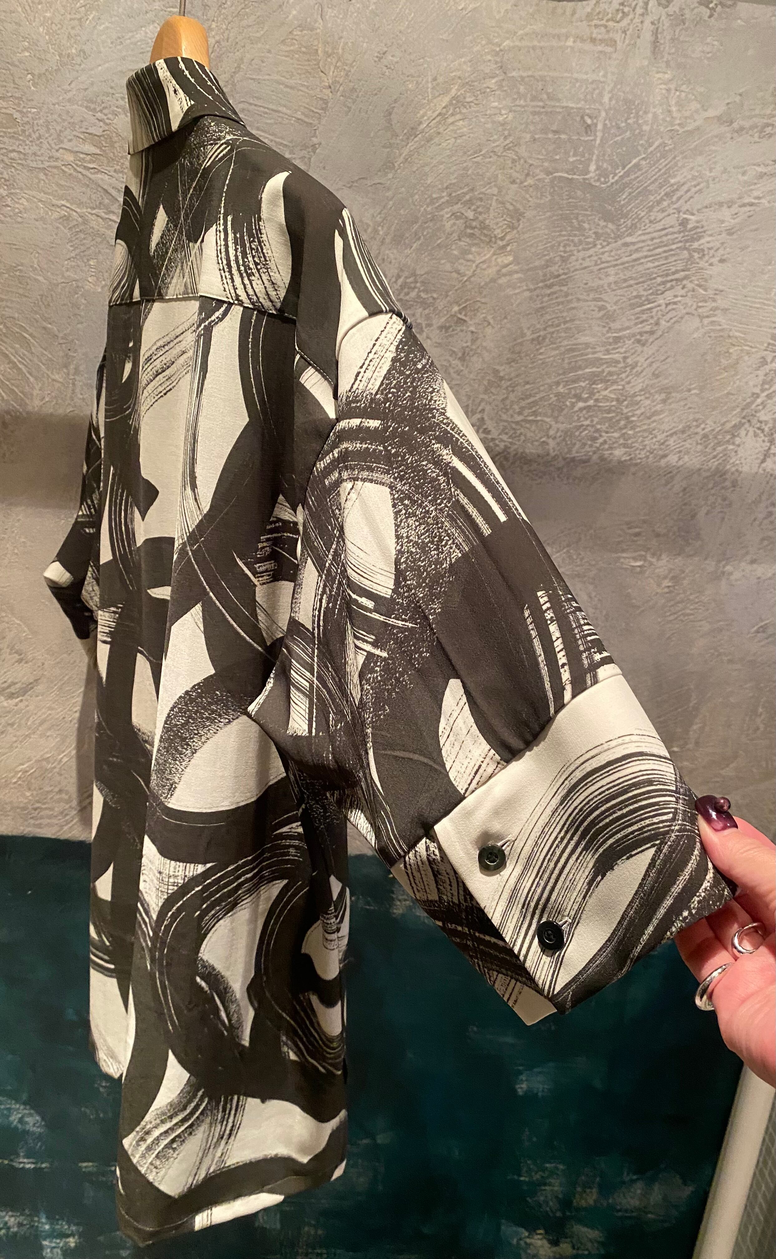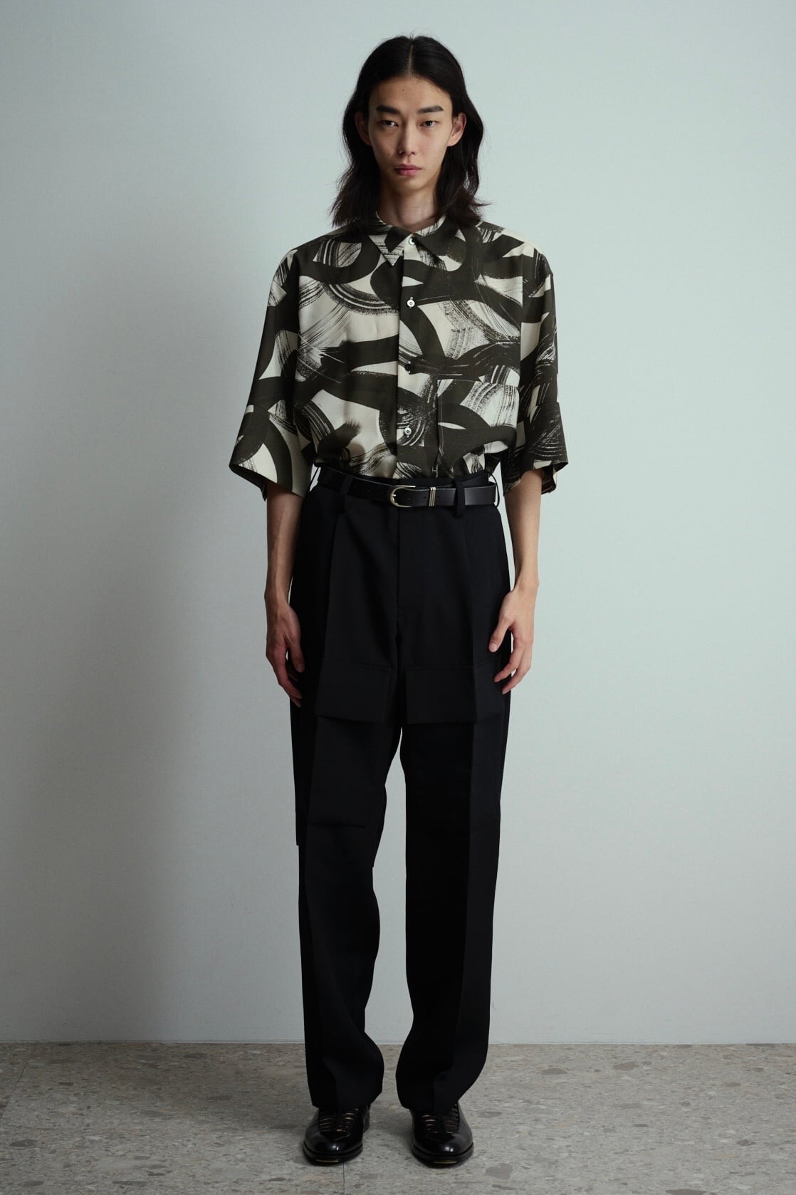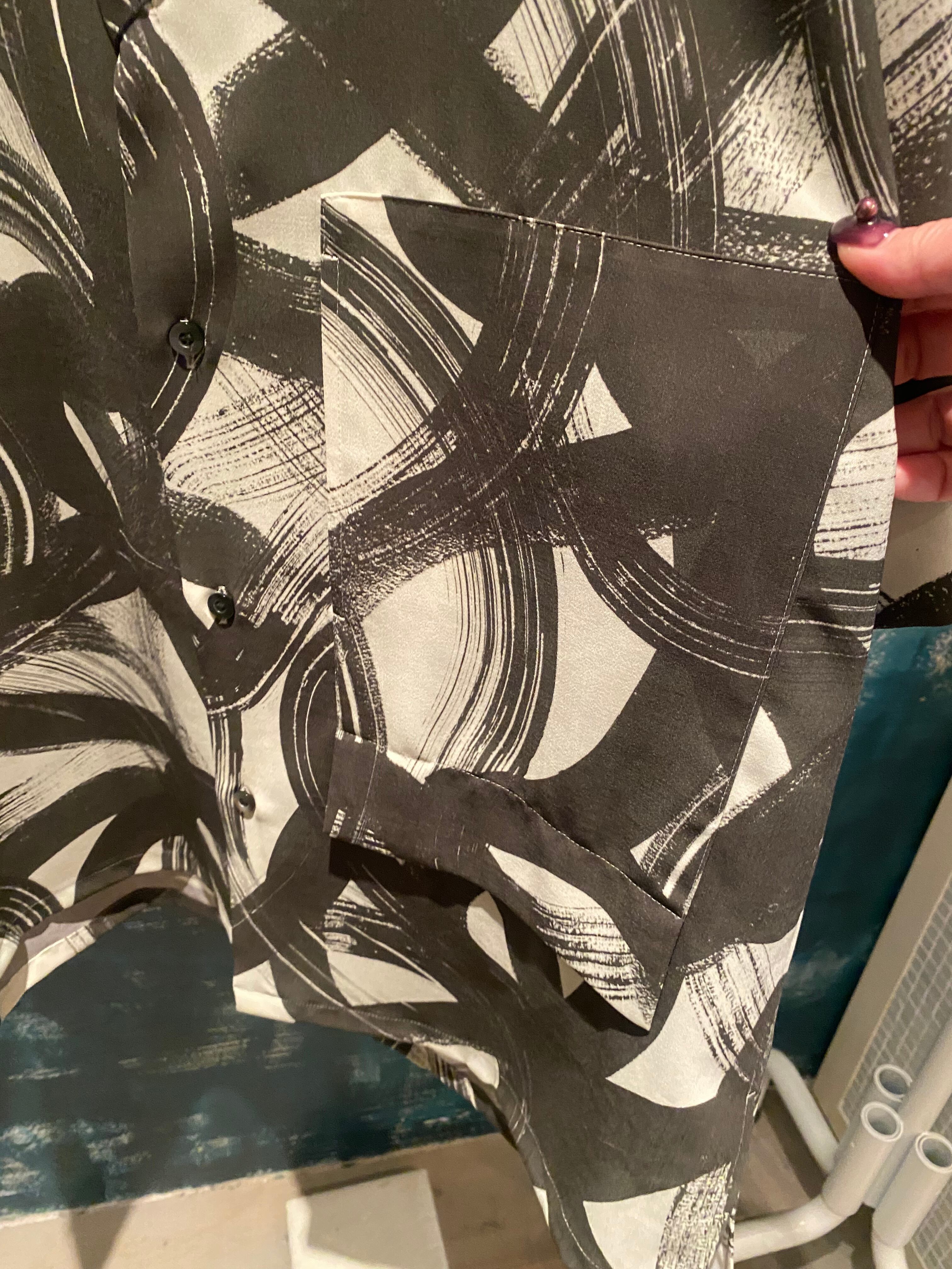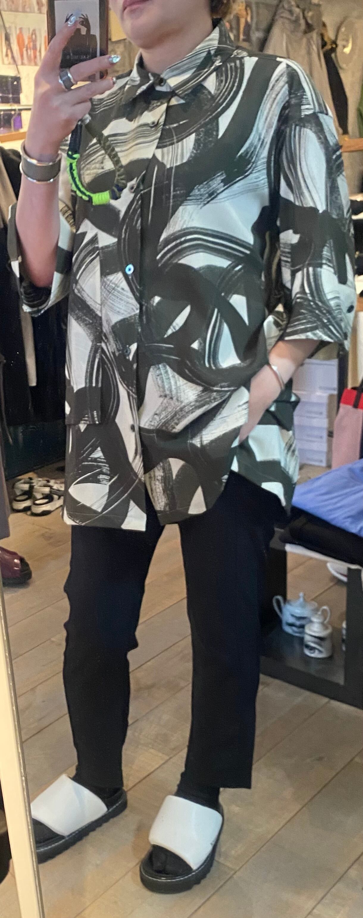 スリットの入った大ぶりのカフスが特徴的な5部袖のオーバーシルエットのシャツ。脇にもアクセントにスリットを入れています。アウトポケットは、サイドインポケットに仕上げています。サラッと着るだけで雰囲気の出るブラウスです。