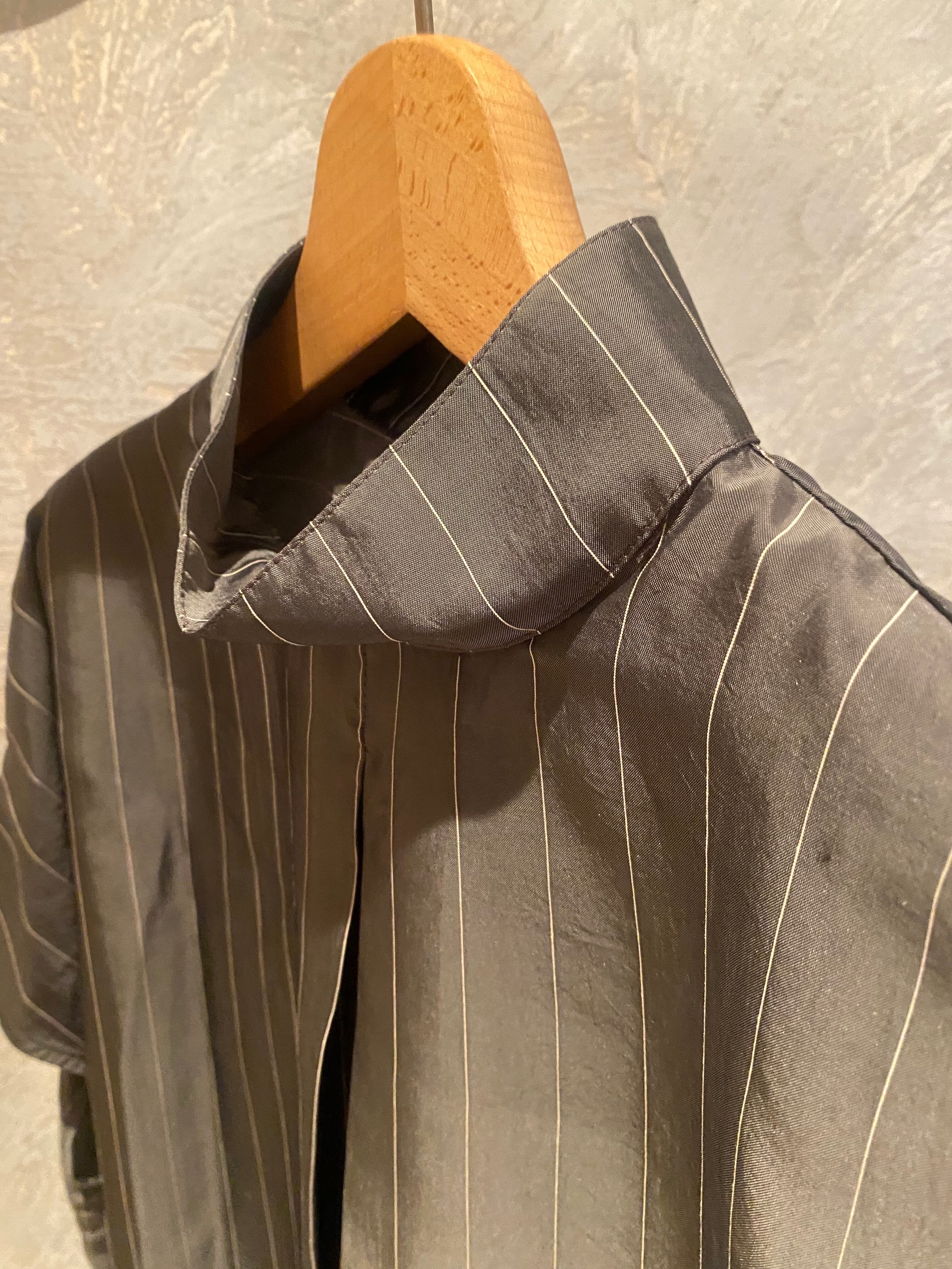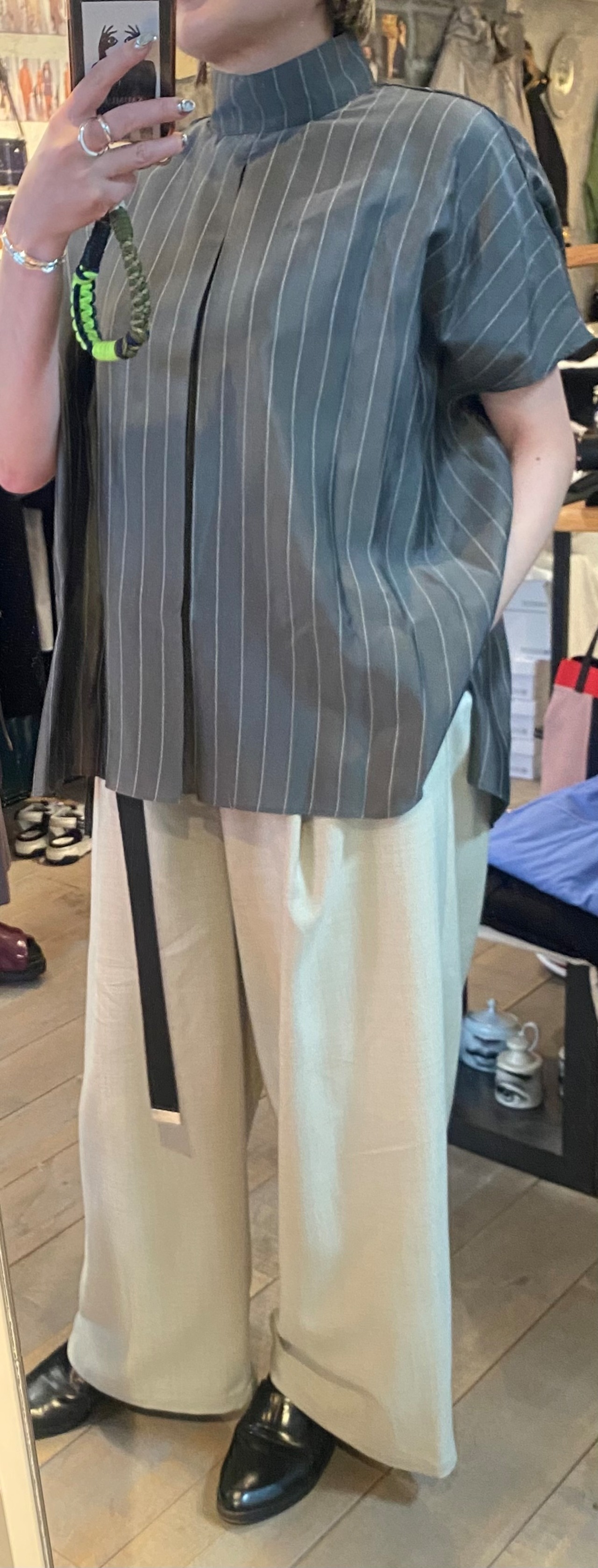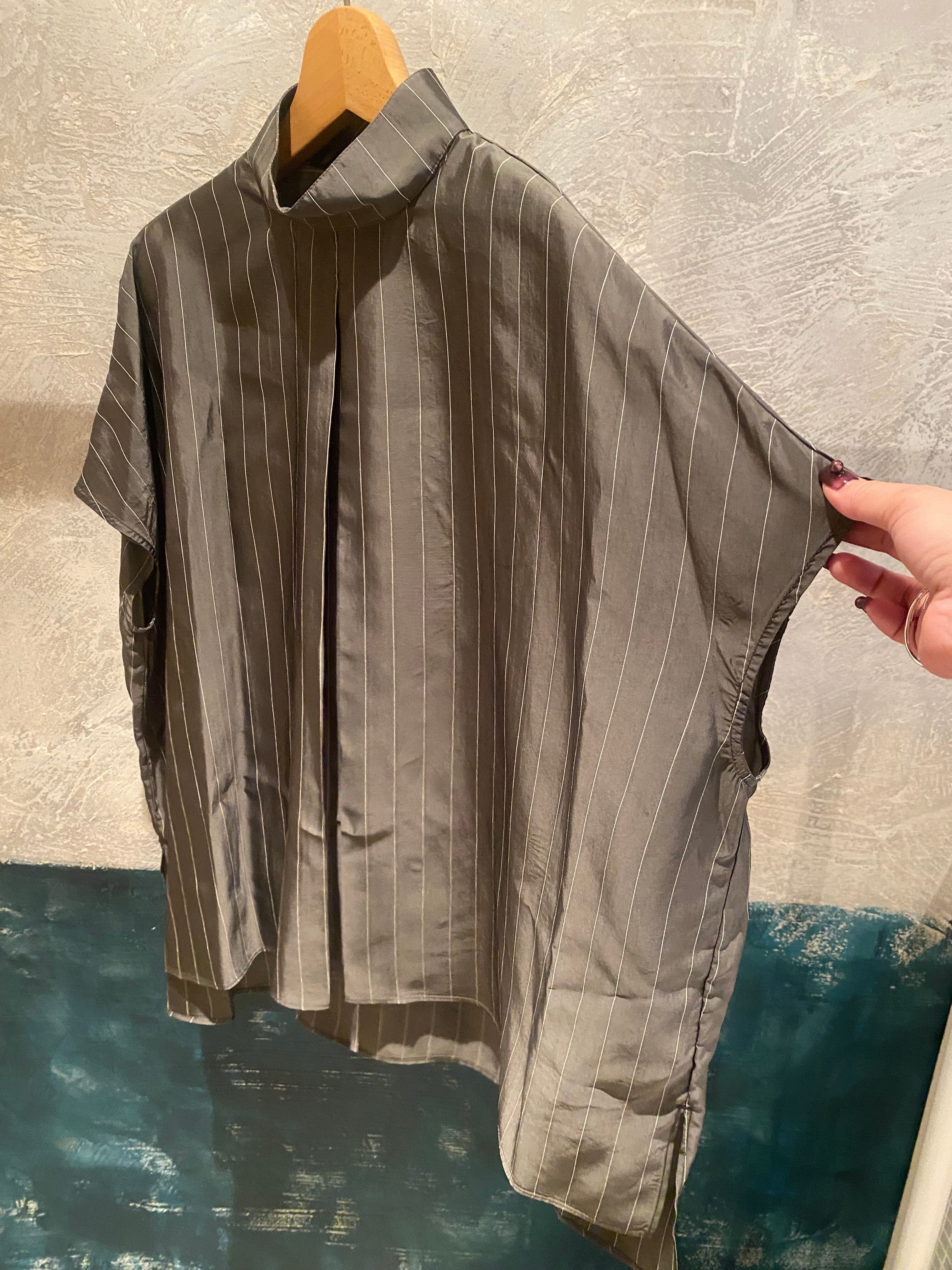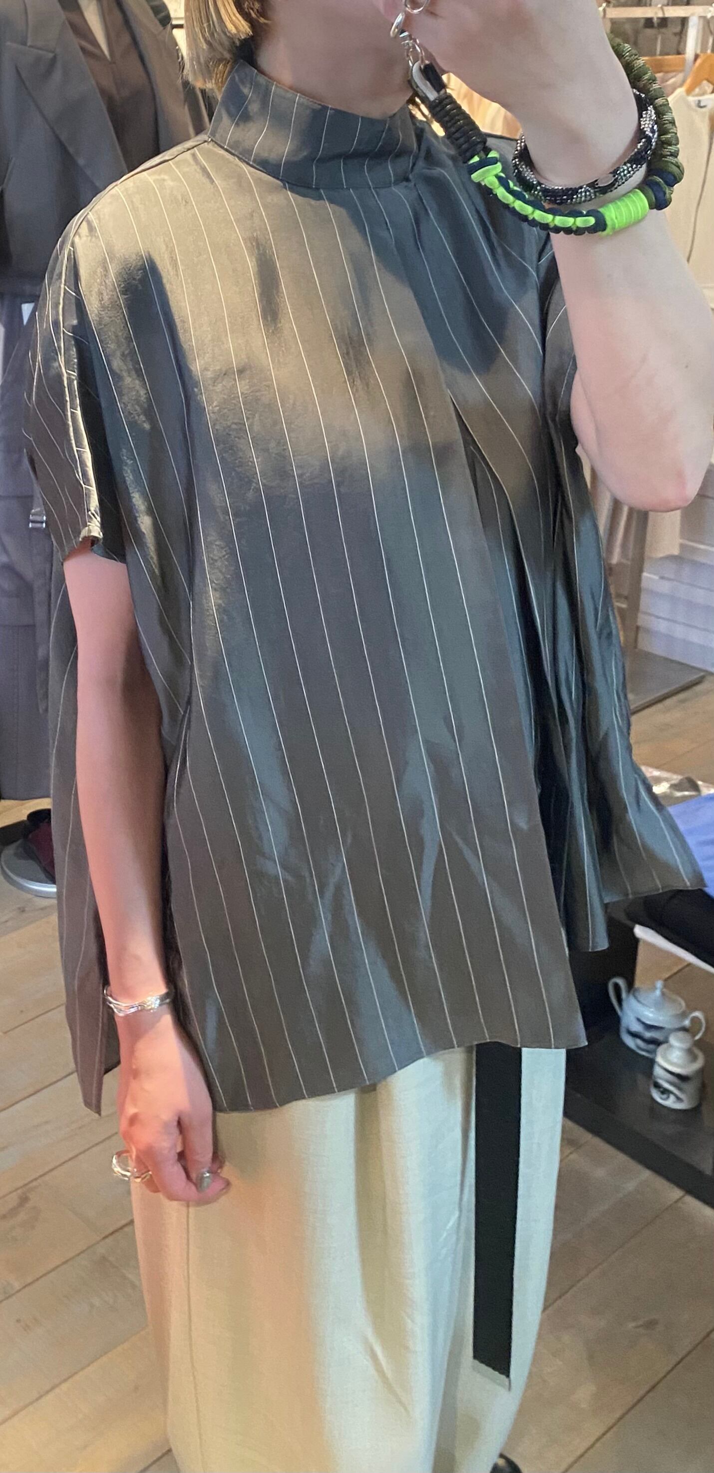 オーバーシルエットで、サラッと着用できるブラウス。ハイネックとストライプでシャープな印象。フロントのワンボックスのデザインも特徴的。上品な光沢感で、ボトムにインする着方も、両サイドの裾のスリットで軽さもあるので出してサラッと着用するのも◎素材は、キュプラフィラメントと綿の長短複合織物をストライプでお作りした接触冷感が心地良い素材となっています。
