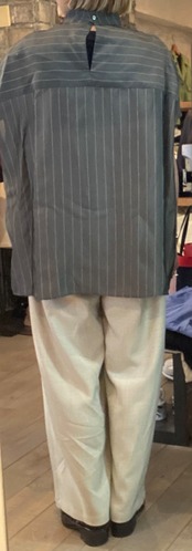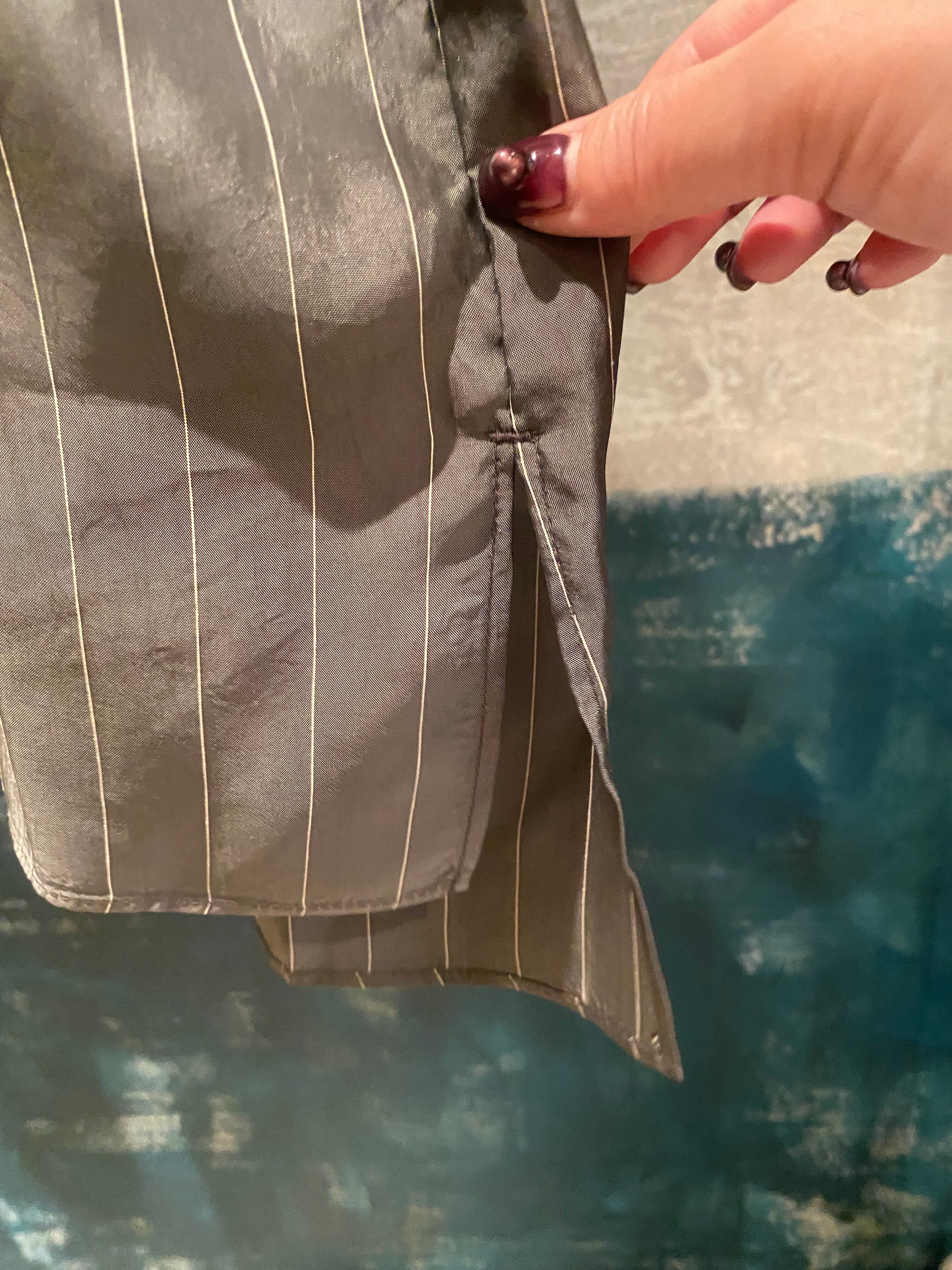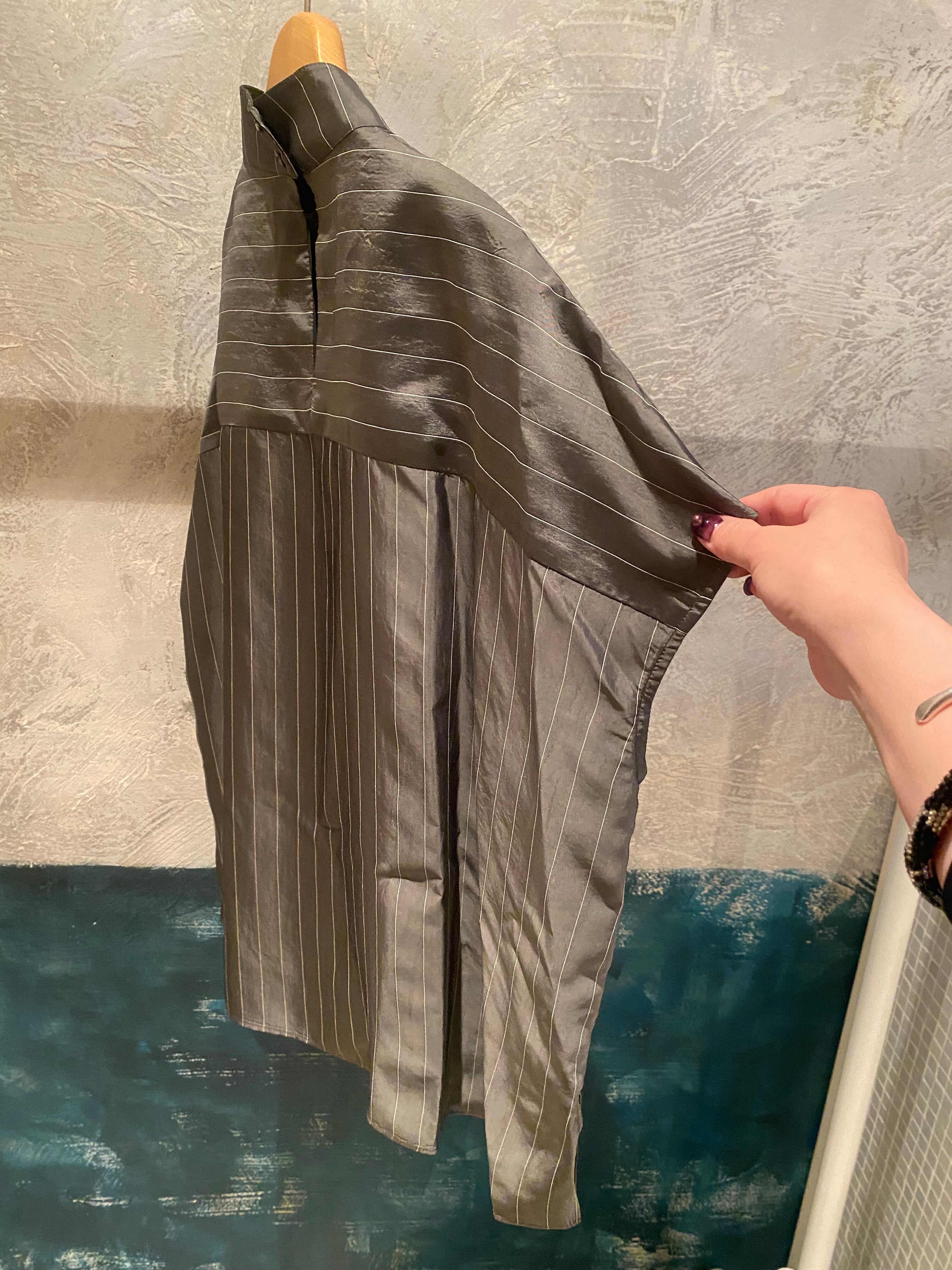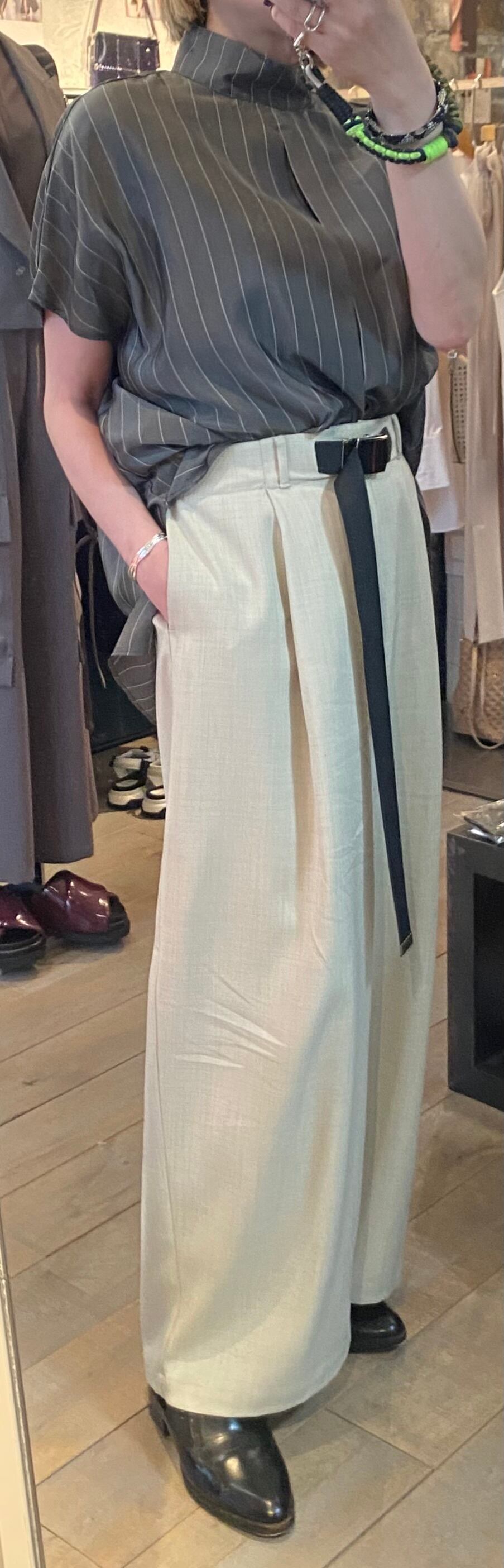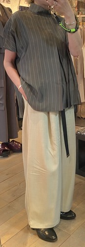 オーバーシルエットで、サラッと着用できるブラウス。ハイネックとストライプでシャープな印象。フロントのワンボックスのデザインも特徴的。上品な光沢感で、ボトムにインする着方も、両サイドの裾のスリットで軽さもあるので出してサラッと着用するのも◎素材は、キュプラフィラメントと綿の長短複合織物をストライプでお作りした接触冷感が心地良い素材となっています。
