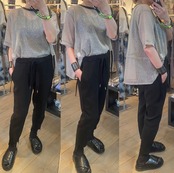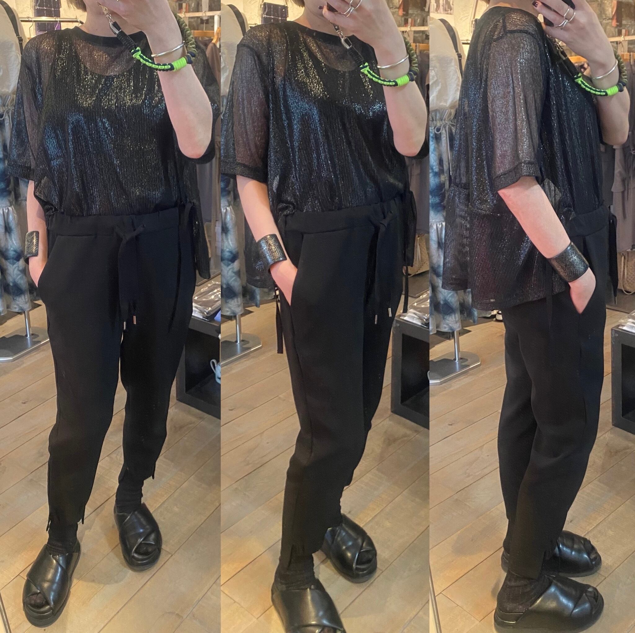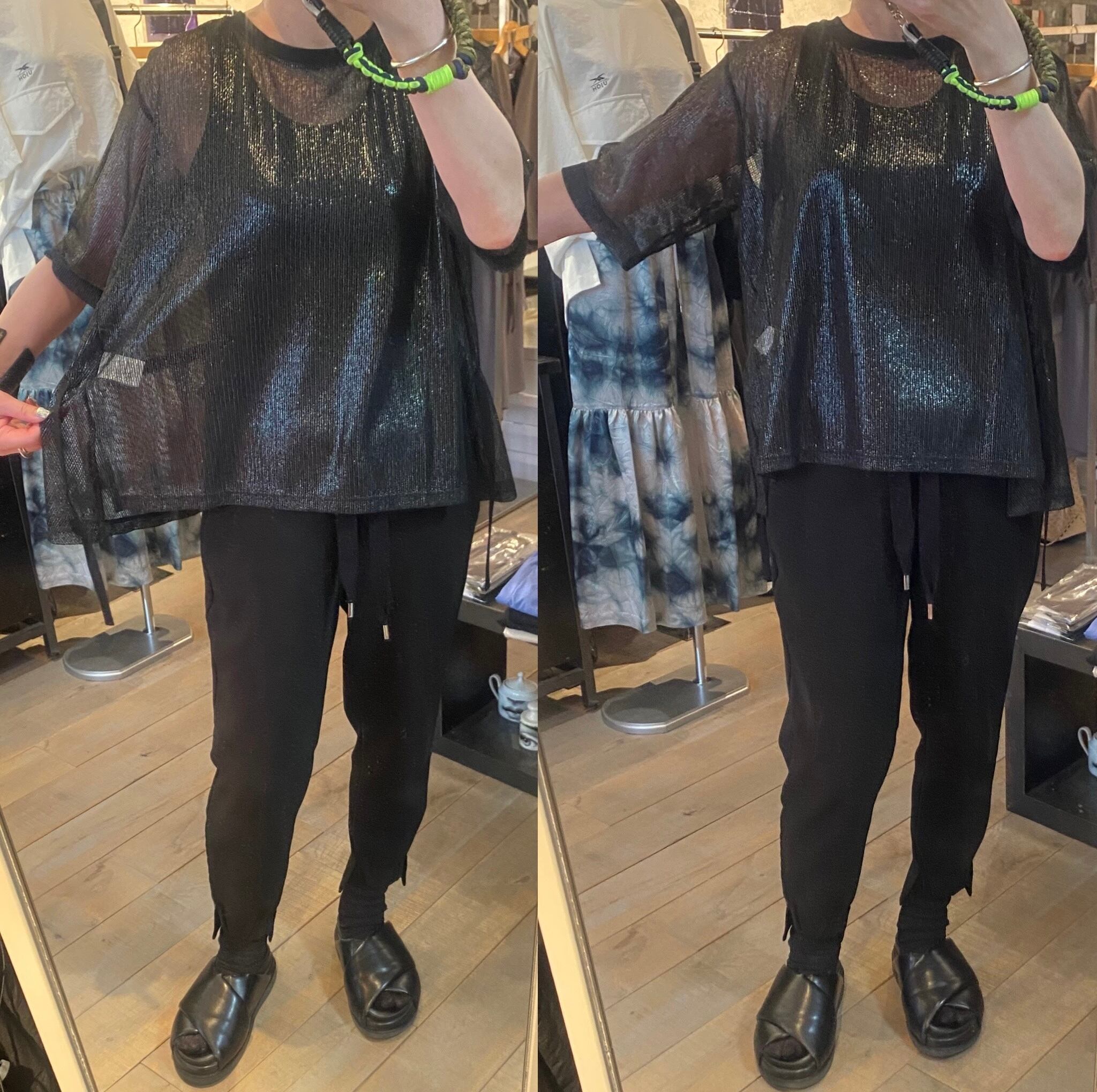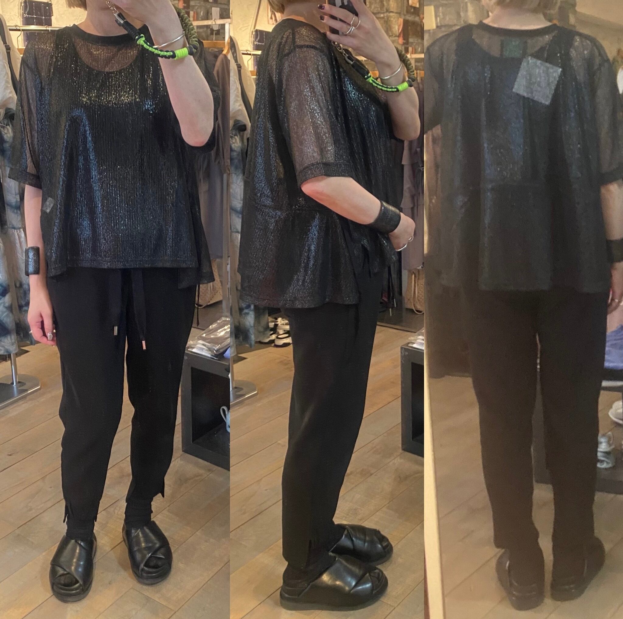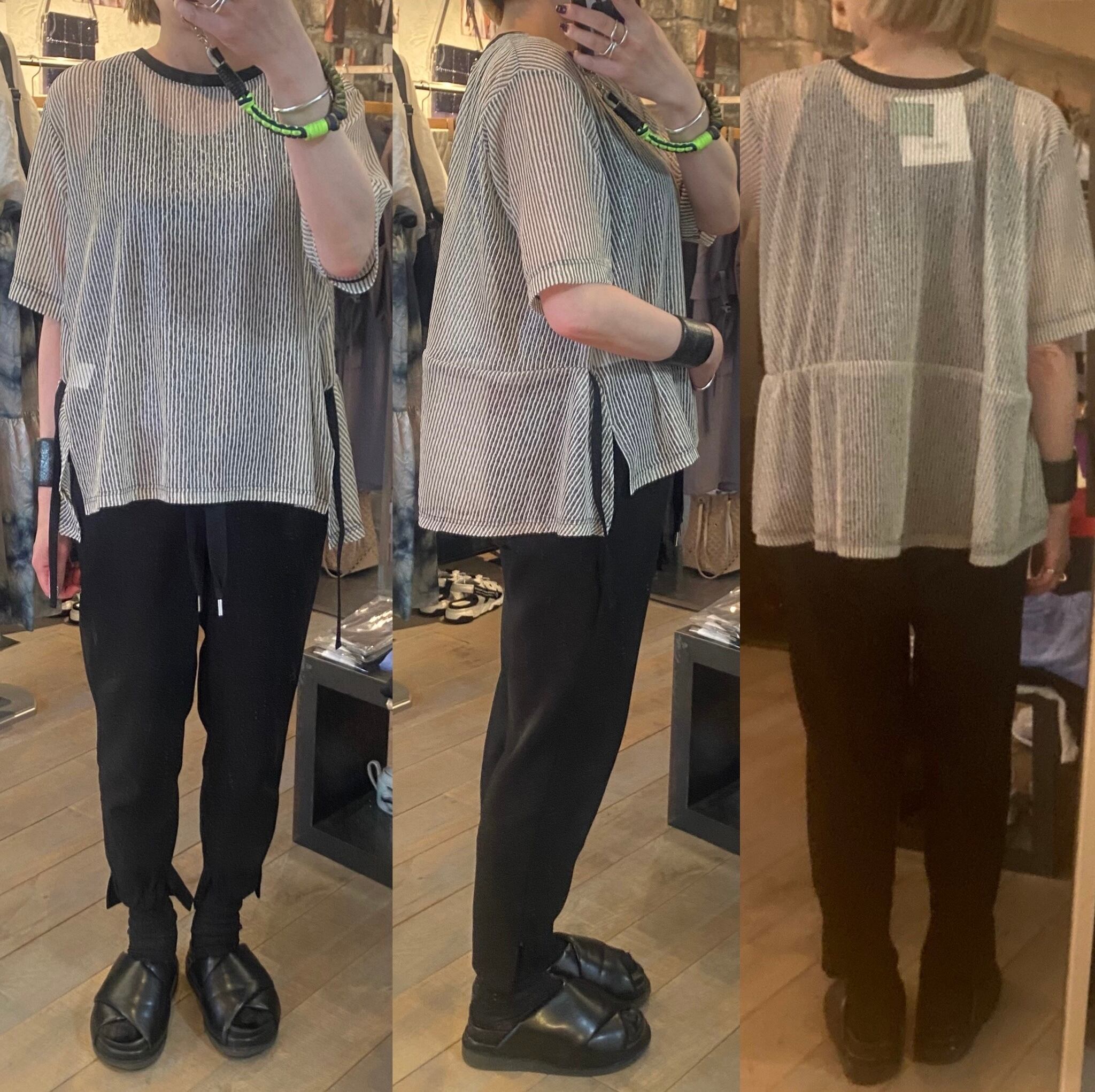 ストライプ柄のレース地の上にフォイルを乗せた素材のトップス。透け感とラメの光沢感が爽やかな夏感高いジャージー素材。後ろ見頃のギャザーのデザインがポイントで、絞らずフワッと着用しても、ギャザーを寄せてシルエットを変えるのも◎両サイド裾スリット有り。伸縮性も高く着心地も良いです。