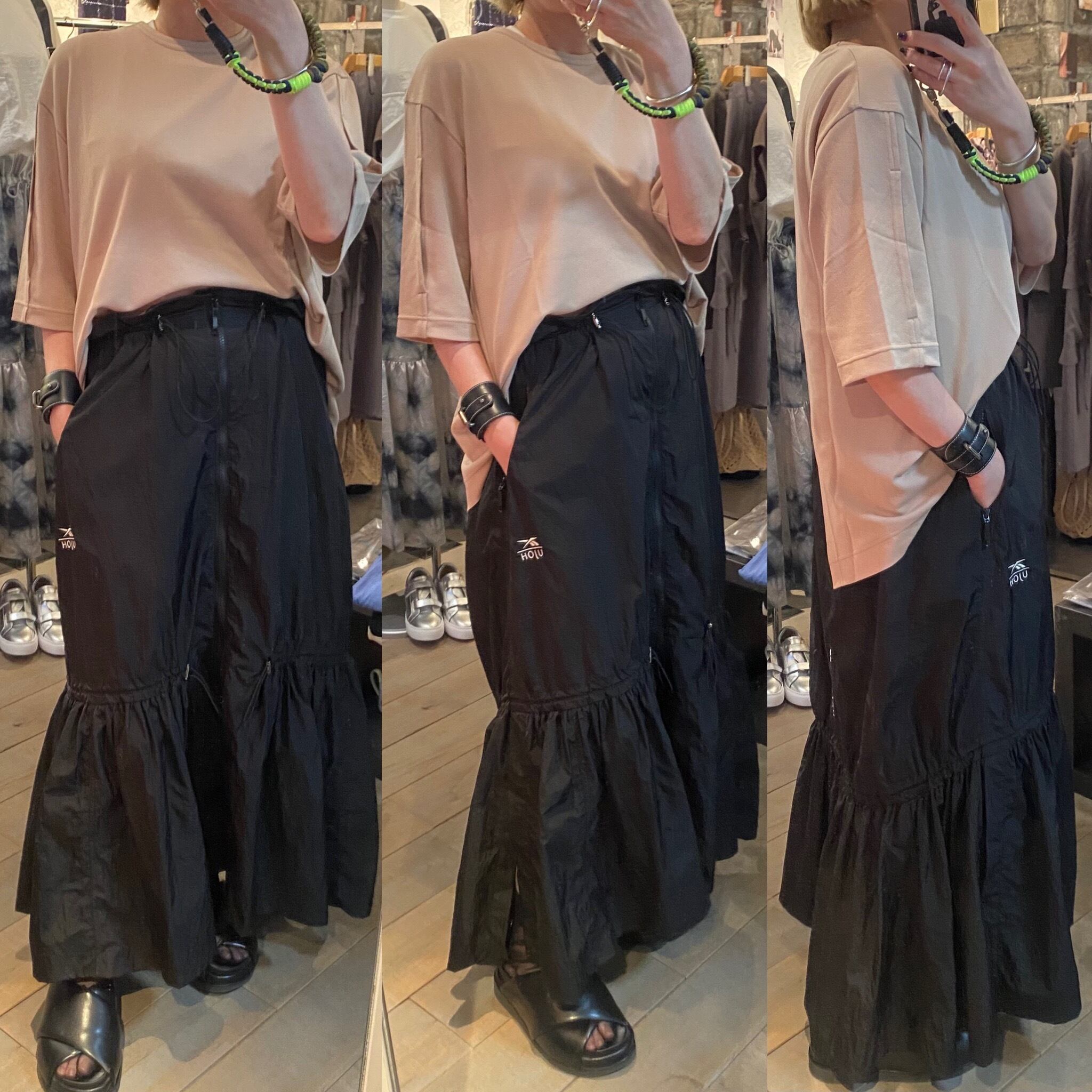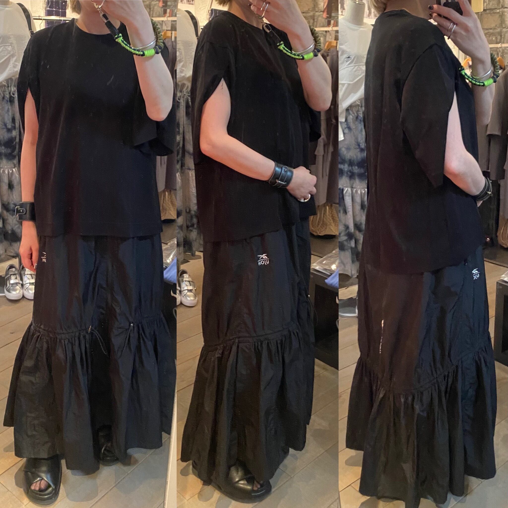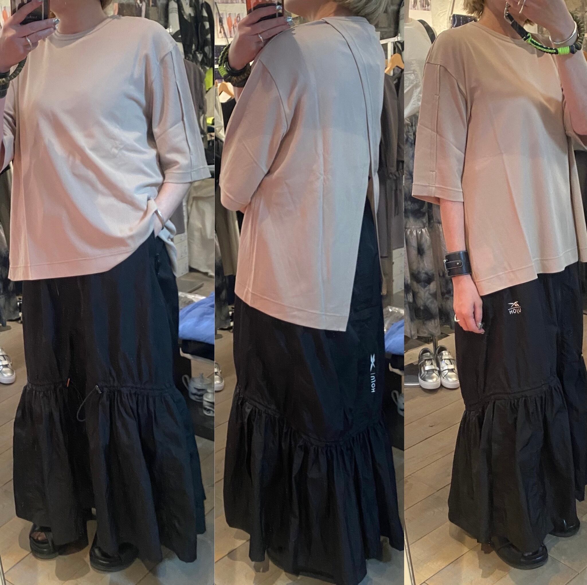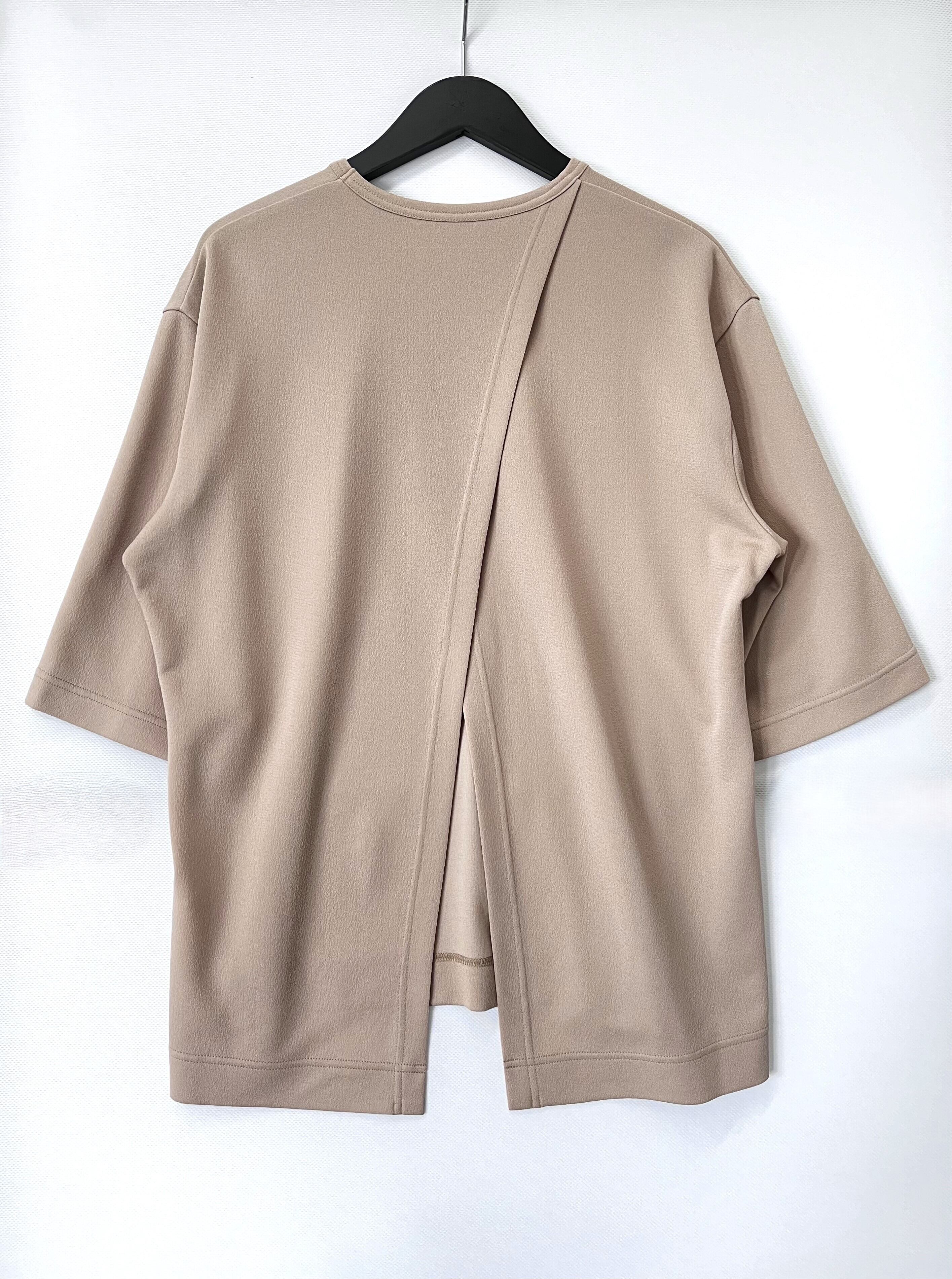 後ろ見頃に大胆にスリット入れ、抜け感のあるカットソー。袖に入ったスリットから腕を出し、半袖とは違った着こなしもできます。
