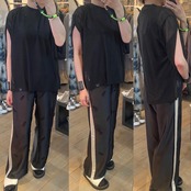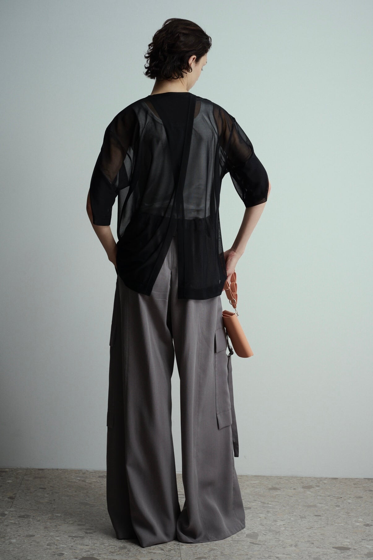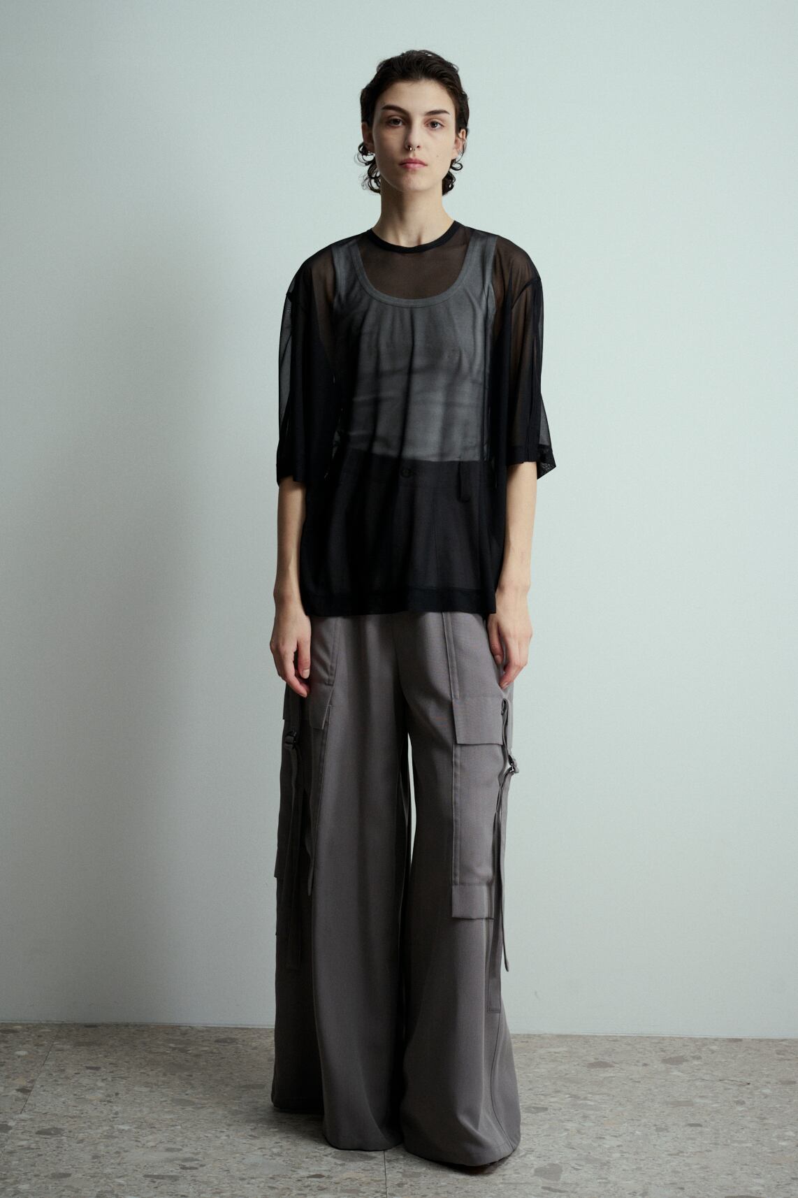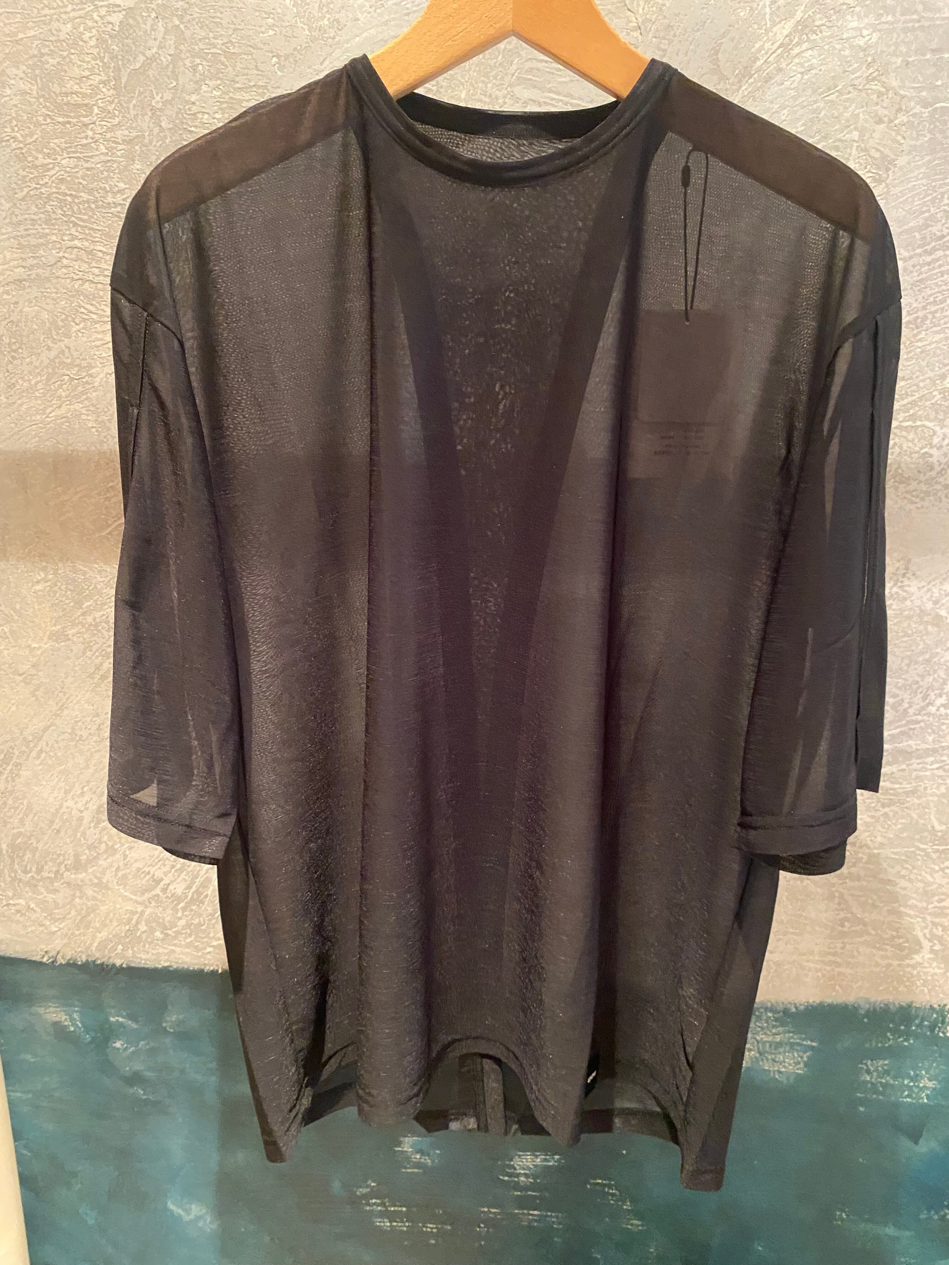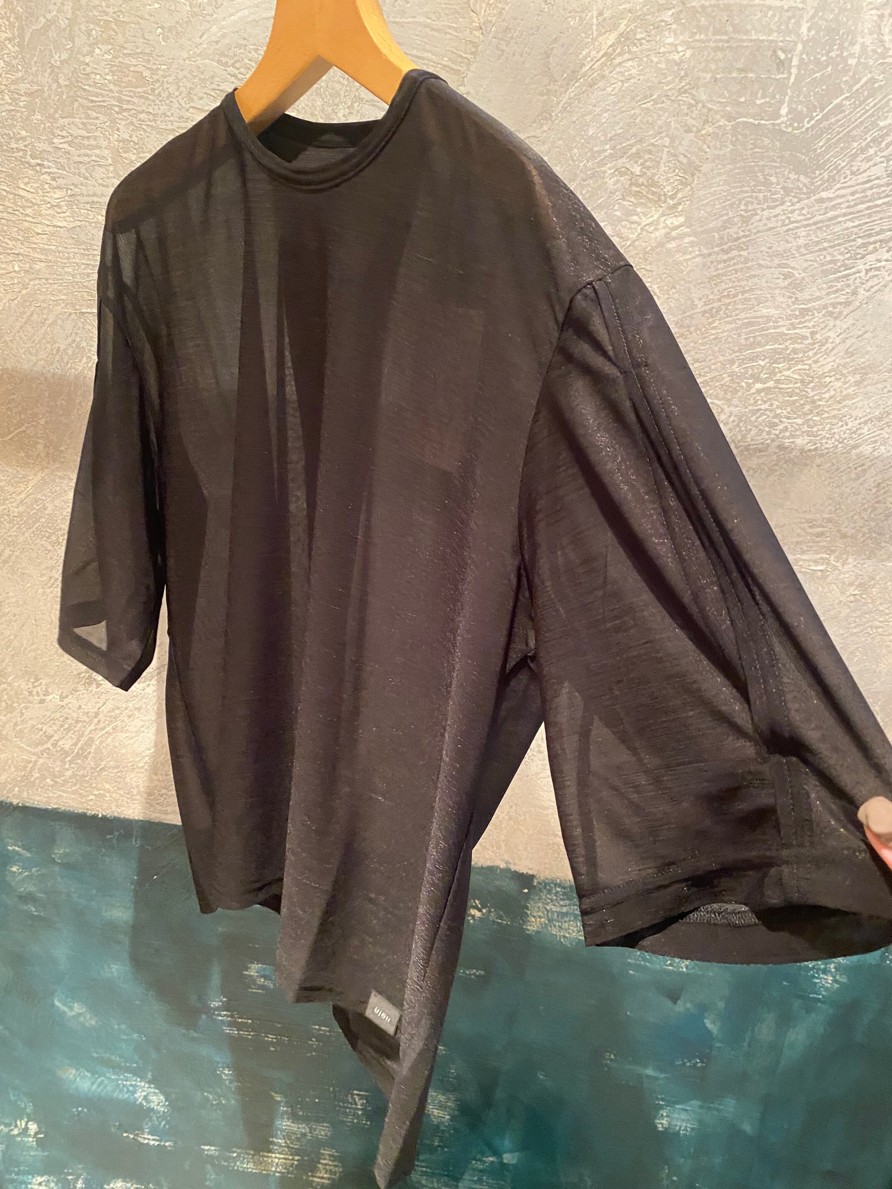 シルクのような質感と微光沢が特徴のエスパンディ糸を使用した天竺素材です。細番手による透明感と美しいドレープ、ソフトな肌触りが特徴のシアーカットソー。後ろ見頃に大胆にスリット入れ、抜け感のあるカットソー。袖に入ったスリットから腕を出し、半袖とは違った着こなしもできます。