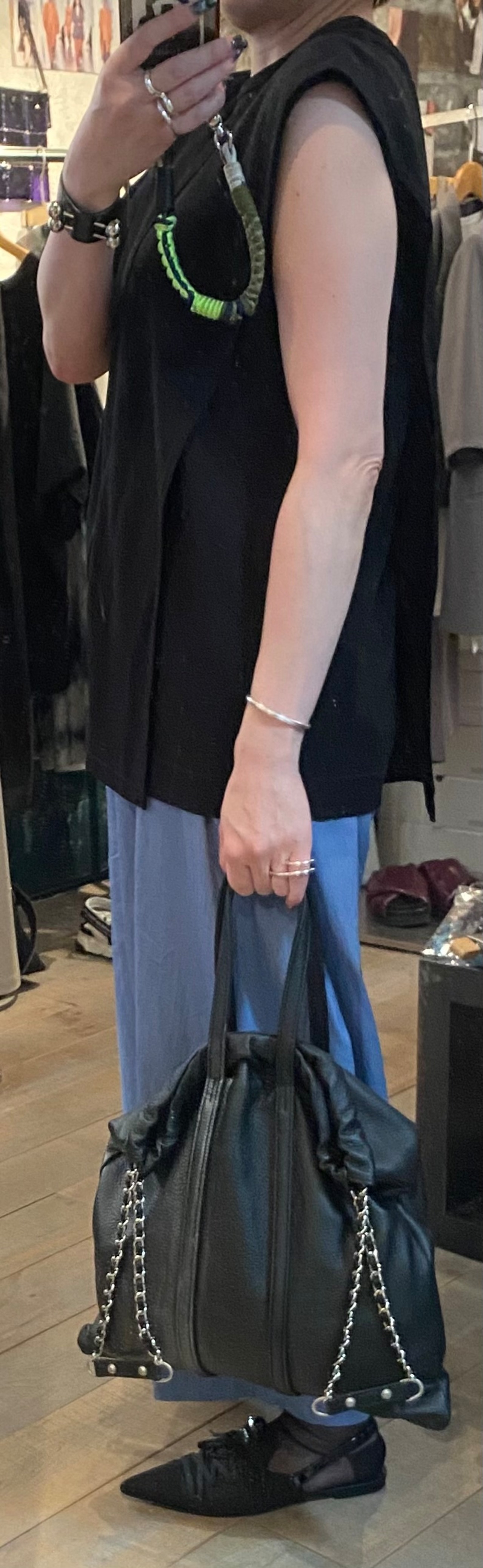 ハンドルとは別にあるチェーンがポイントに。内側にファスナー有りポケット1つ、ファスナー無しポケット2ヶ所有り。