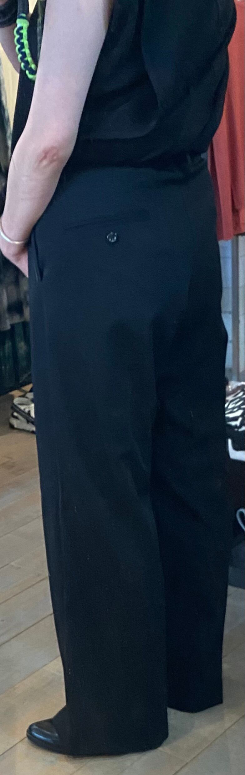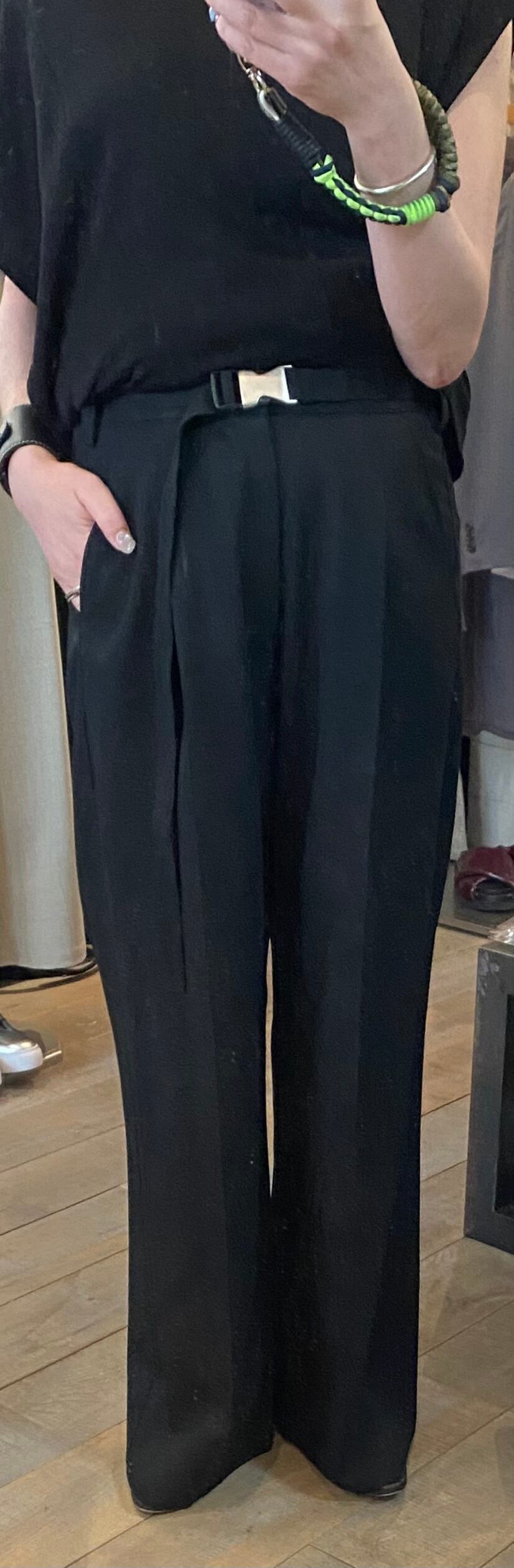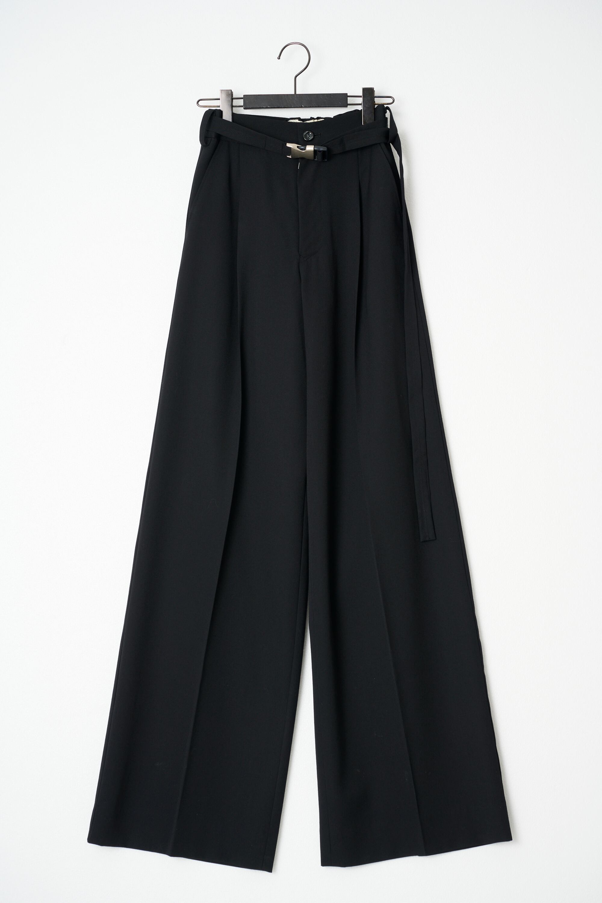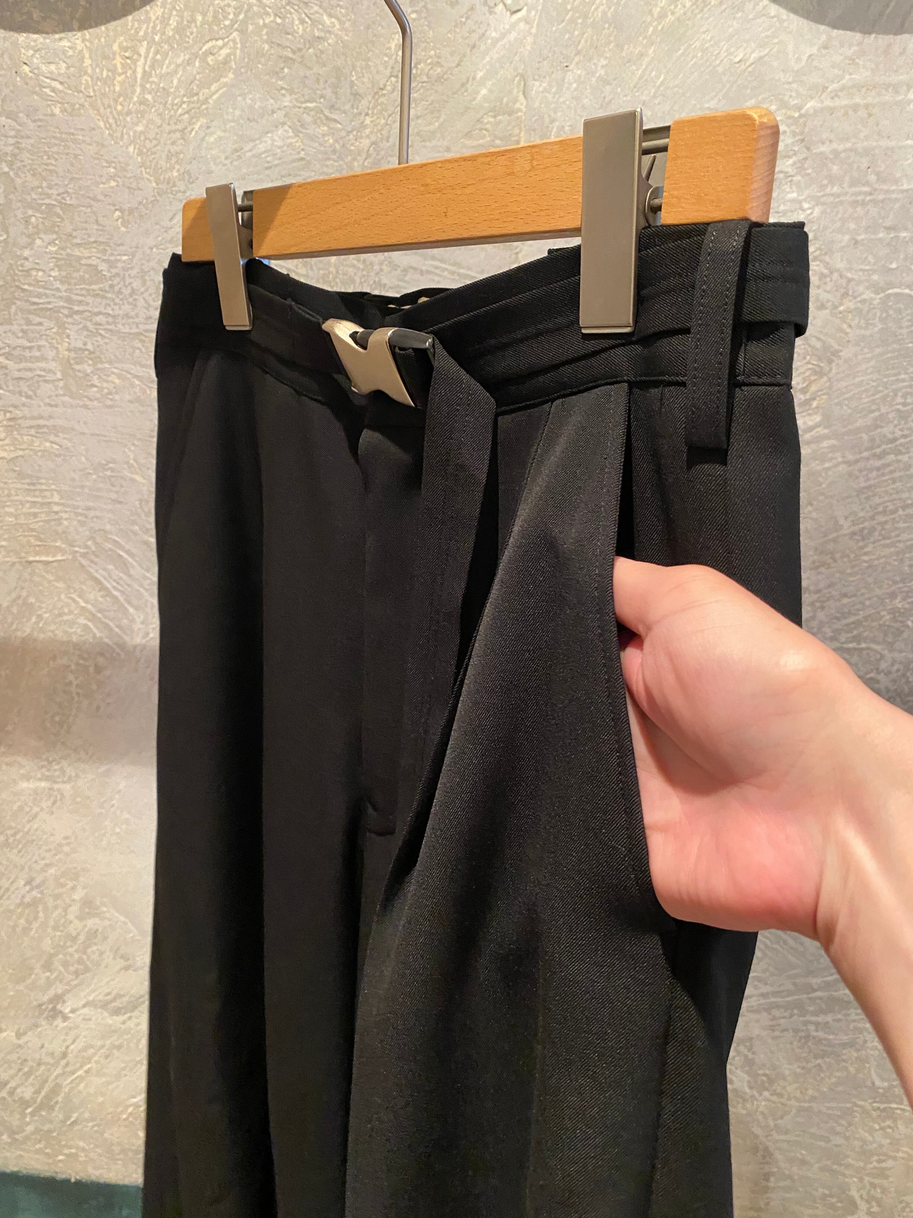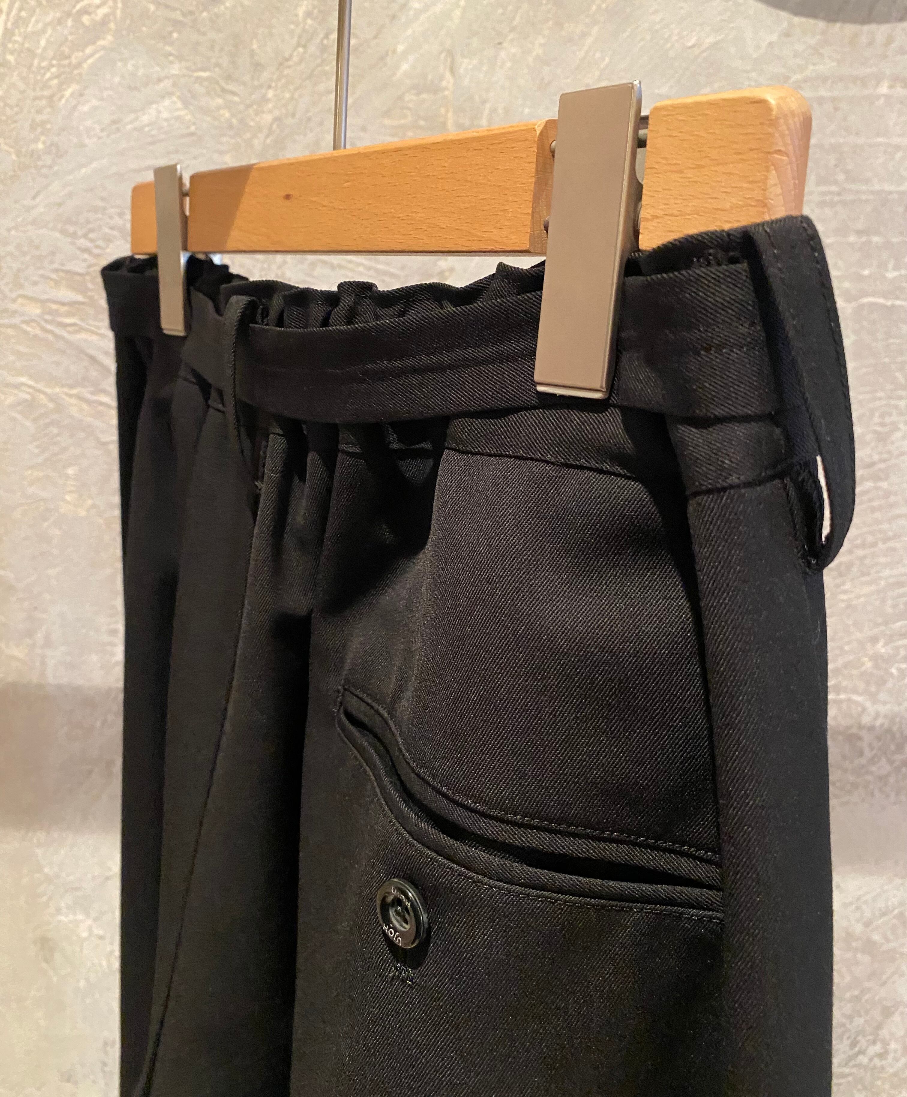 ワイドなシルエットにこだわり仕上げたパンツです。後ろのウエストはゴム仕様でストレスフリーな履き心地です。スポーティーなバックル付きのベルトがアクセントになっています。
