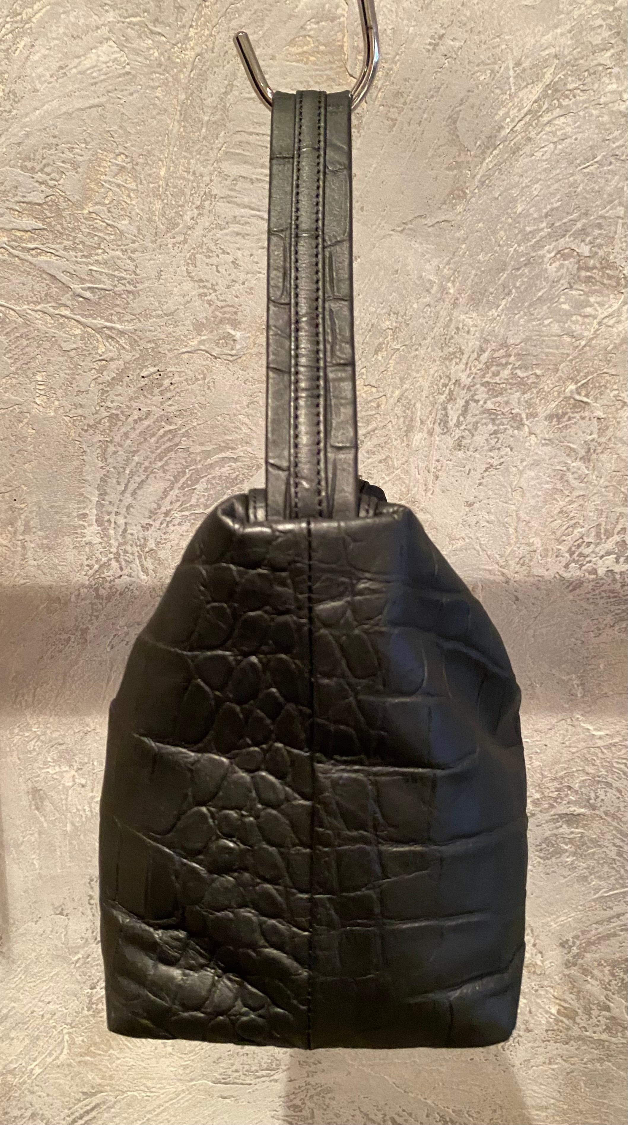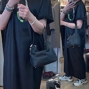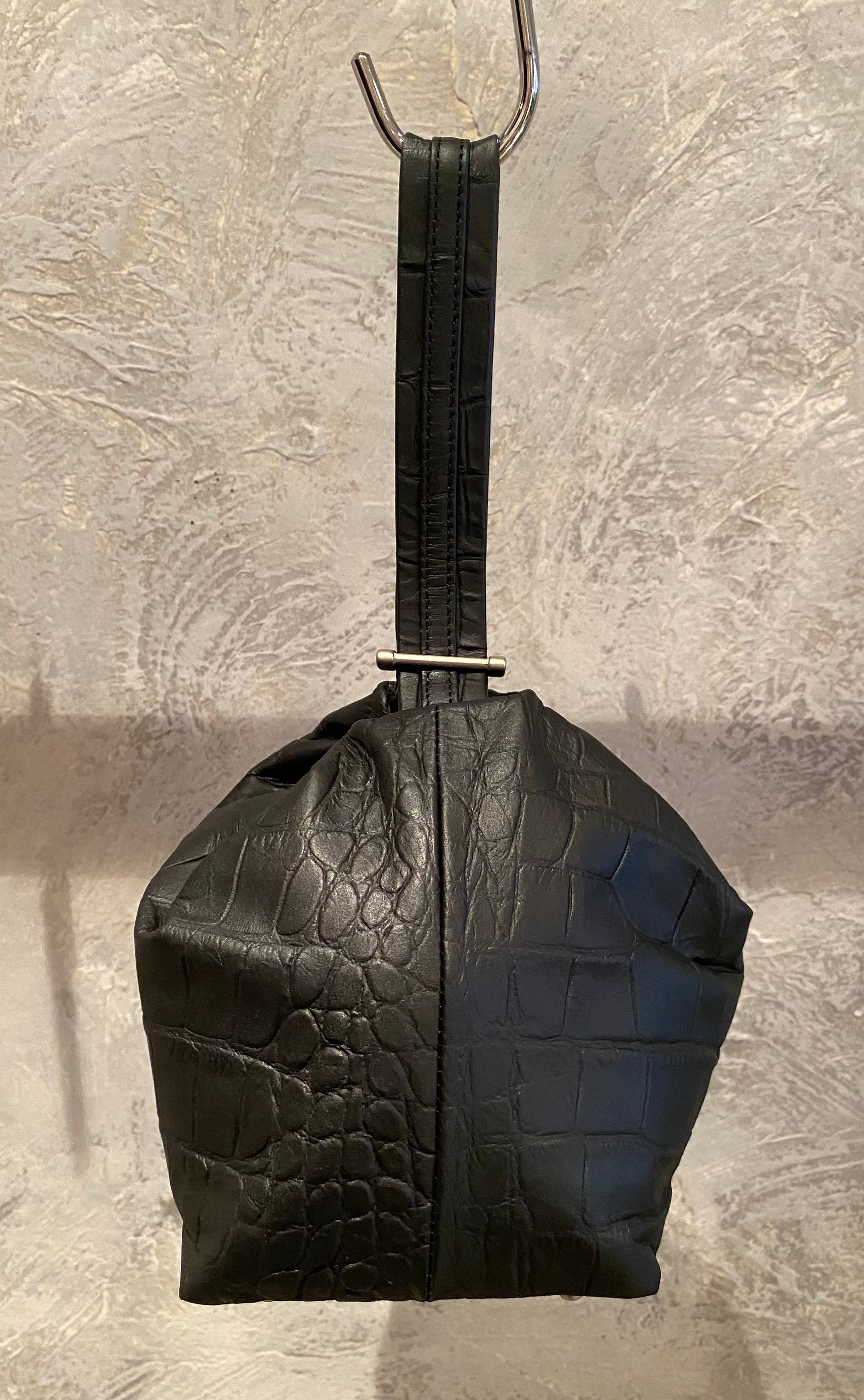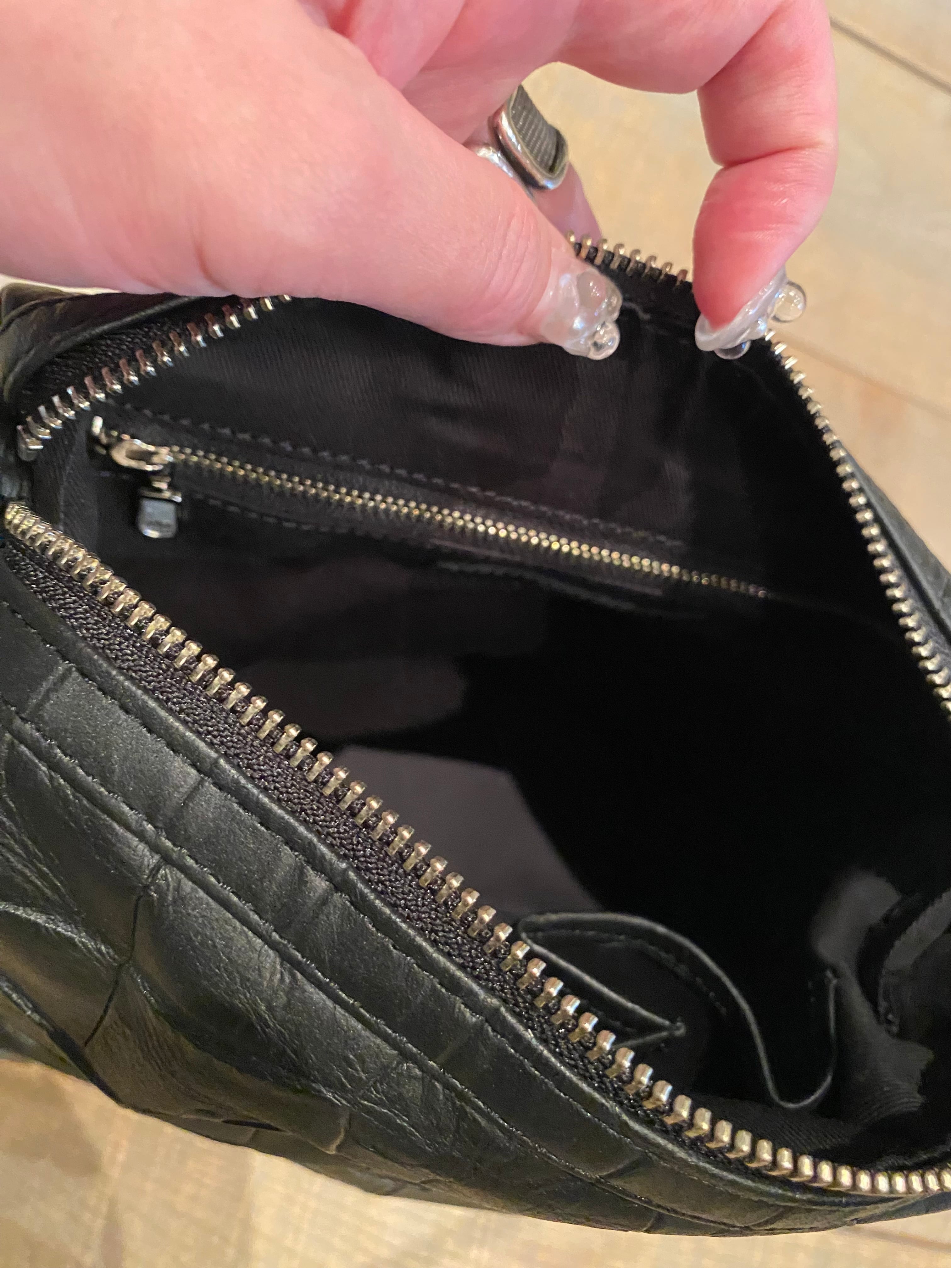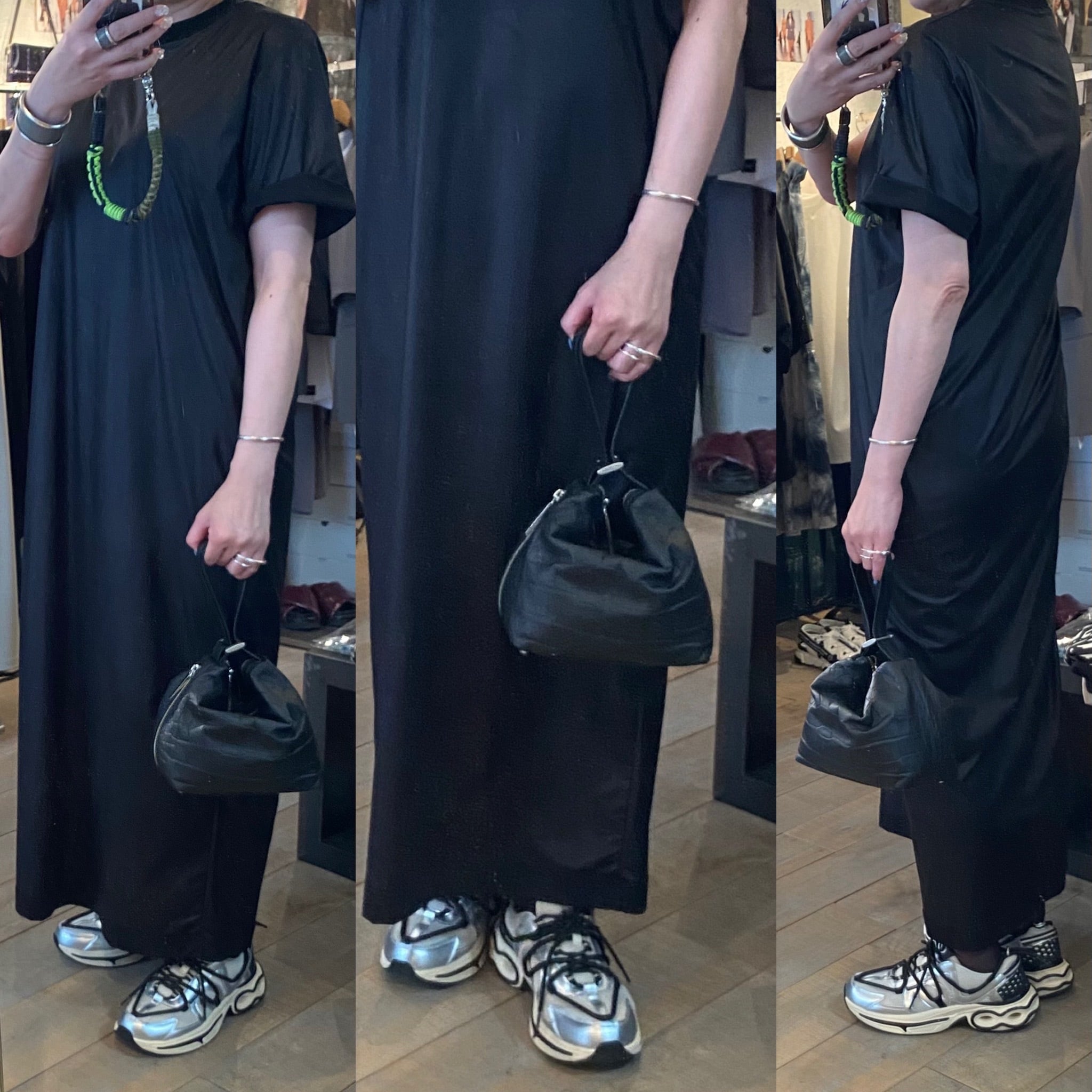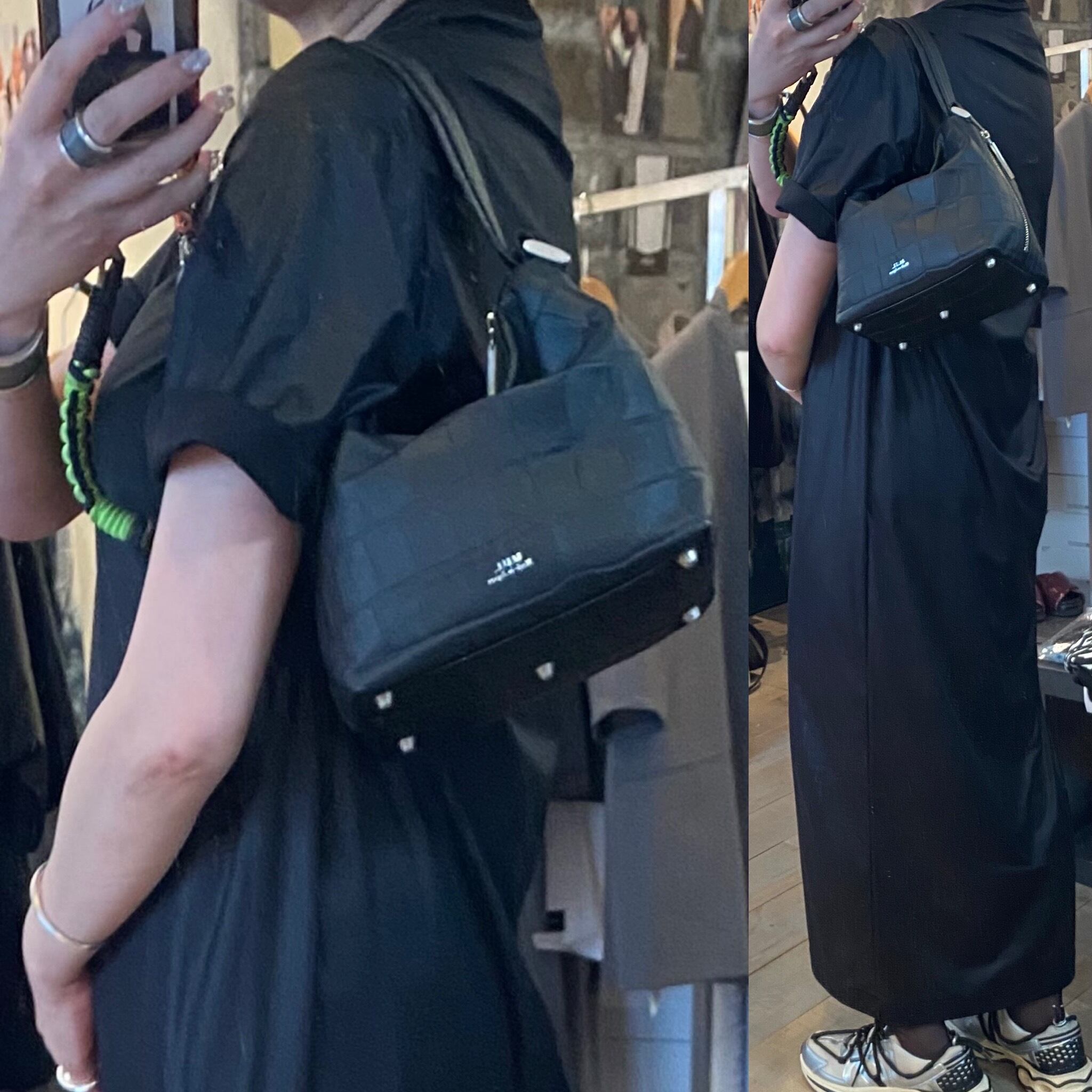 ハンドル部分を金具に通すと巾着型に。金具から外すとミニショルダー型になる2way仕様。外側にファスターありポケット1箇所、内側にファスナー有りポケット1箇所とファスナー無しポケット2箇所。マチもあるので最低限の荷物は十分収納可能。見た目のフォルムが素敵です☆