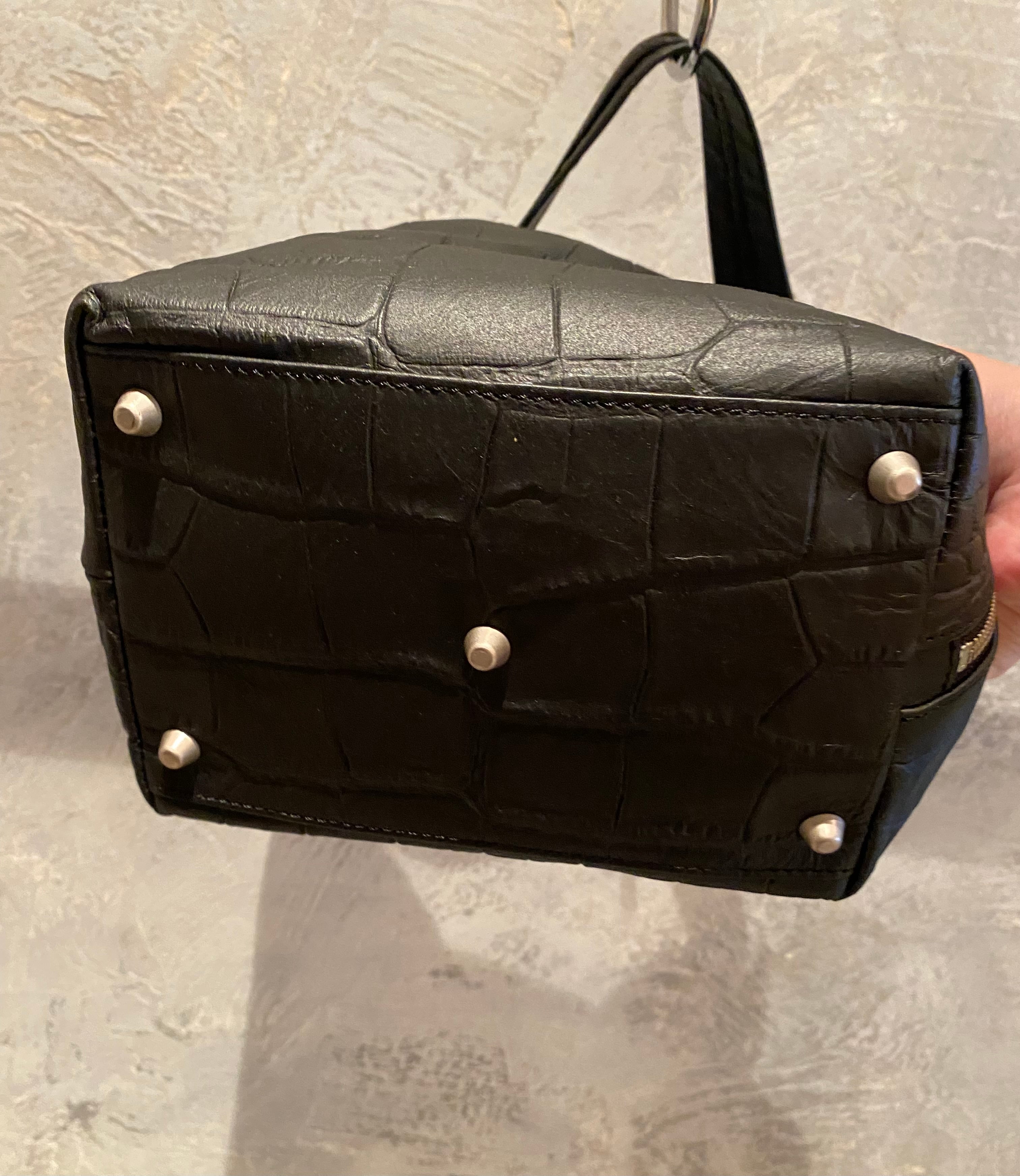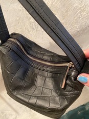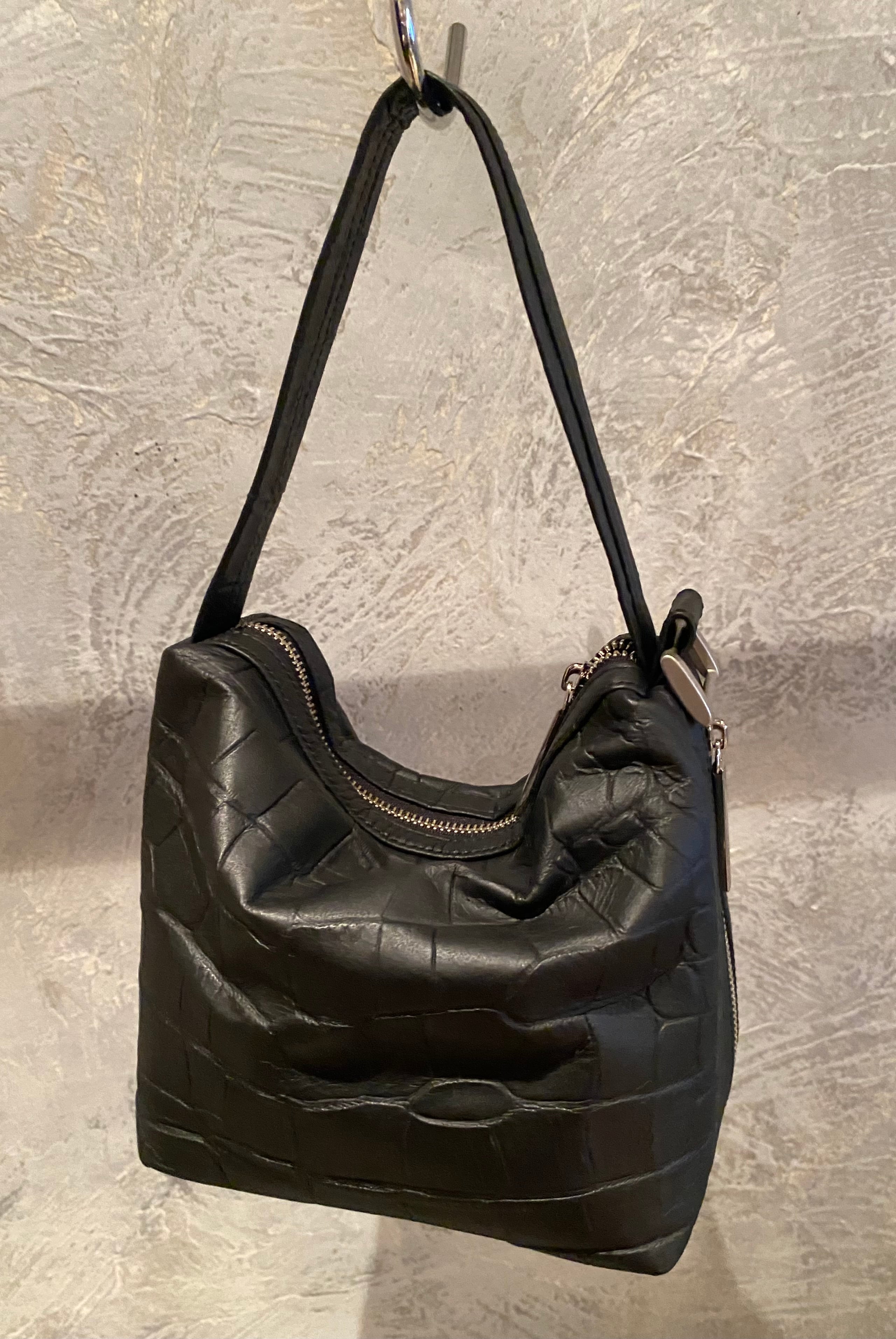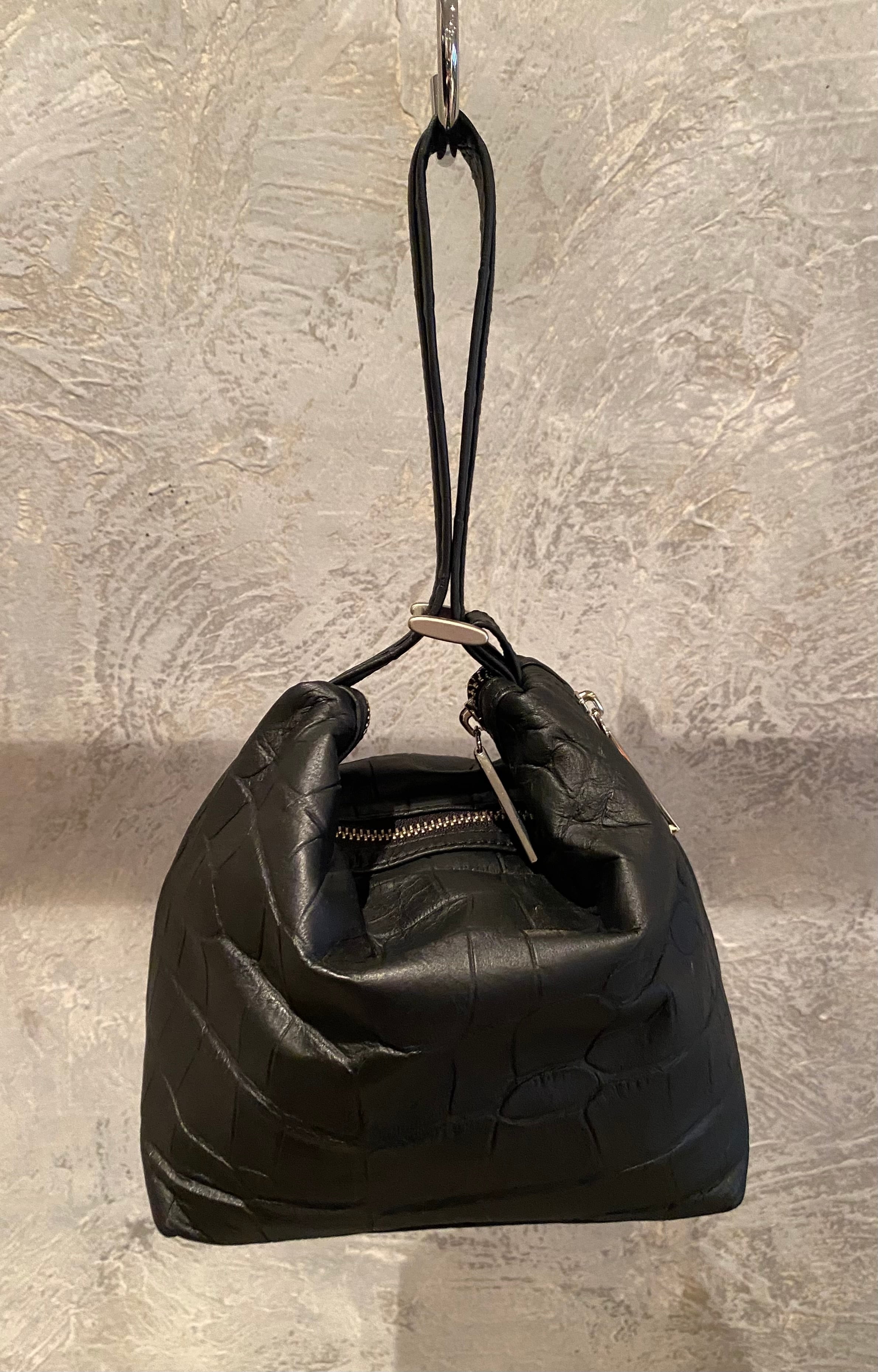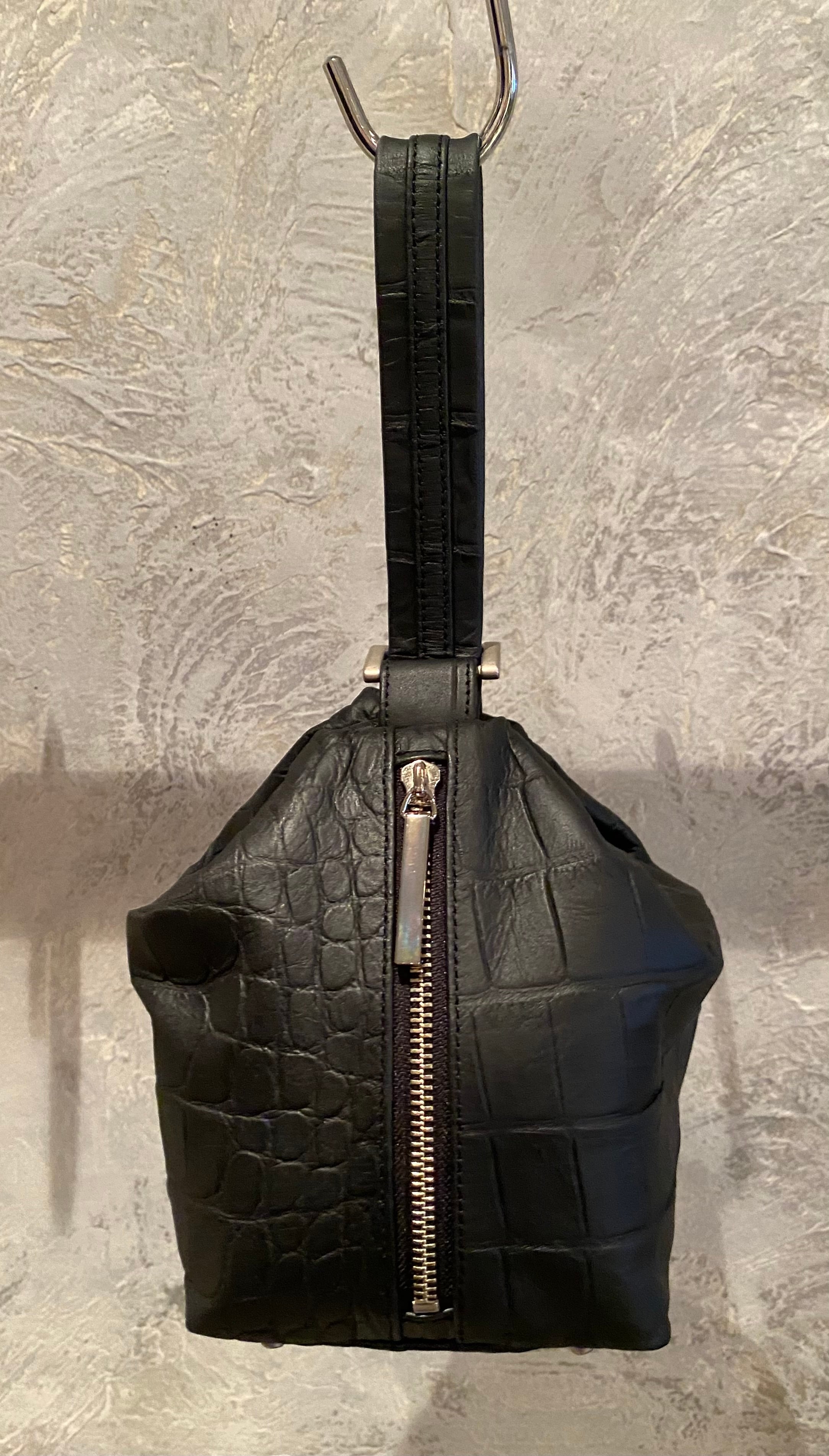 ハンドル部分を金具に通すと巾着型に。金具から外すとミニショルダー型になる2way仕様。外側にファスターありポケット1箇所、内側にファスナー有りポケット1箇所とファスナー無しポケット2箇所。マチもあるので最低限の荷物は十分収納可能。見た目のフォルムが素敵です☆