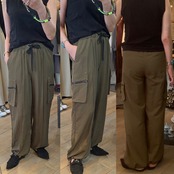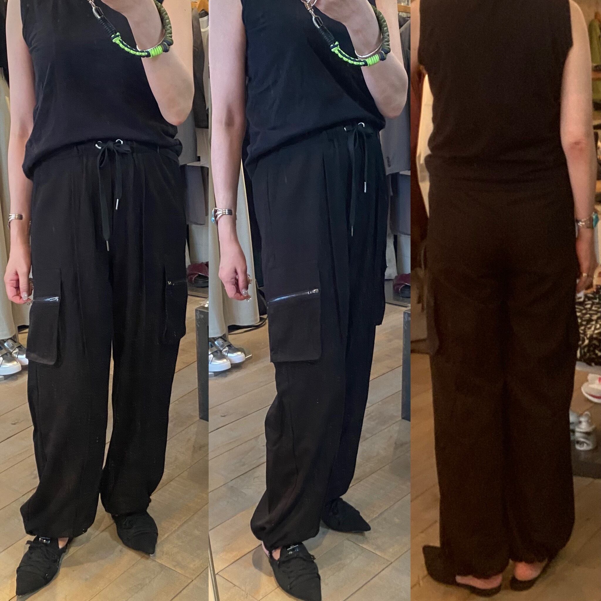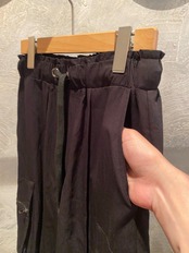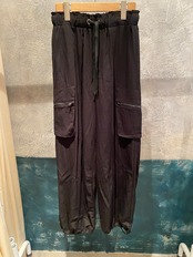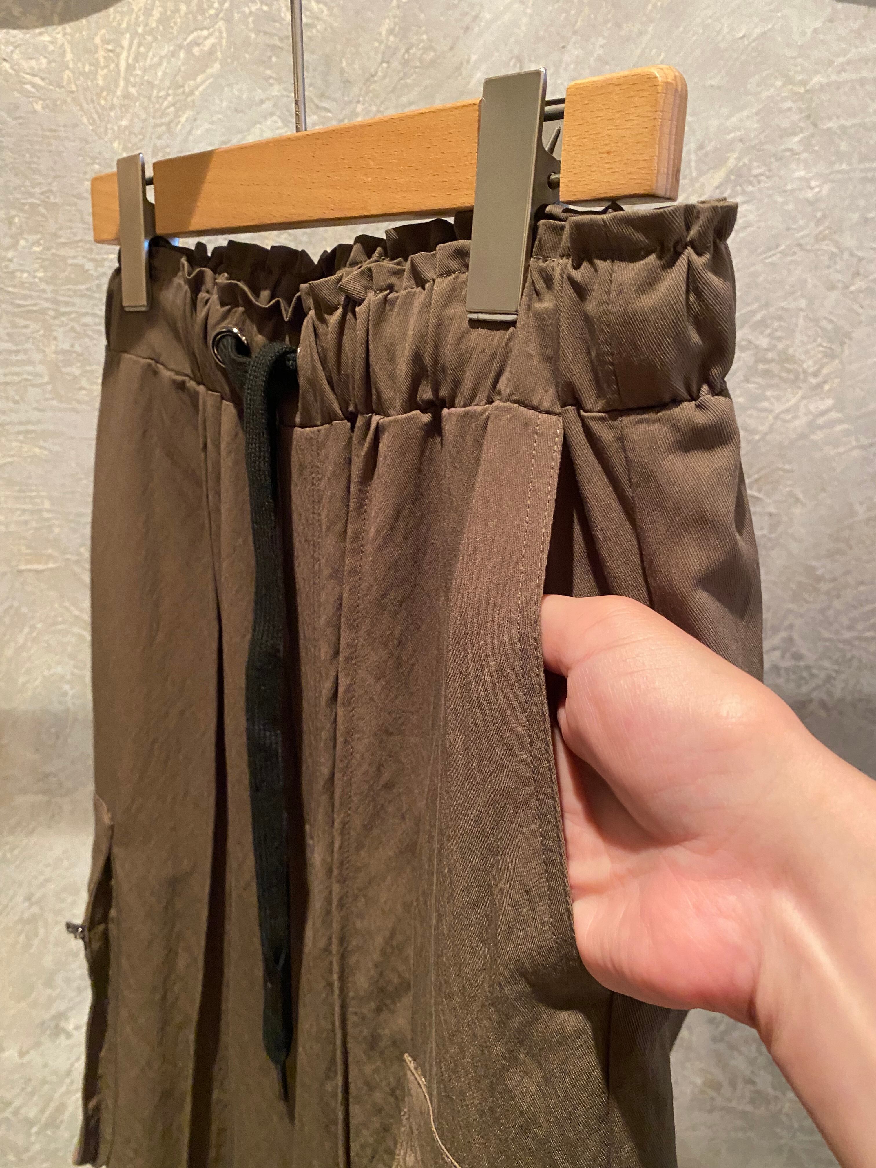 上品な光沢感でオチ感がありすっきりした印象。裾のドローコードでシルエットの変化を楽しんで頂けます。ウエストはゴムと紐でサイズ調節可能。サイドのポケットのデザインがポイントに。単品でもセットアップでもオススメ。
