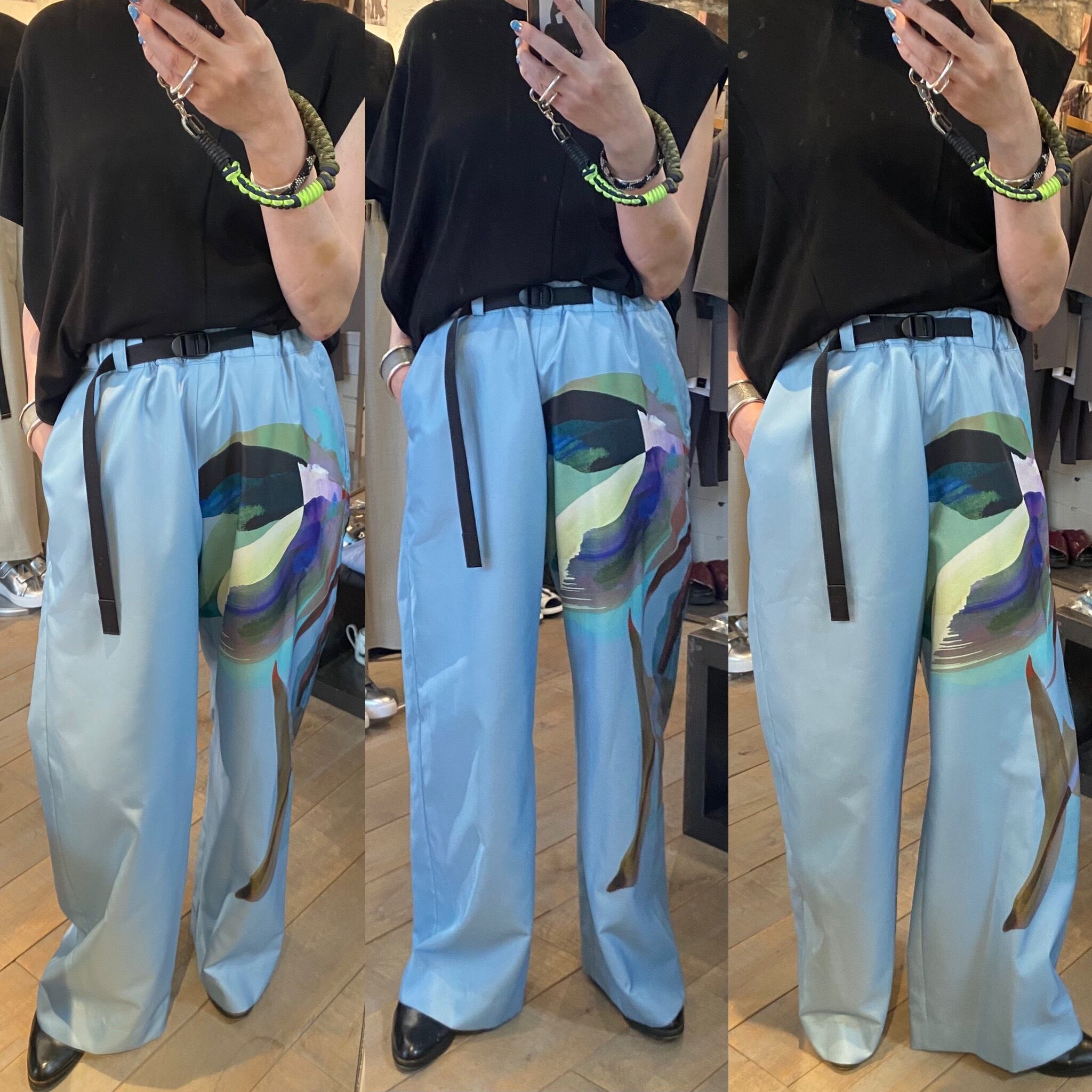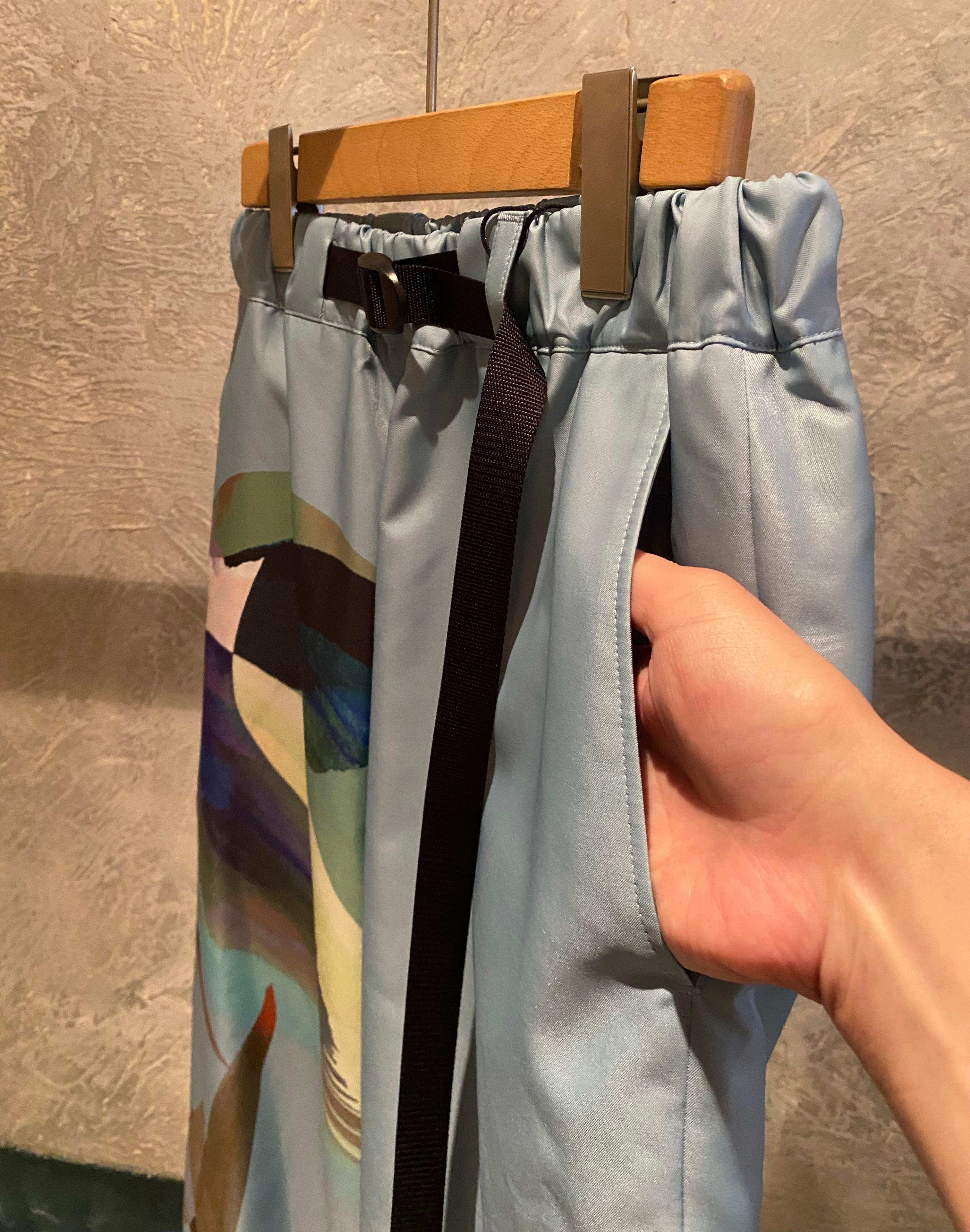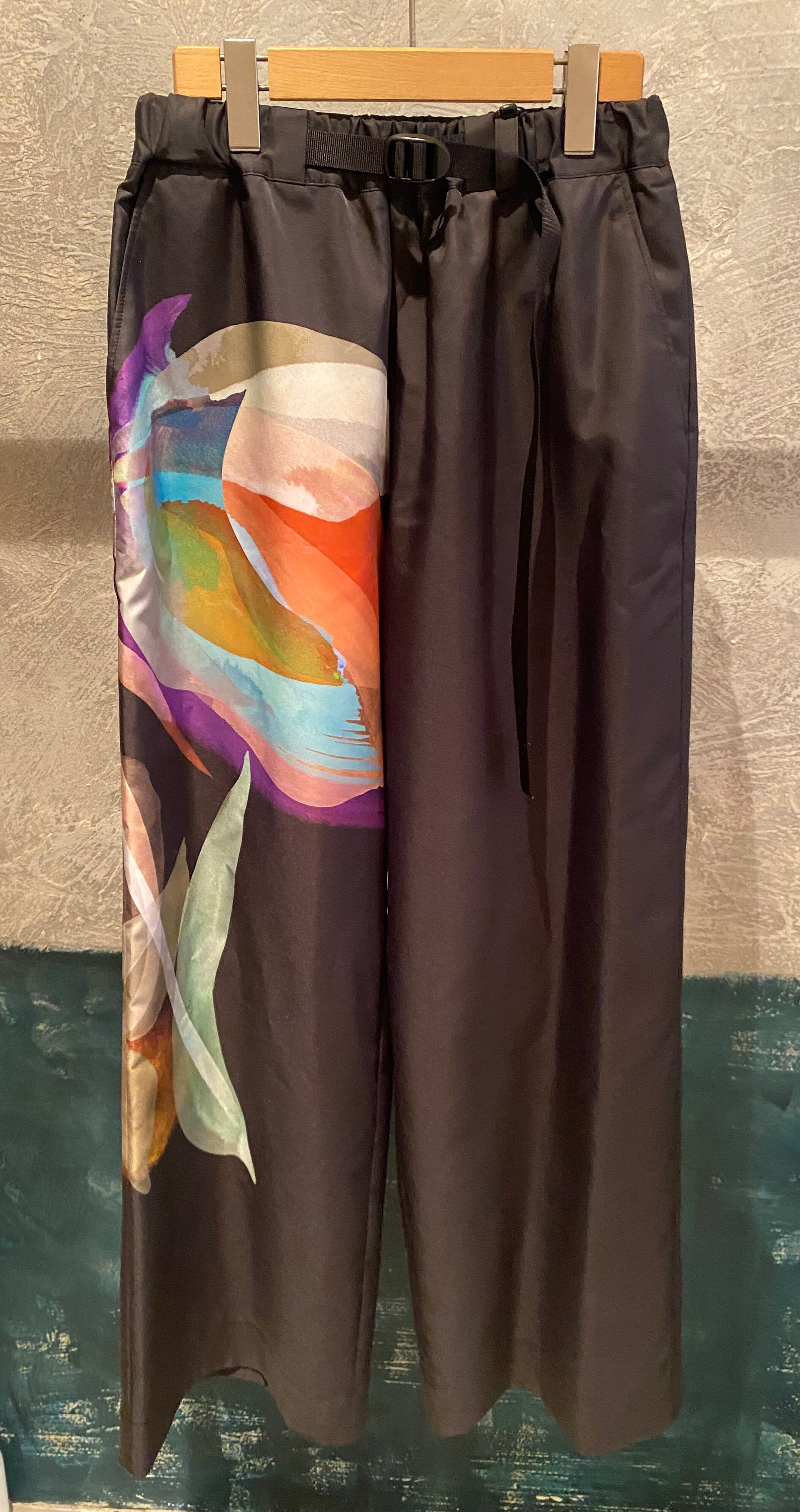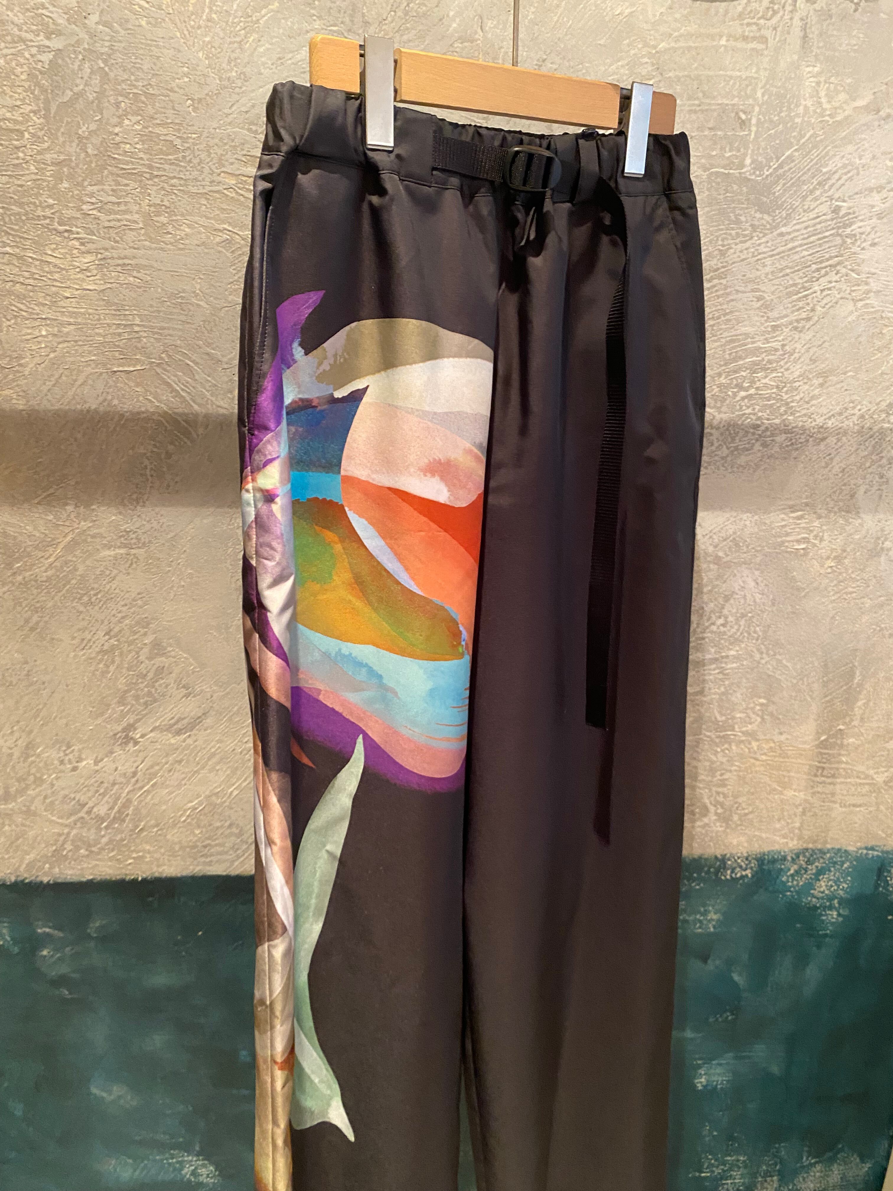 ウエストがゴム入りのウェビングベルト仕様のエフォートレススタイルのパンツです。大胆な花柄プリントにウェビングベルト仕様でアクティブな印象に仕上げました。上品な光沢感とハリ感のあるポリエステル素材で、シーズンレスで着用可能。