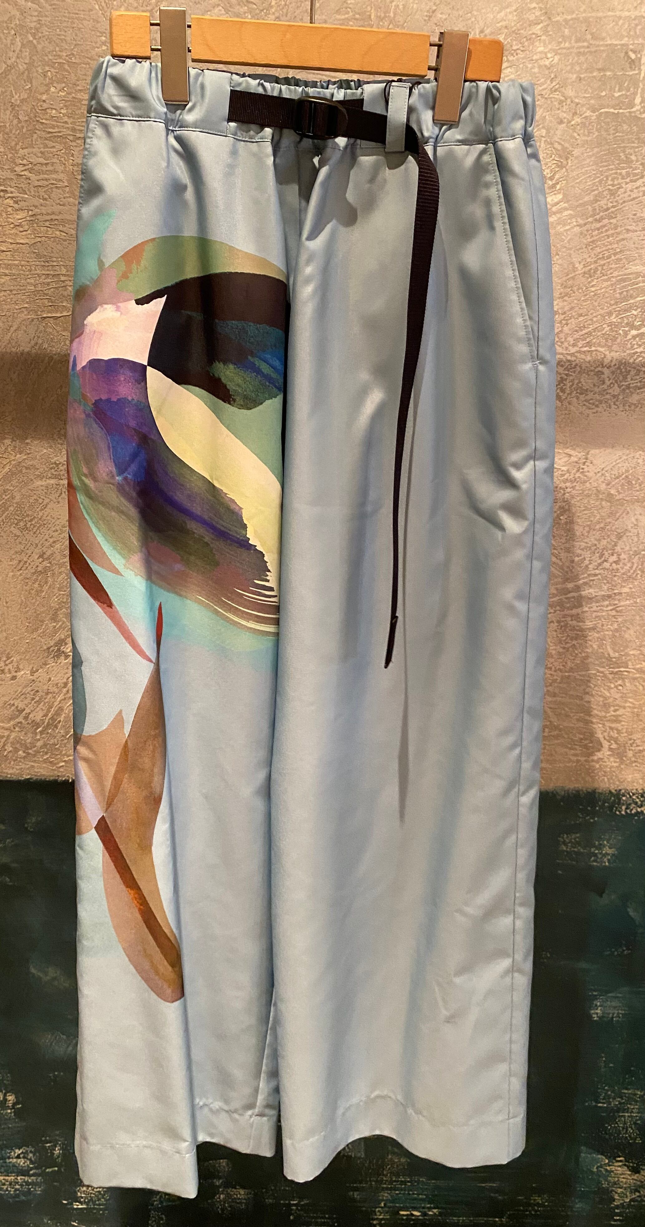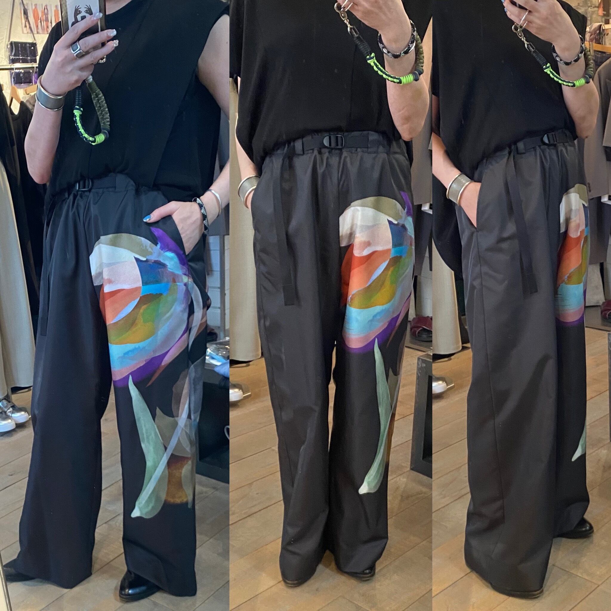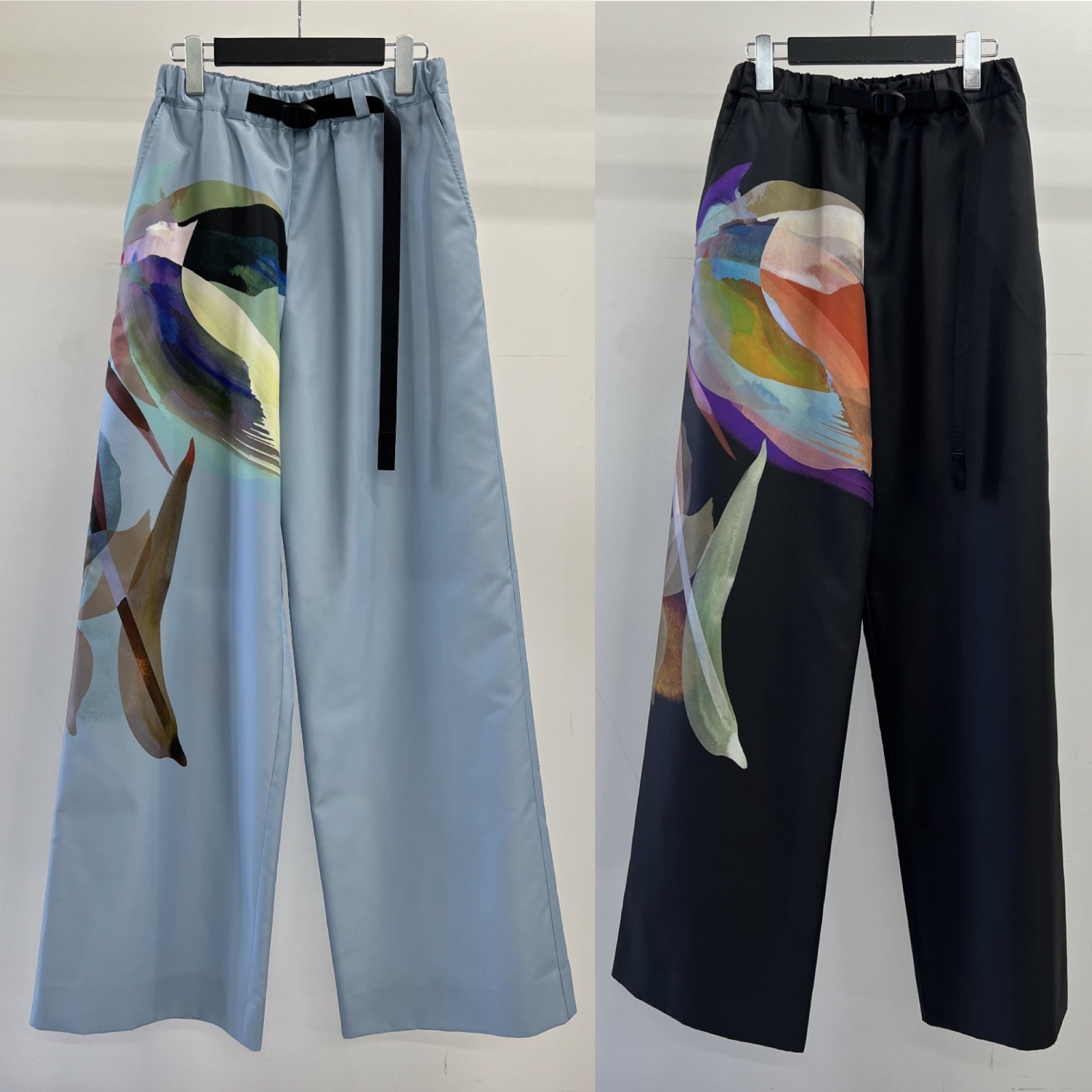 ウエストがゴム入りのウェビングベルト仕様のエフォートレススタイルのパンツです。大胆な花柄プリントにウェビングベルト仕様でアクティブな印象に仕上げました。上品な光沢感とハリ感のあるポリエステル素材で、シーズンレスで着用可能。