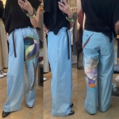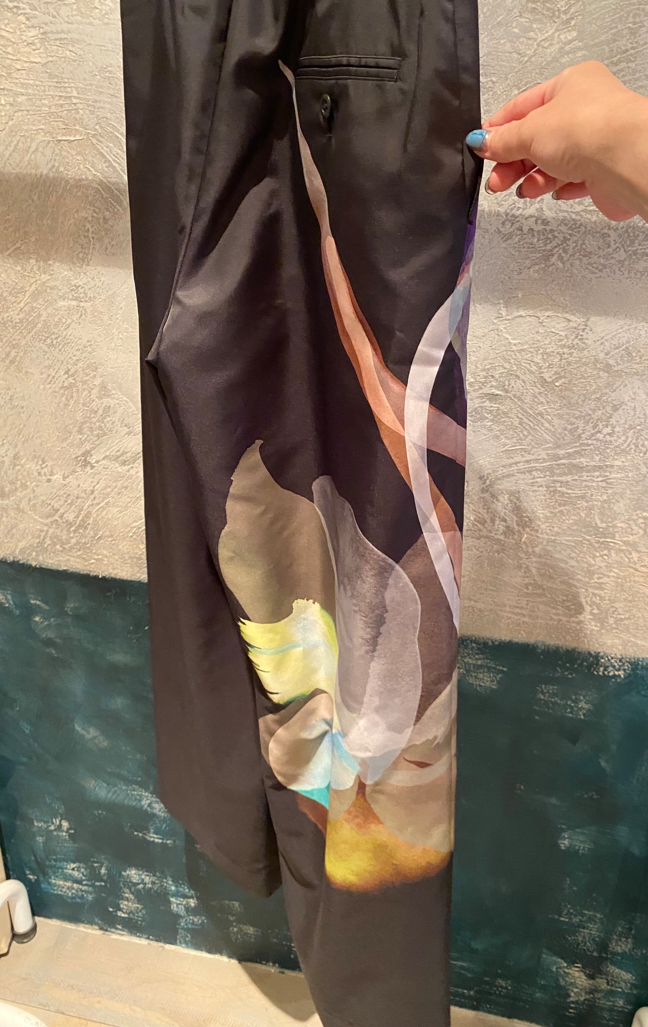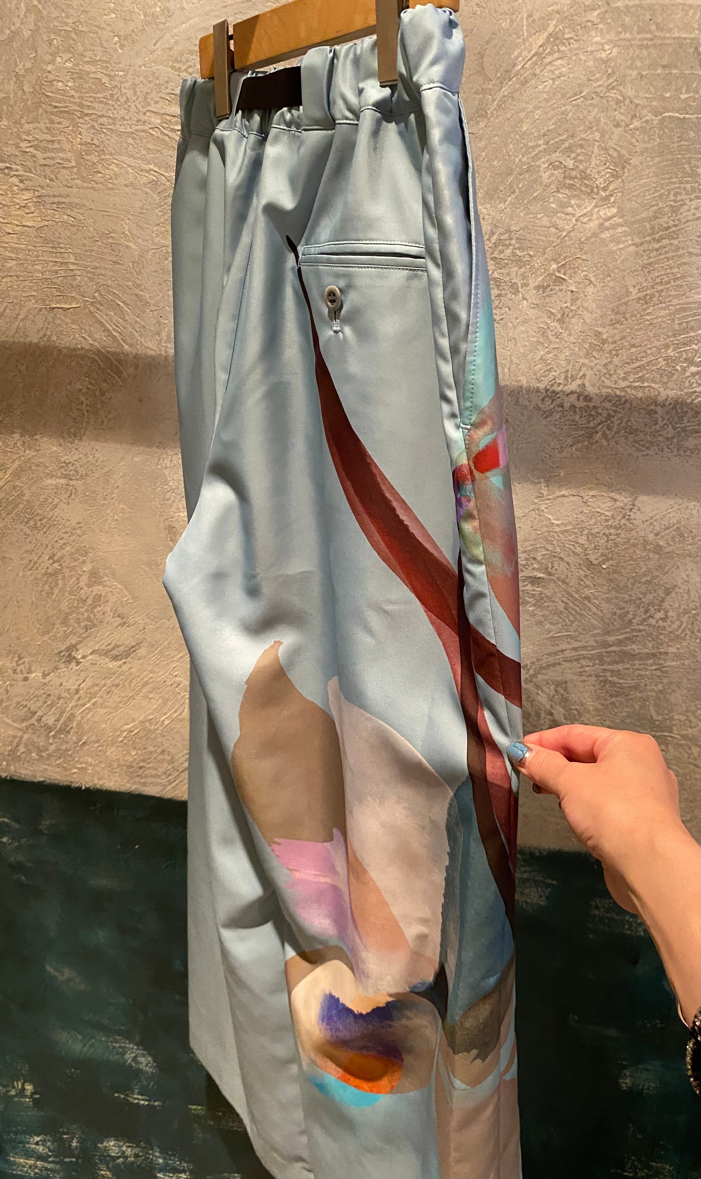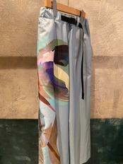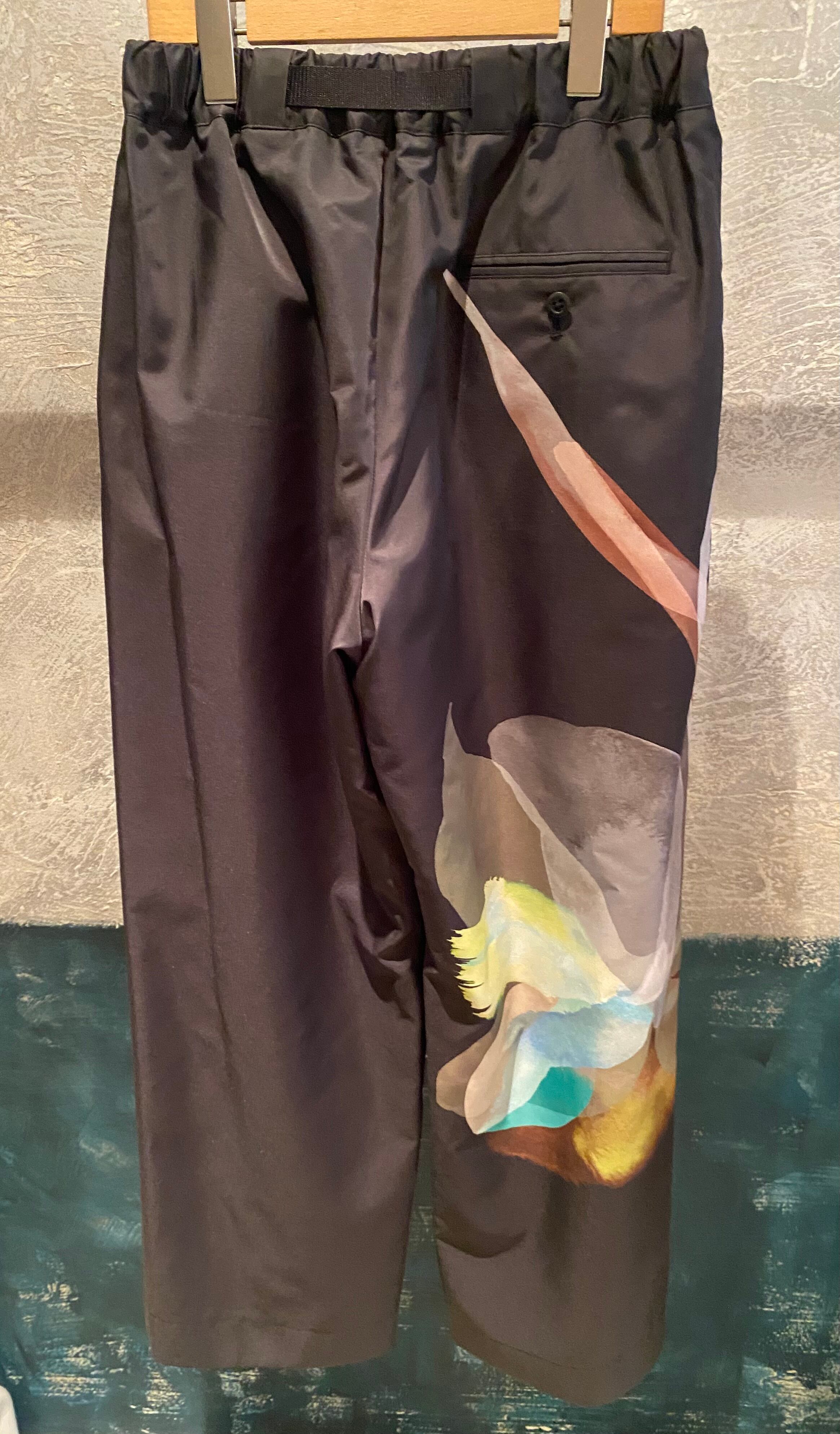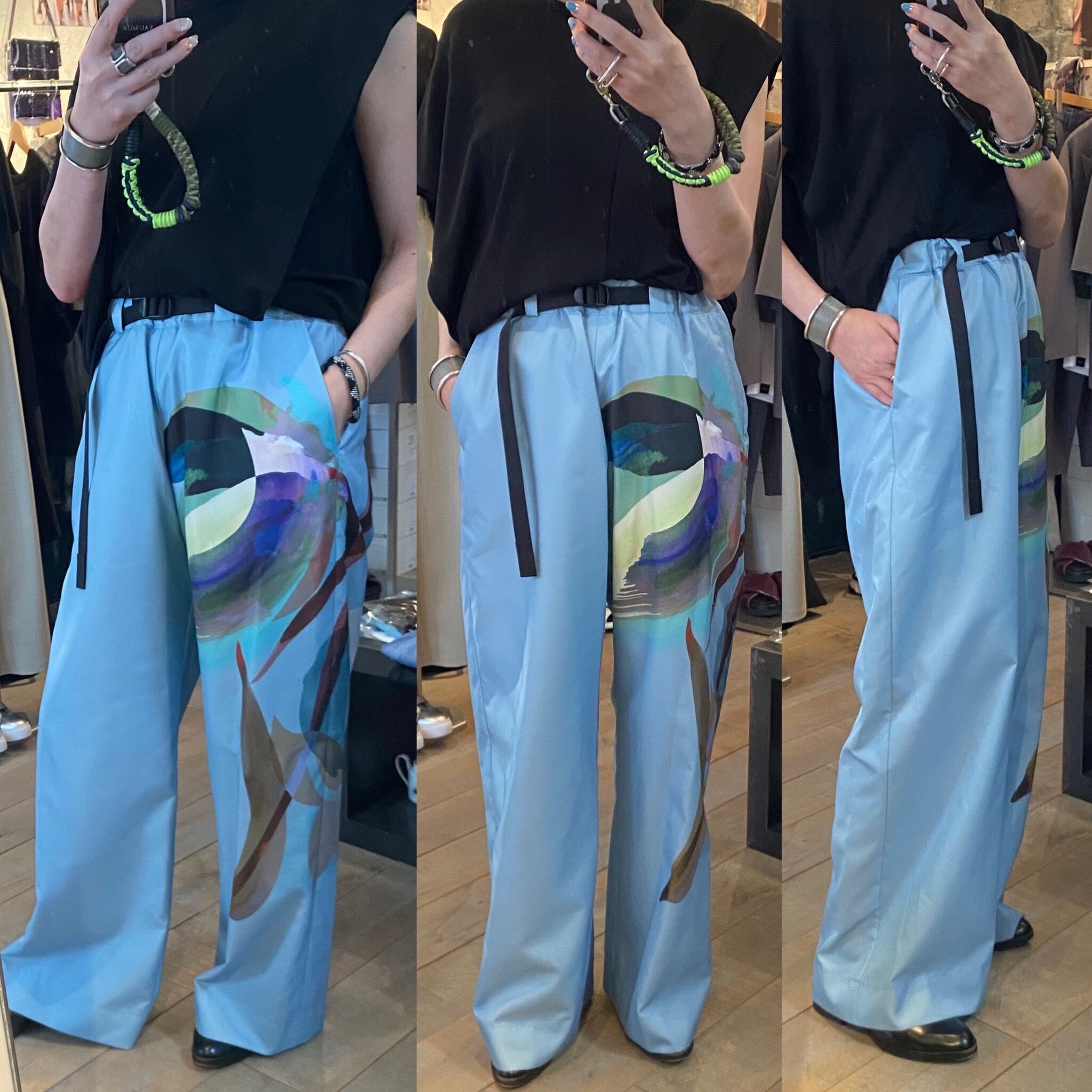 ウエストがゴム入りのウェビングベルト仕様のエフォートレススタイルのパンツです。大胆な花柄プリントにウェビングベルト仕様でアクティブな印象に仕上げました。上品な光沢感とハリ感のあるポリエステル素材で、シーズンレスで着用可能。