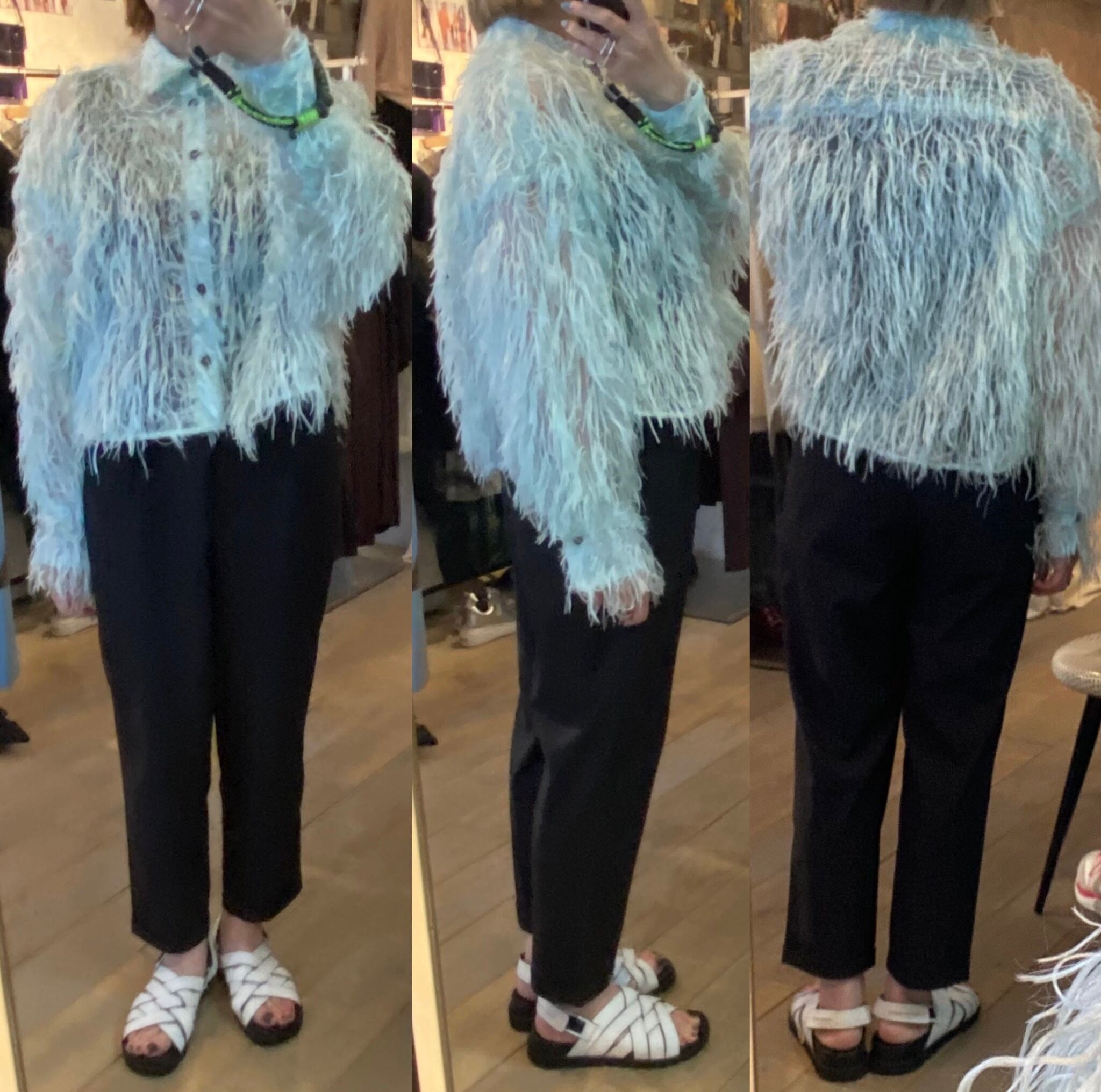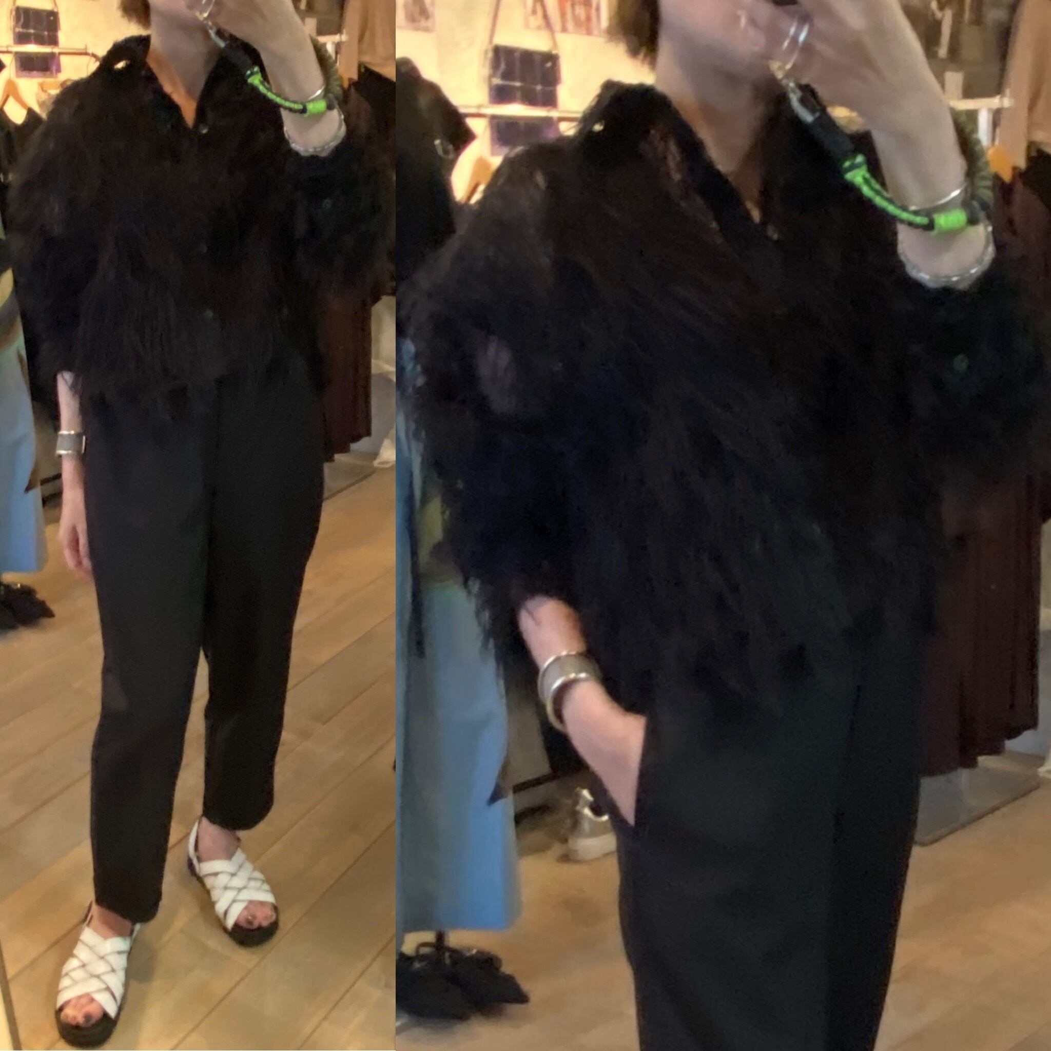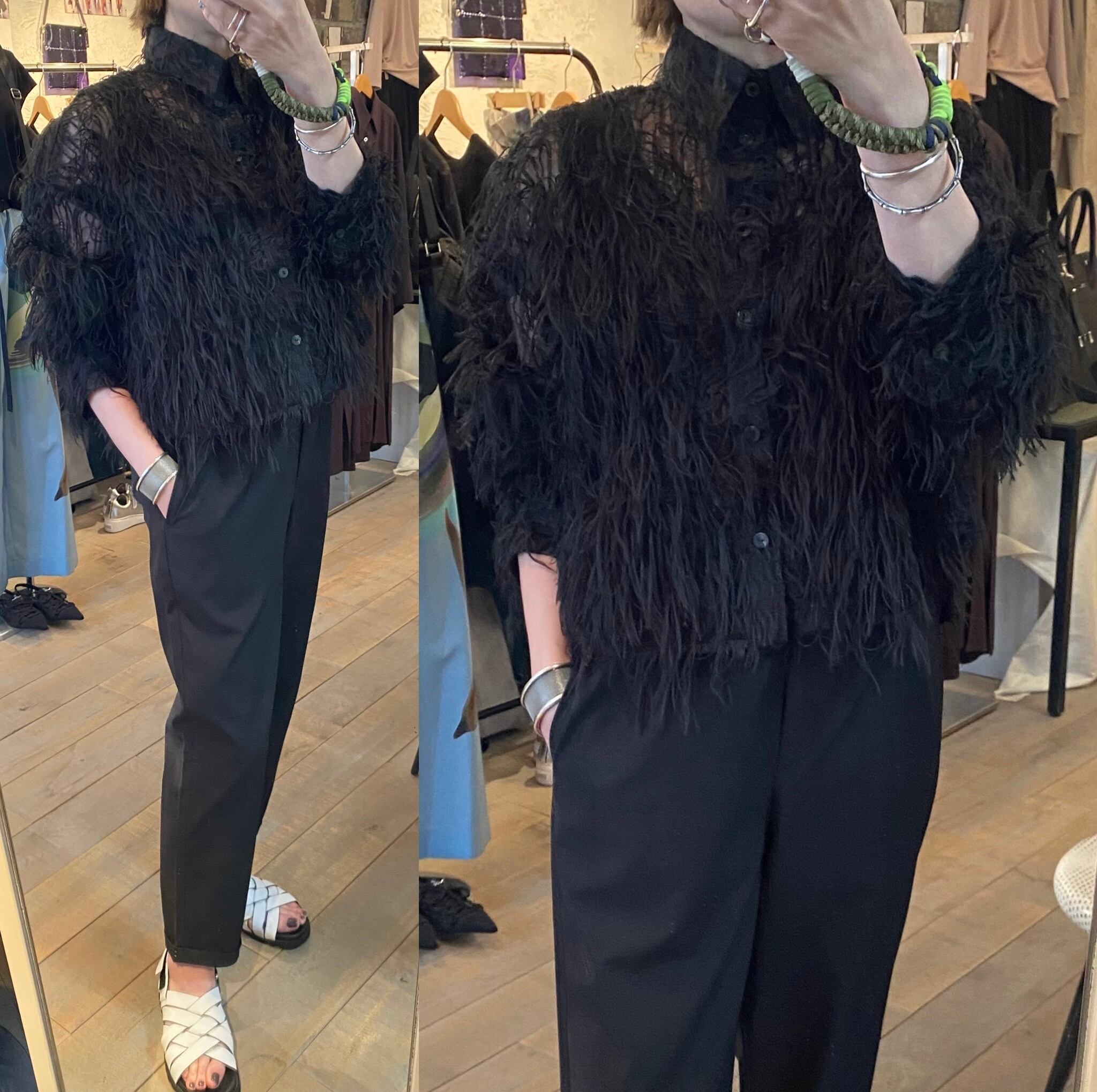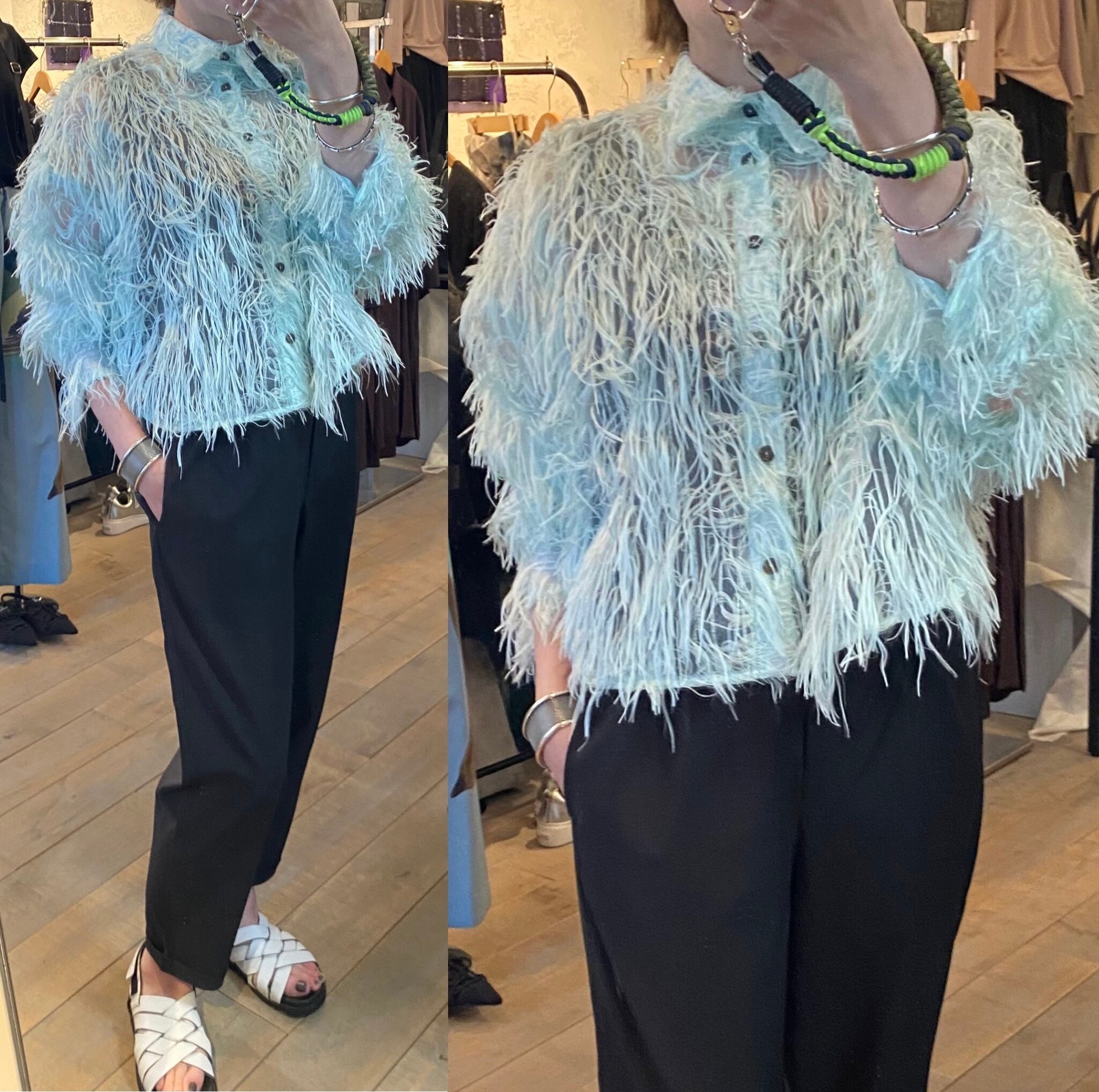 メンズライクな前開きのショートシャツ。ヒップ上の前後差のあるショートなシャツテール着丈、ゆとりのある身巾、ドロップショルダーの長袖です。ラグジュアリーな1枚で羽織り物としても重宝します。前中心釦開きです。素材は、トルコのBZ社で生産されたフェザーシアージャガードです。リッチなボリューム感を特徴とし、高いファッション性に優れています。軽量感と透け感が共存しており、毛足素材でありながら、通年使用できる軽やかさを持ち合わせております。毛足の柔らかさとジャガード織りのコントラストが、視覚的な奥行きを生み出し、深みを与えています。一着でサマになるアイテムながらインナーとしてさりげなくレイヤードするのも◎