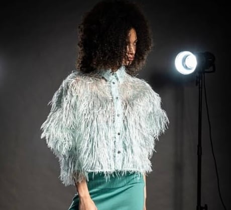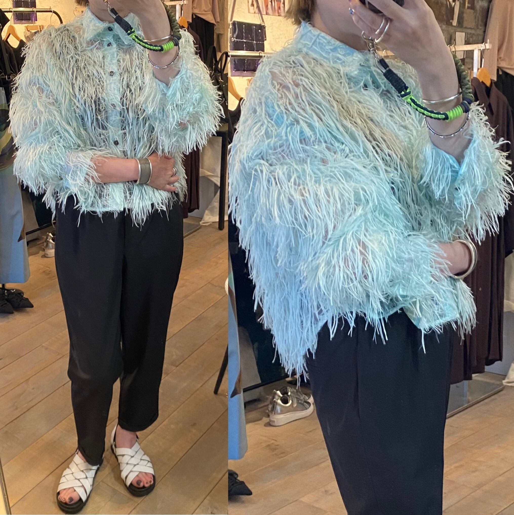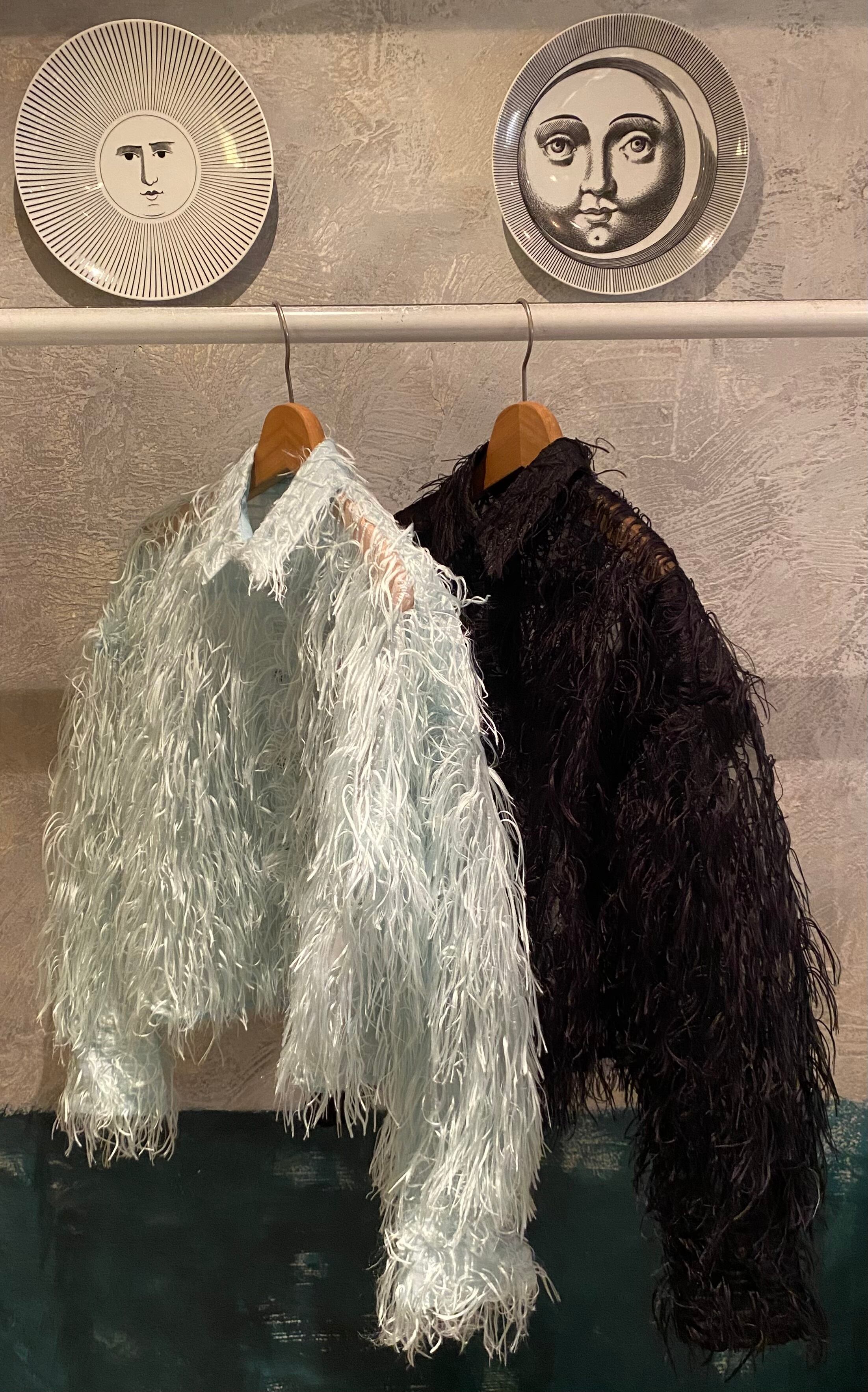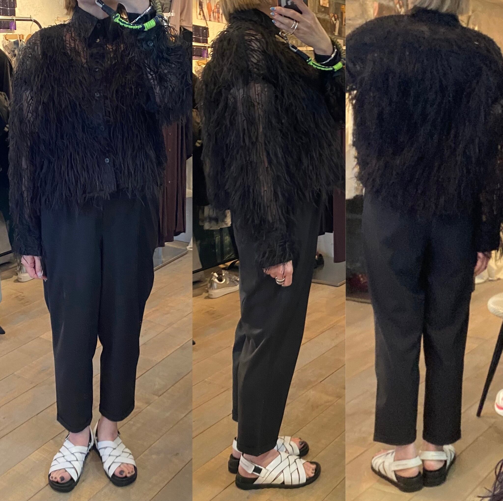 メンズライクな前開きのショートシャツ。ヒップ上の前後差のあるショートなシャツテール着丈、ゆとりのある身巾、ドロップショルダーの長袖です。ラグジュアリーな1枚で羽織り物としても重宝します。前中心釦開きです。素材は、トルコのBZ社で生産されたフェザーシアージャガードです。リッチなボリューム感を特徴とし、高いファッション性に優れています。軽量感と透け感が共存しており、毛足素材でありながら、通年使用できる軽やかさを持ち合わせております。毛足の柔らかさとジャガード織りのコントラストが、視覚的な奥行きを生み出し、深みを与えています。一着でサマになるアイテムながらインナーとしてさりげなくレイヤードするのも◎