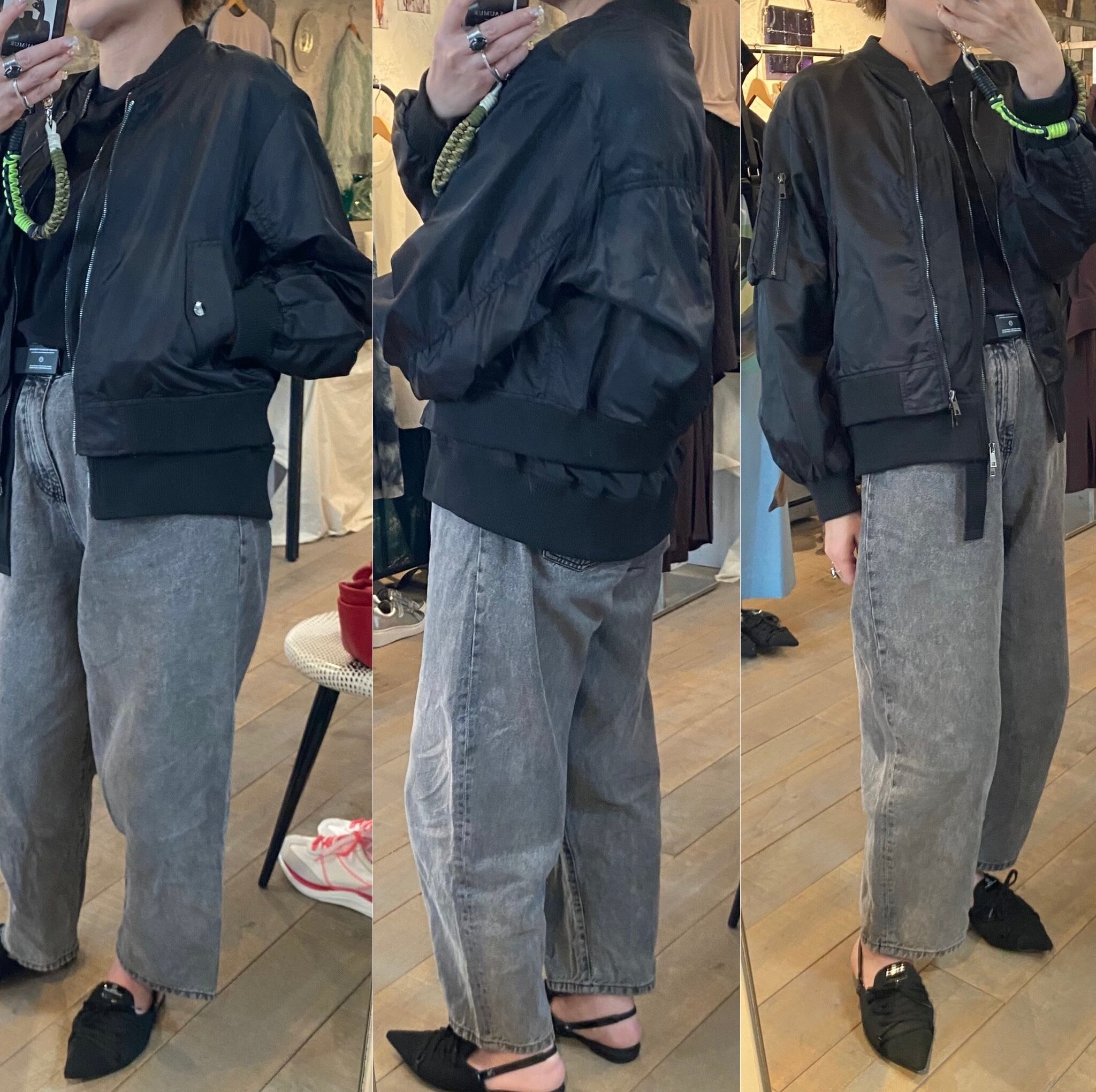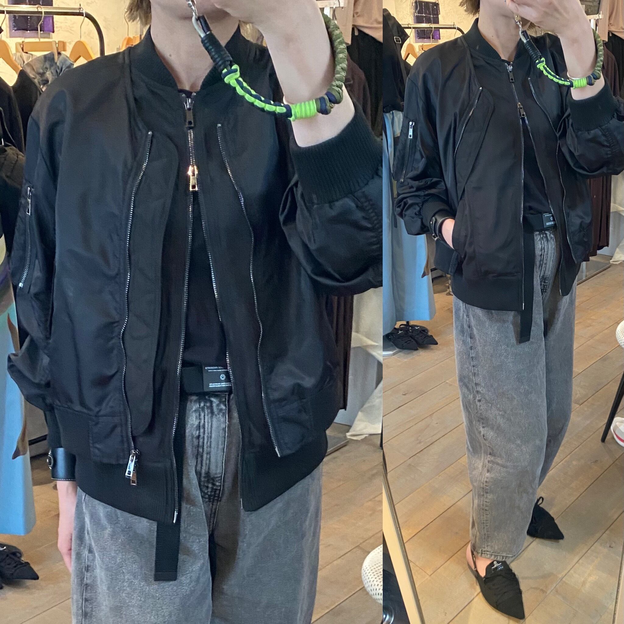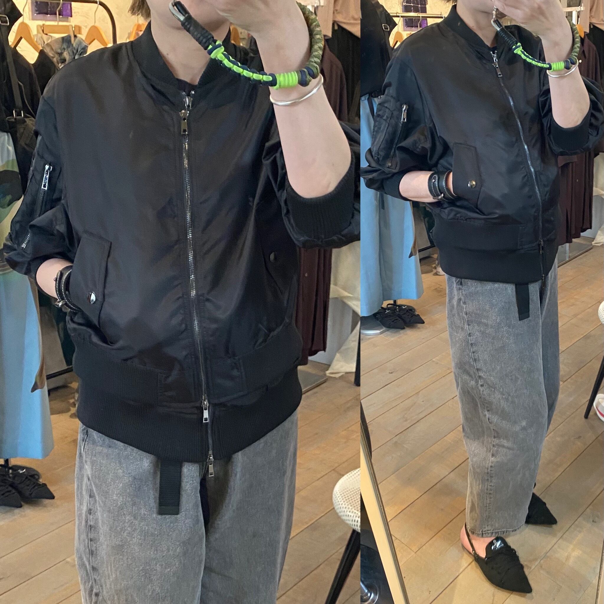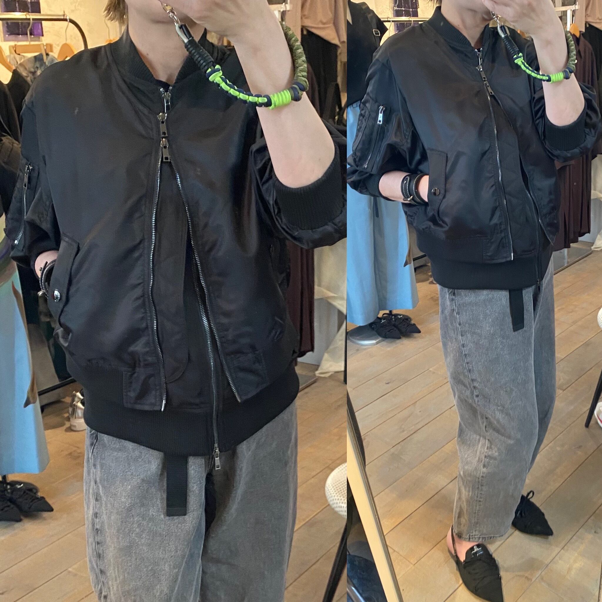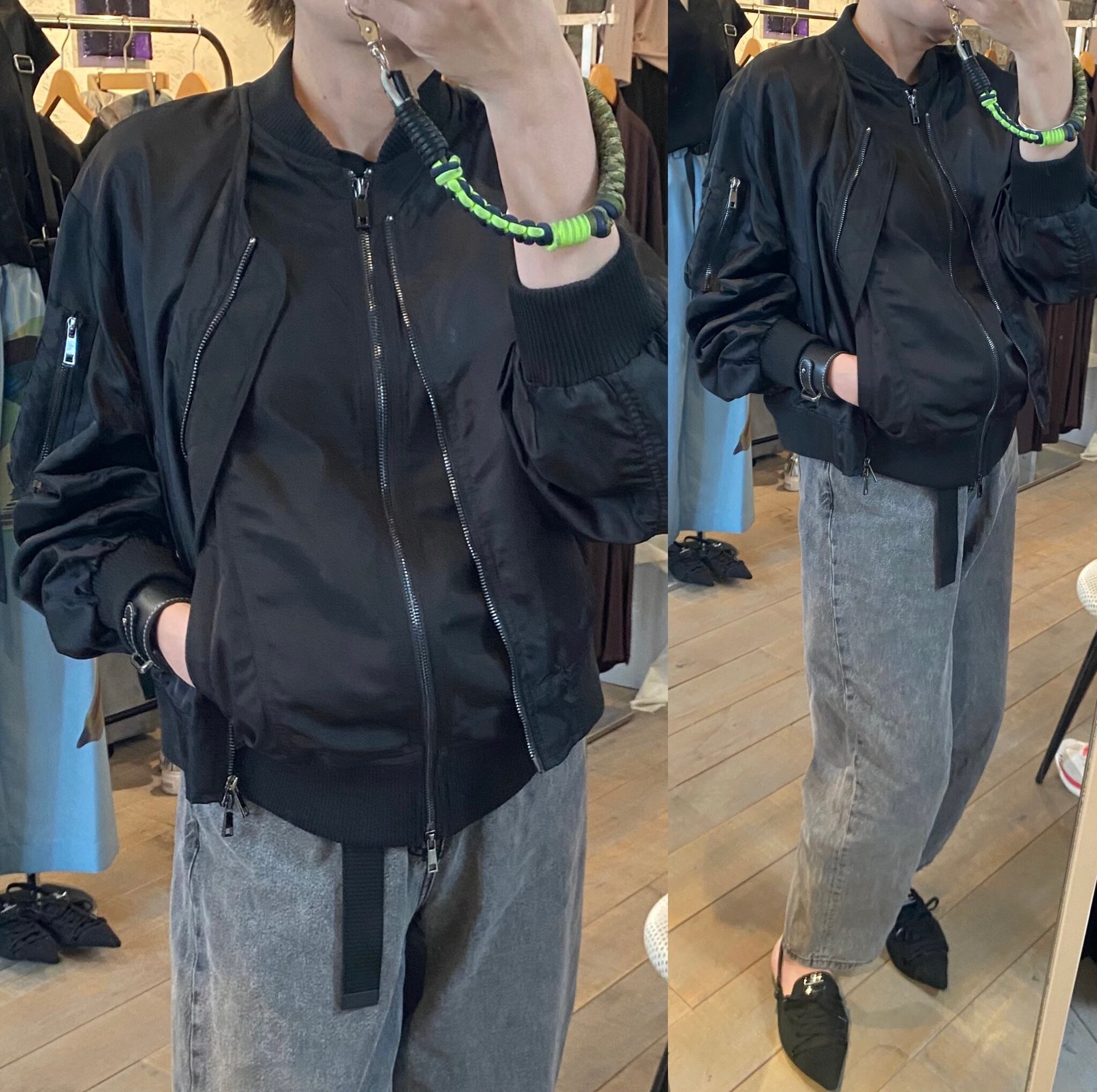 オールブラックの2way肩がけMA-1ブルゾン。ブルゾンがレイヤードされたようなデザイン。フロントジップ部分は2箇所ともにダブルジップ仕様なのが嬉しいところ。脇の部分から腕を出して肩がけしたスタイリングを楽しめます。夏以外のロングシーズン着回せるので、一着あると便利です。季節の変わり目はメインのアウターとして、冬はコート下の着用でも活躍します♪