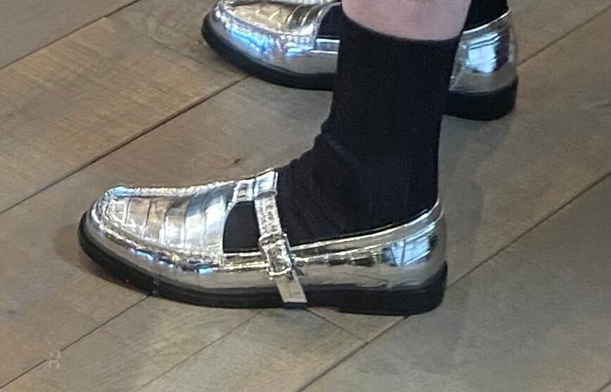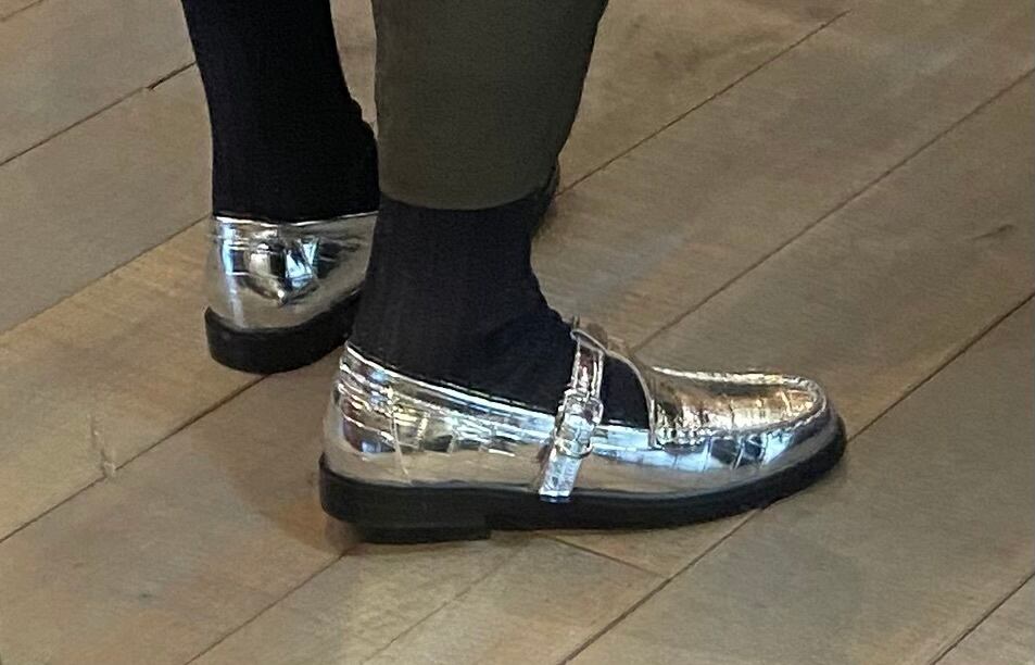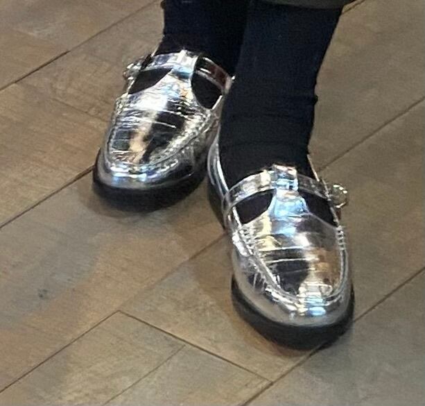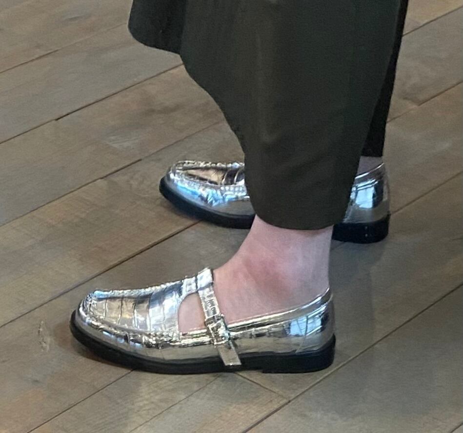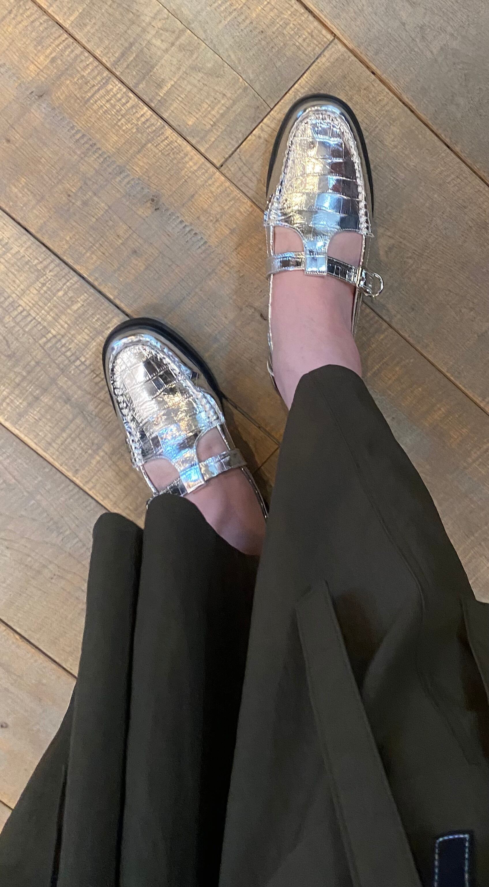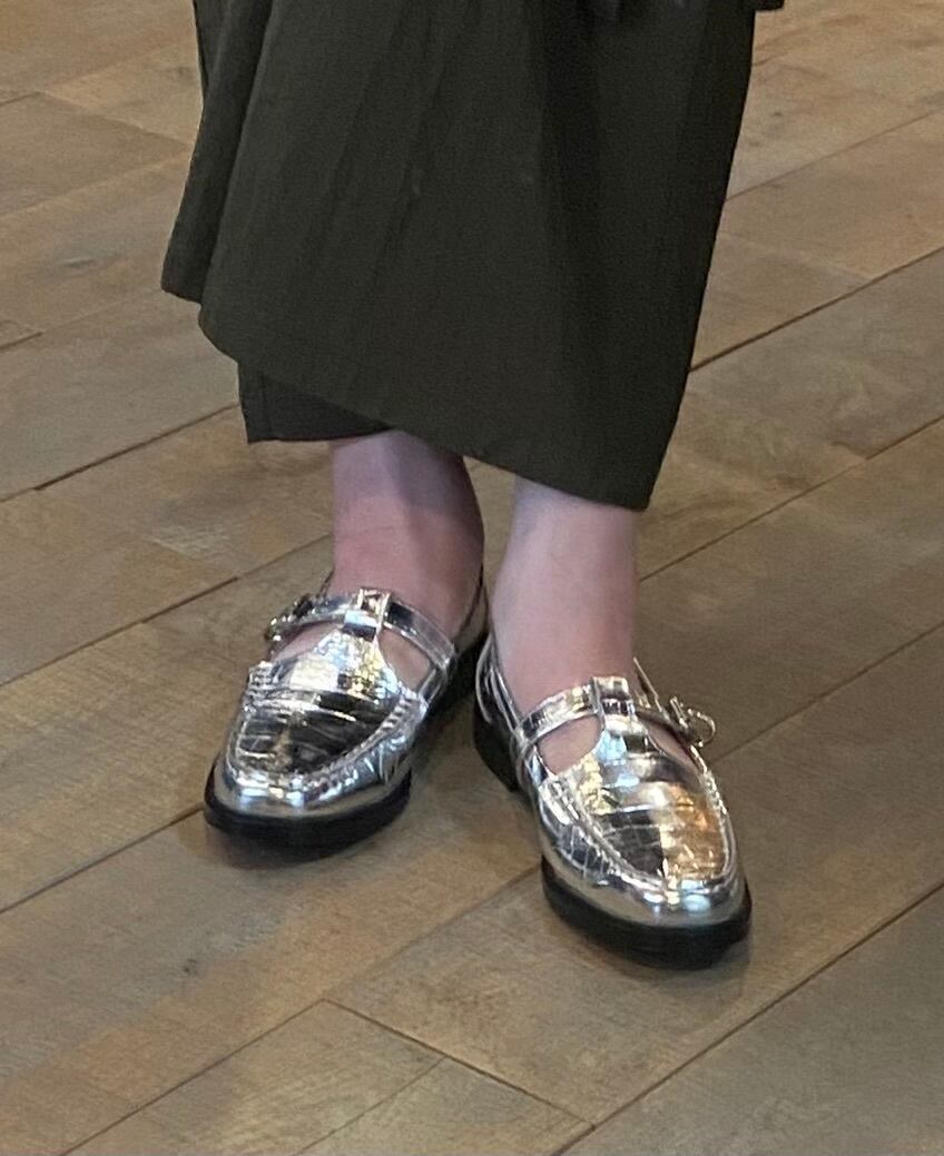 クロコダイル型押しのフラッとシューズ。カラーもシルバーでスタイリングのポイントになるシューズ。牛革で履き心地も良く、シーズンレスで着用可能。素足でも、あらゆるソックスなどとのレイヤードも楽しめます♪履き心地も抜群です。スポッと履けるのと安定感のあるのも◎