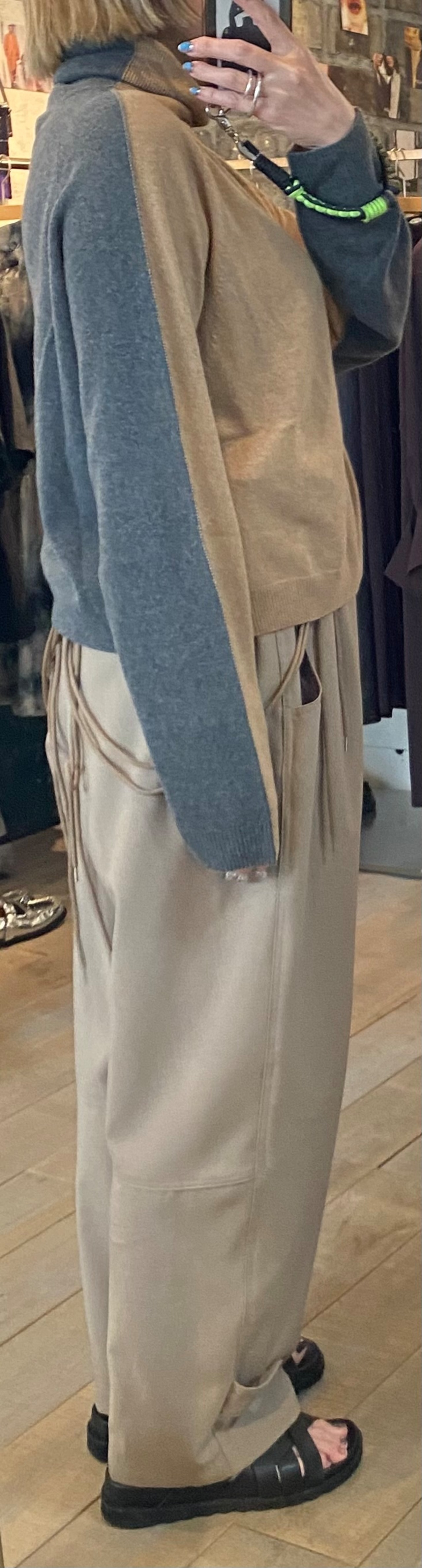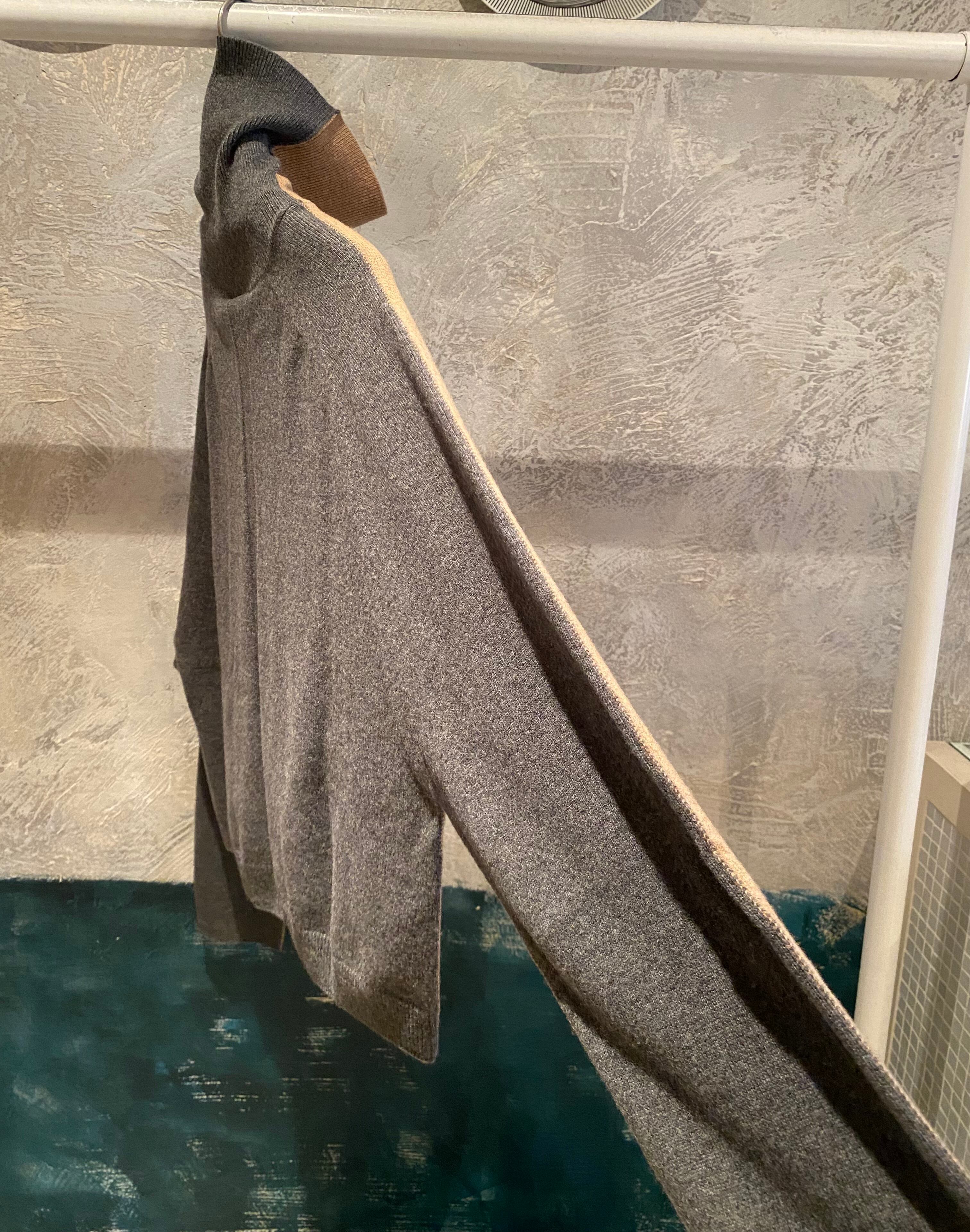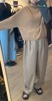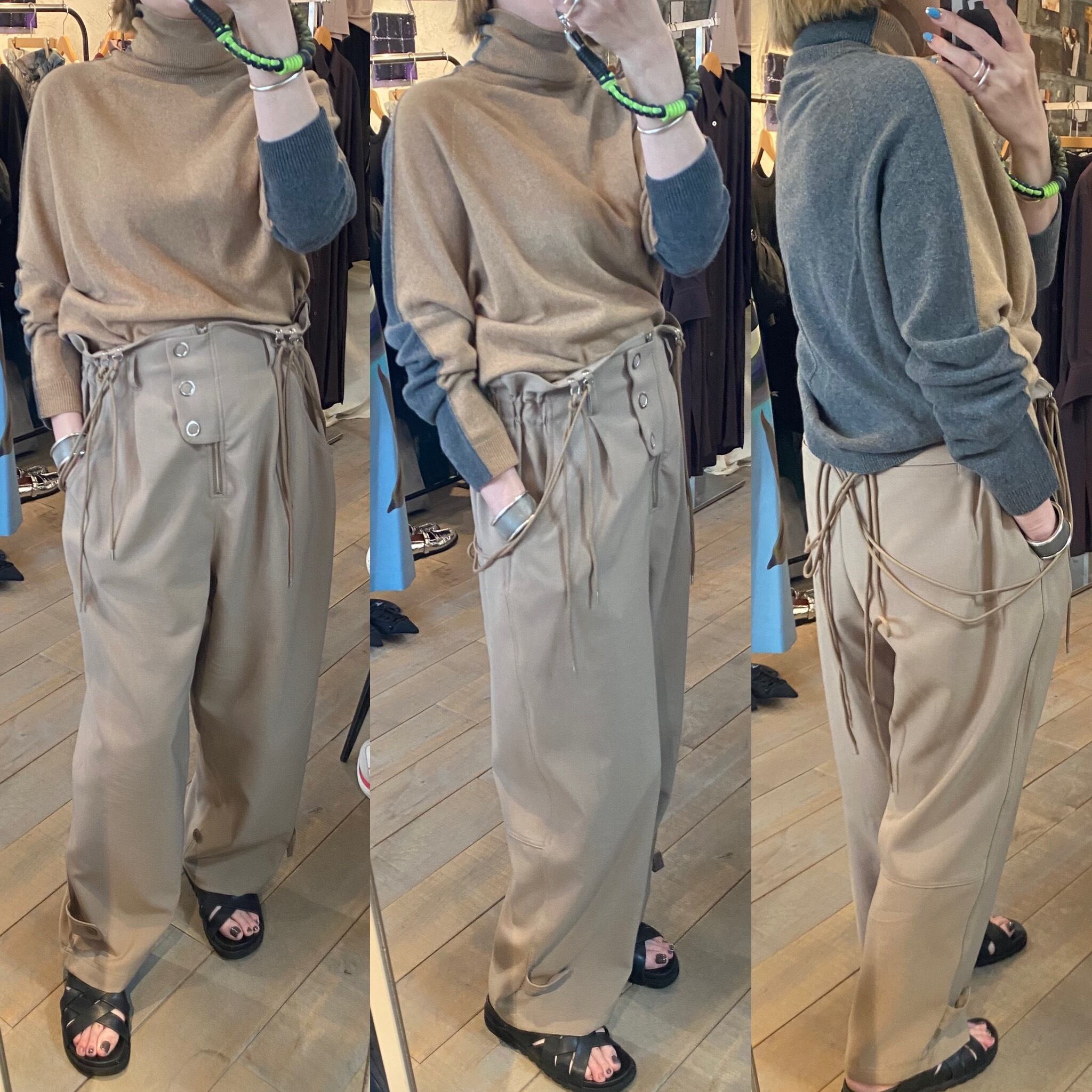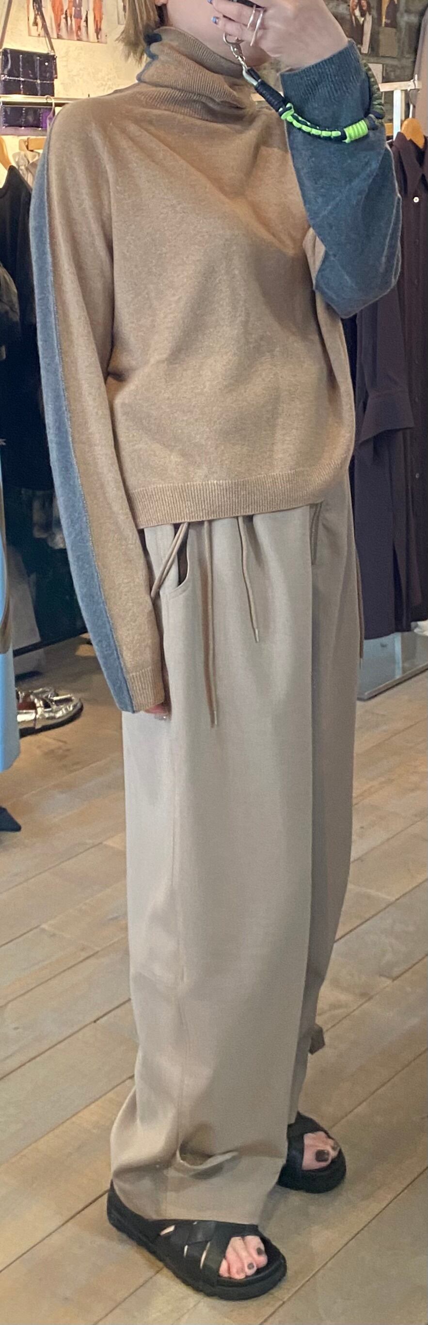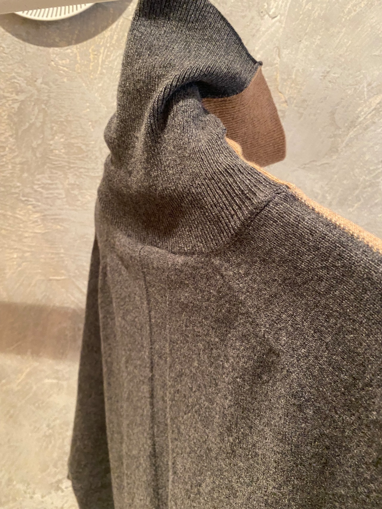 程よいオーバーシルエットのタートルネックプルオーバー。バイカラーの配色が特徴的。サラッと着るだけで雰囲気の出るシルエットになっています。ウールカシミヤで軽くて暖かく、抜群の肌触りです。程よい肉厚さも取り入れやすいアイテムです。スタイリングの主役でも、レイヤードのインナーにでも着回せます♪