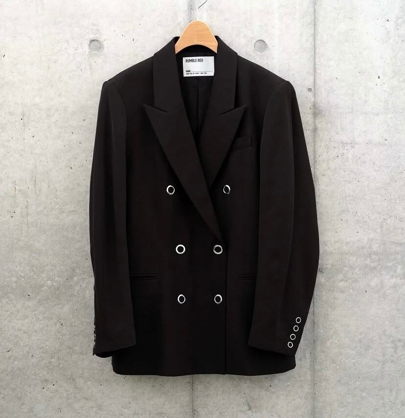 今回はピークドラペルを採用し、よりジェントルに仕上げています。ピークドラペルのデザインは、1930年代の軍服から発展したと言われており、当時のスーツにも採用されていたディテールです。ボタンはRUMBLEREDの象徴でもあるリングドットボタンを6つ用いダブル仕様に仕上げました。