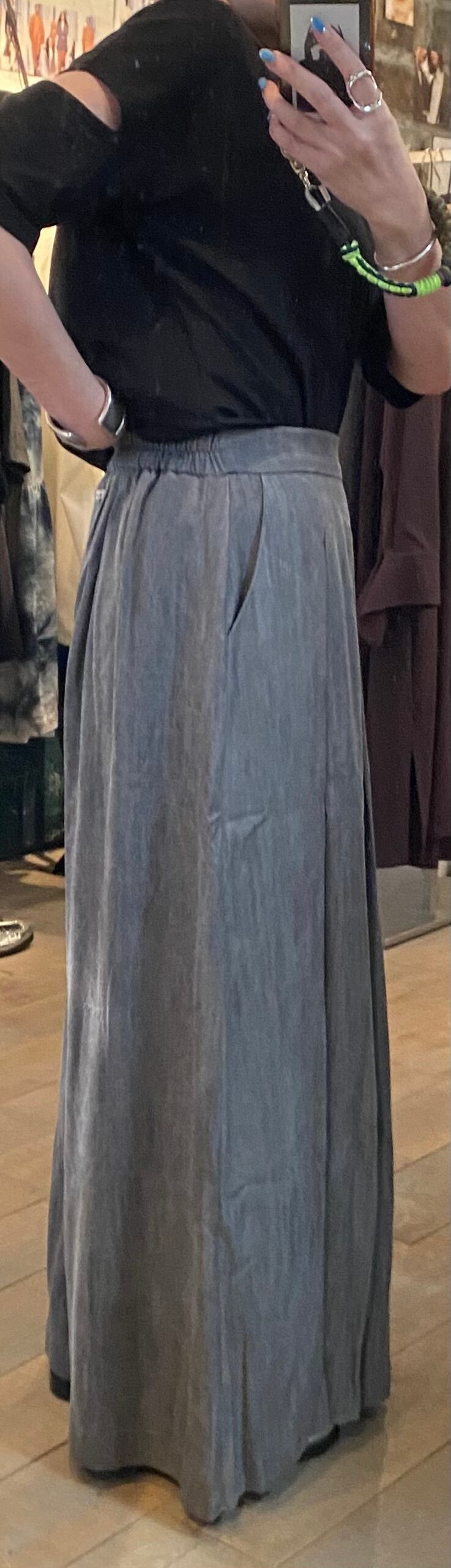 オチ感のあるバギーシルエットのパンツは、ウエストがゴム仕様ながらスッキリ見えします。オチ感があり、スカート見えするフレアシルエットで脚長効果抜群のパンツです。履き心地も◎