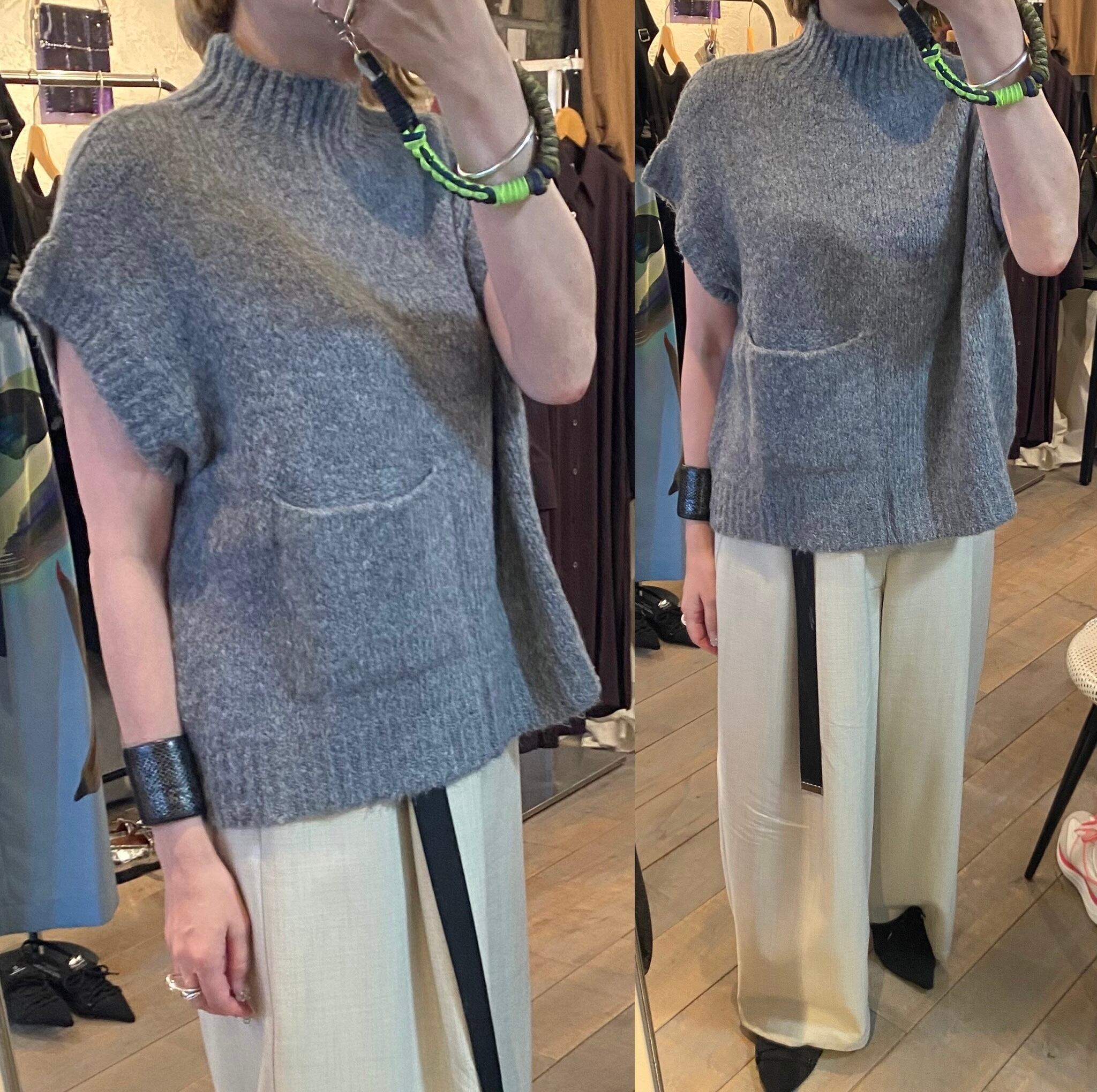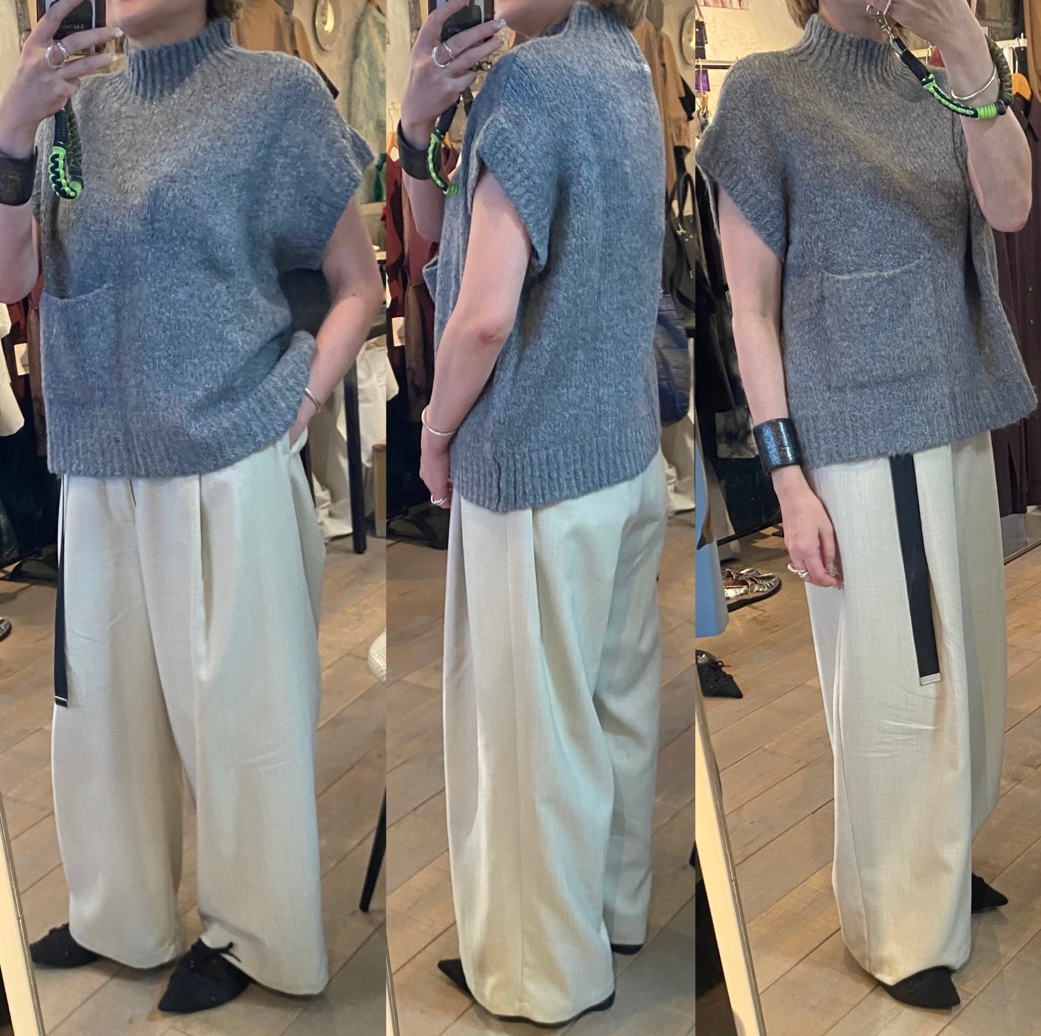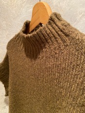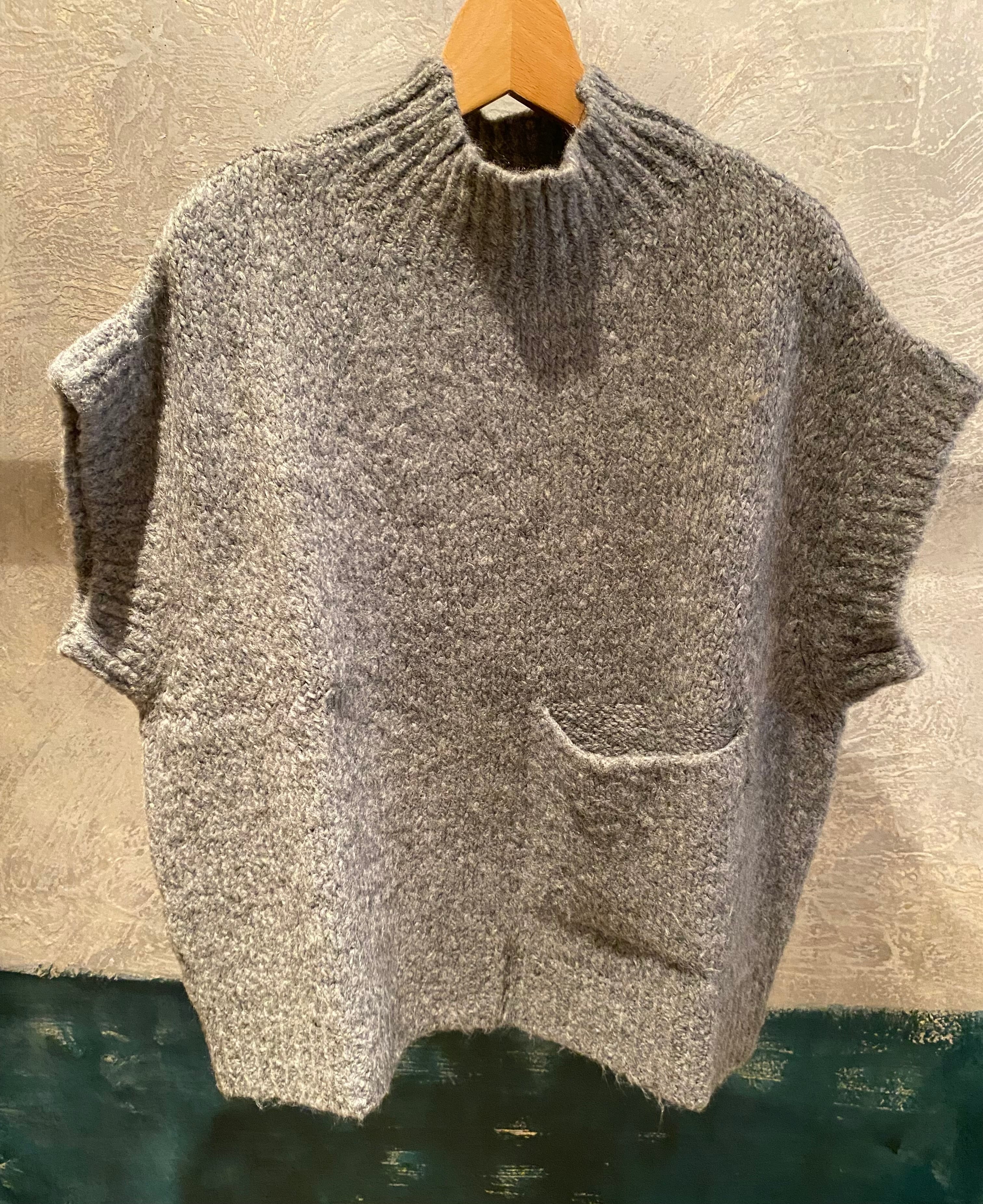 ハイネック、程よいゆとり感のベスト。ネックや袖はリブの始末になっています。フロントサイドの裾のポケットのデザインもポイント。ベーシックなデザインながら雰囲気を出してくれます。カットソーやブラウスなどとのレイヤードを楽しめます♪