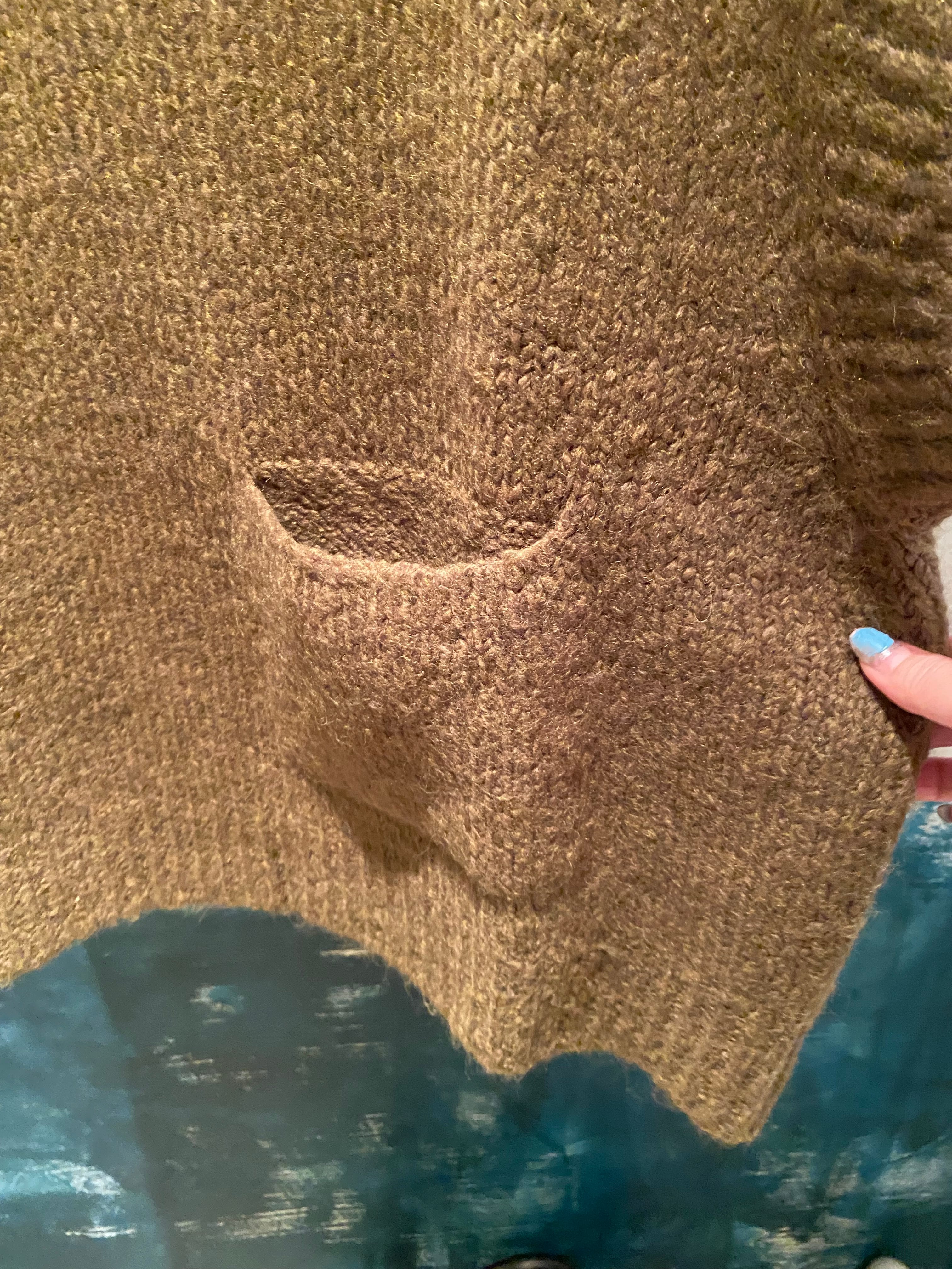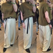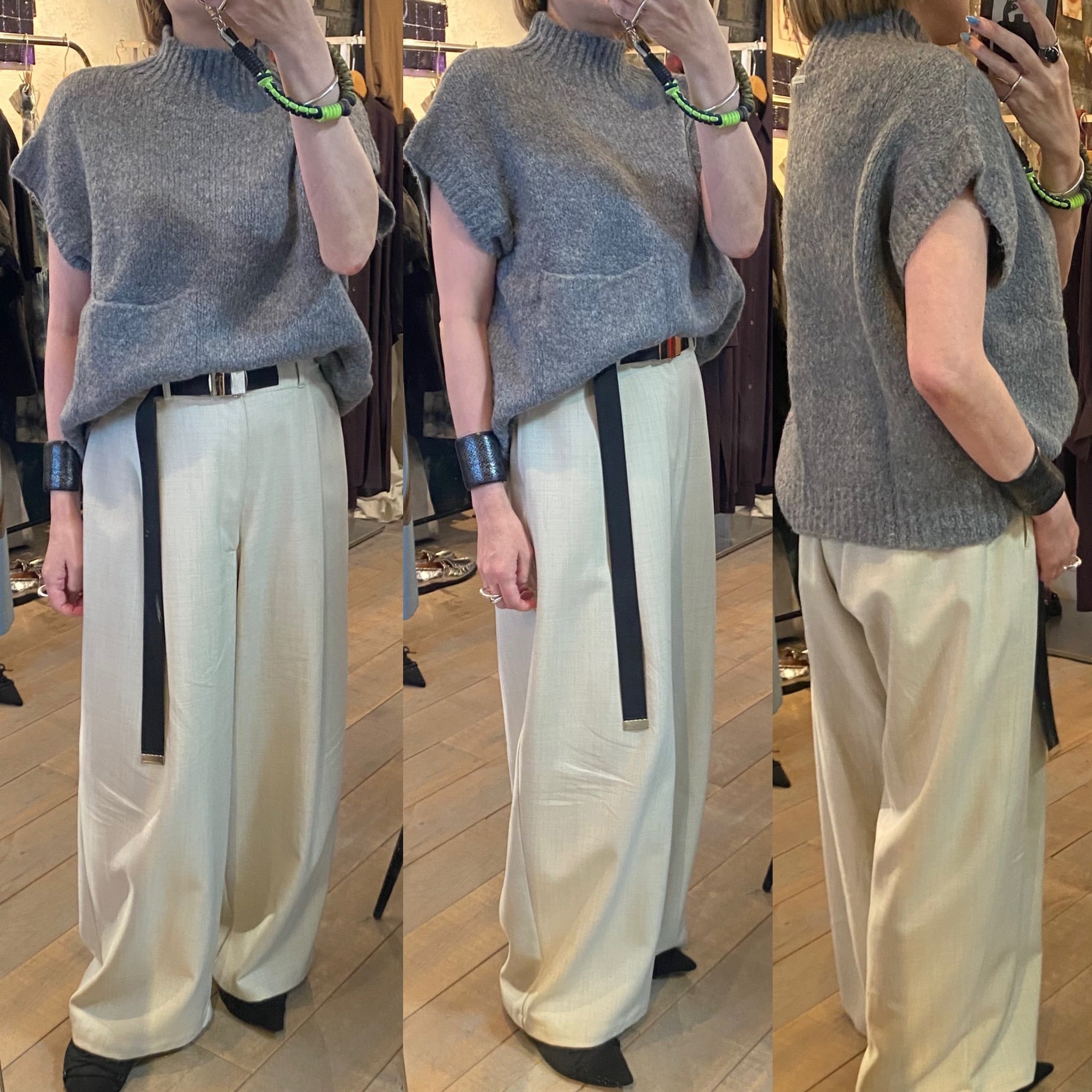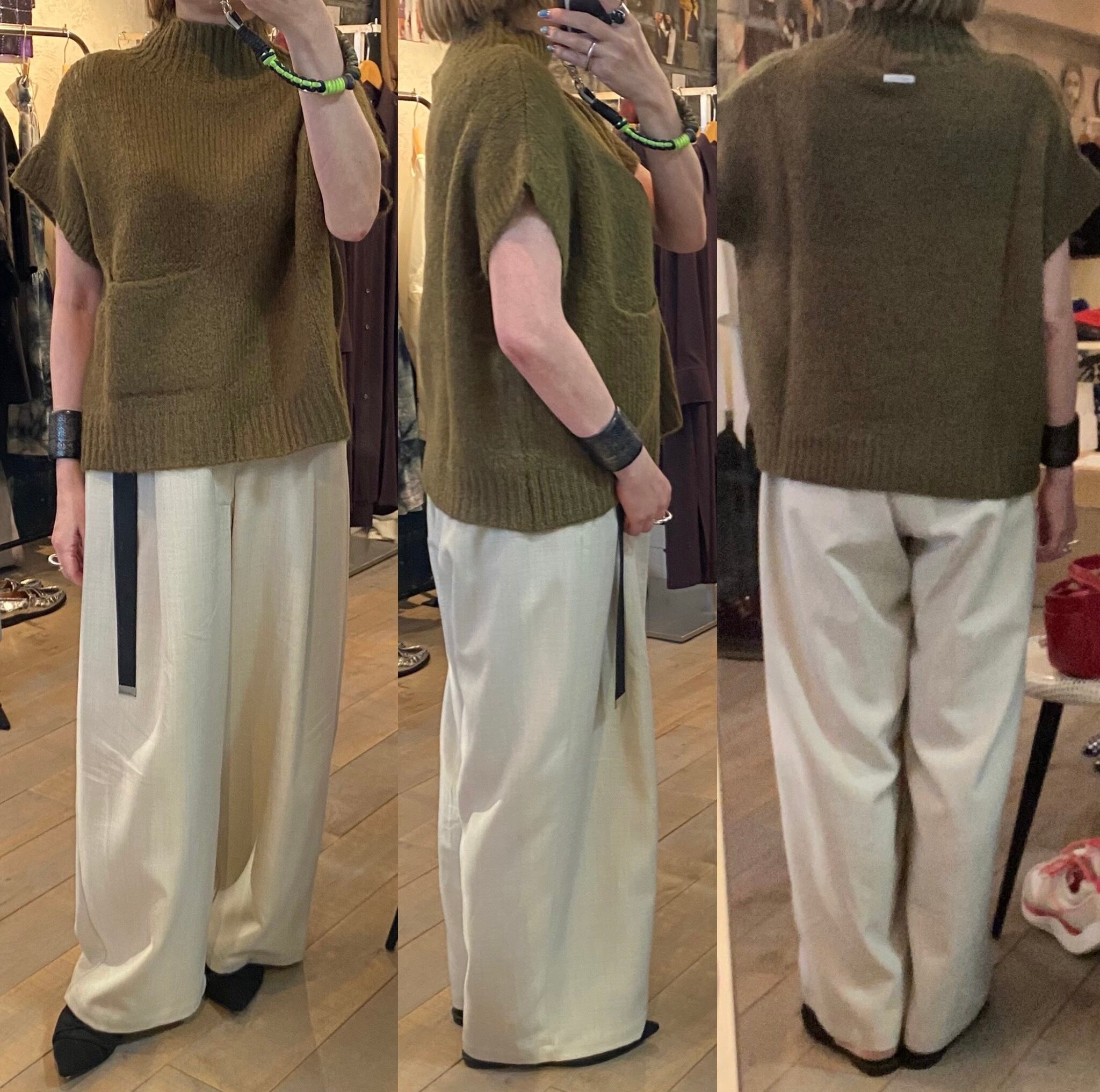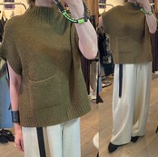 ハイネック、程よいゆとり感のベスト。ネックや袖はリブの始末になっています。フロントサイドの裾のポケットのデザインもポイント。ベーシックなデザインながら雰囲気を出してくれます。カットソーやブラウスなどとのレイヤードを楽しめます♪