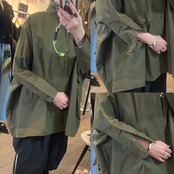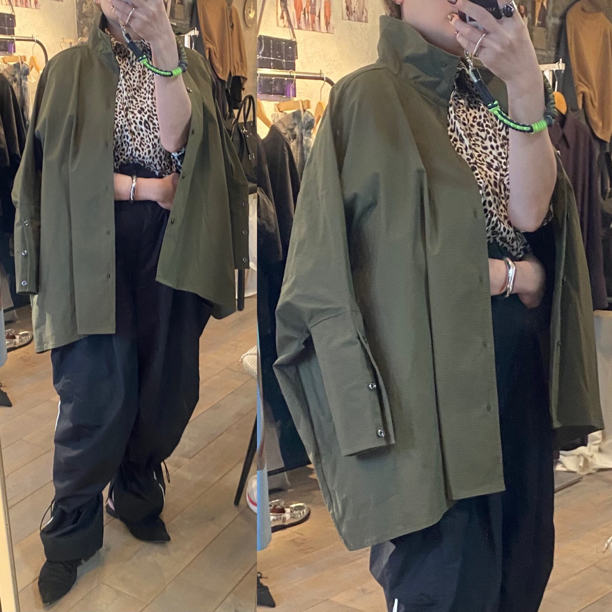 オーバーシルエットのシャツジャケット。ブラウスとしてもジャケットでも活用できロングシーズン着用可能。お袖口や後ろのボックスデザインもポイントに。サラッと着るだけで雰囲気の出る1枚。ネック部分のボタンの閉め具合で雰囲気が変わります。