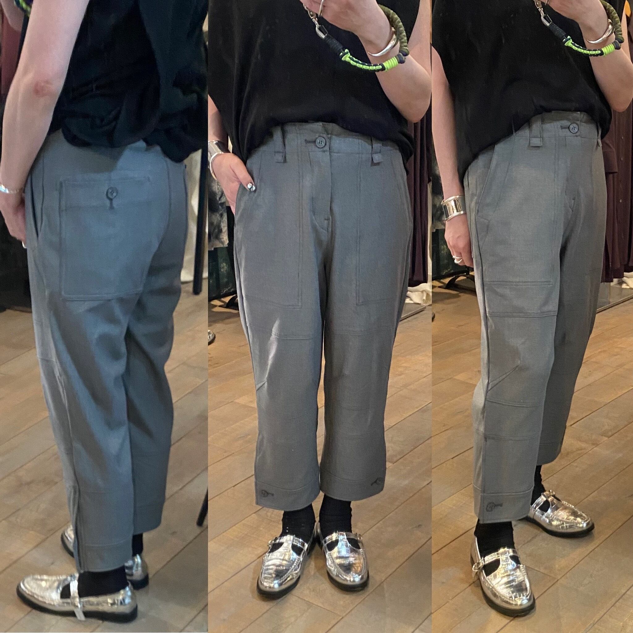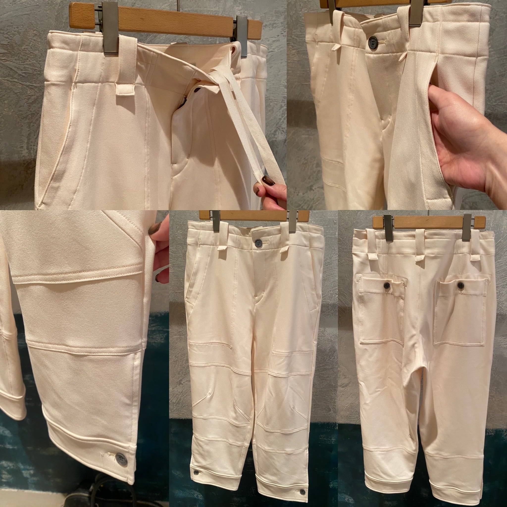 VORTEX精紡糸とSOFTWARM糸を使用した高付加価値素材。吸湿発熱機能、ソフトな風合い、毛玉になりにくい性質を持ち合わせています。暖かな裏起毛、美しいオチ感のある素材感が秋冬シーズンに活躍します。ウエストに調節紐を内蔵した裾シボまりのくるぶしの見えるカーゴパンツ。様々な切替線、膝ダーツ、ステッチワークが際立ちます。裾にはプリーツマチが入っています。前見頃両サイド切替ポケット、後ろ身頃両サイドパッチポケット付き。前中心ファスナーと釦開き。