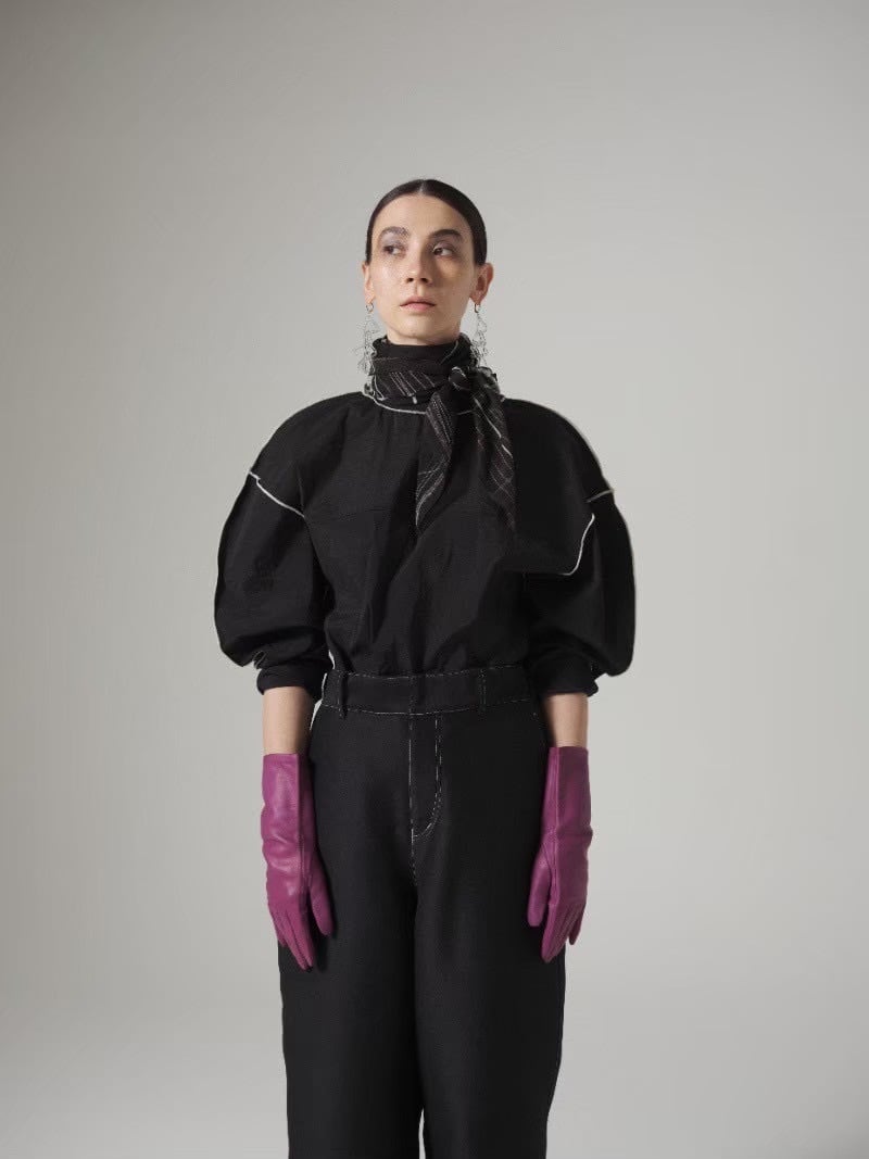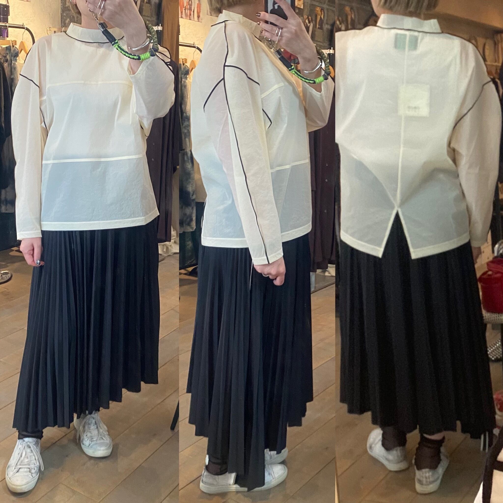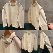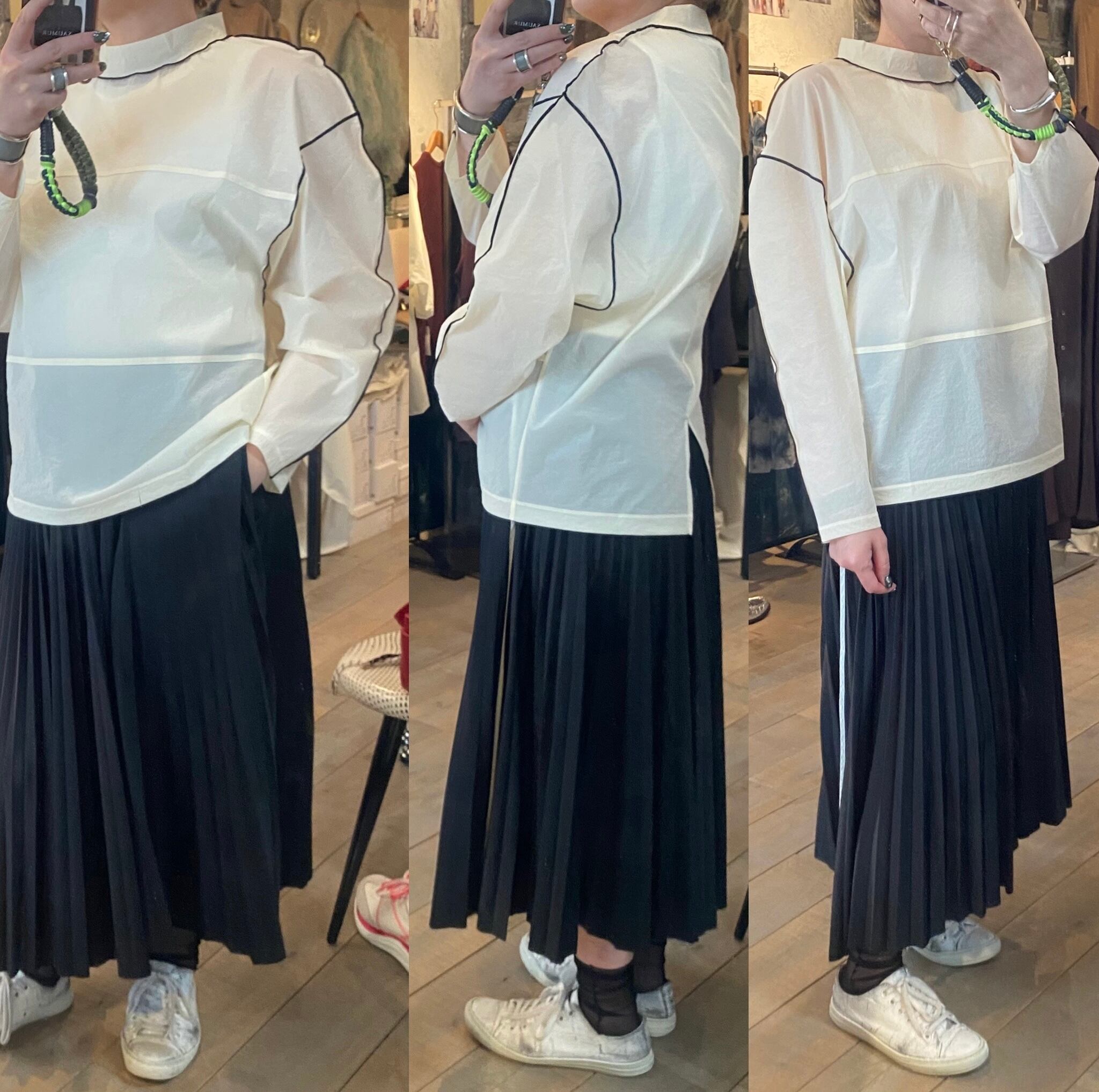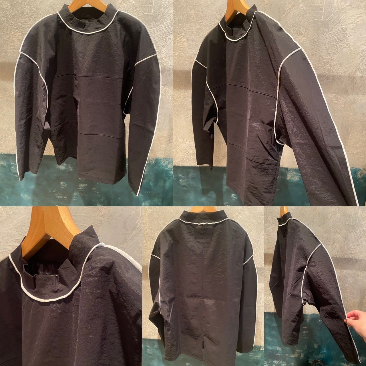 独特なシャリ感とハリ感があるワッシャーストレッチ素材のプルオーバートップス。衿ぐり、袖ぐり、袖山は配色糸でハギ合わせのデザインになっています。センターバックにスリットデザイン有り。立体感のあるデザインが特徴的なトップスでロングシーズン着回せるアイテムです♪キックバックも良く着心地も◎