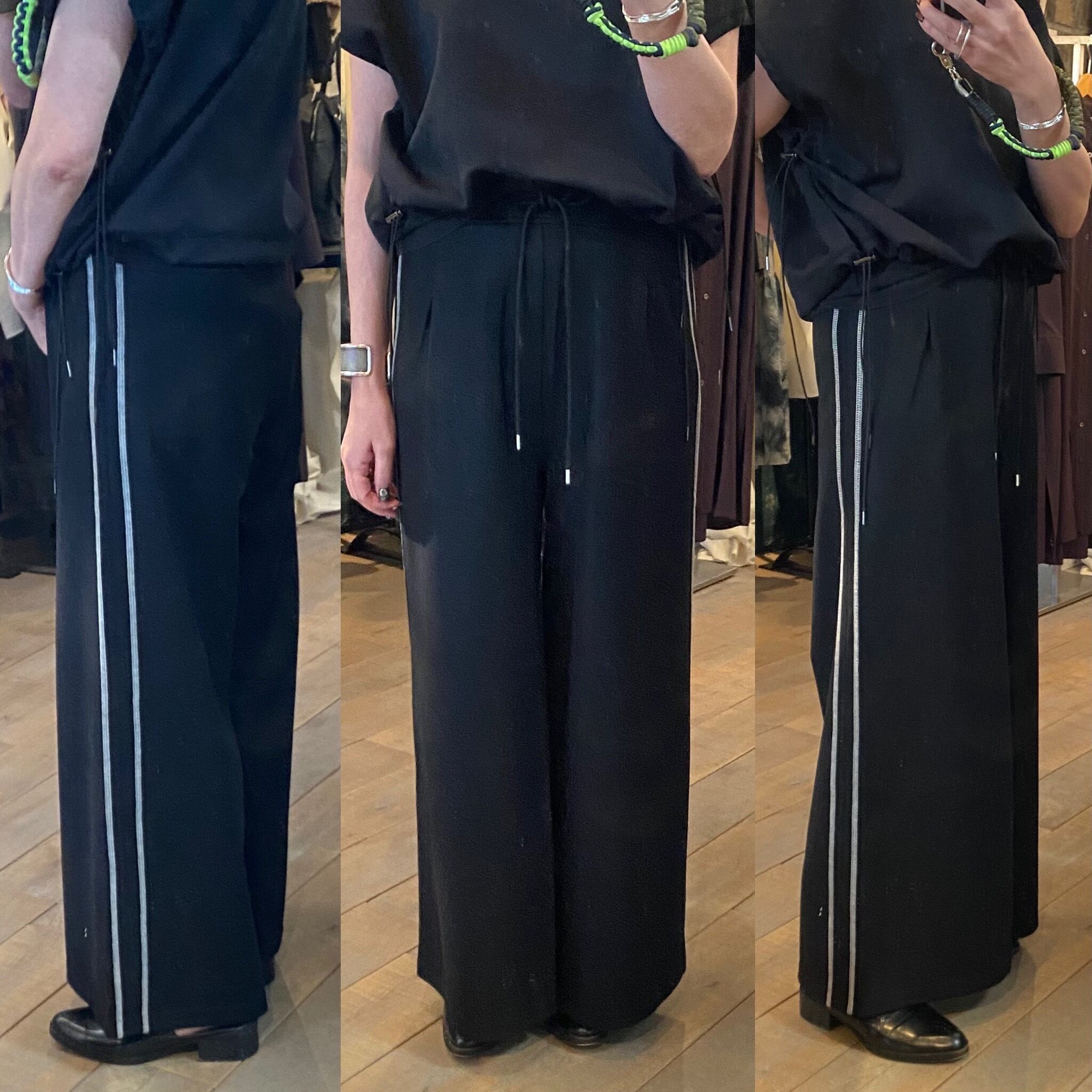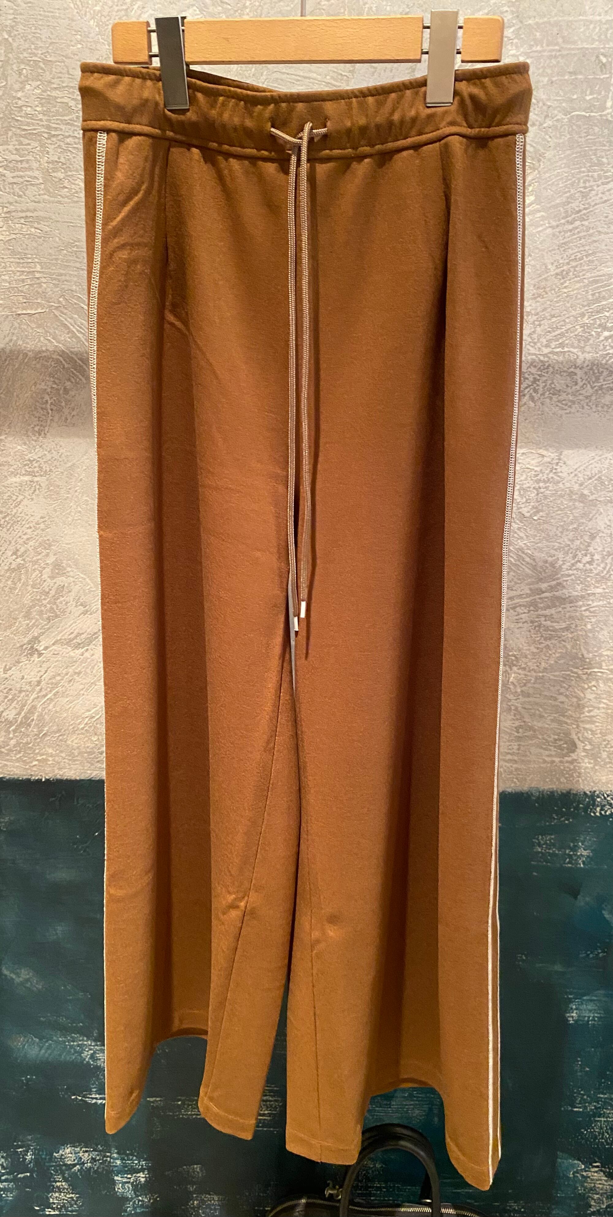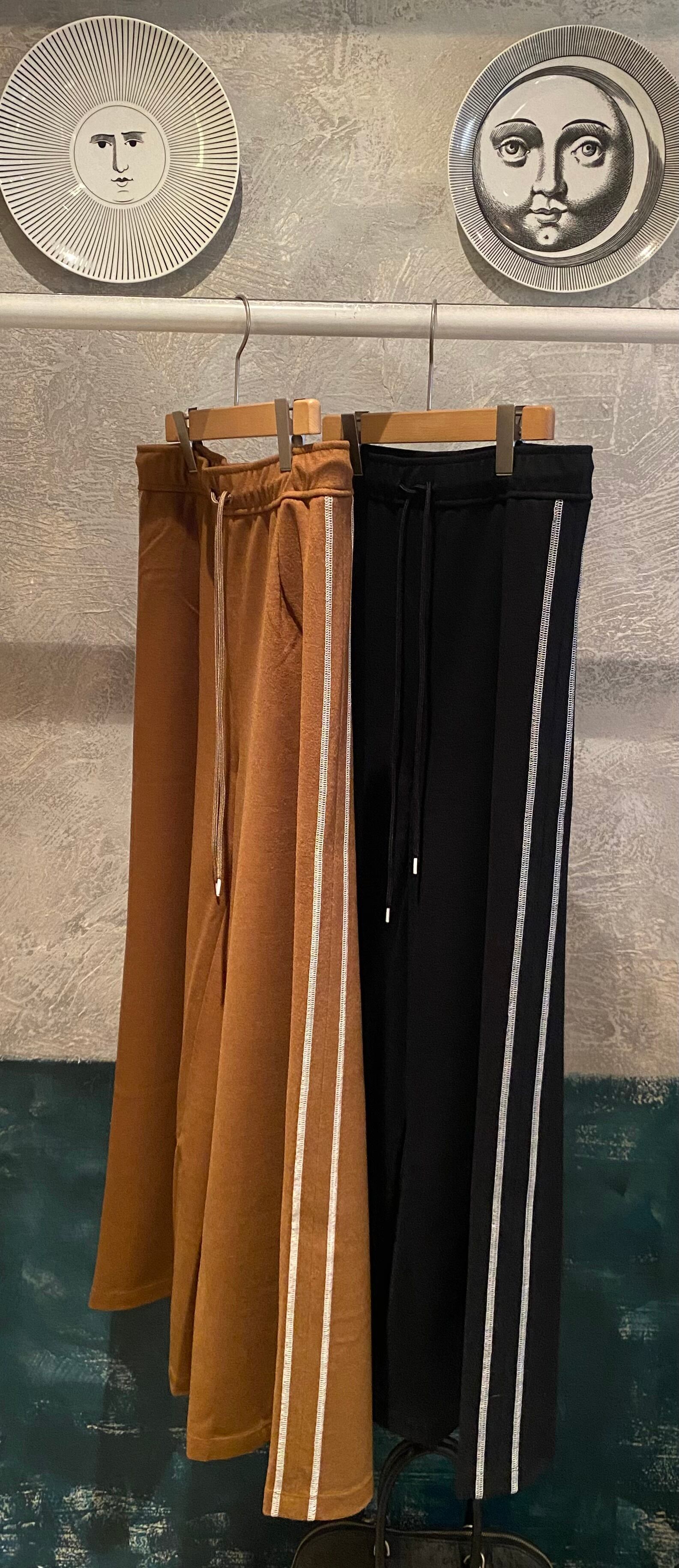 上品な光沢と質感、しなやかさが楽しめる高級感のある圧縮ニット素材。薄手ながらシワにもなりにくい素材。サイドの配色の飾りステッチがポイントのワイドシルエットのパンツ。オチ感もあり、ワイドながらスッキリとした印象です♪