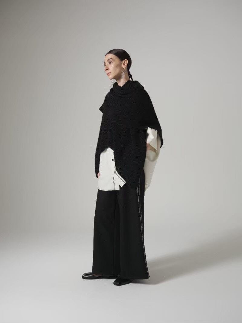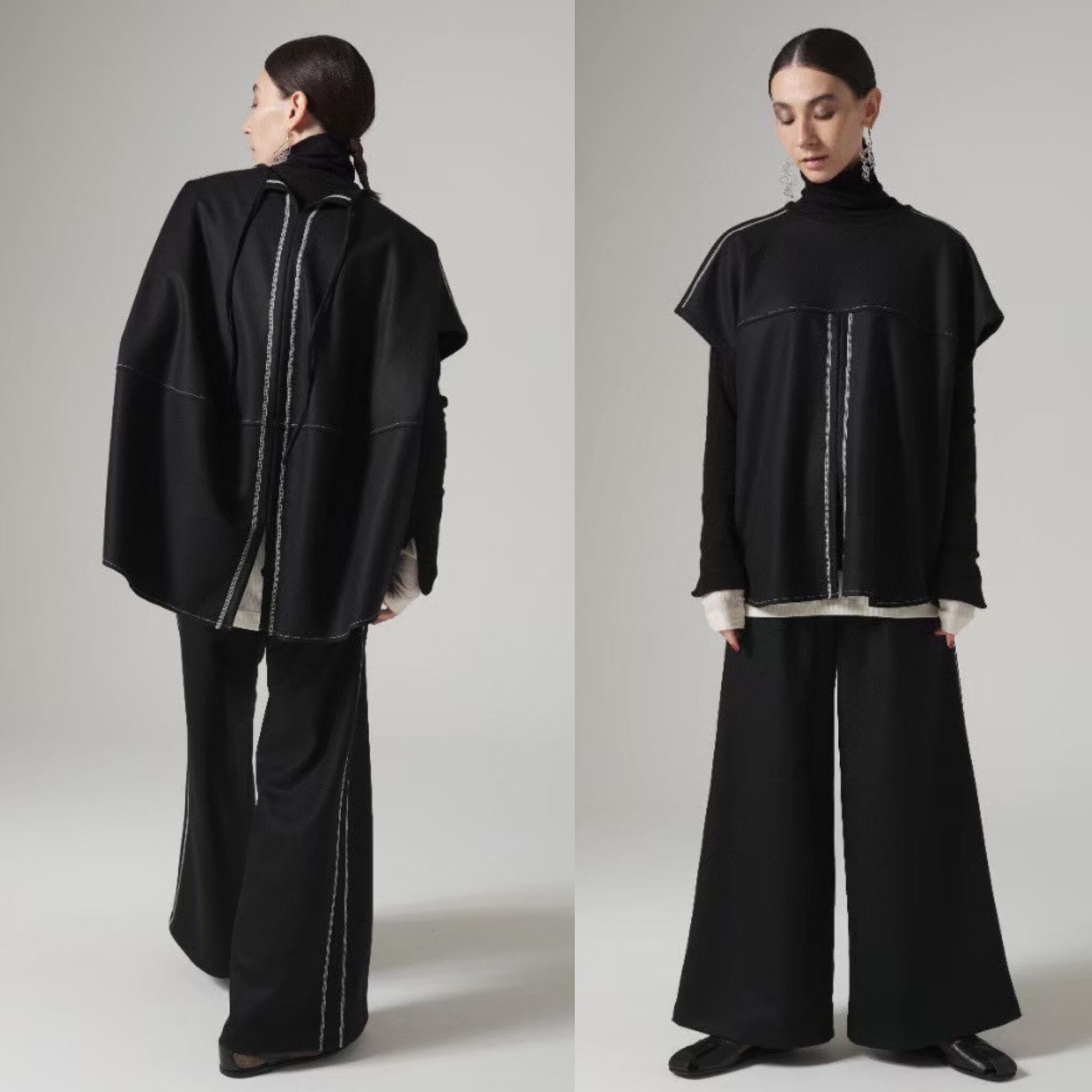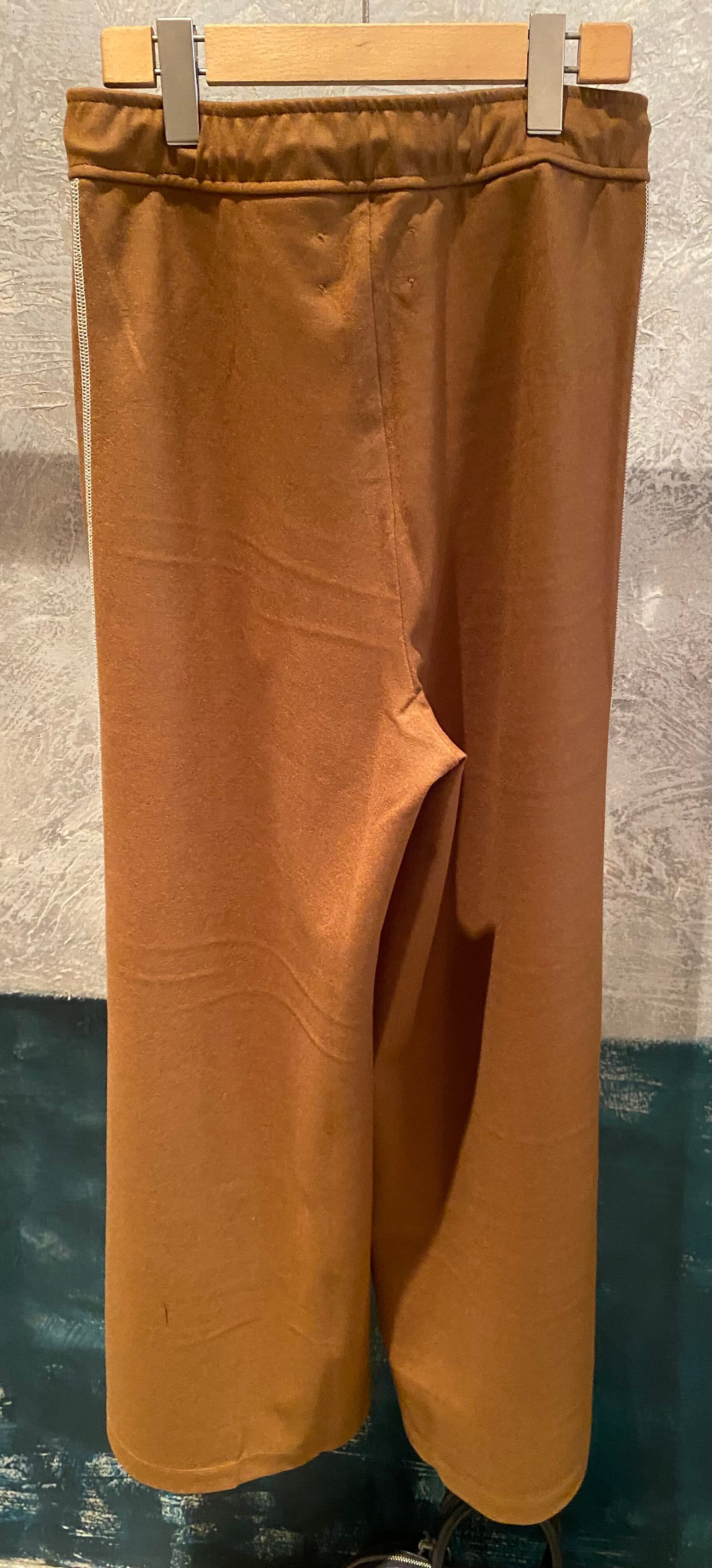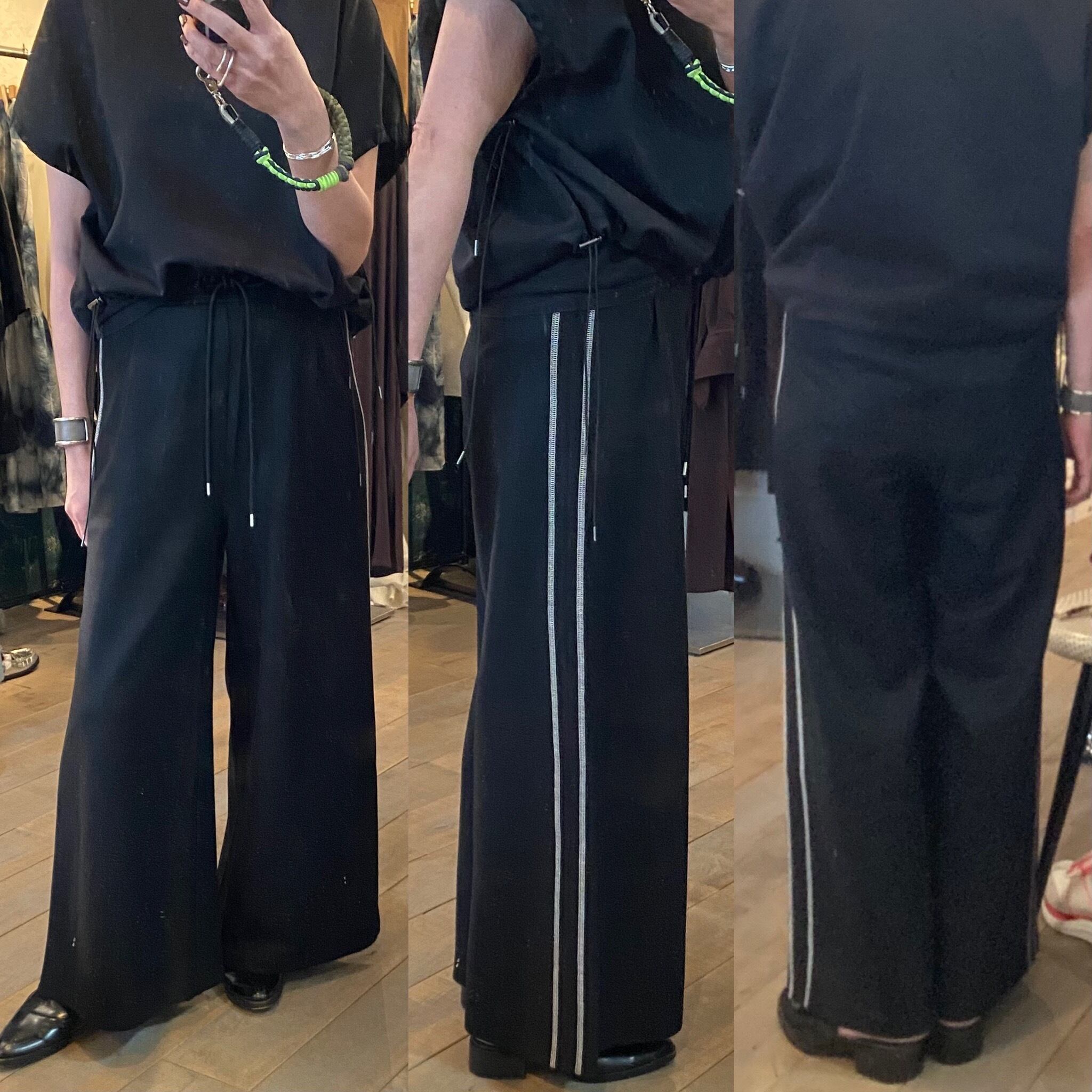 上品な光沢と質感、しなやかさが楽しめる高級感のある圧縮ニット素材。薄手ながらシワにもなりにくい素材。サイドの配色の飾りステッチがポイントのワイドシルエットのパンツ。オチ感もあり、ワイドながらスッキリとした印象です♪