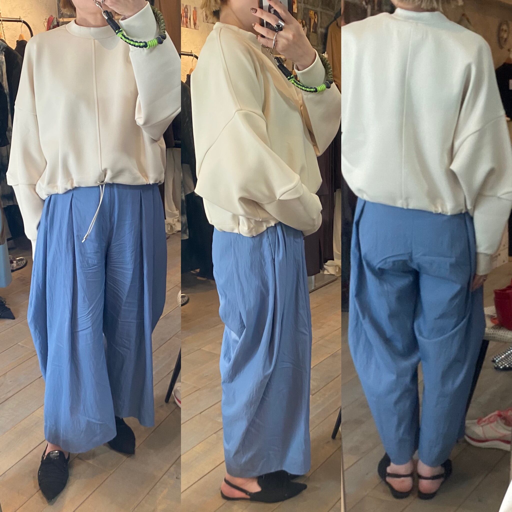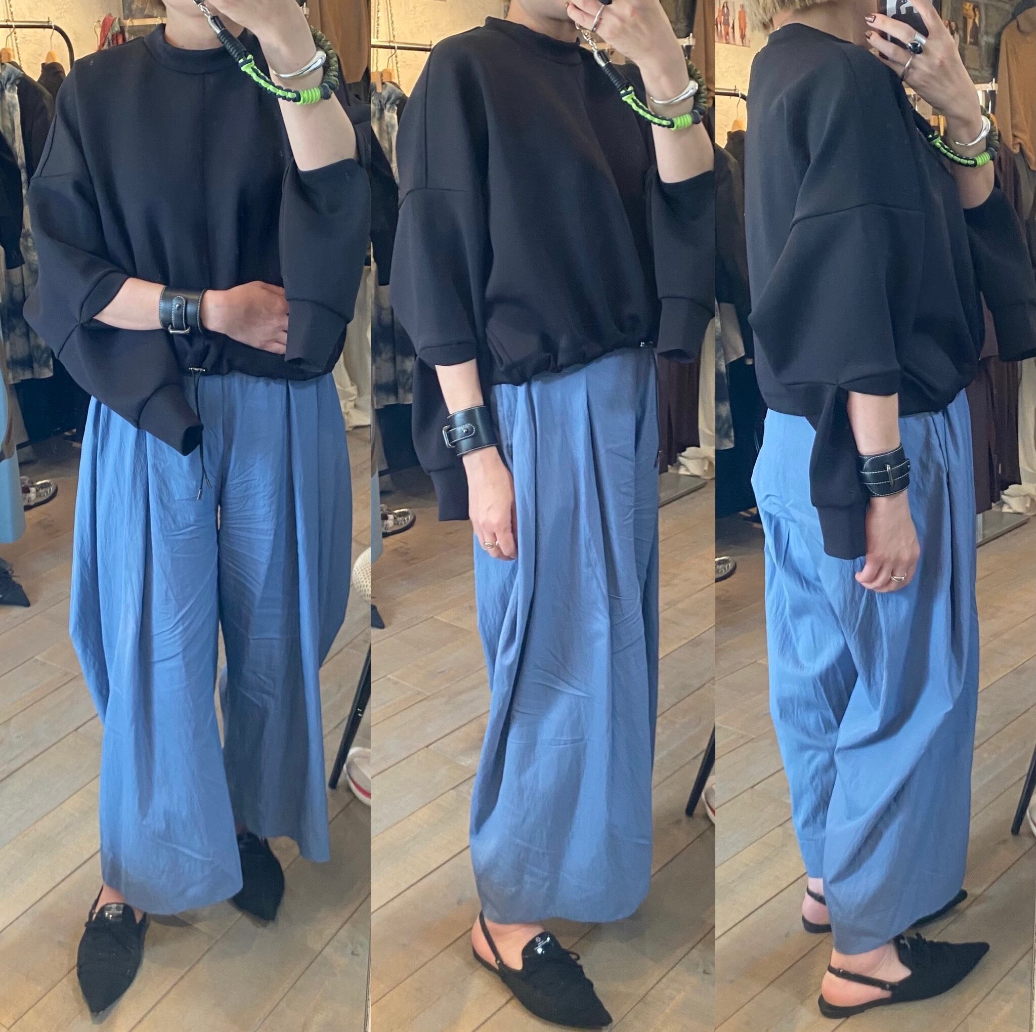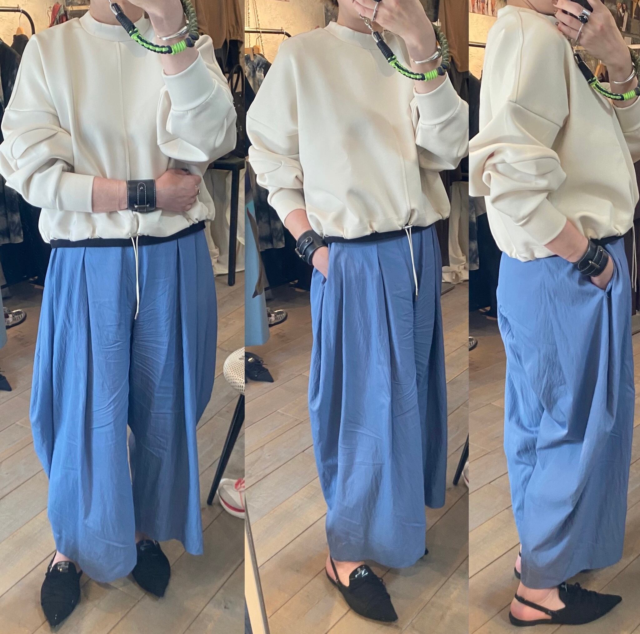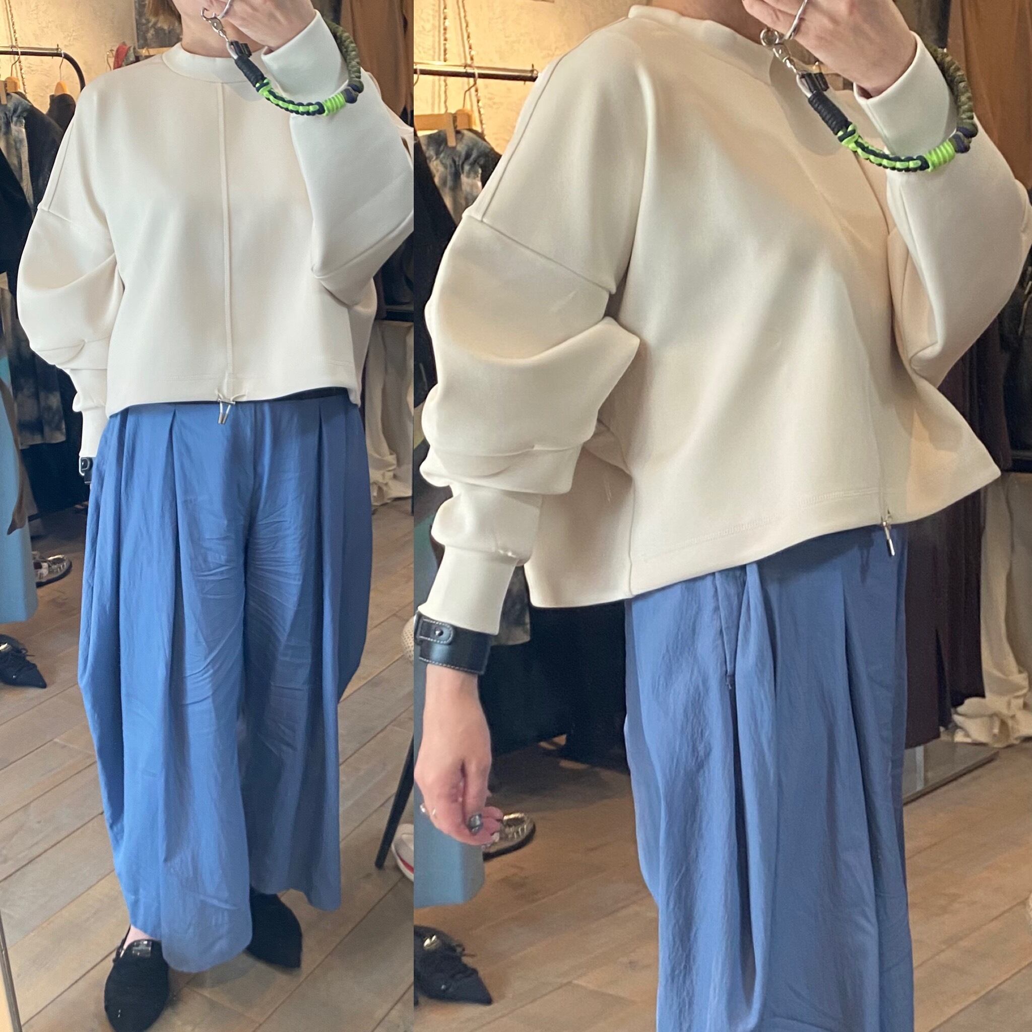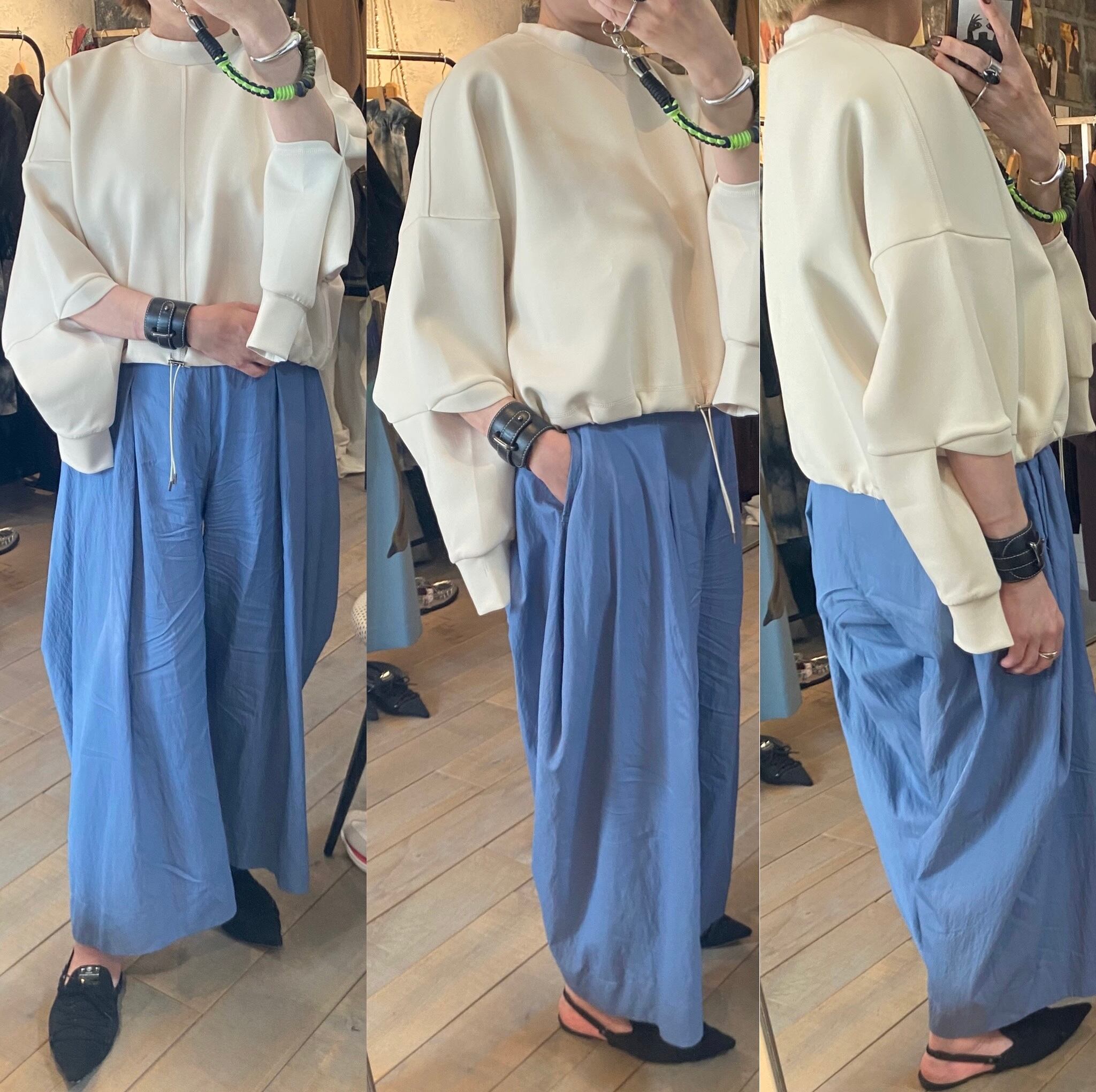 ドローコードクロップドTeeは、お袖の肘辺りに傘付きホールが空いているので、そこから腕を出したり、ドローコードを引いたギャザーによるシルエットが女性らしさを演出してくれます。裾のドローコードを調節して、シルエットのアレンジが可能です。
