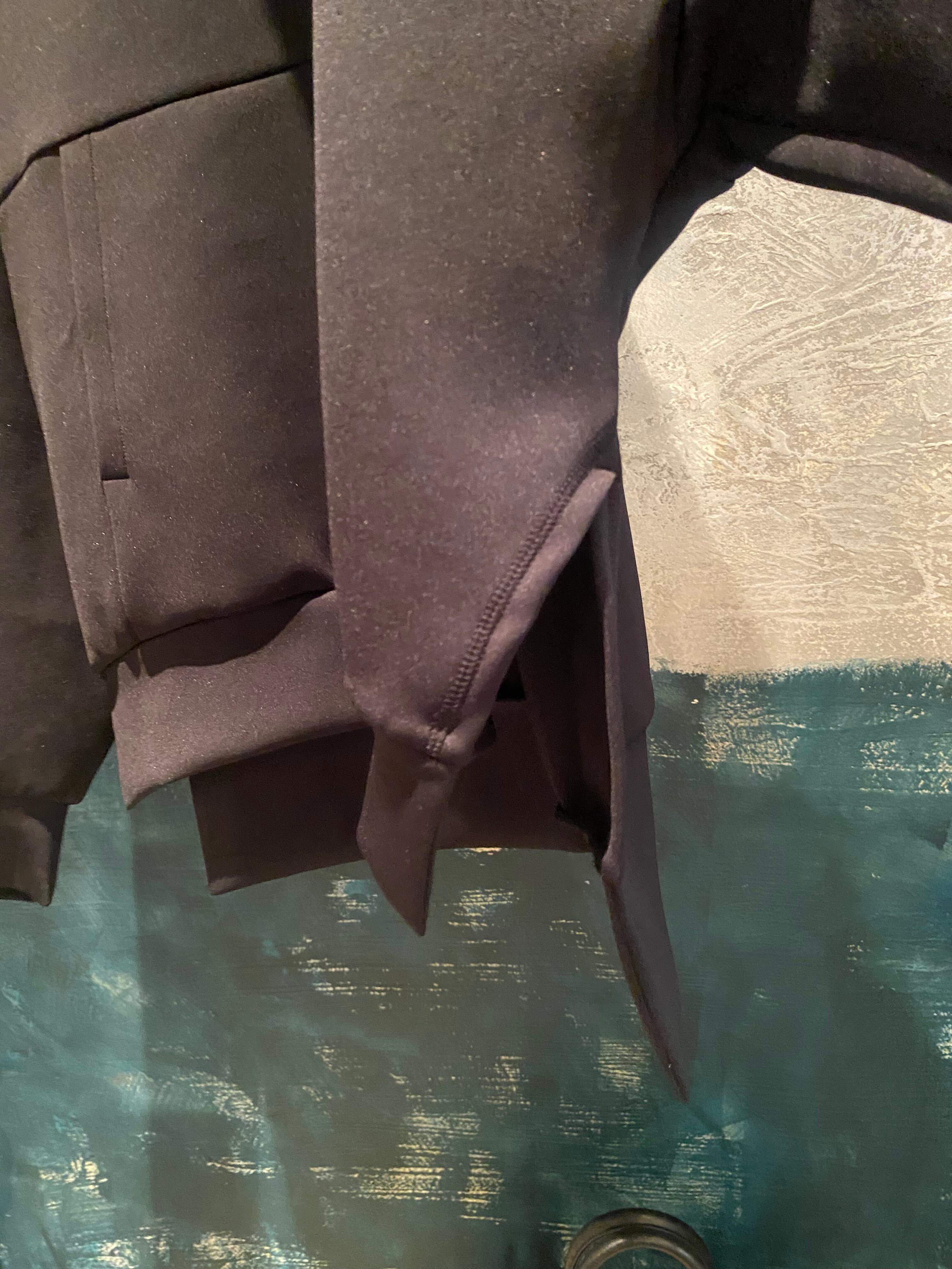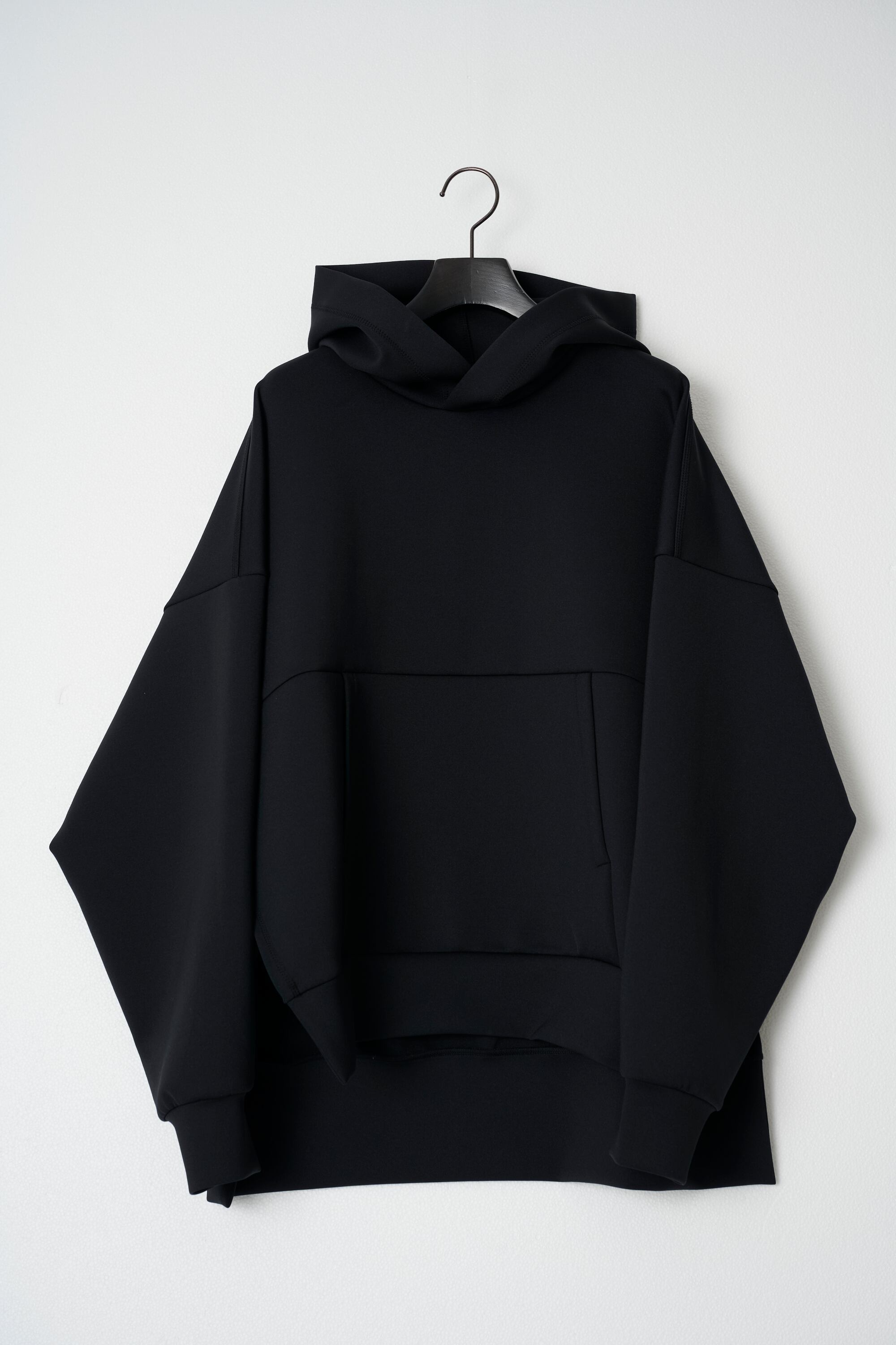 素材は、リサイクルポリエステルを使用したハイゲージダンボールニット。強力な伸縮性と独特のドレープが特徴的で、特殊柔軟による加工で、肌触りの良い風合いに仕上げています。