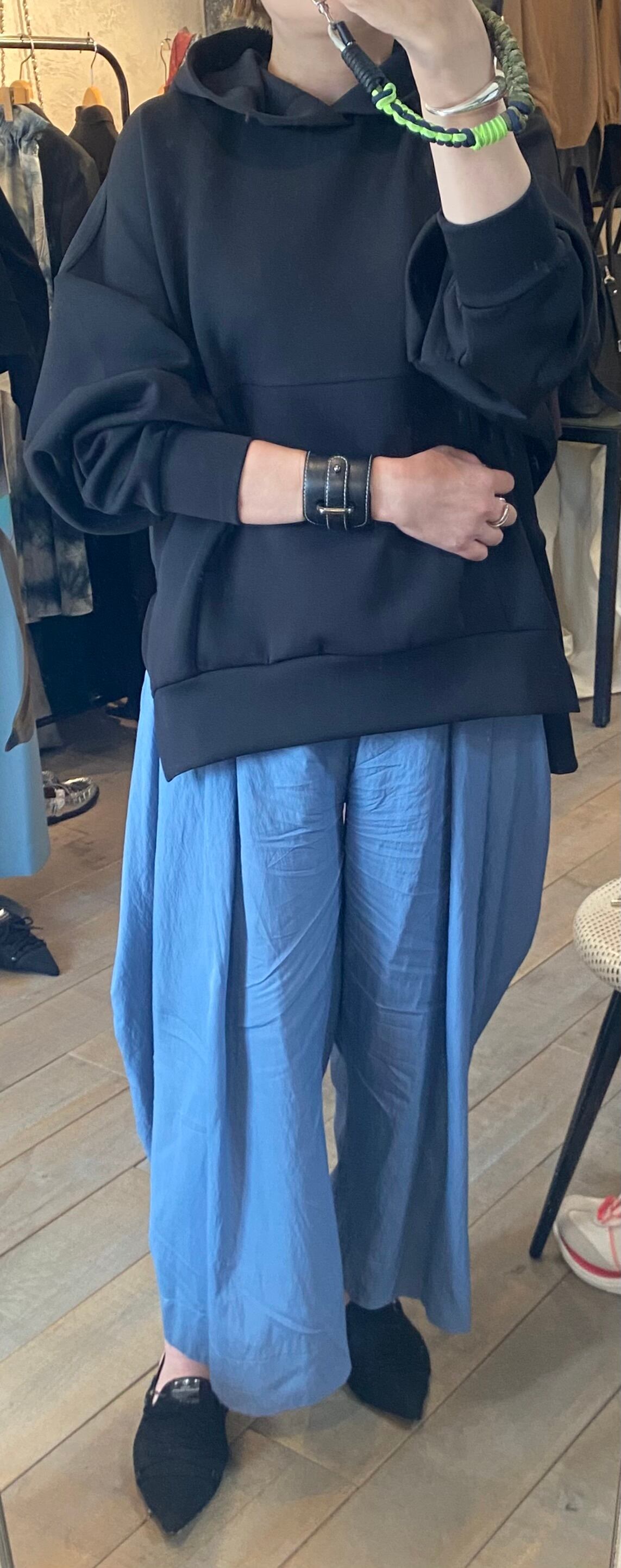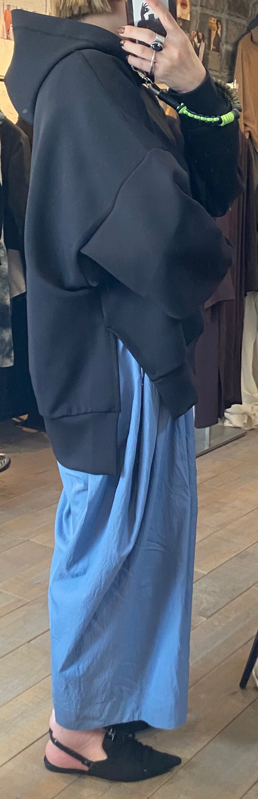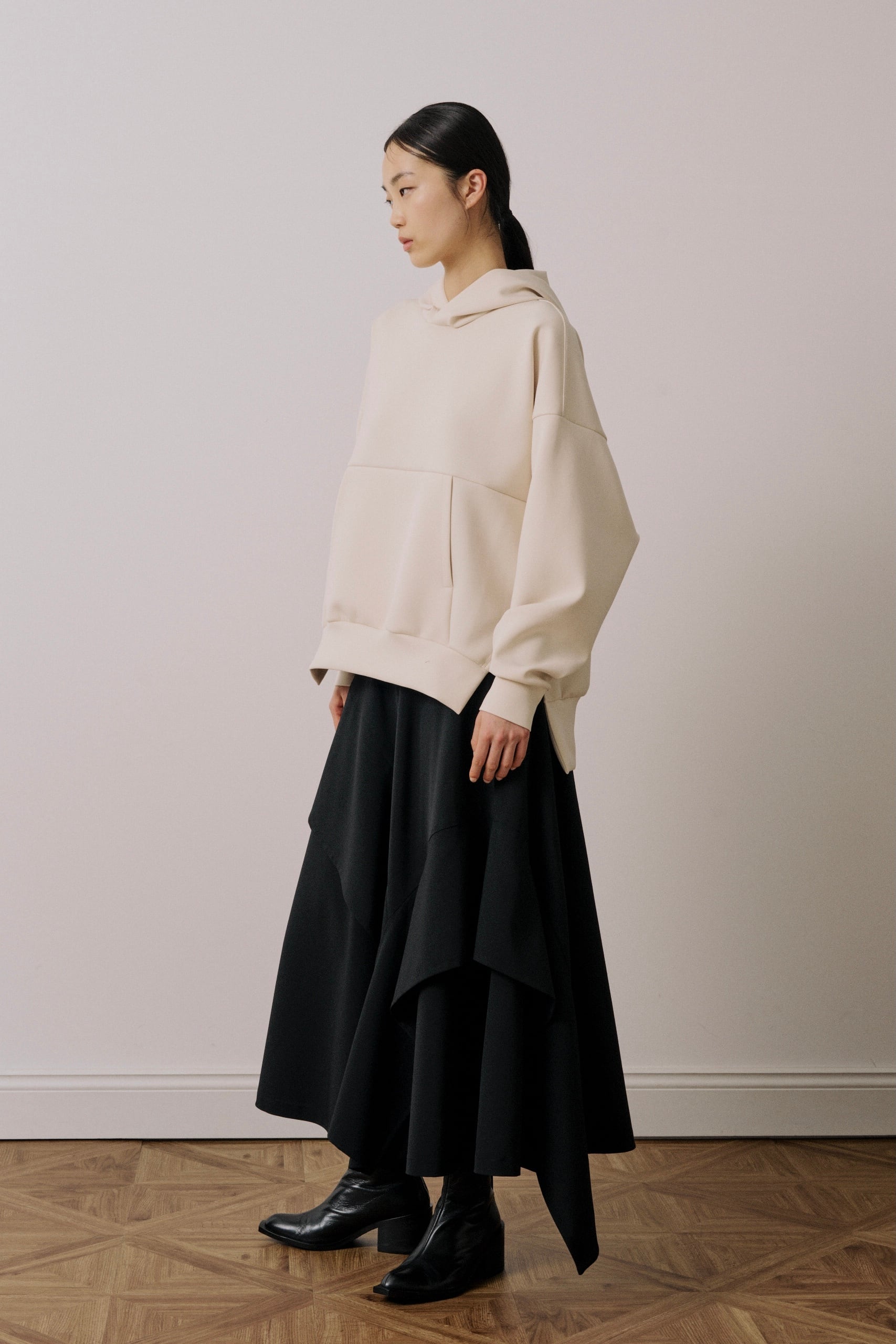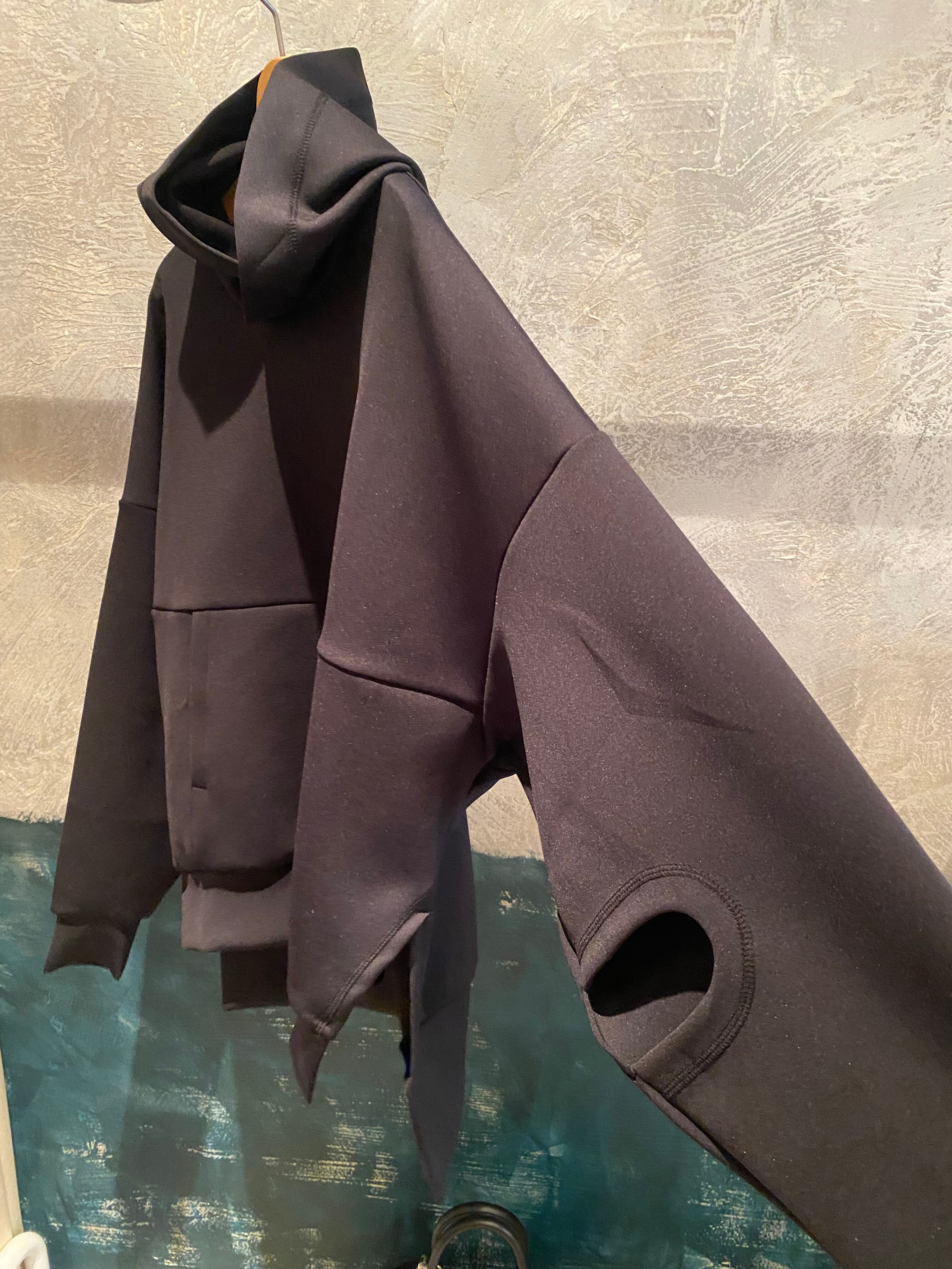 フーディープルオーバーは、脇にスリットの入ったゆったりとしたサイズ感のプルオーバーパーカー。肘の内側にあけた穴が特徴的で、穴から腕を出しても着れるデザイン。前後差のある着丈もポイントです♪