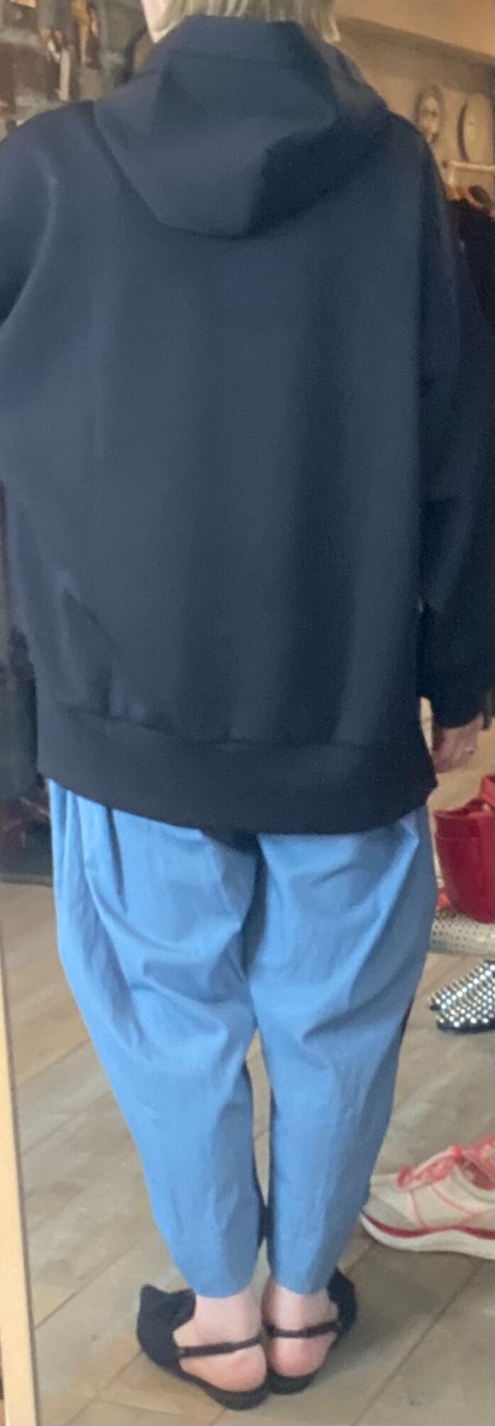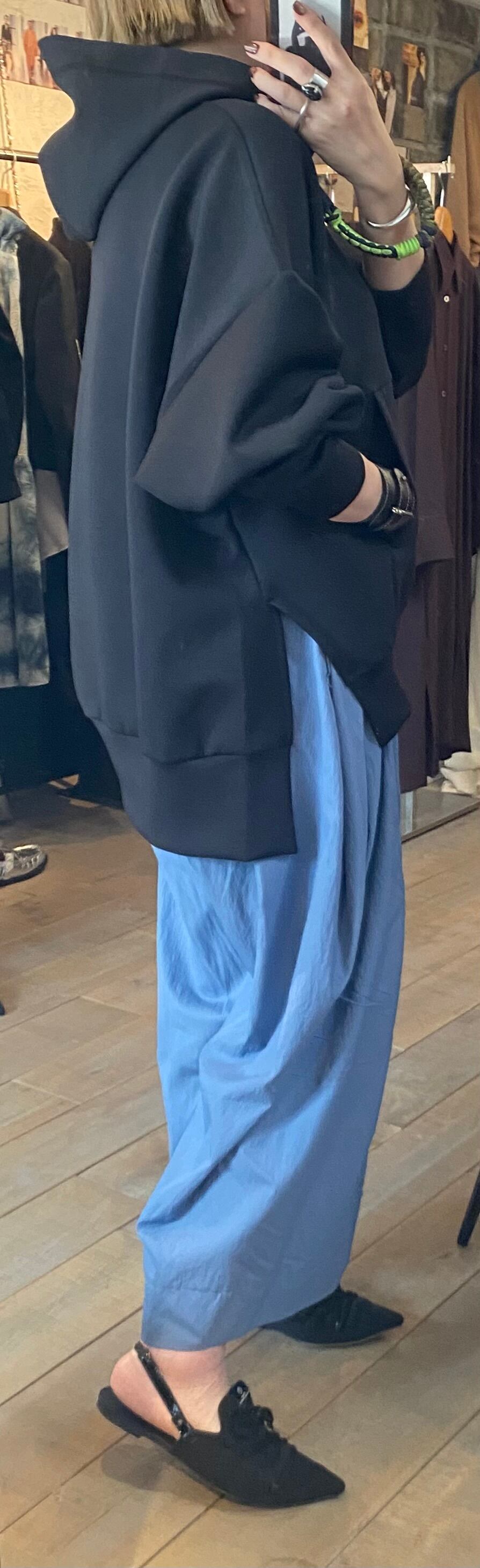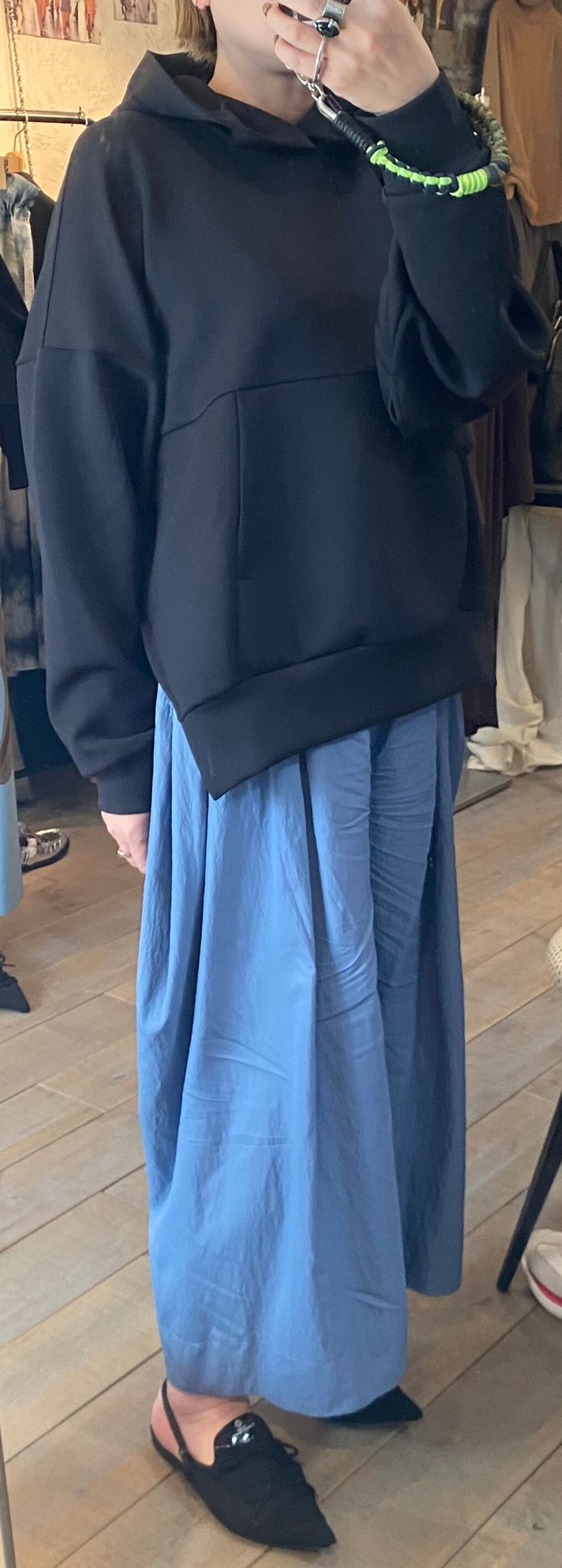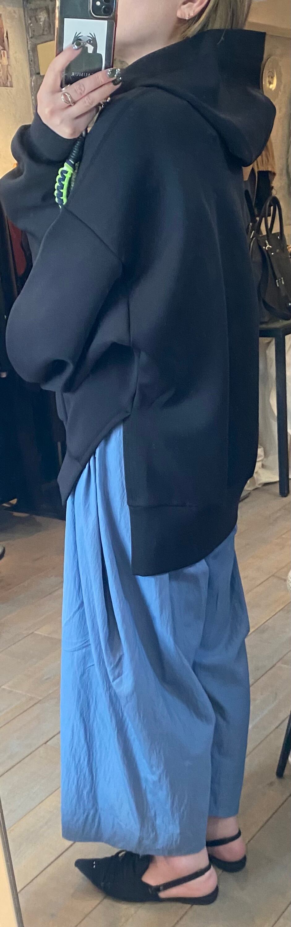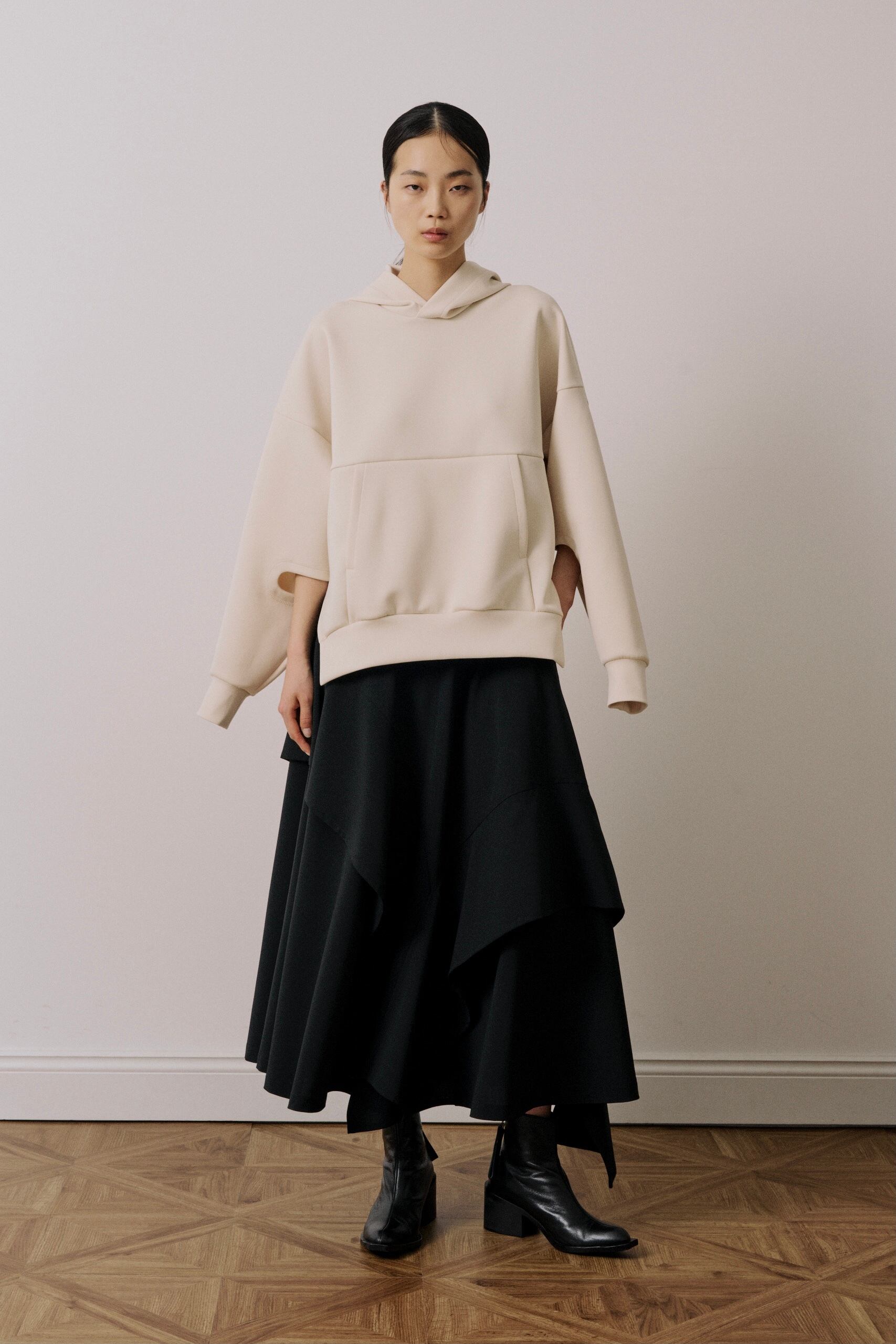 フーディープルオーバーは、脇にスリットの入ったゆったりとしたサイズ感のプルオーバーパーカー。肘の内側にあけた穴が特徴的で、穴から腕を出しても着れるデザイン。前後差のある着丈もポイントです♪