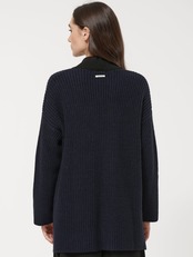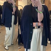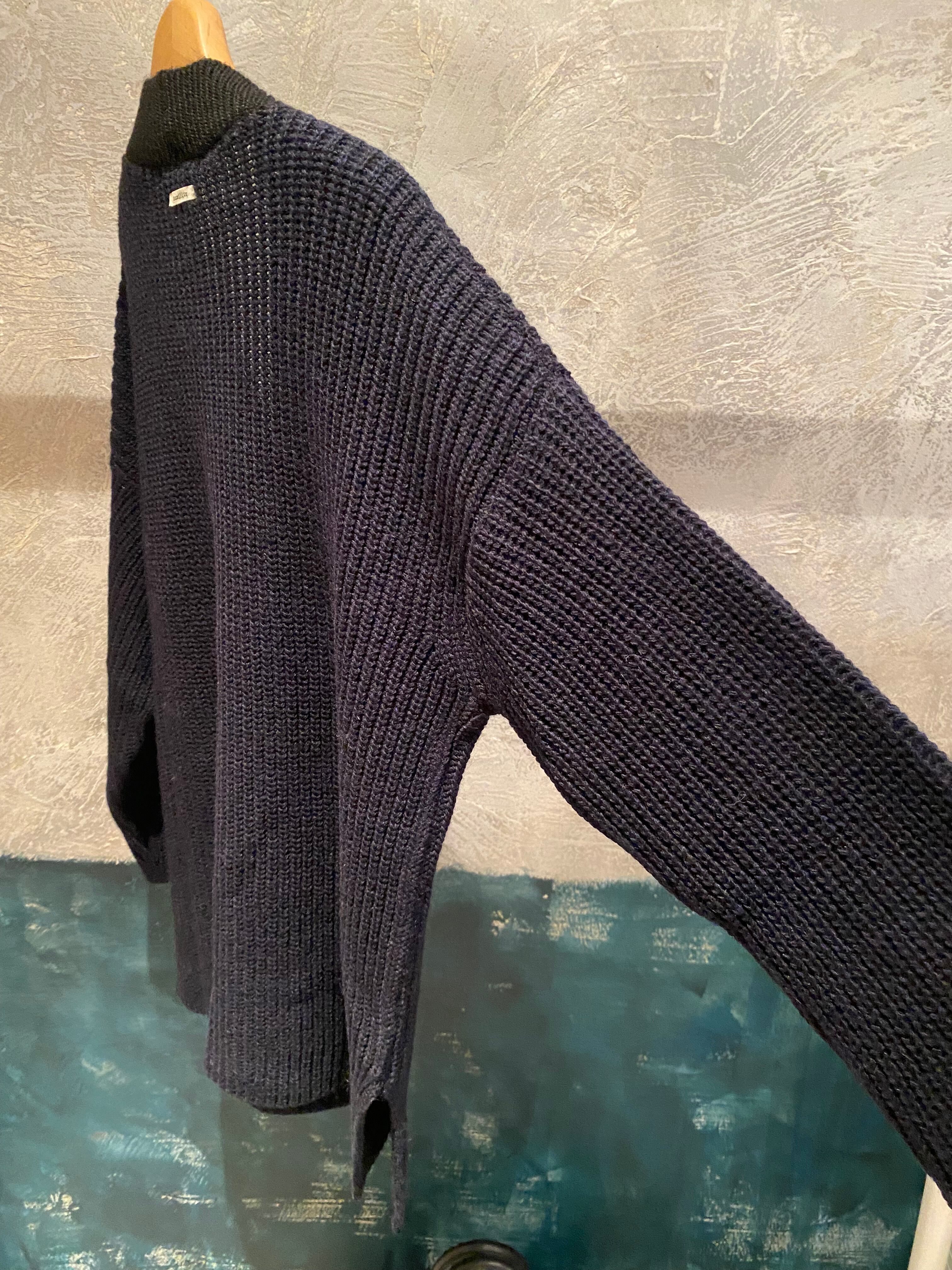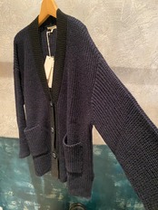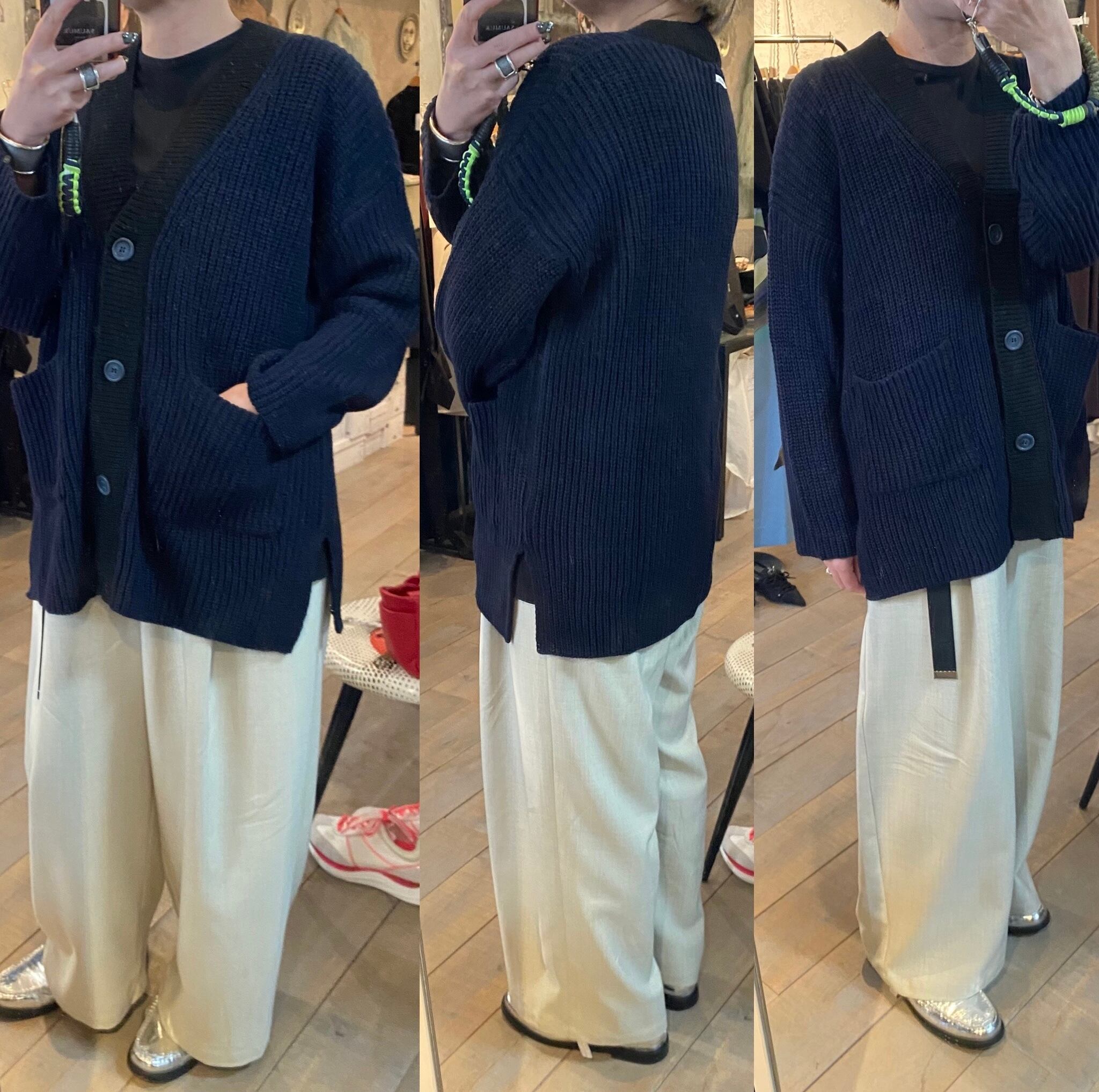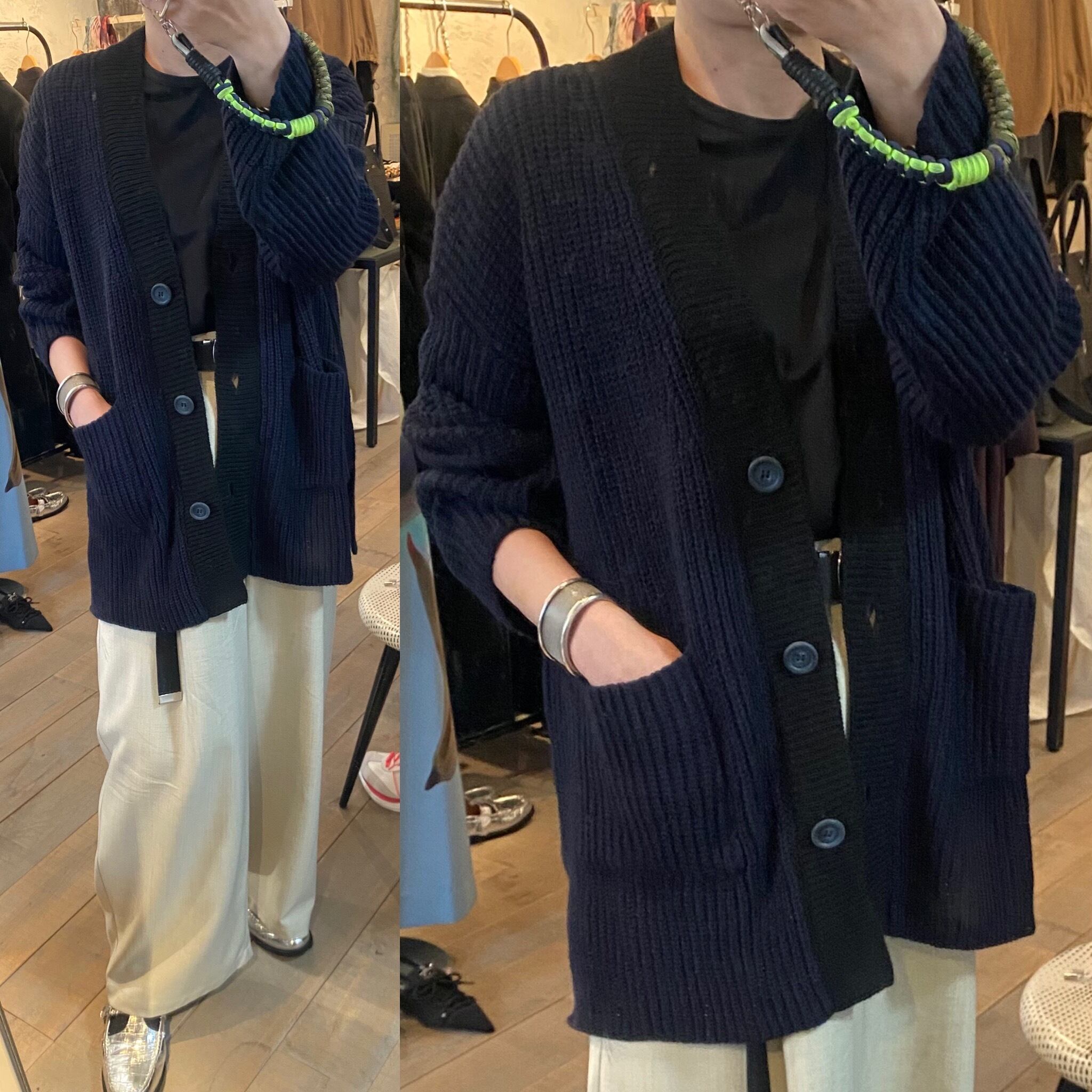 Vネックのカーディガン。ヒップがすっぽり隠れる程の合わせやすい着丈。フロントポケットや、blackとnavyの配色デザインがポイント。程よいゆとり感と肉厚さで、アウターの下でもひびかず着回せます。とても軽量で着心地も◎