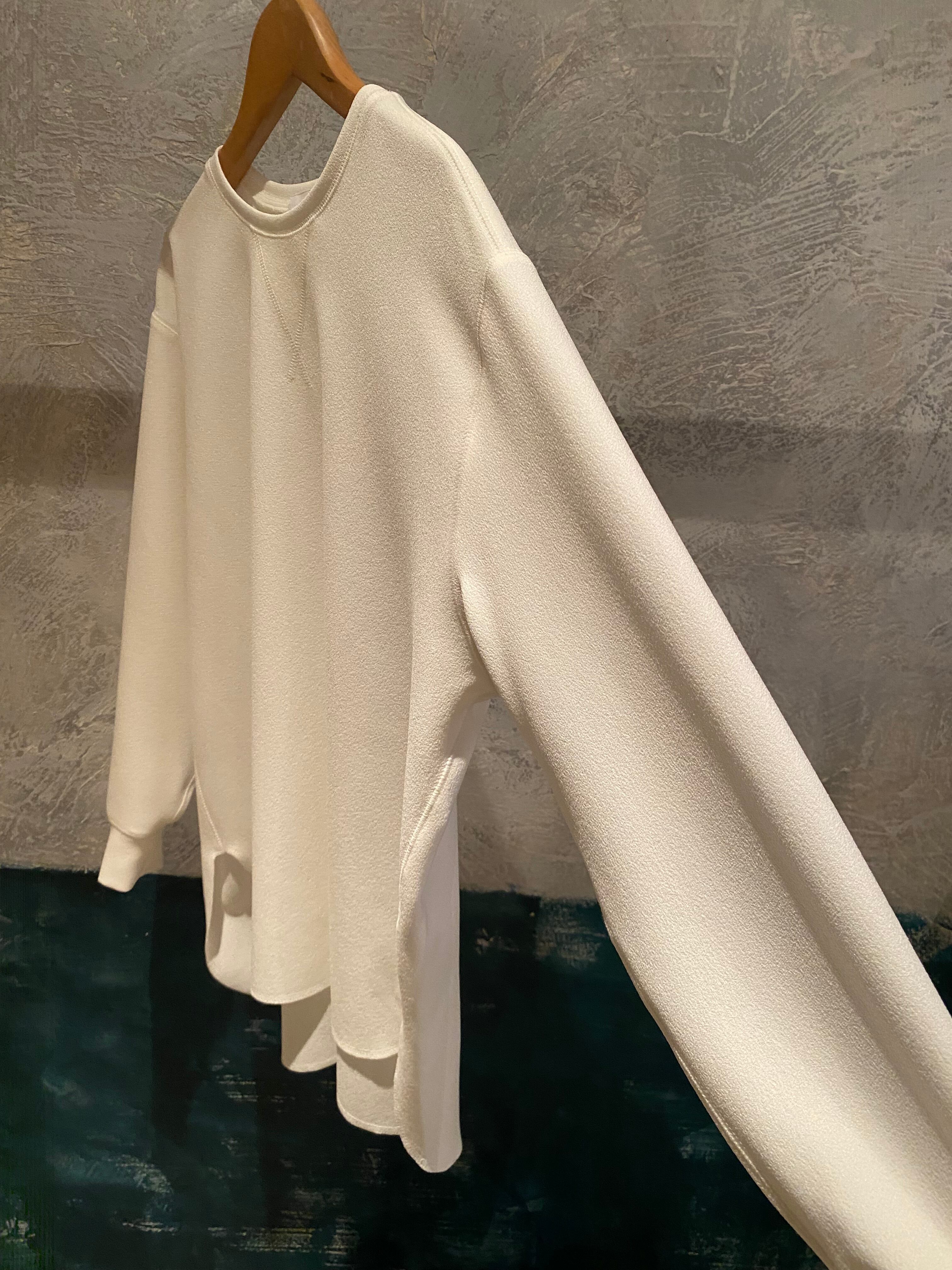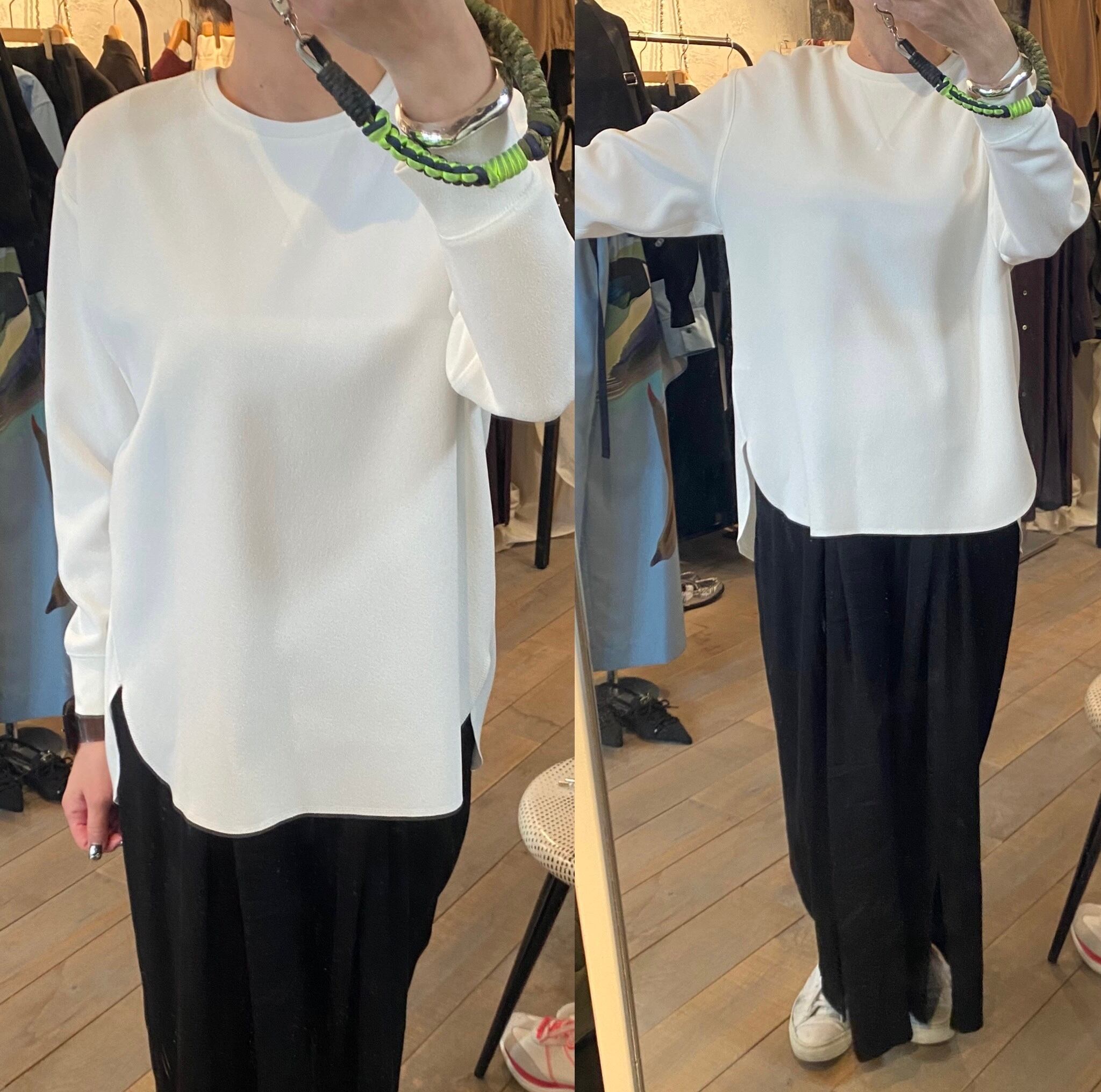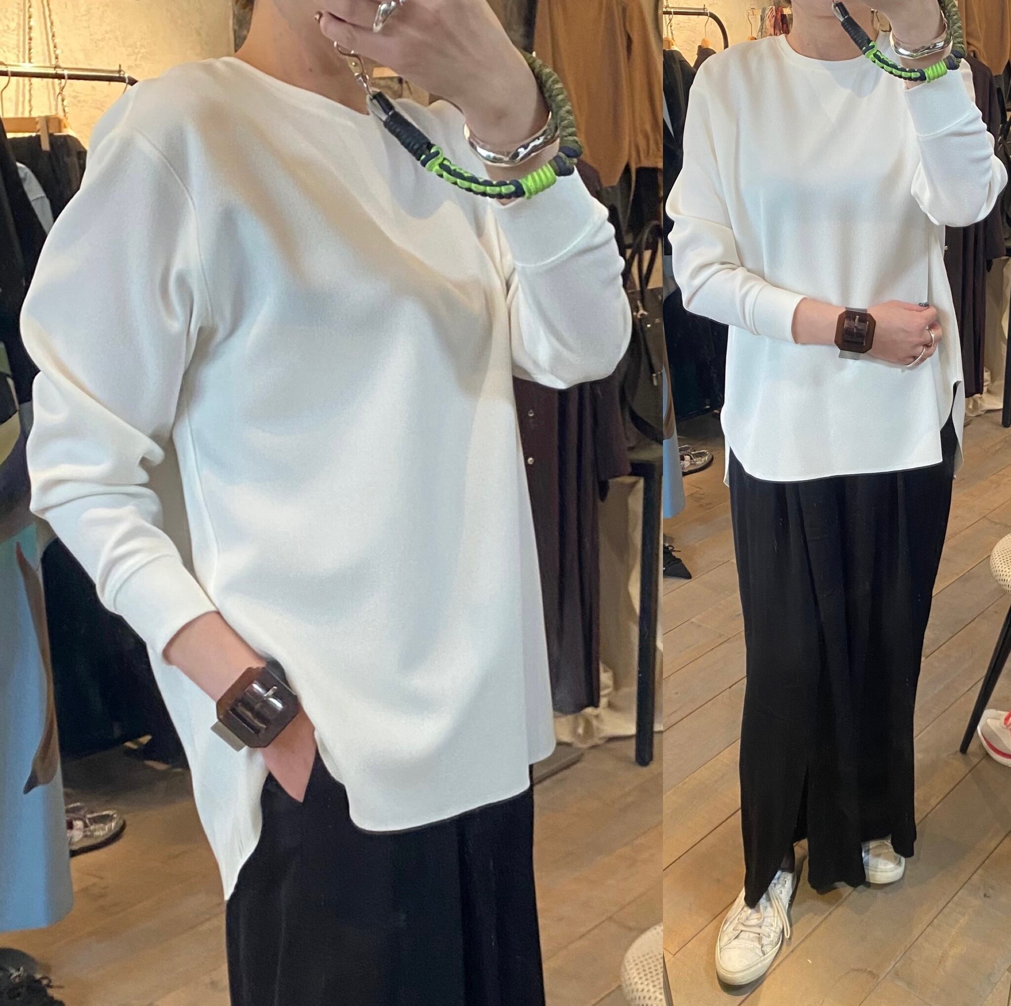 25ssで好評を頂いていたハーフスリーブのロングスリーブタイプ。サラッとした着心地。裾のラウンドカットや、スリット、断ち切り仕上げが軽めの印象に。体のラインも拾わず、合わせるボトムスも選ばないのでどなたでも着回せるヘビロテアイテムです♪Tシャツよりキレイめ見えするのも嬉しいところ。