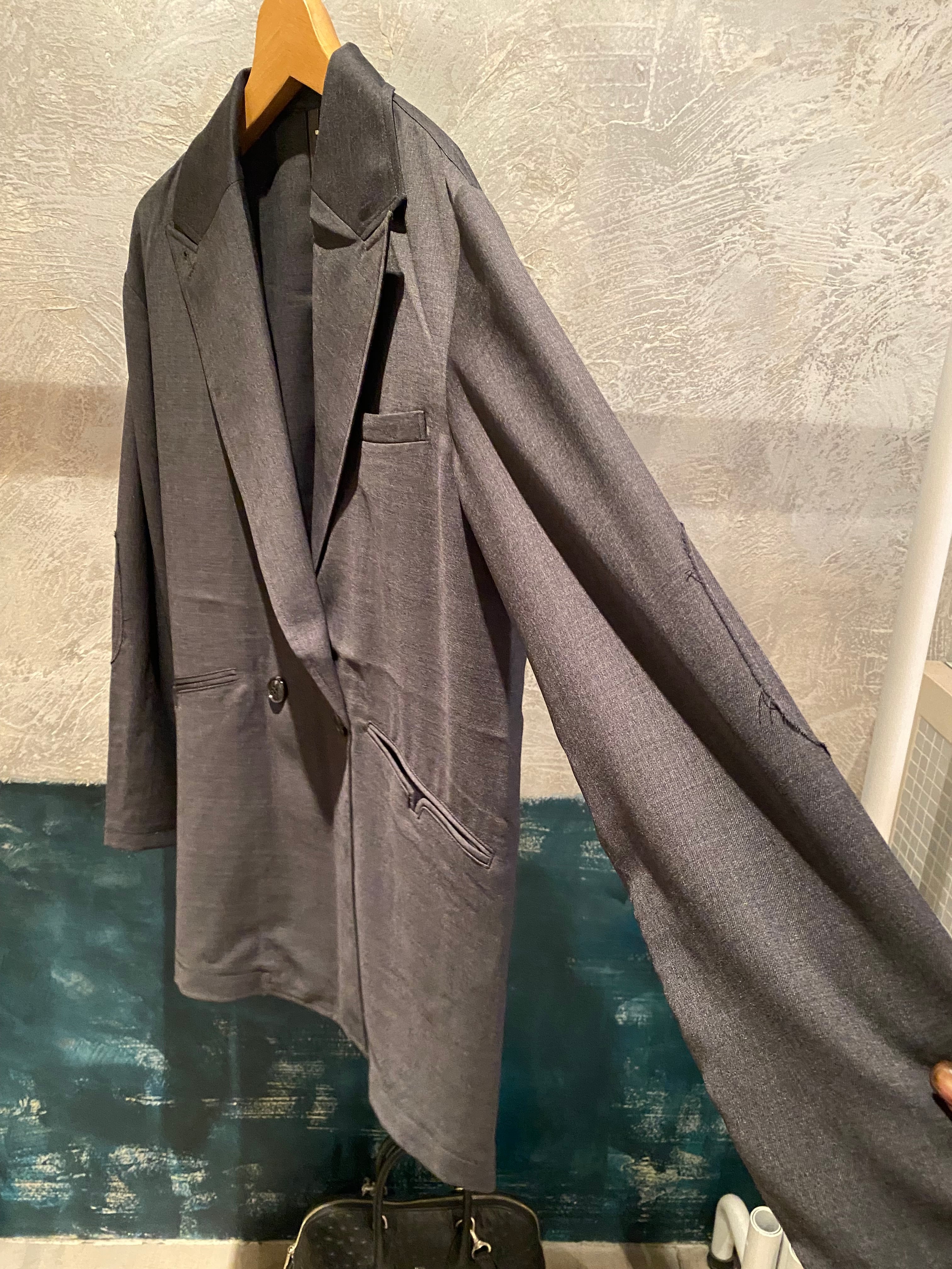 ウール100%の上質な薄手素材を使用したダブルジャケット。梳毛特有の滑らかで軽やかなタッチとほんのり光沢のある表面感が洗練された印象を演出します。オールシーズン着用可能な程薄手でレイヤードにも最適。背面には大胆に施されたファスナーが自由自在にオープンでき、シルエットの変化を楽しめたり、通気性の調整も可能。クラシックなテーラードジャケットにモードなニュアンスをプラスしています。