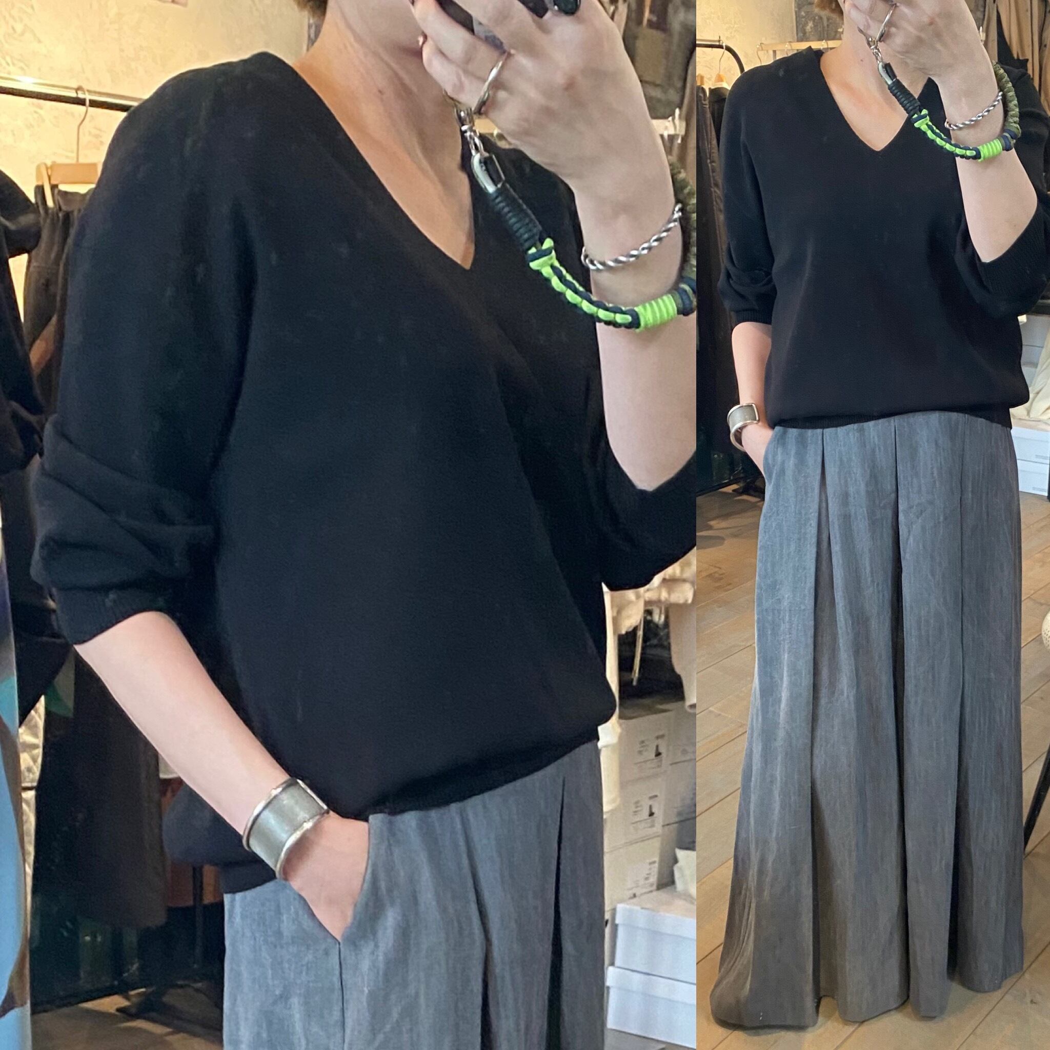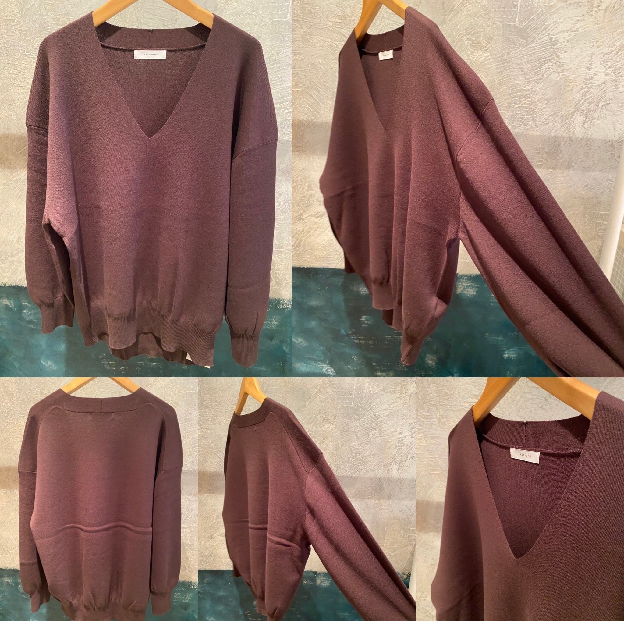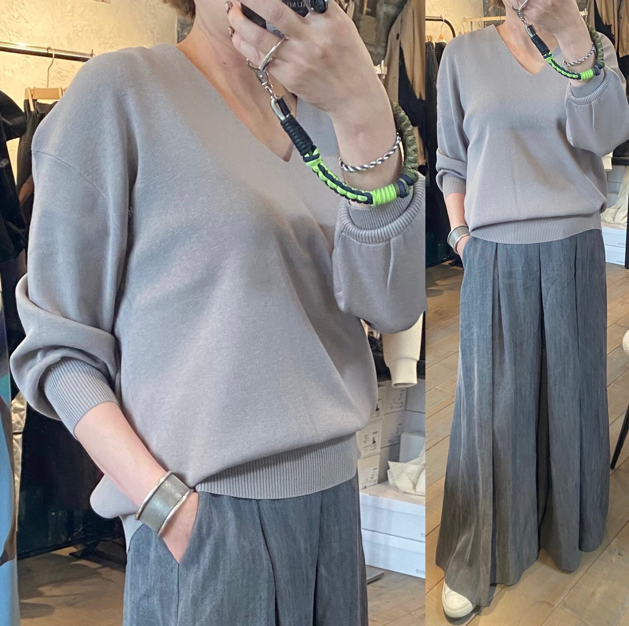 サラッとした着心地抜群のVネックプルオーバートップス。程よいゆとり感もあり身体のラインも拾いません。サラッと着るだけで雰囲気の出る着回し力抜群のニット。秋一番から着まわせ、メインでもインナーとしても活躍します♪