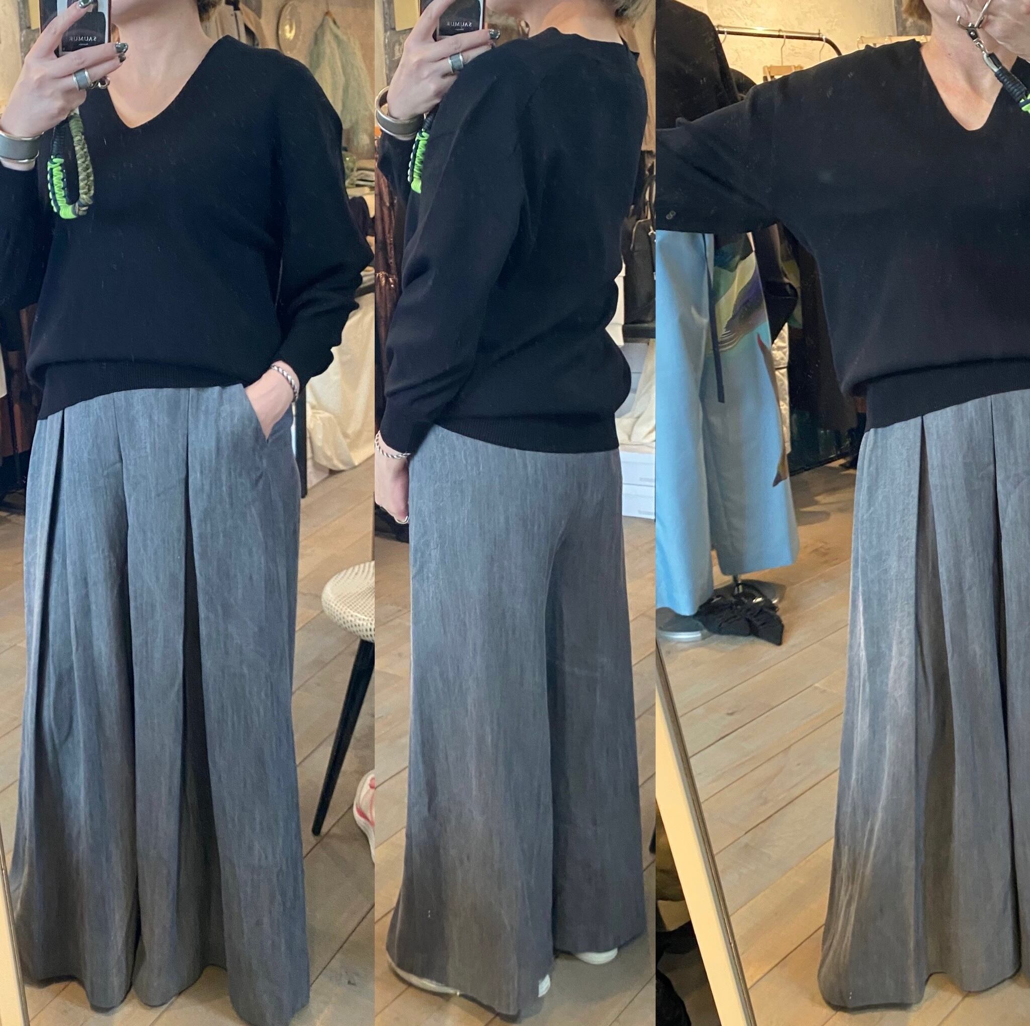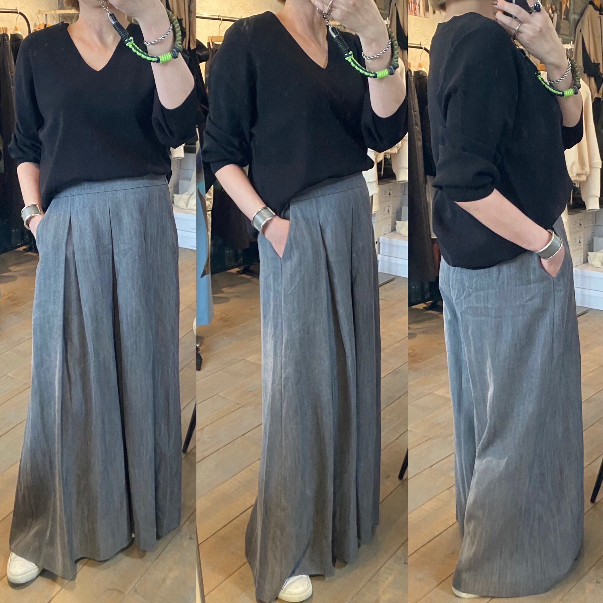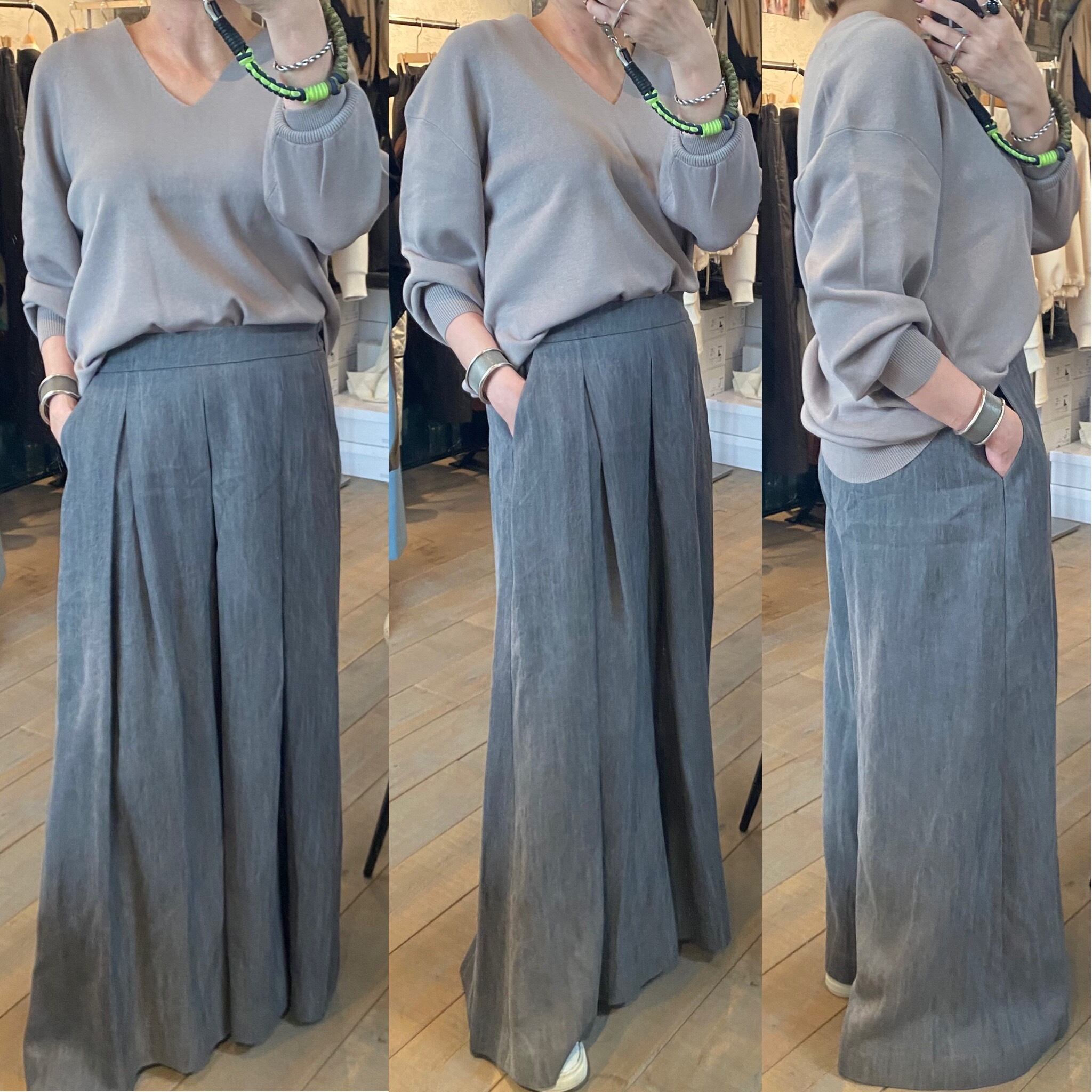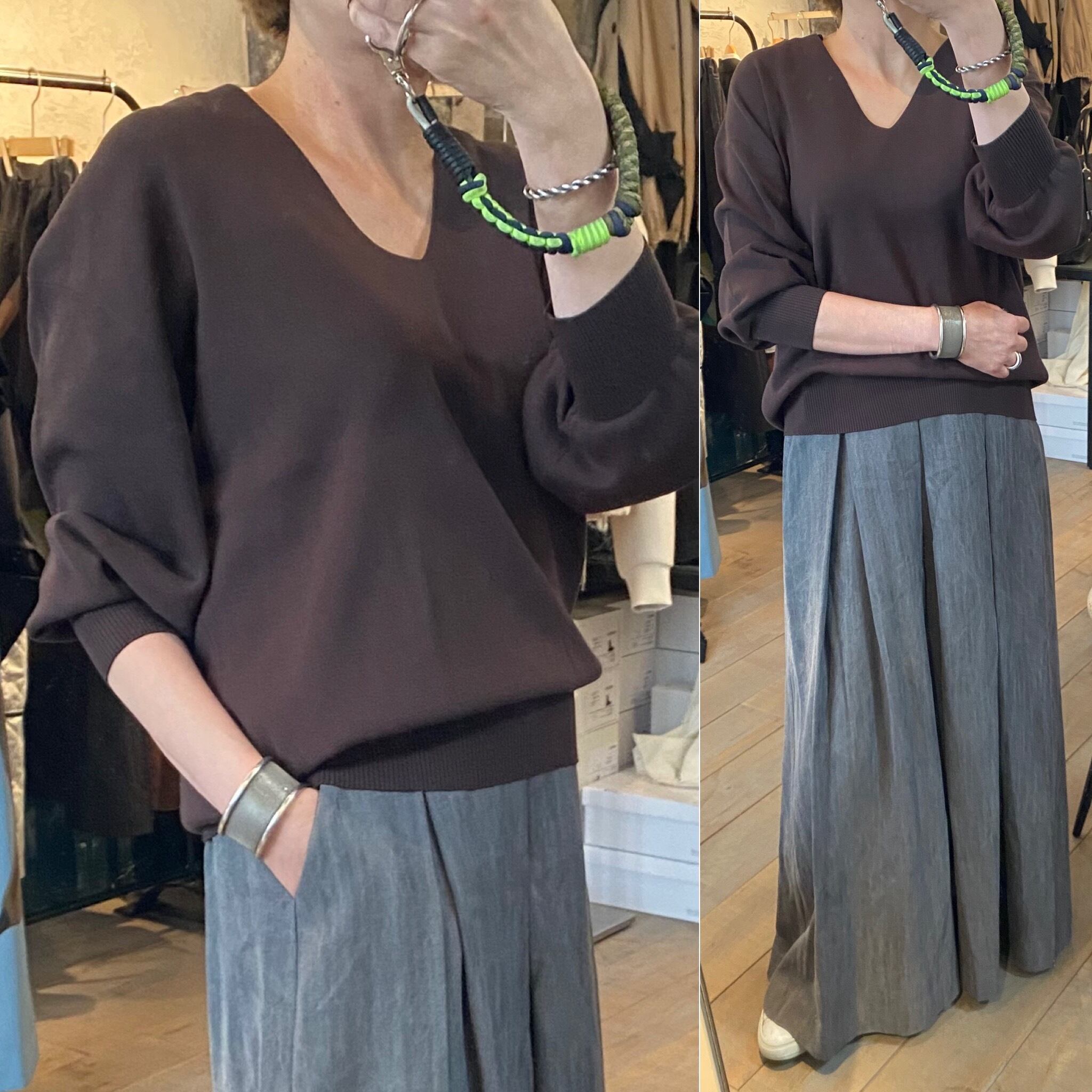 サラッとした着心地抜群のVネックプルオーバートップス。程よいゆとり感もあり身体のラインも拾いません。サラッと着るだけで雰囲気の出る着回し力抜群のニット。秋一番から着まわせ、メインでもインナーとしても活躍します♪