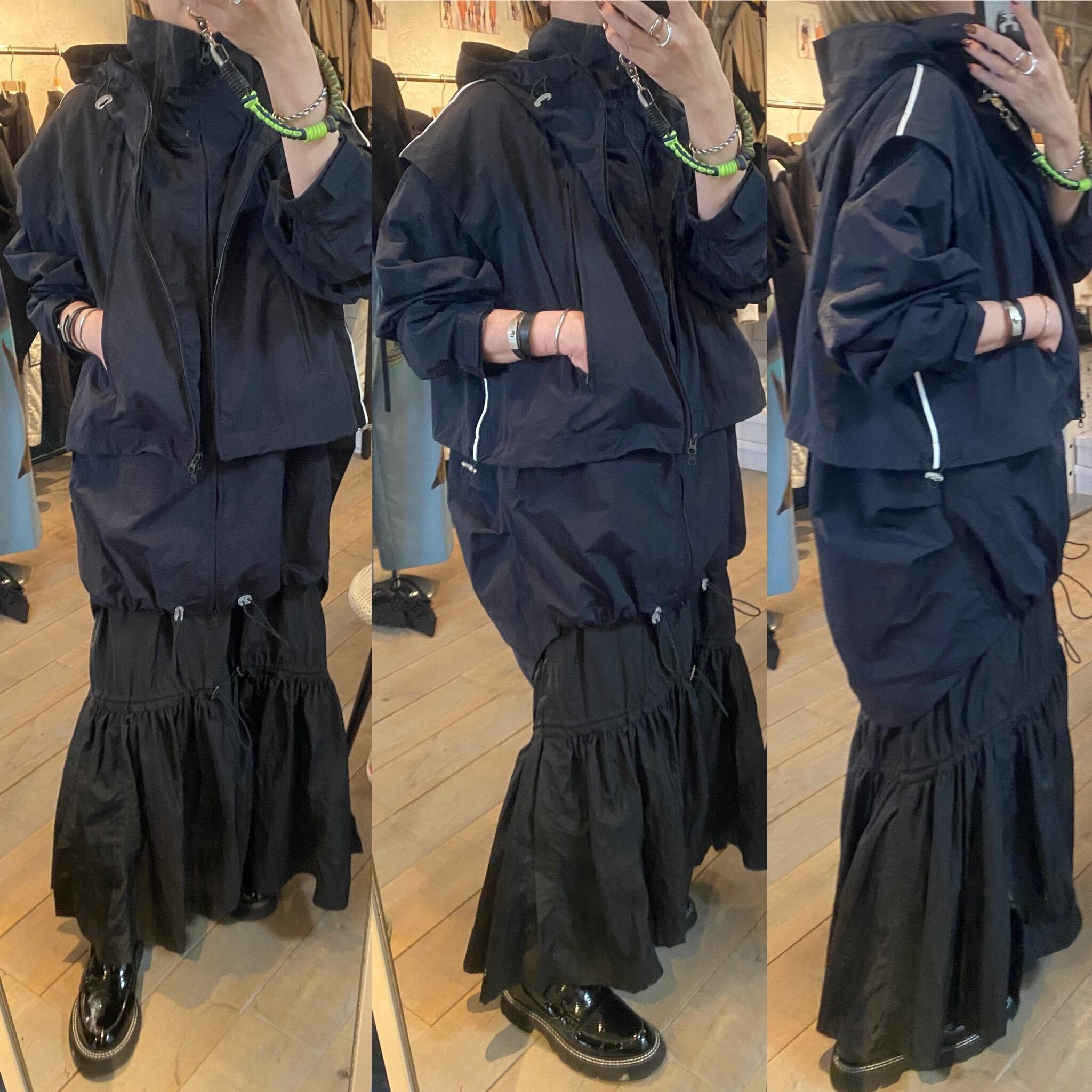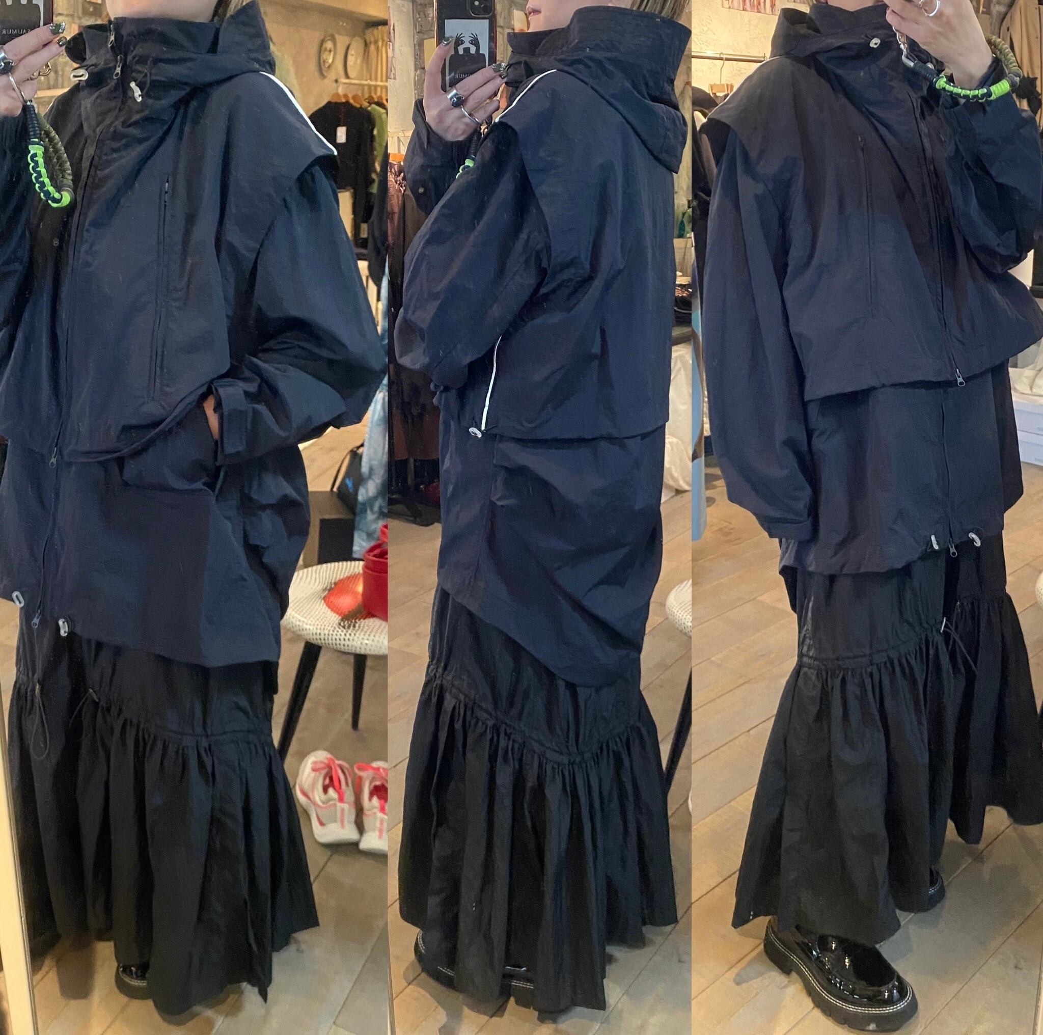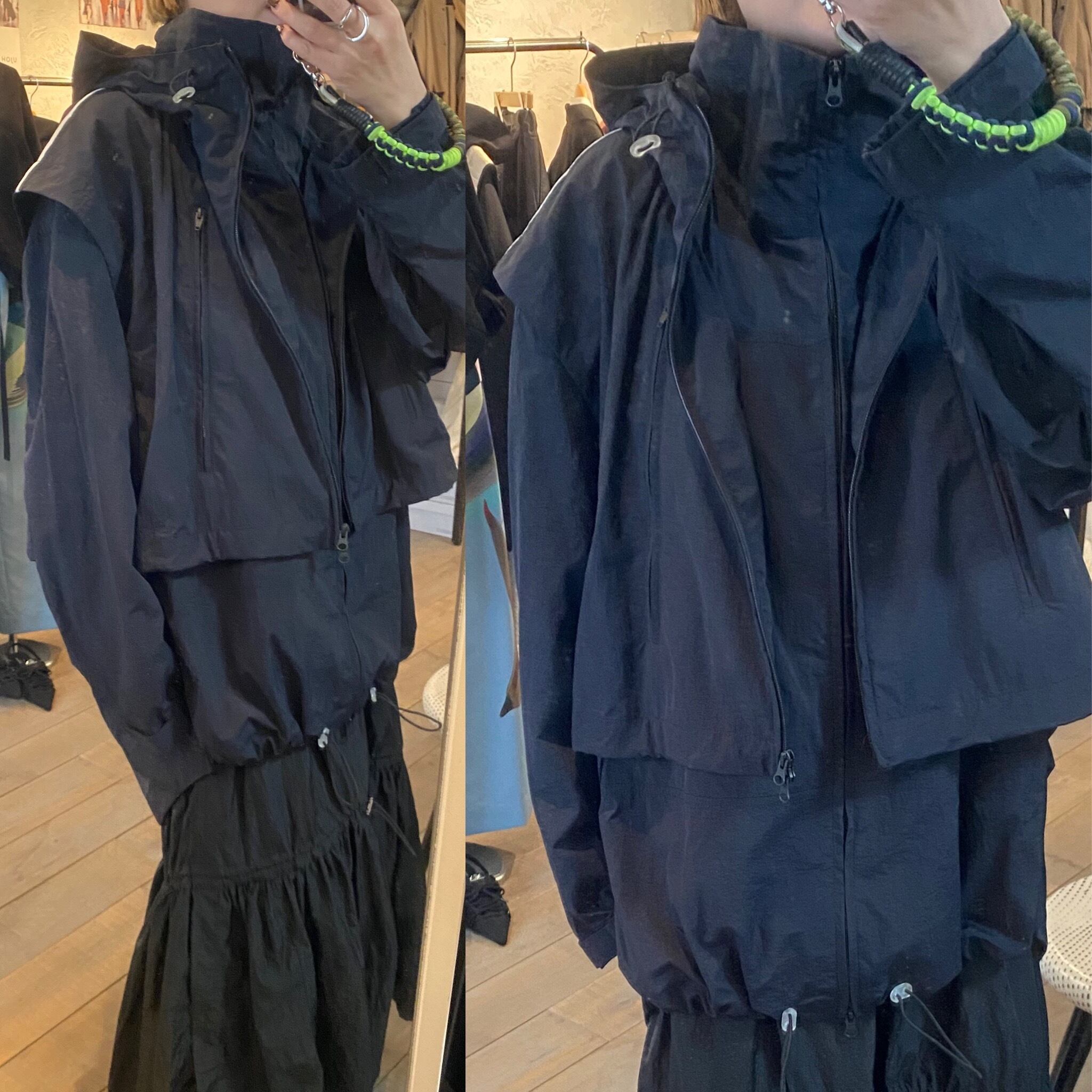 3way仕様のブルゾン。クロップド丈のベストとヒップがすっぽり隠れる着丈のジップアップブルゾンを単品ずつでも、重ねてレイヤードして着用も可能。いずれもダブルジップ仕様や、ドローコードでのシルエットの変化を楽しめたり、ポケットのデザインなどなど細部までこだわりのデザインが詰まったアイテムです。ロングシーズン着回せるのも嬉しいところ。