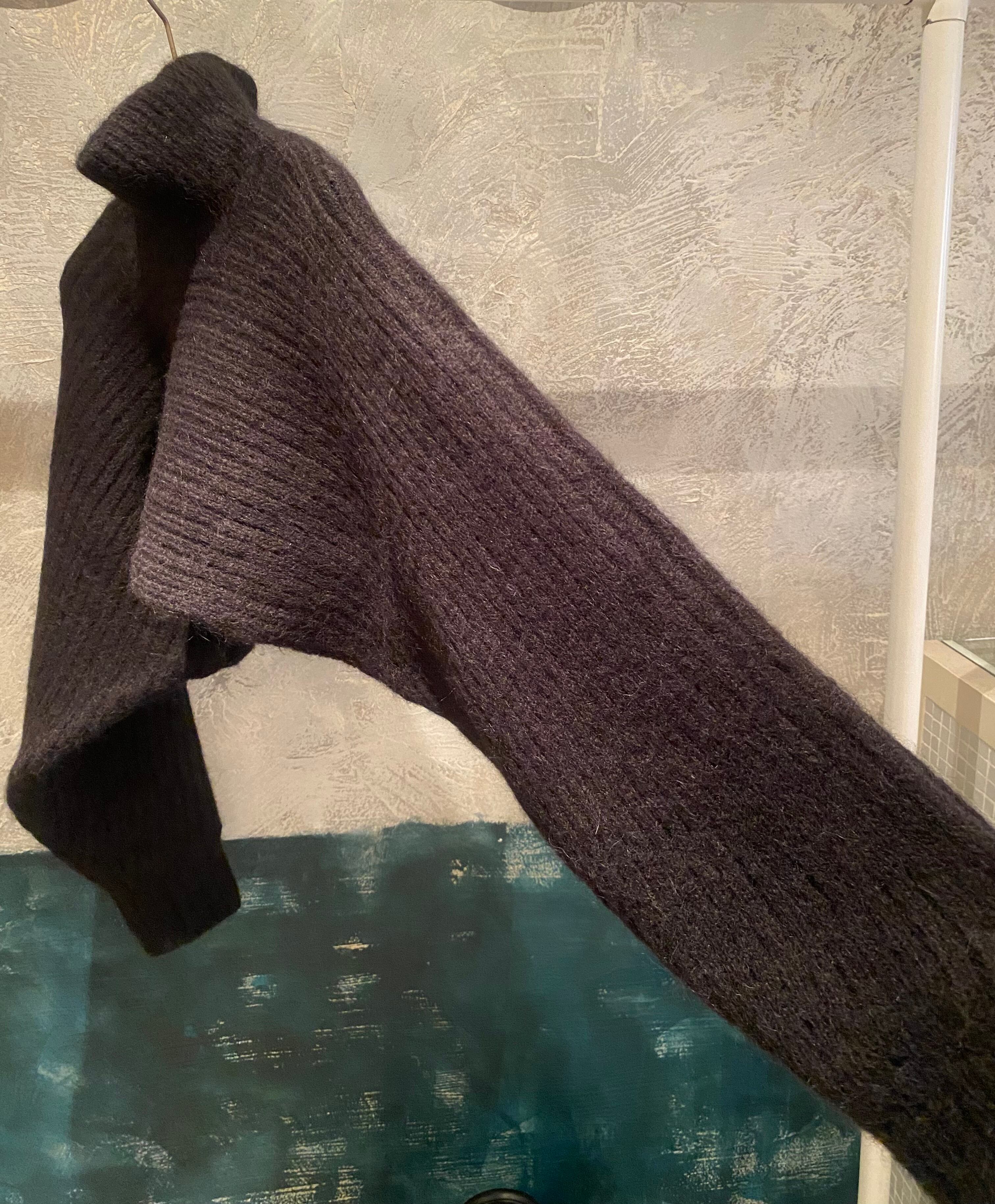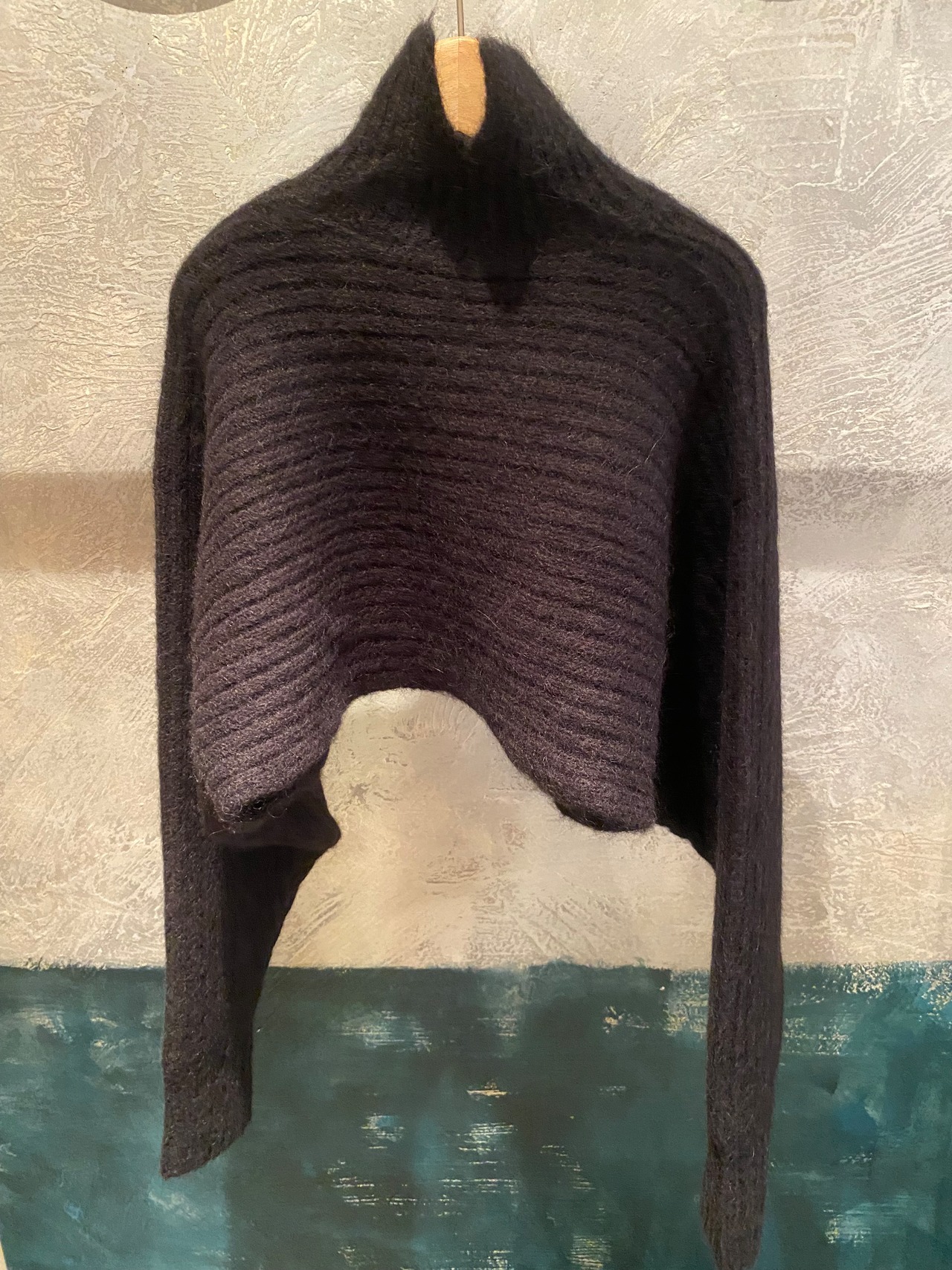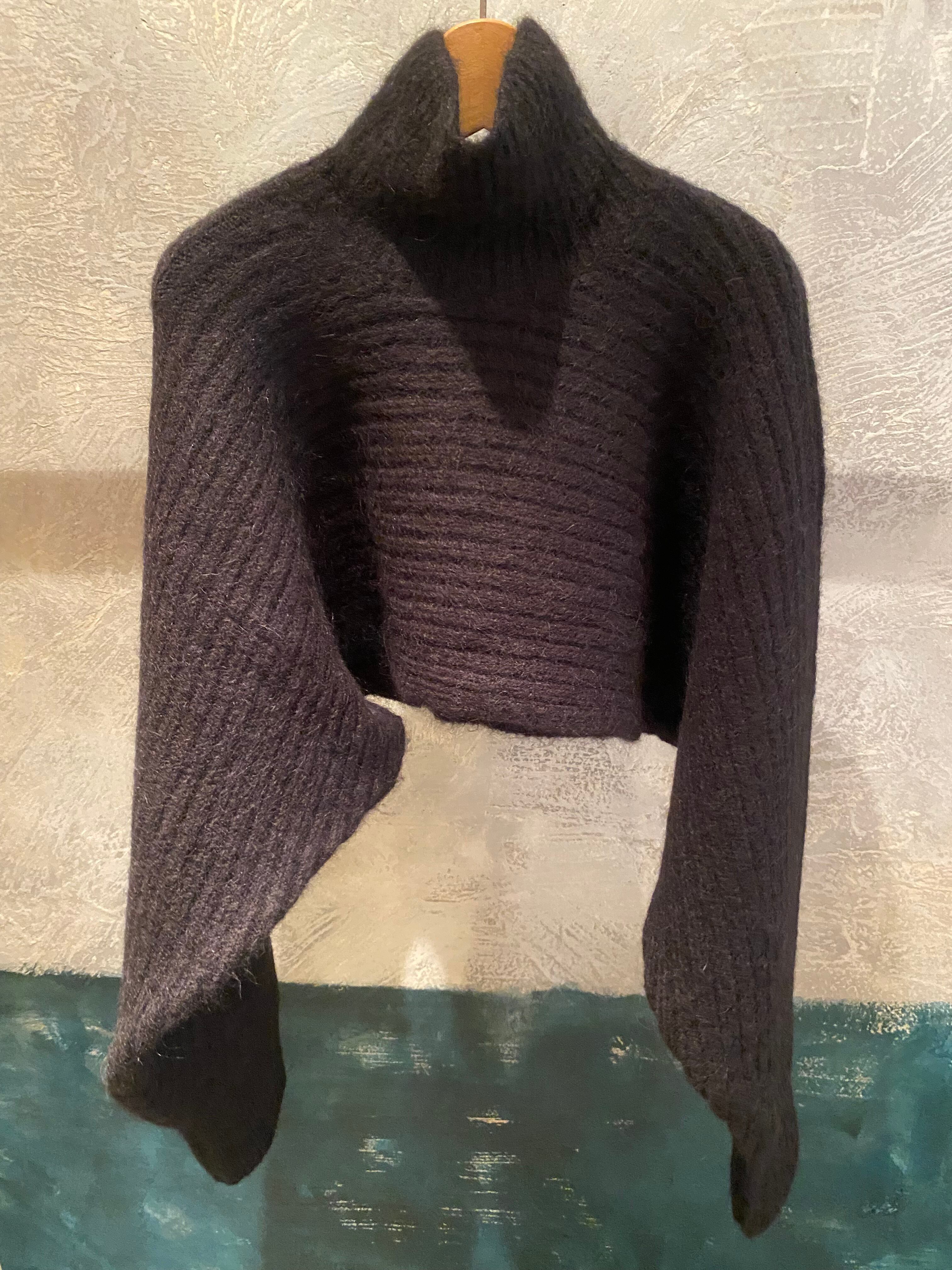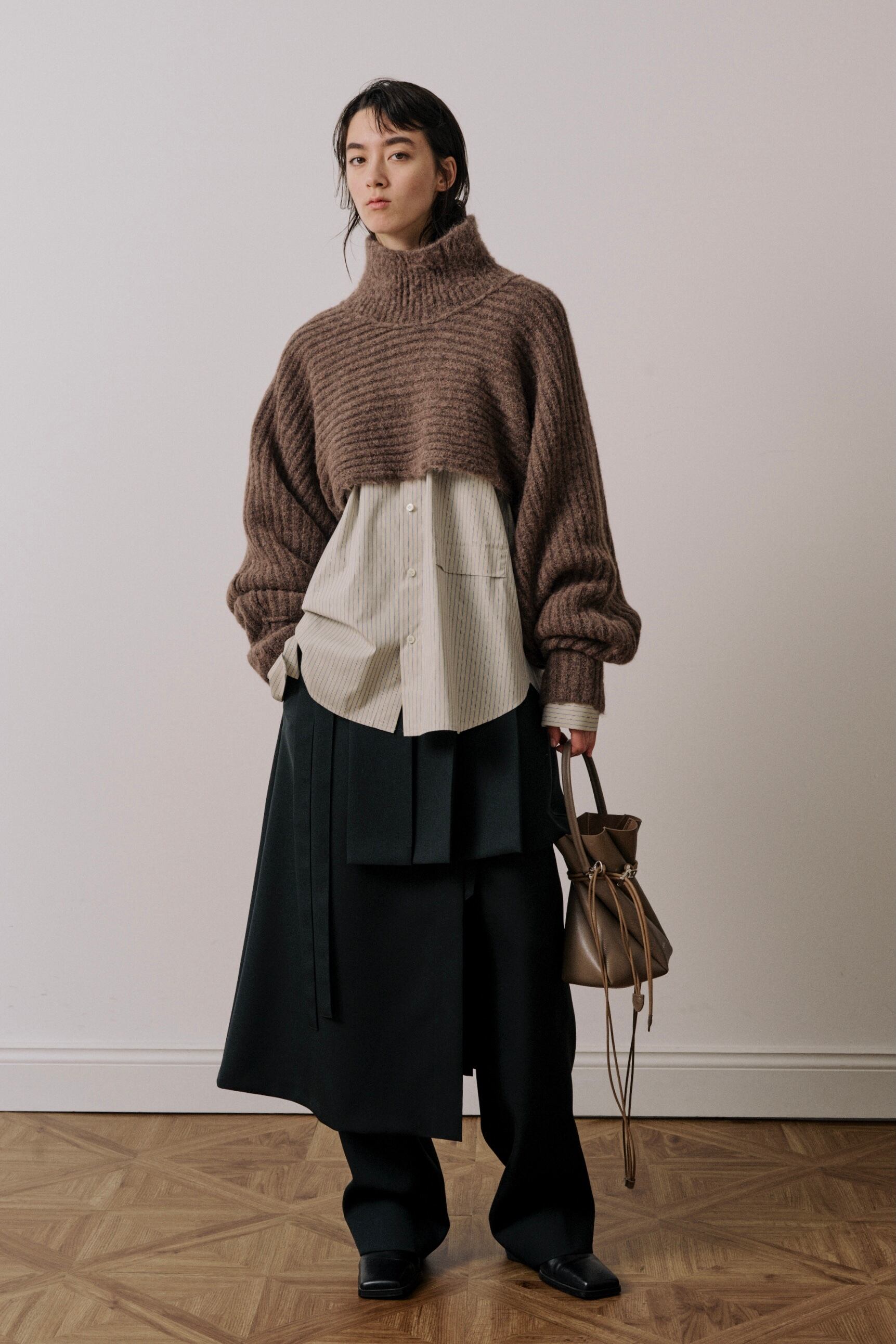 保温性に優れ、毛玉やシワになりにくいのが特徴のアルパカを使用し、獣毛特有の肌あたりを改良するためアクリルとナイロンを混紡する事で柔らかく、ふっくらとした感触に仕上げました。ボリュームのある袖とクロップド丈のバランスにこだわったタートルネックニットです。レイヤードスタイルが楽しめるアイテムになっています。